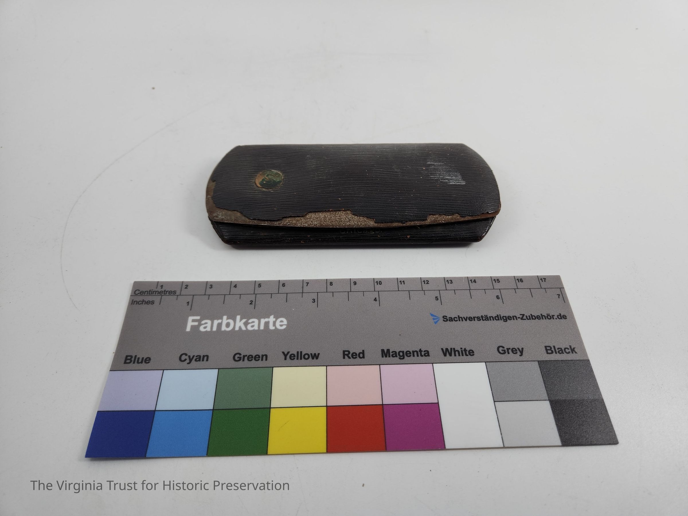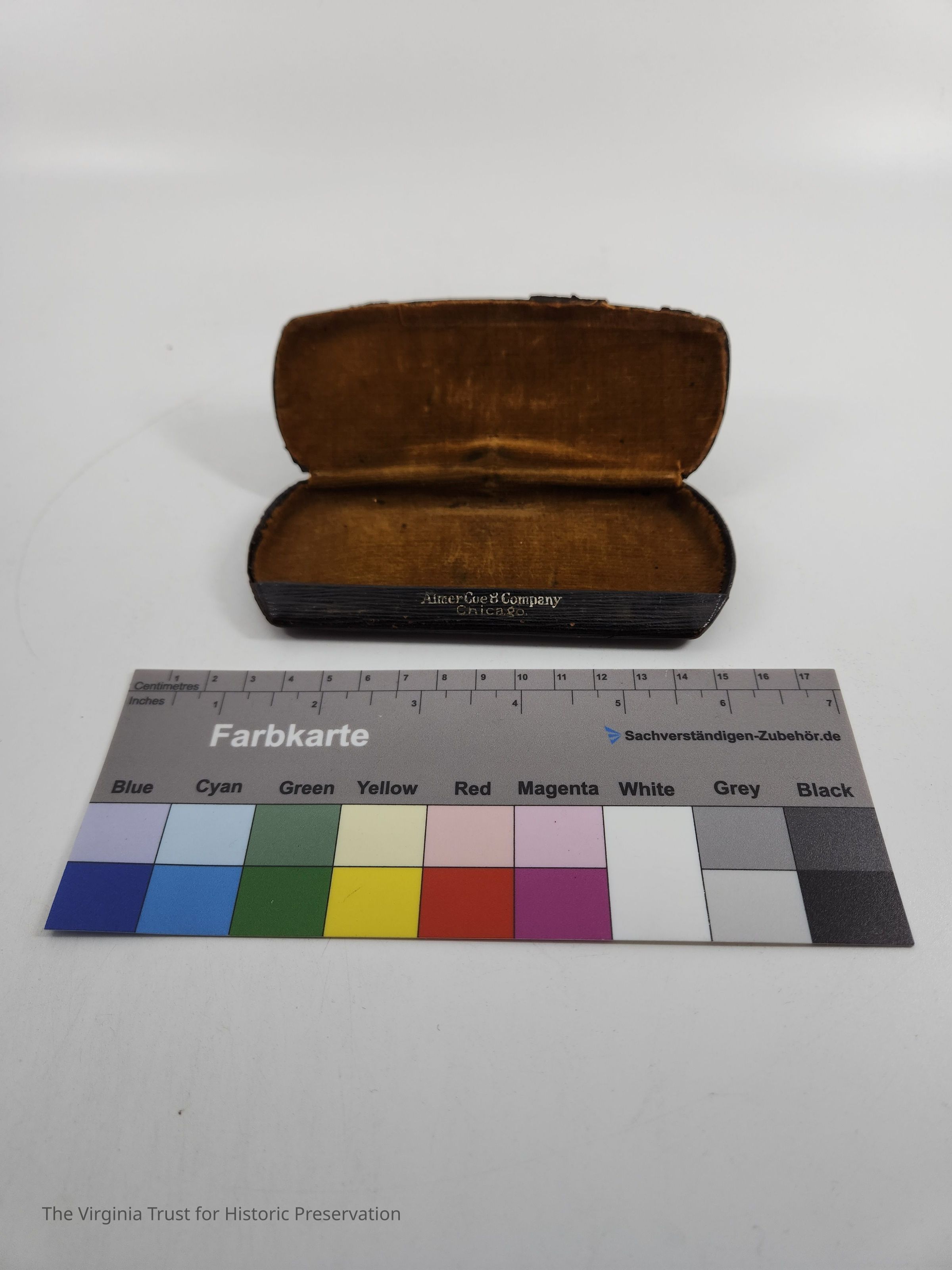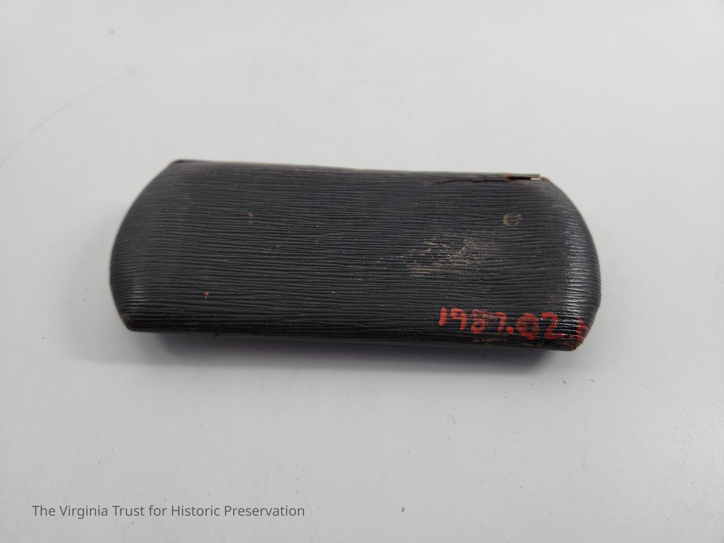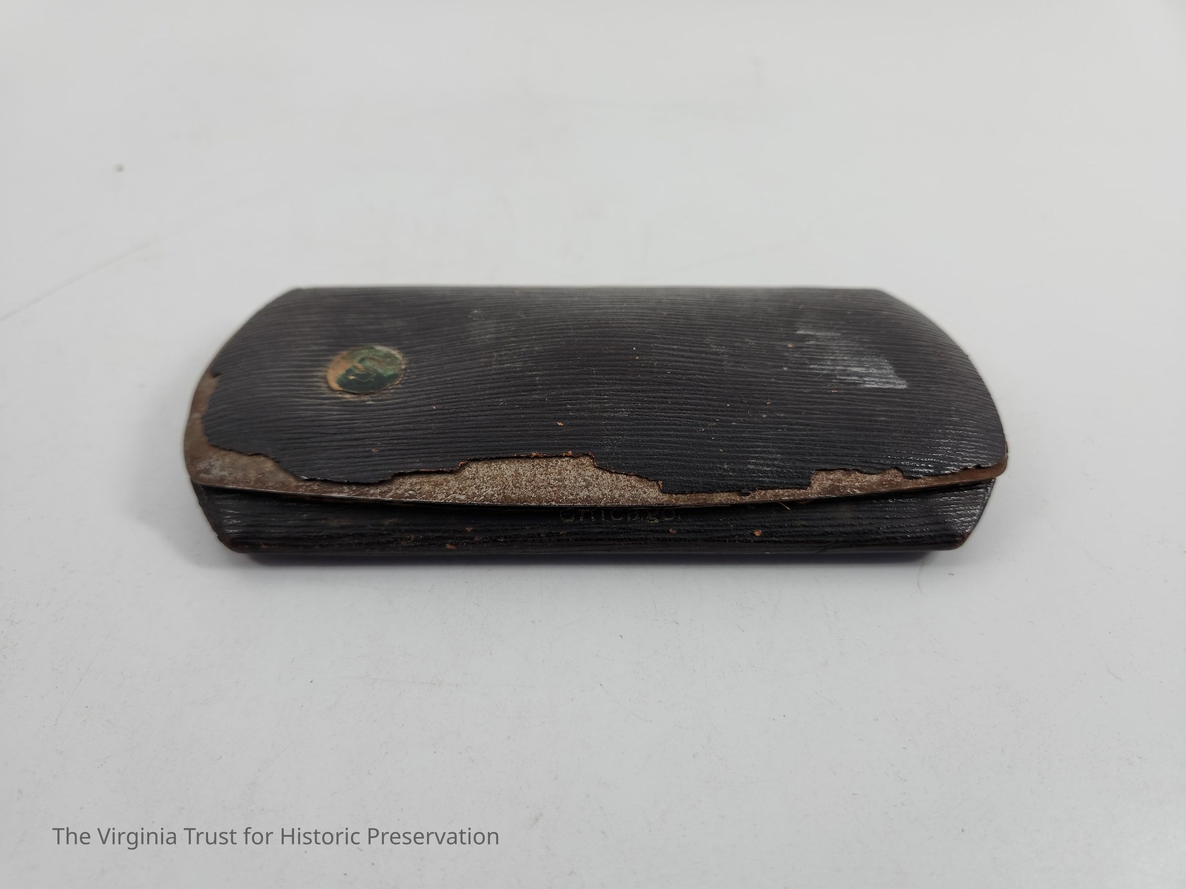 Hard glasses case with leather covering, cloth interior, and a metal circle on outside of case with an "S" on it