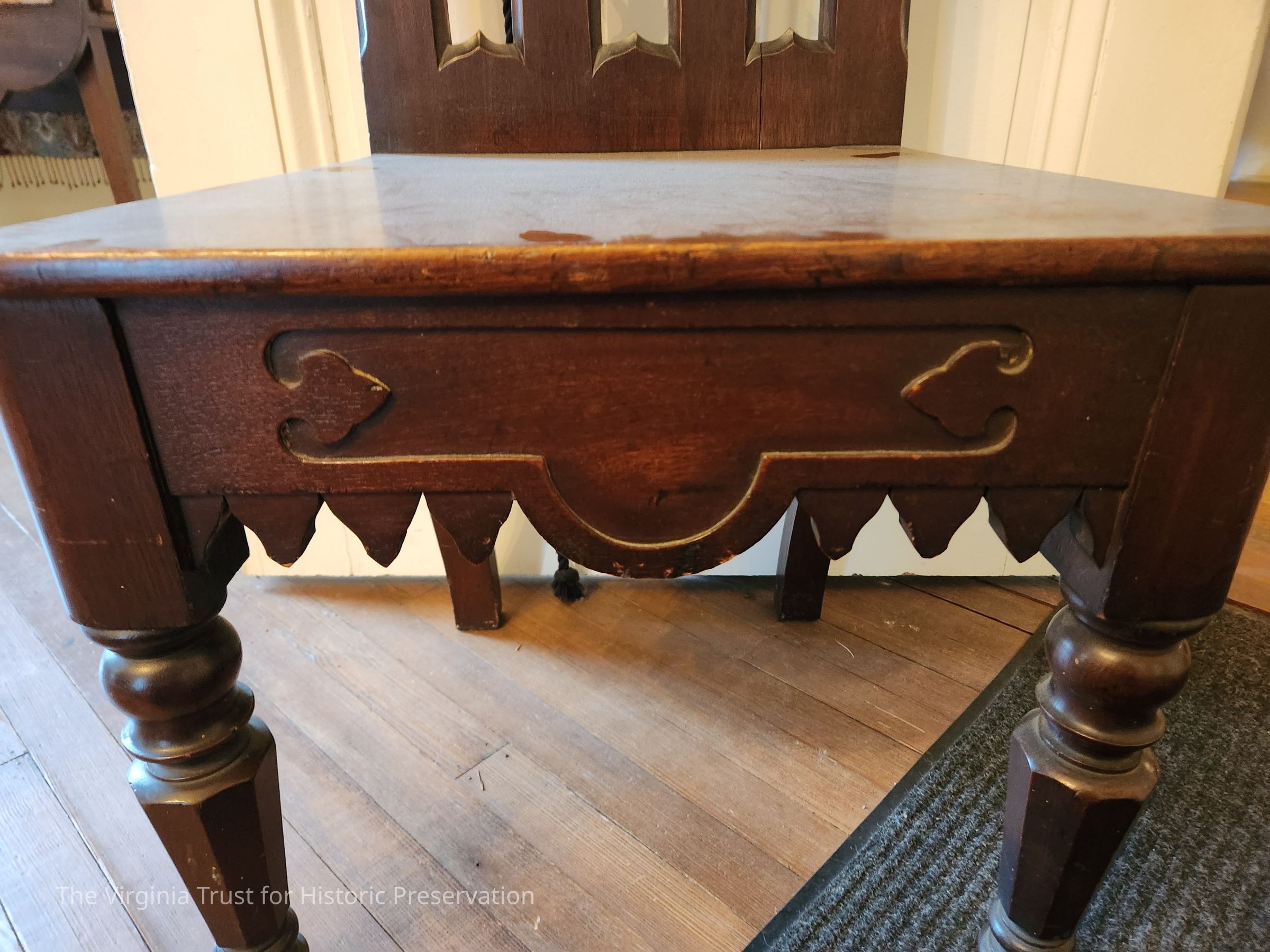 One of a pair of hall chairs. Gothic with crockets on the crest, Gothic arches on the back and crenelations on the skirt. Half round drop on the skirt with angular designs. Manufactured by the Green Steam Furniture Factory, Alexandria, VA. Pencilled "G" on the bottom of the seat.Dimensions