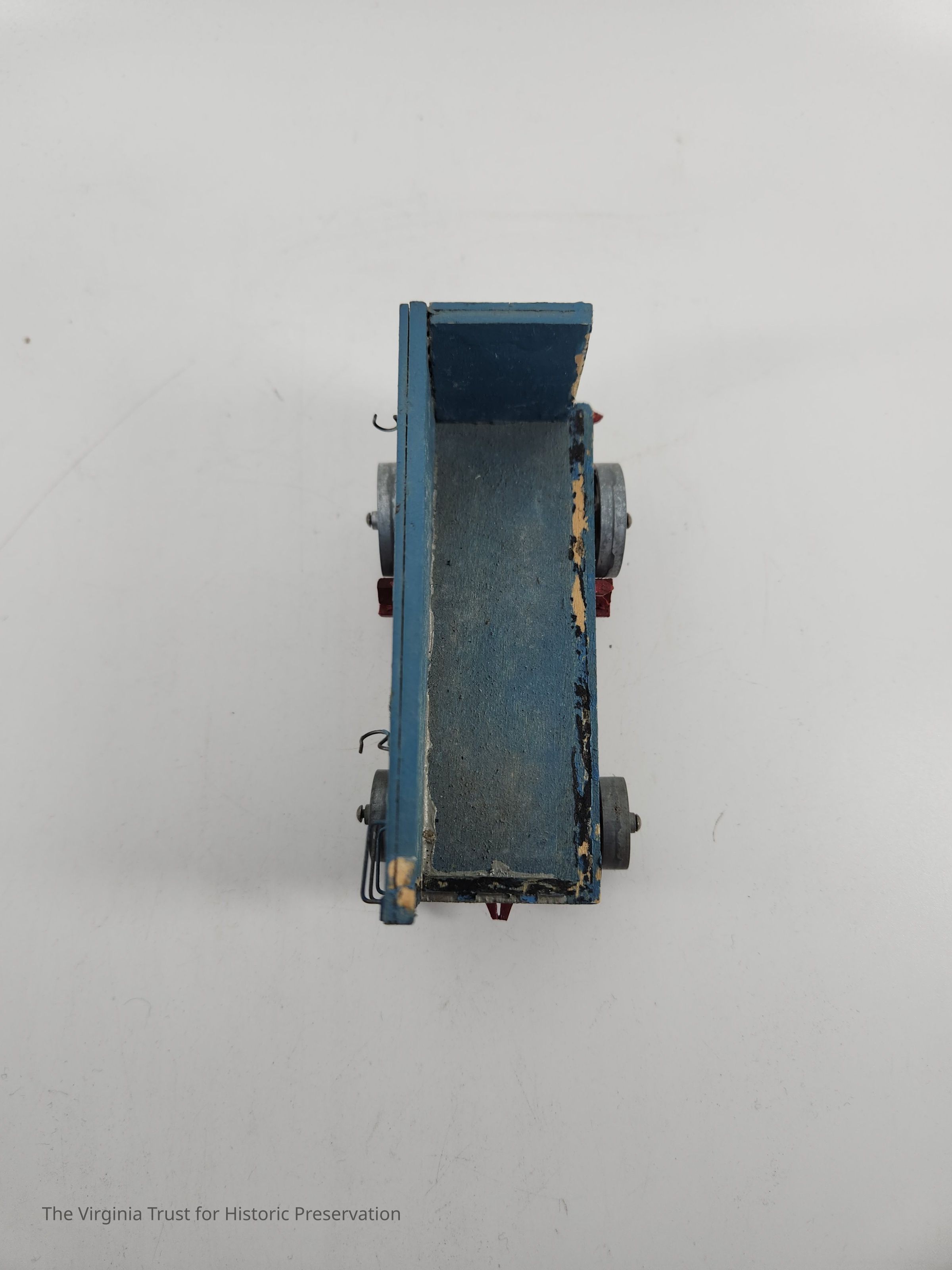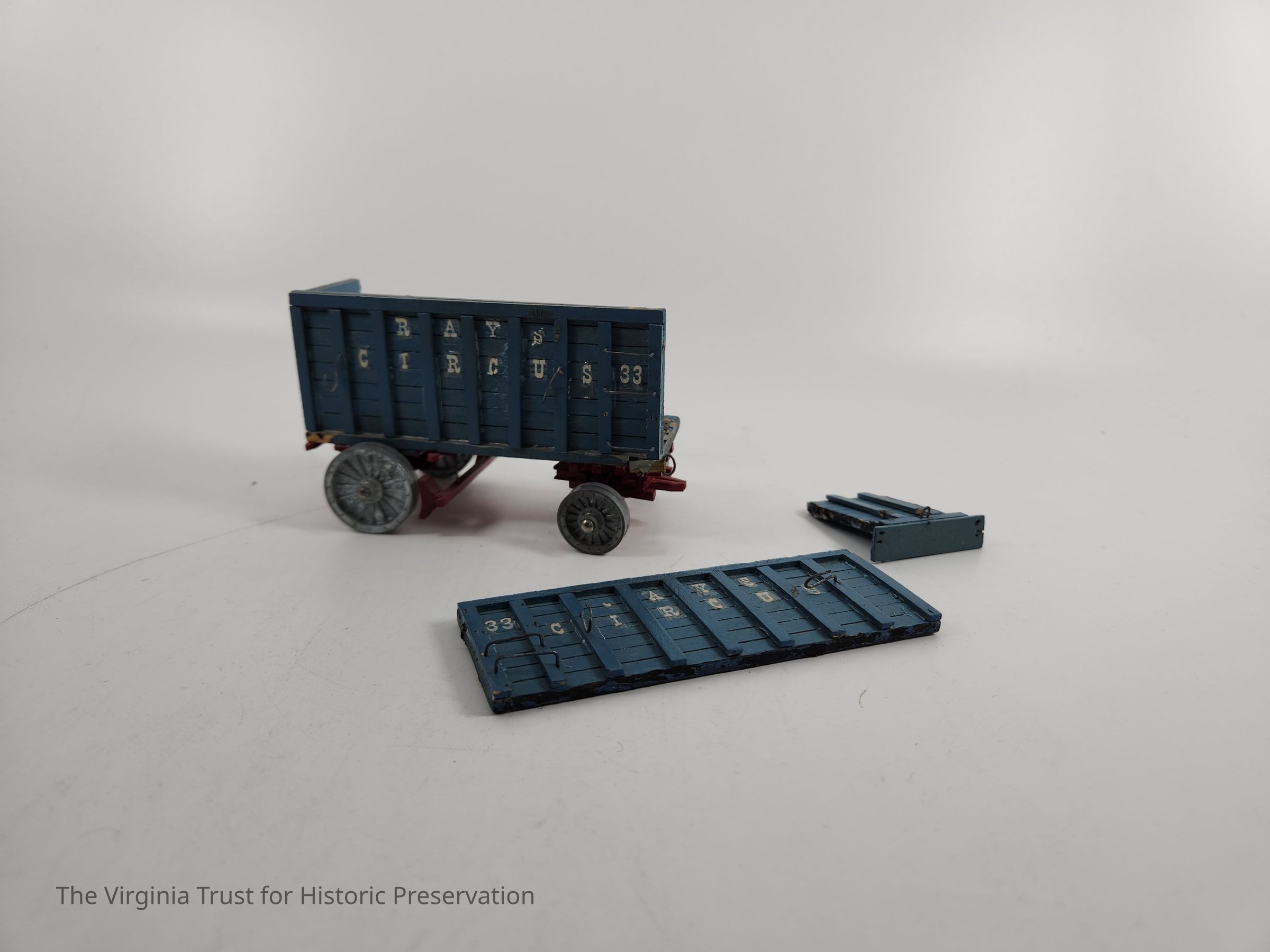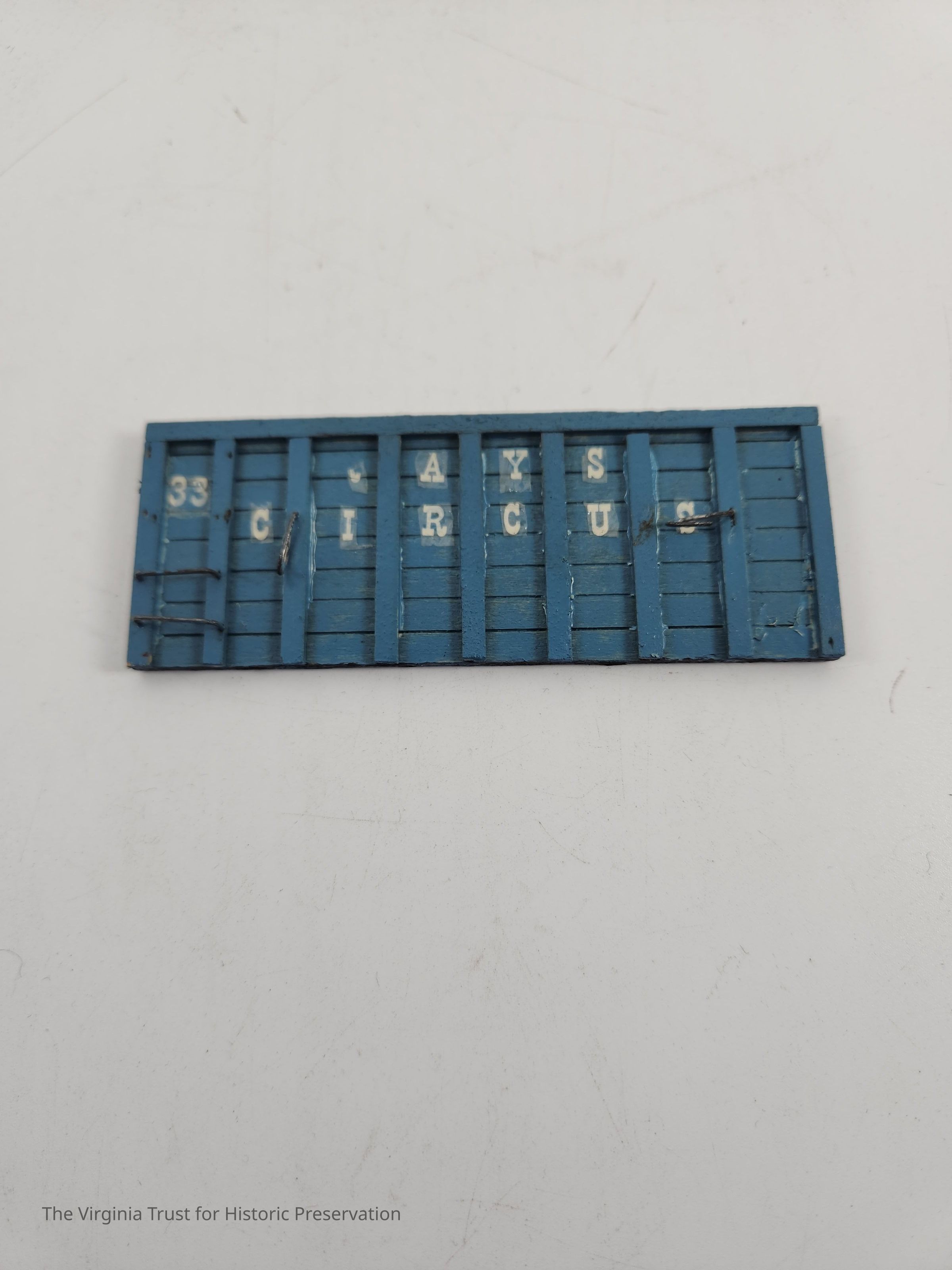 Blue toy train boxcar, with red undercarriage, open boxcar. "RAYS CIRCUS" and "33" written on both sides. One of a set of 8 (for Raymond L. Hawkins, son of Dorothy and Clayton).Dimensions