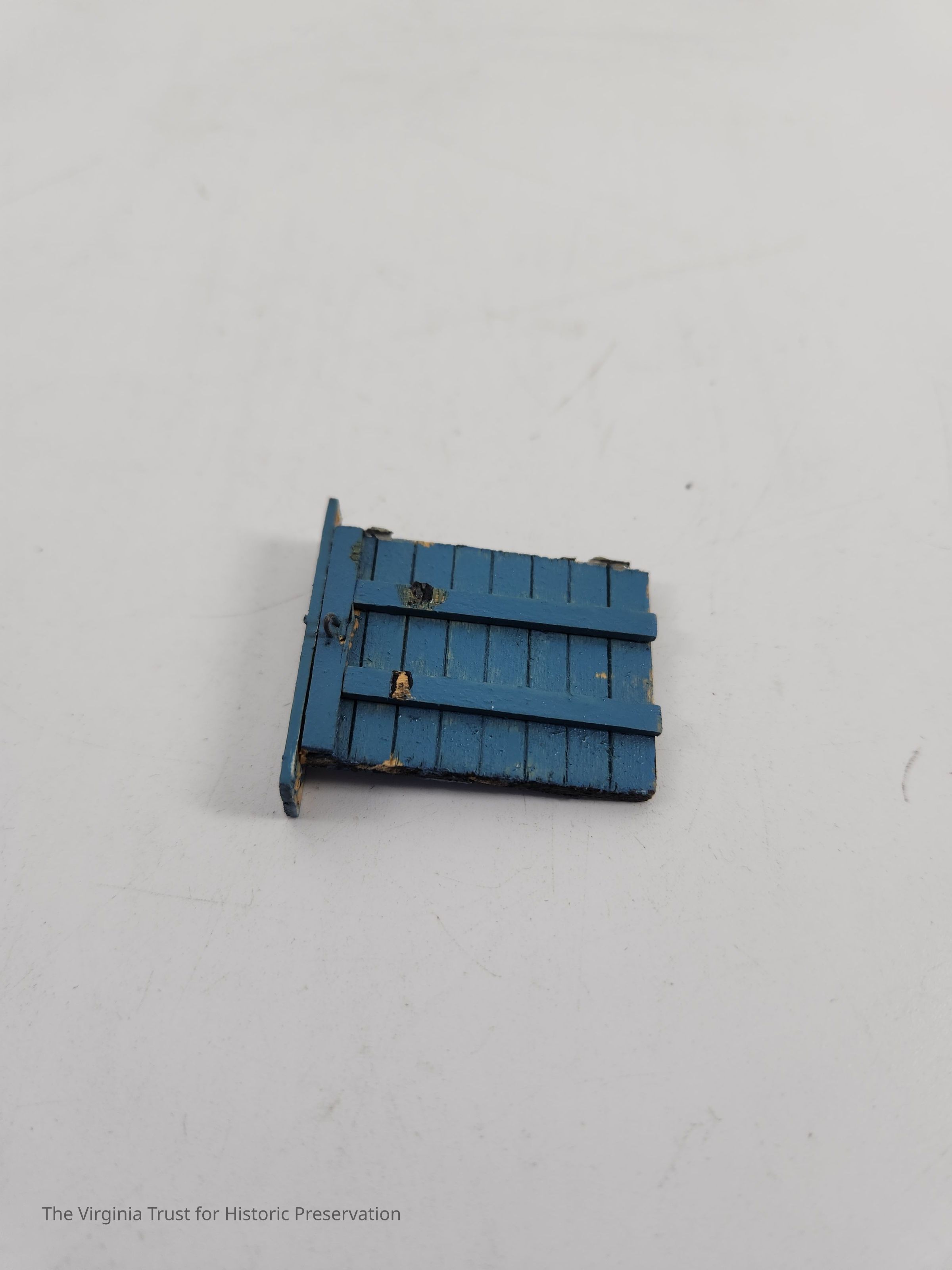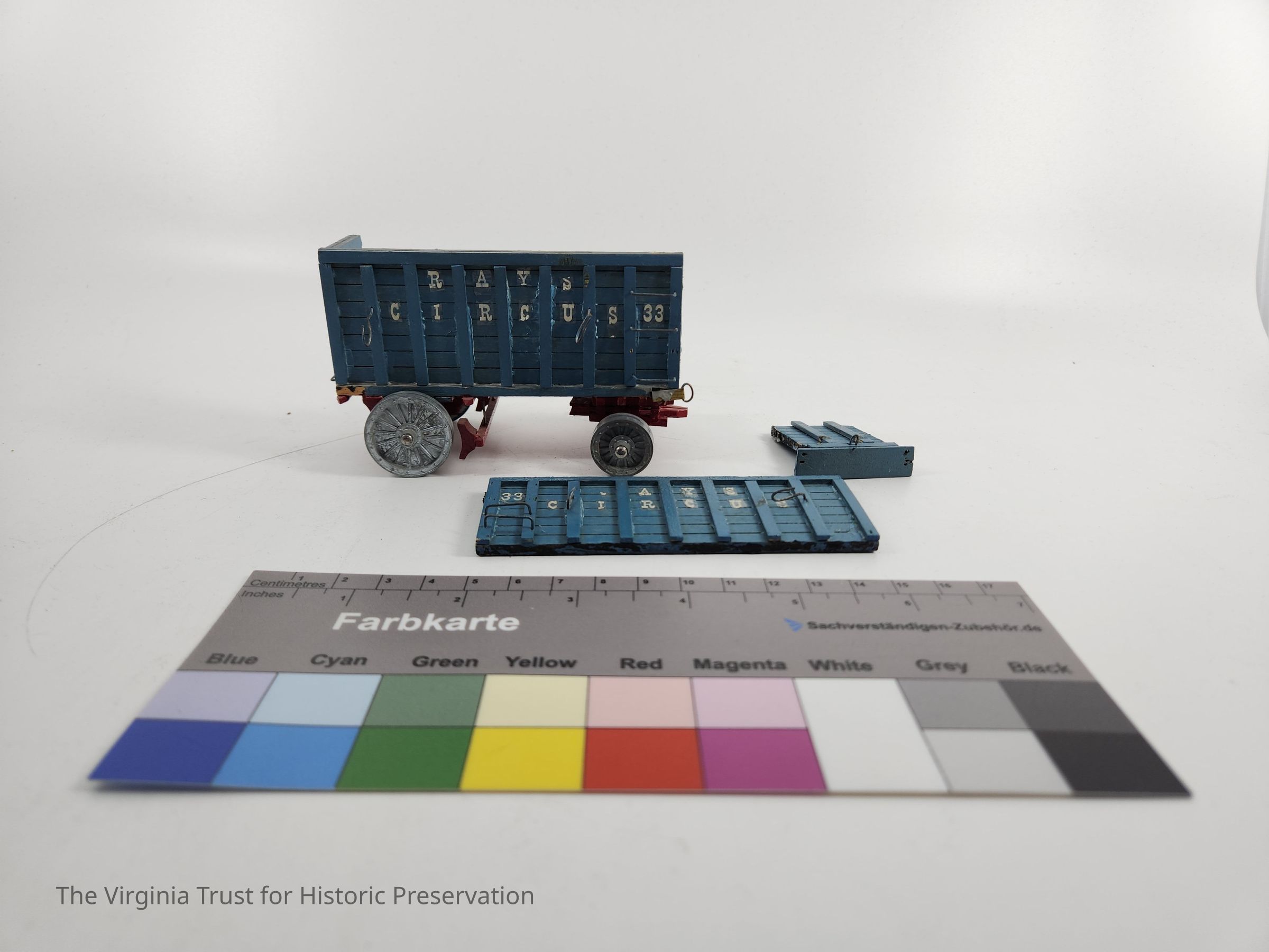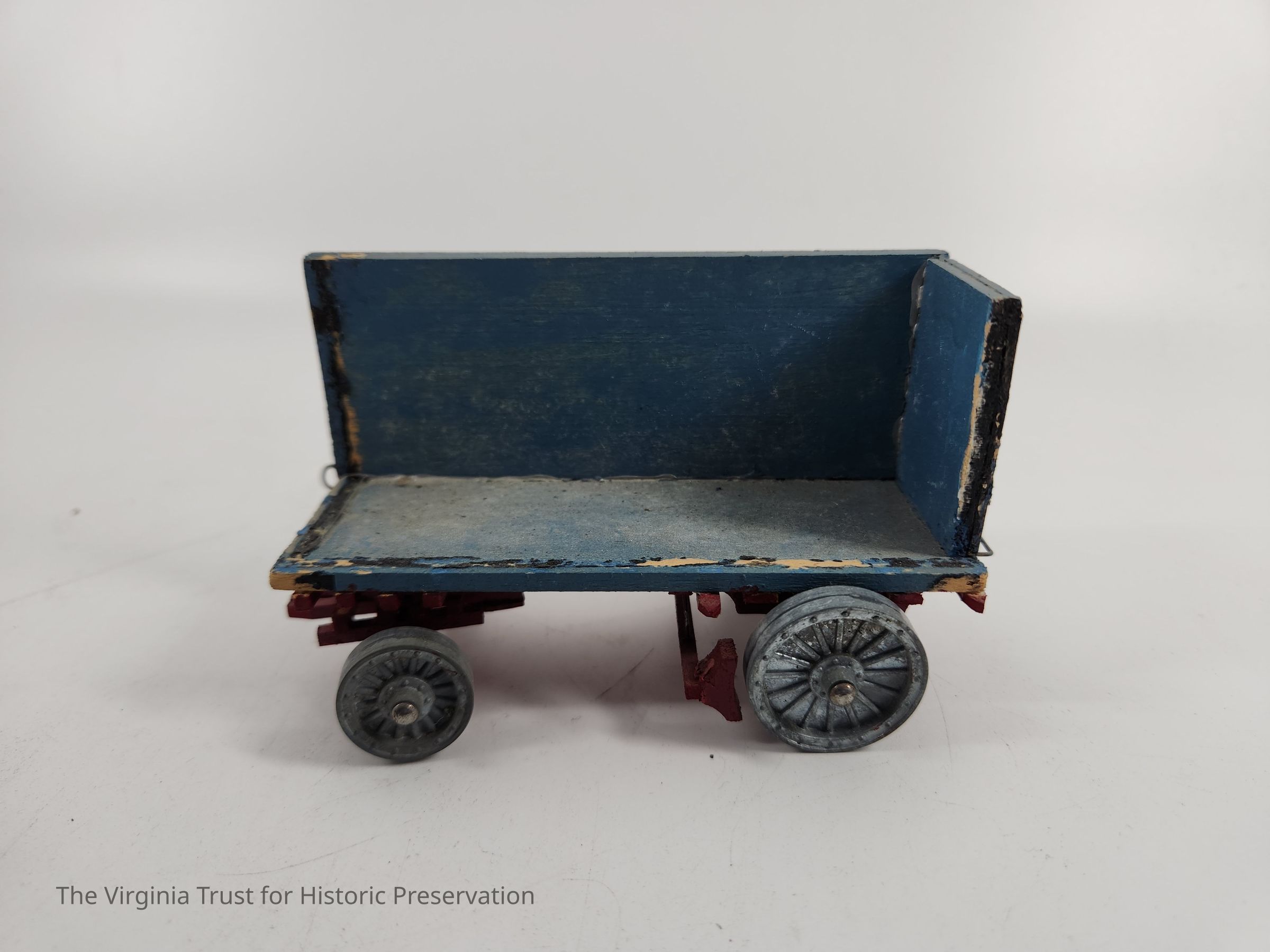 Blue toy train boxcar, with red undercarriage, open boxcar. "RAYS CIRCUS" and "33" written on both sides. One of a set of 8 (for Raymond L. Hawkins, son of Dorothy and Clayton).Dimensions