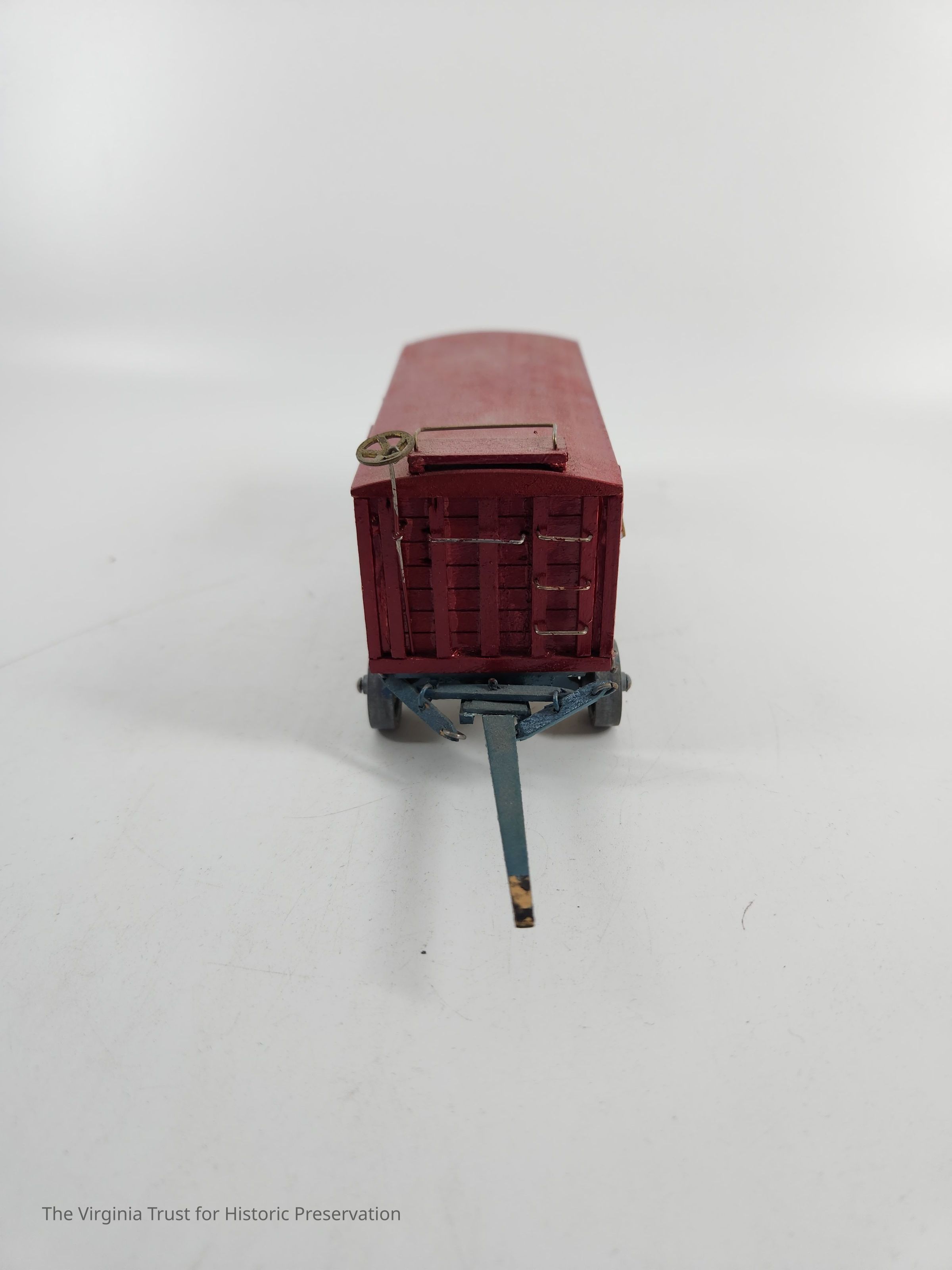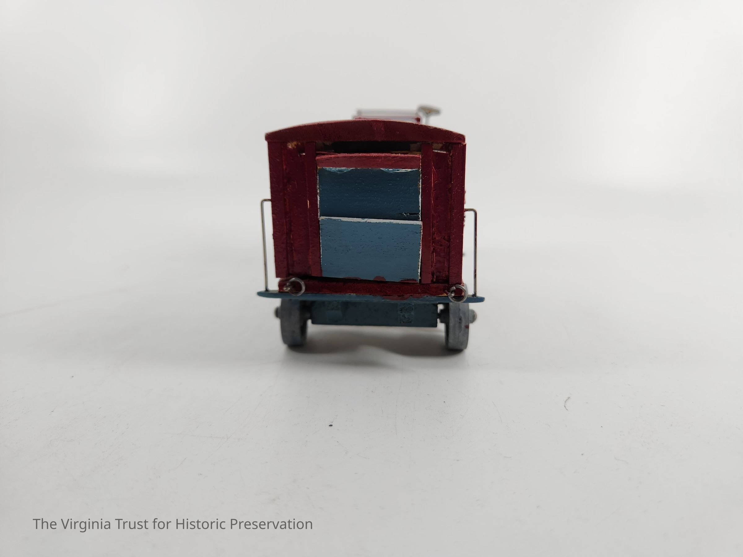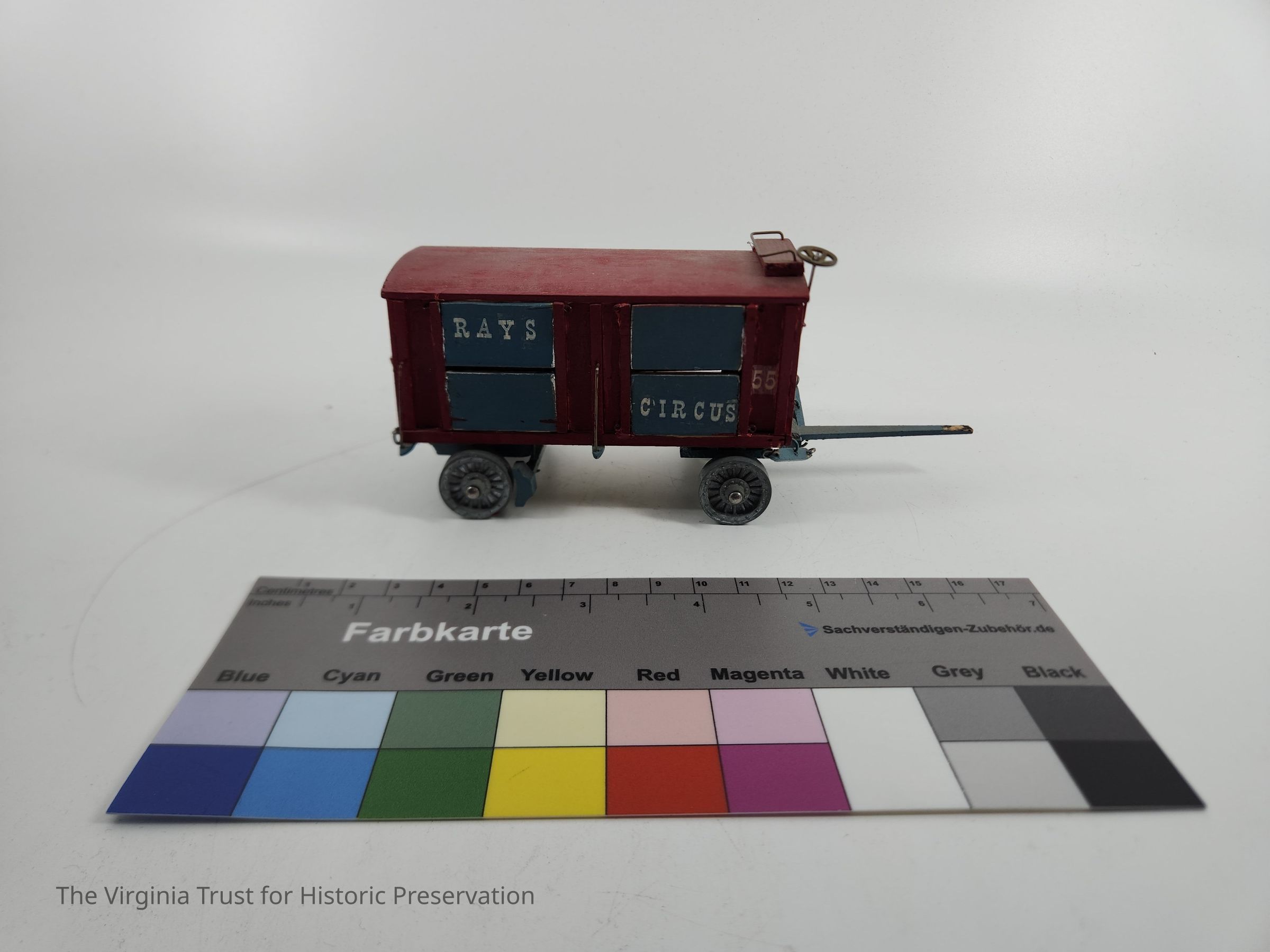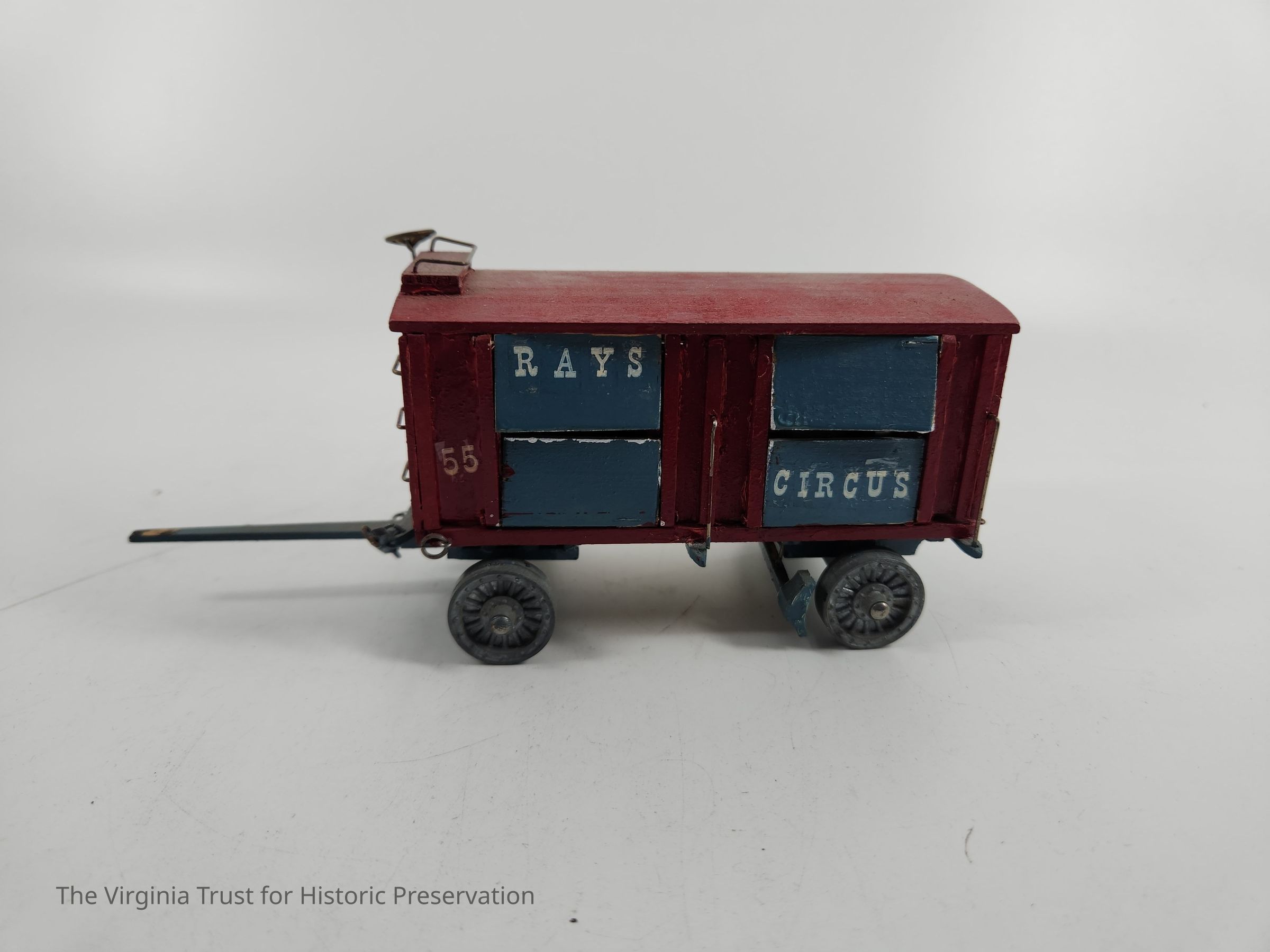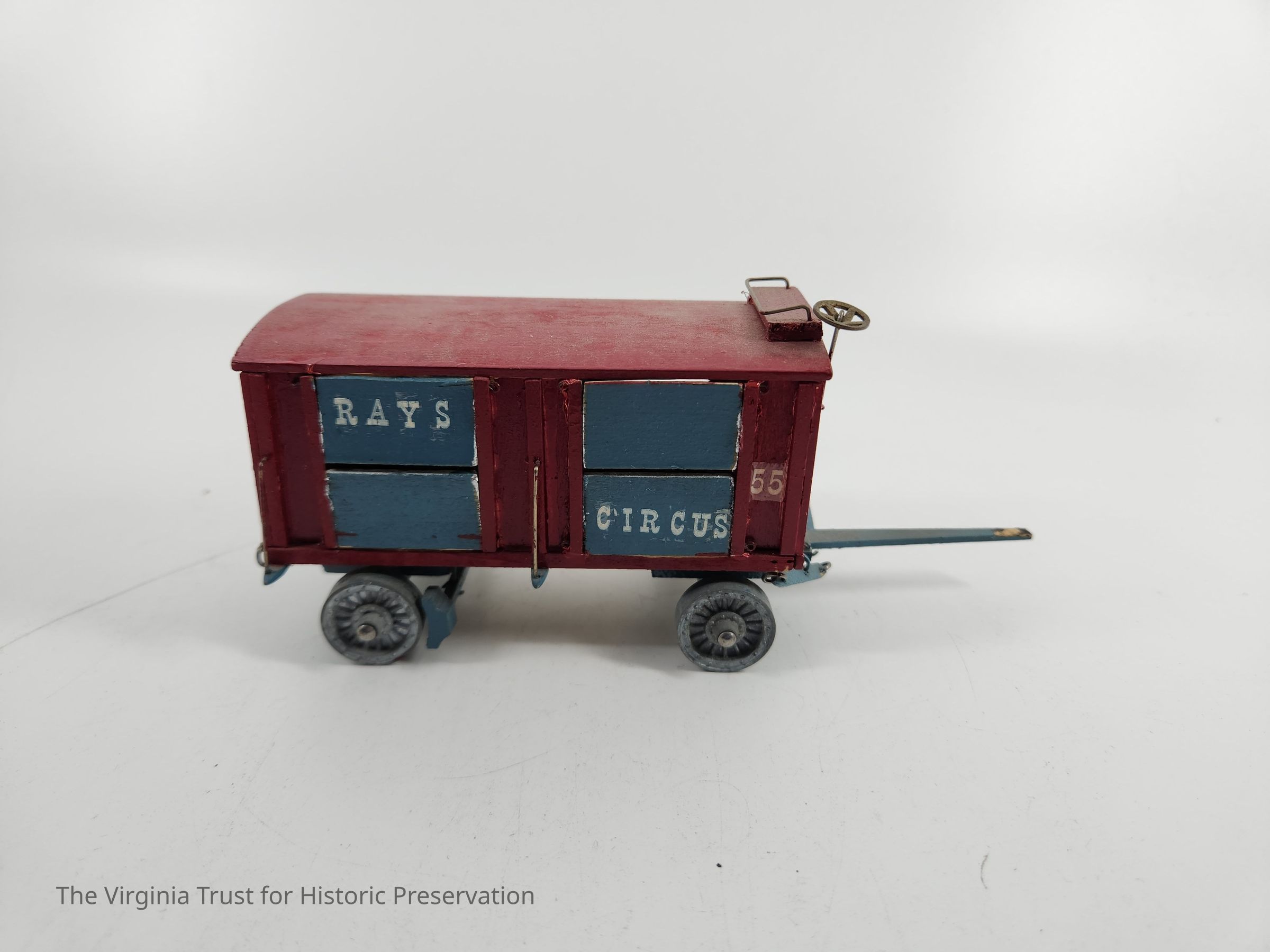 Red toy circus wagon with blue undercarriage and trim. "RAYS CIRCUS" and "55" written in white on both sides. One of a set of 8 handmade miniature circus wagons.Dimensions