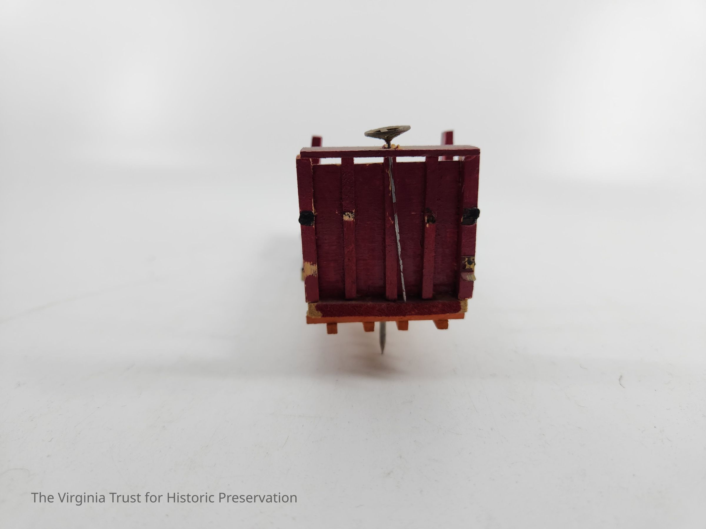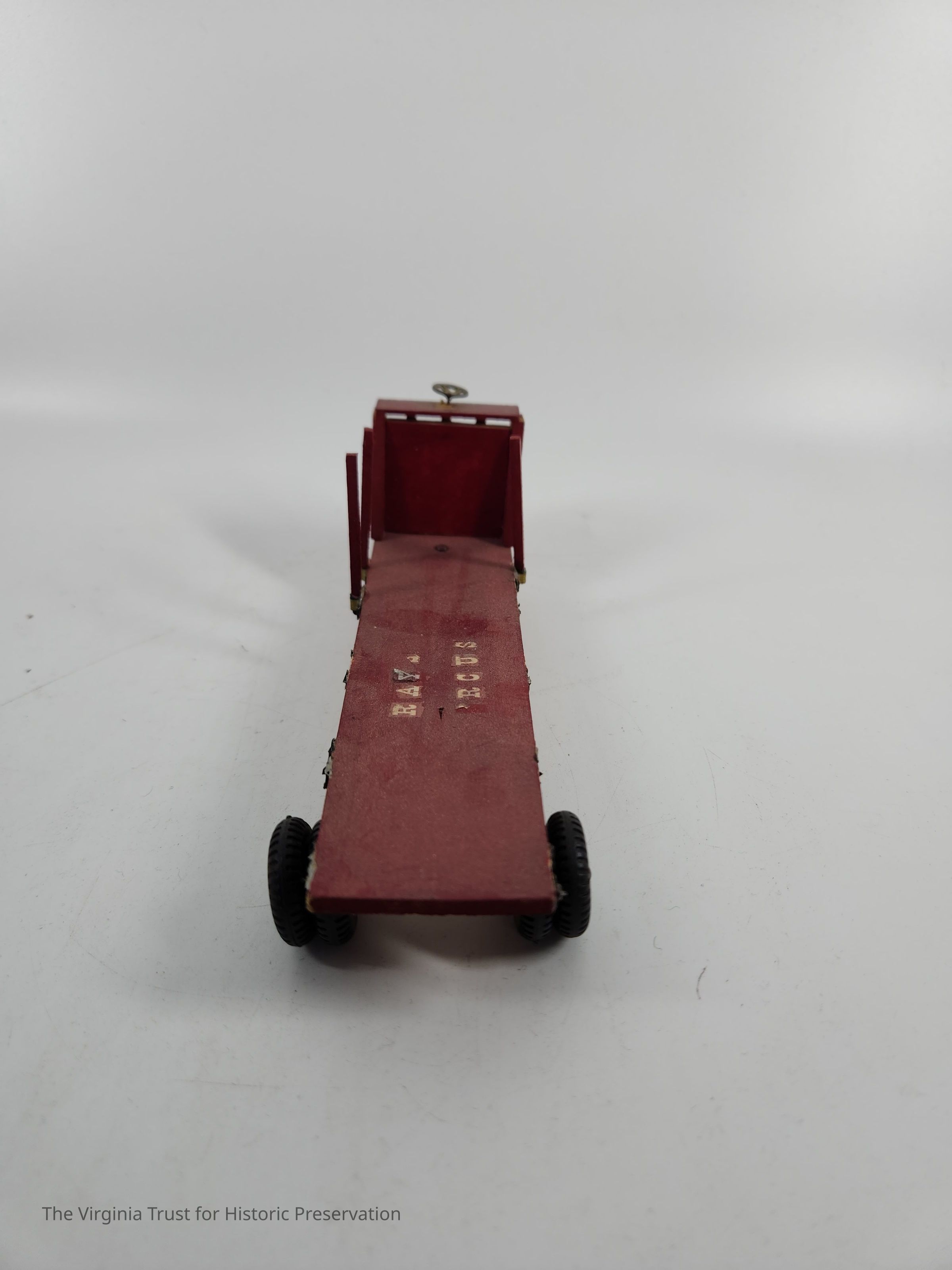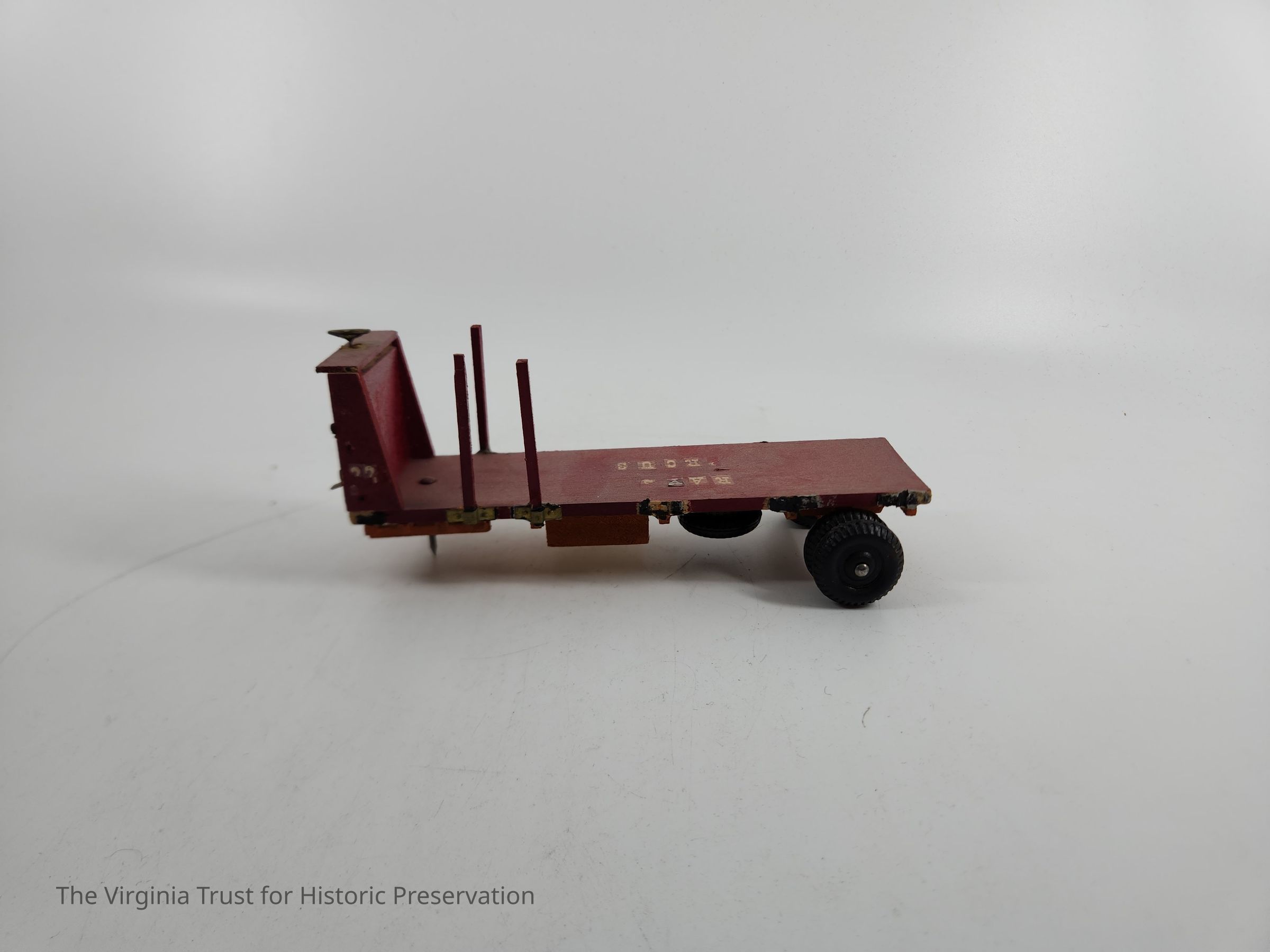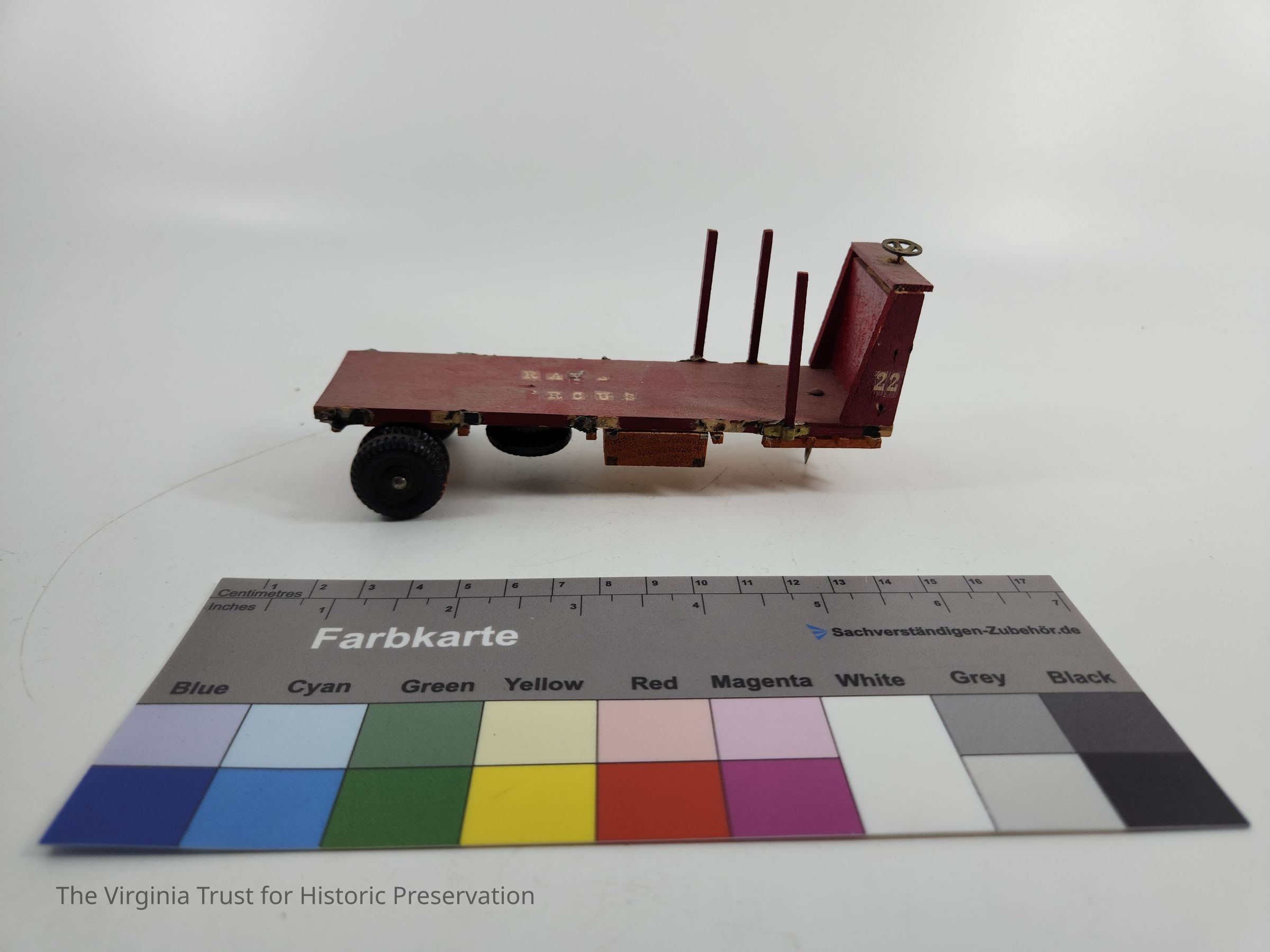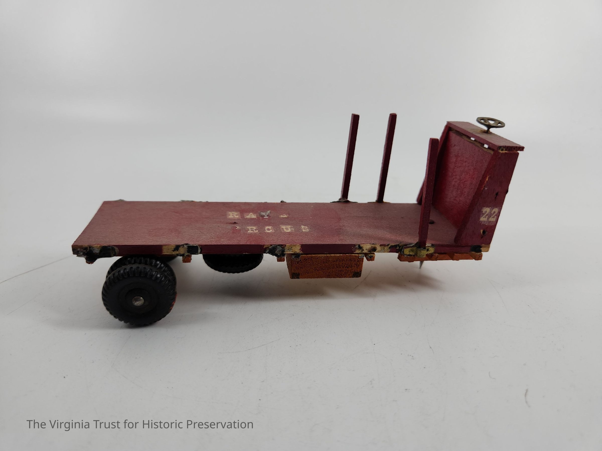 Red toy circus wagon with orange undercarriage and black wheels, long car with no sides but five supports on each side of the car, no wagon tongue. "RAYS CIRCUS written on the top with the "S" from "RAYS" and the "C" missing from "Circus," boxcar numbered "22.