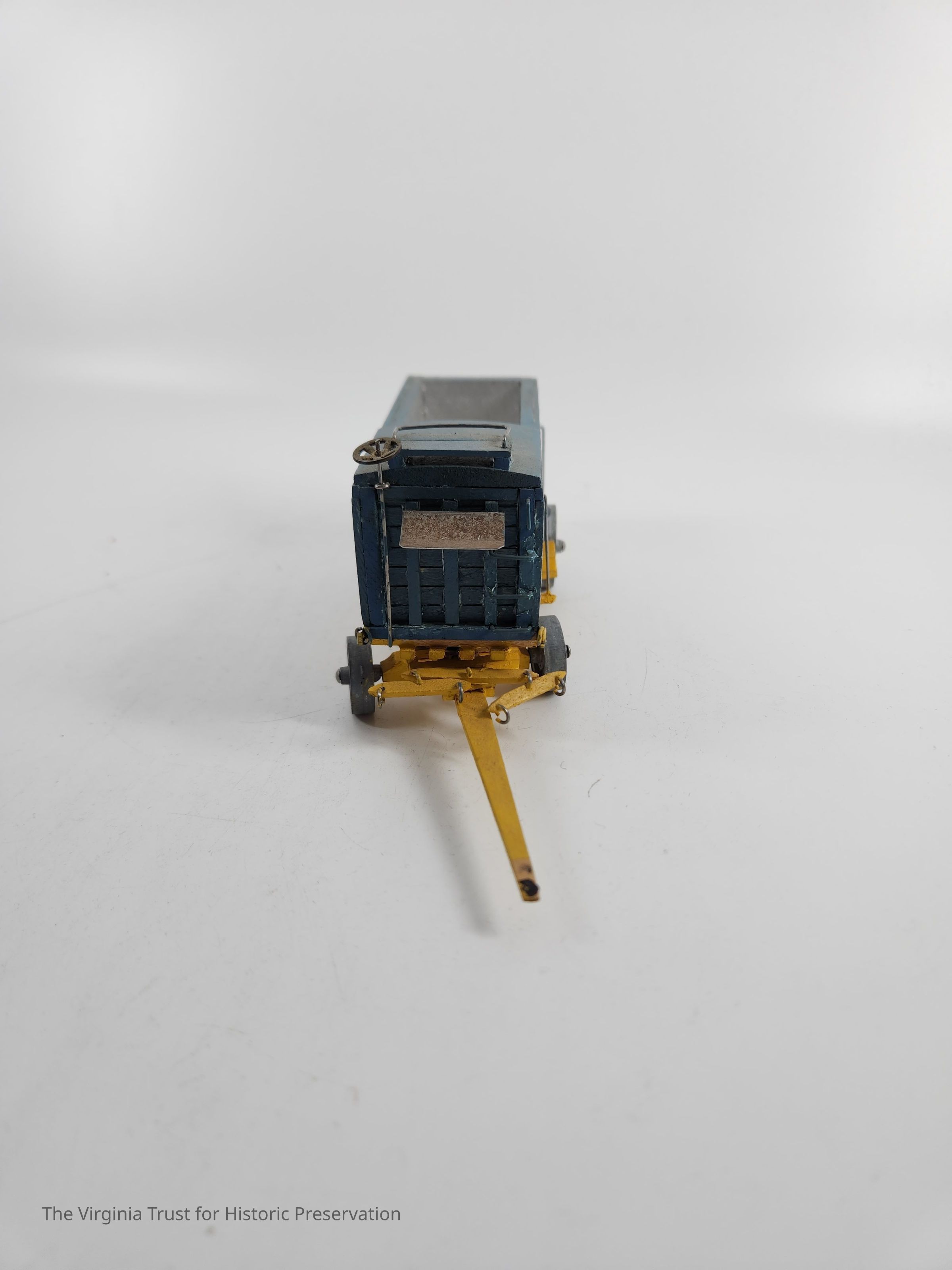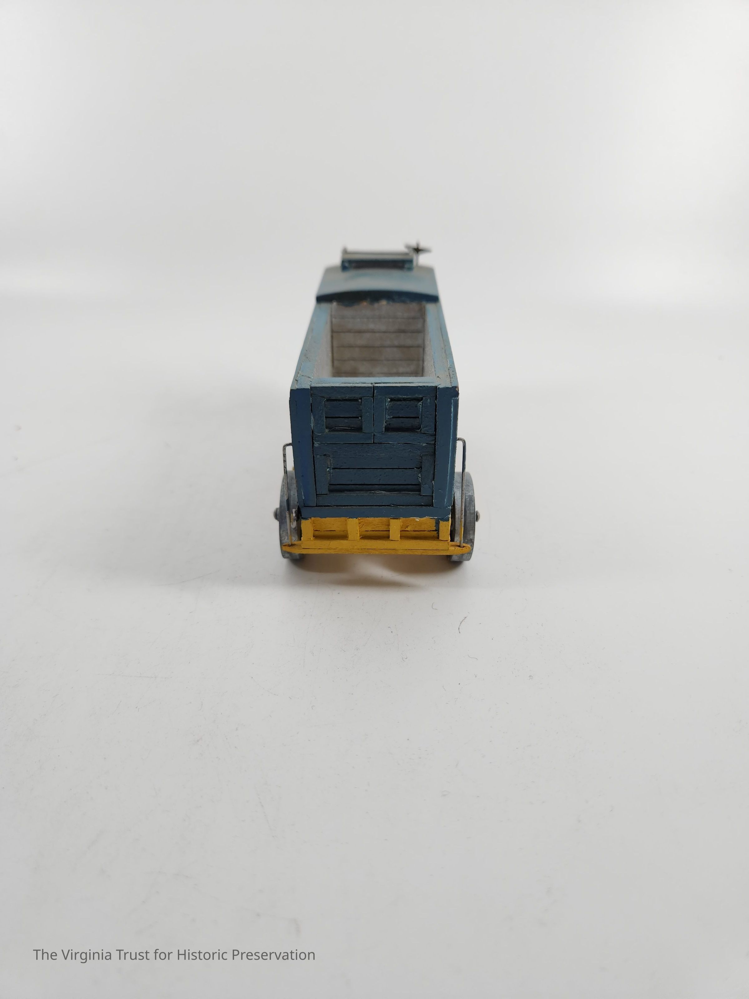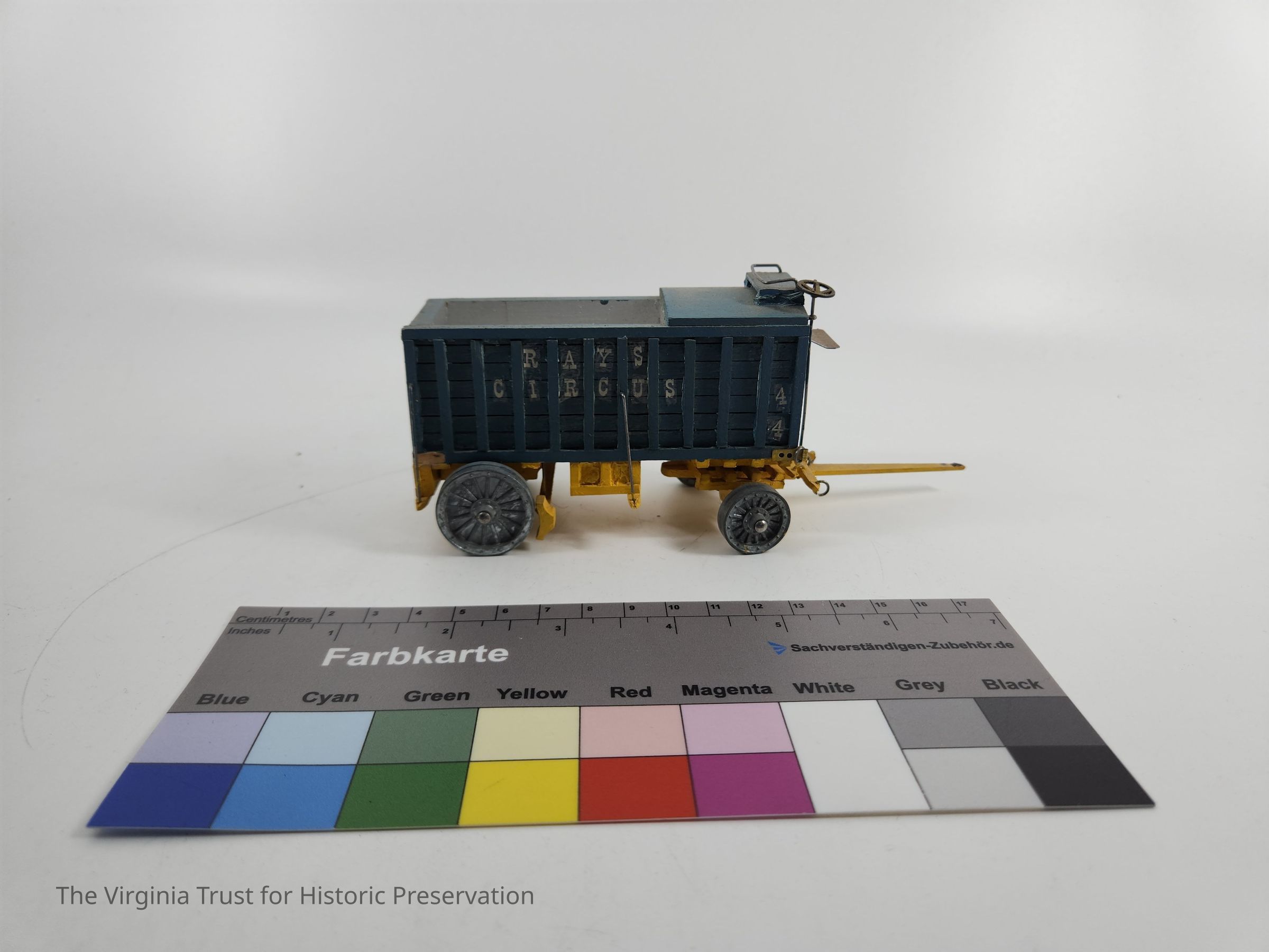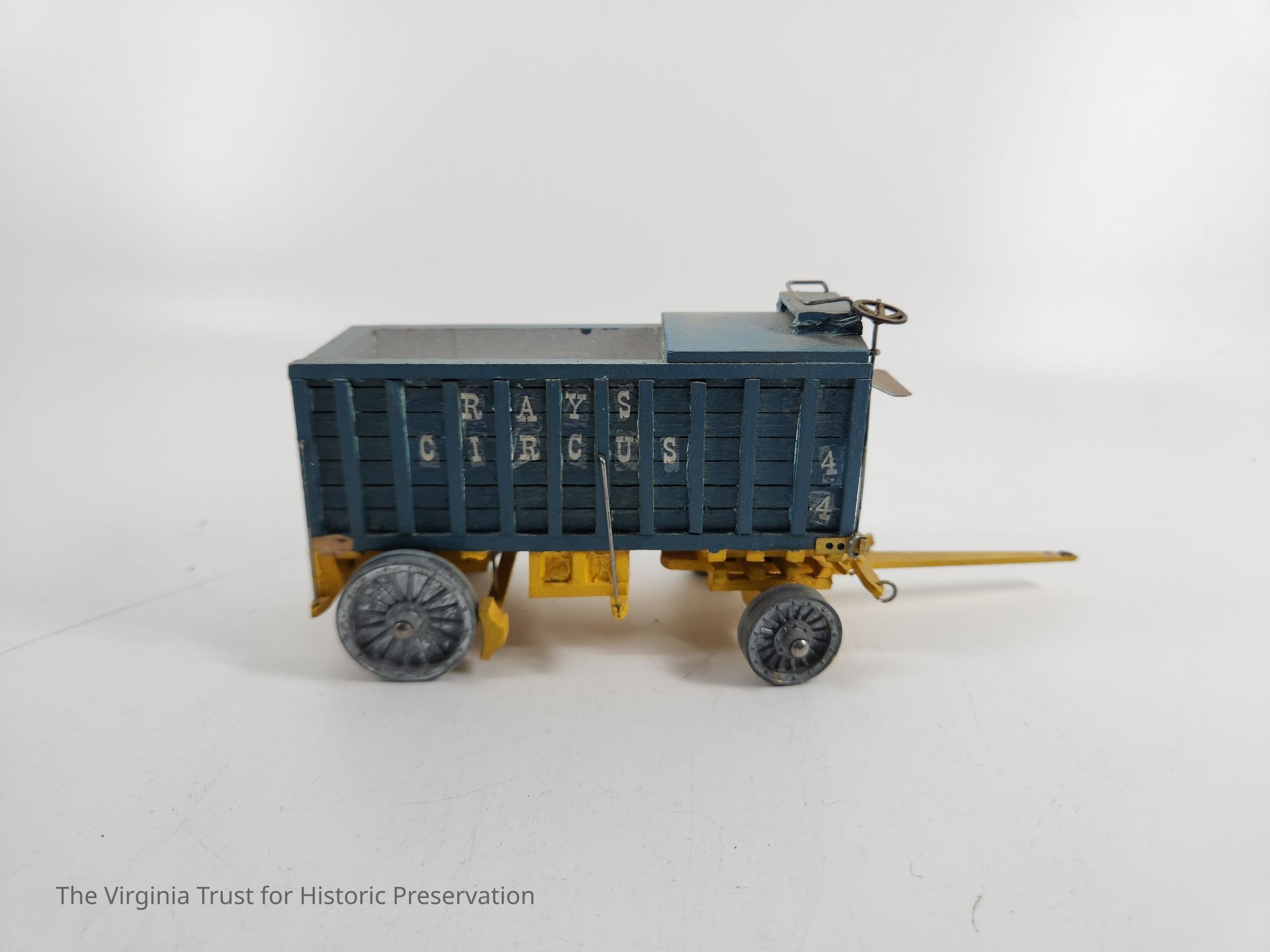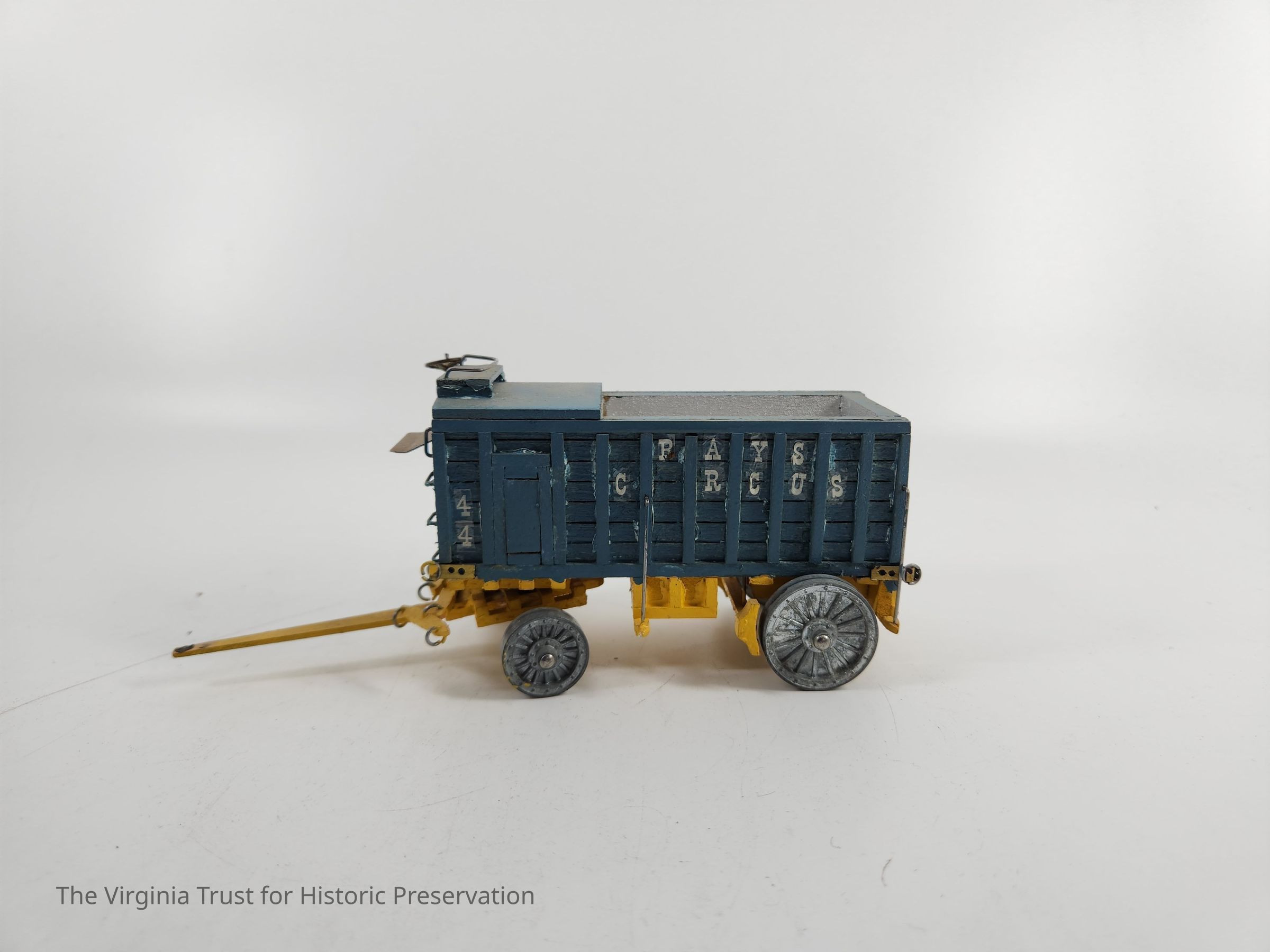 Blue toy circus train car with yellow undercarriage, boxcar with open top for 2/3 of length then closed top at the end. "Rays Circus" appears on both sides, boxcar numbered "44." One of a set of 8 handmade miniature circus wagons.Dimensions