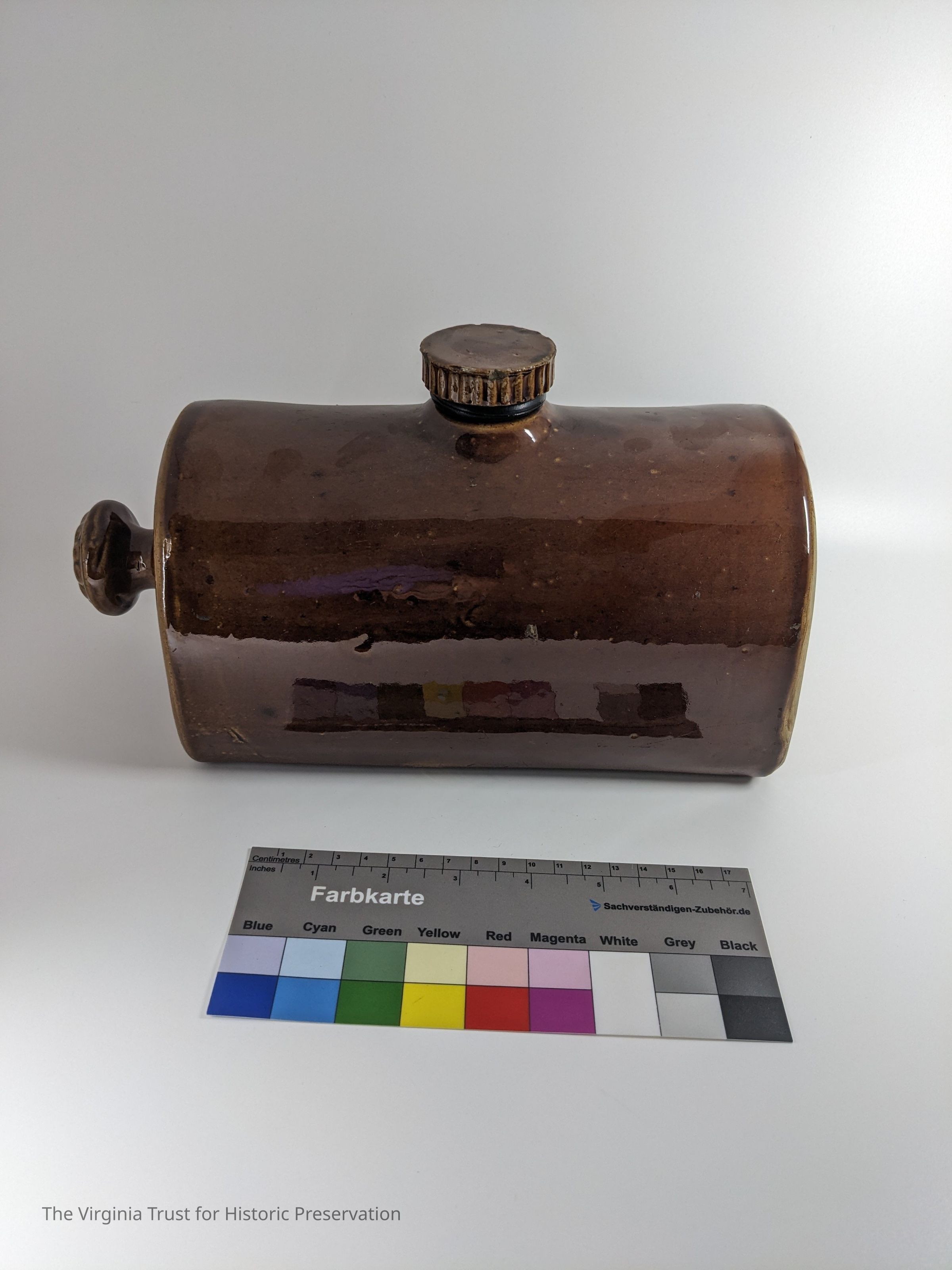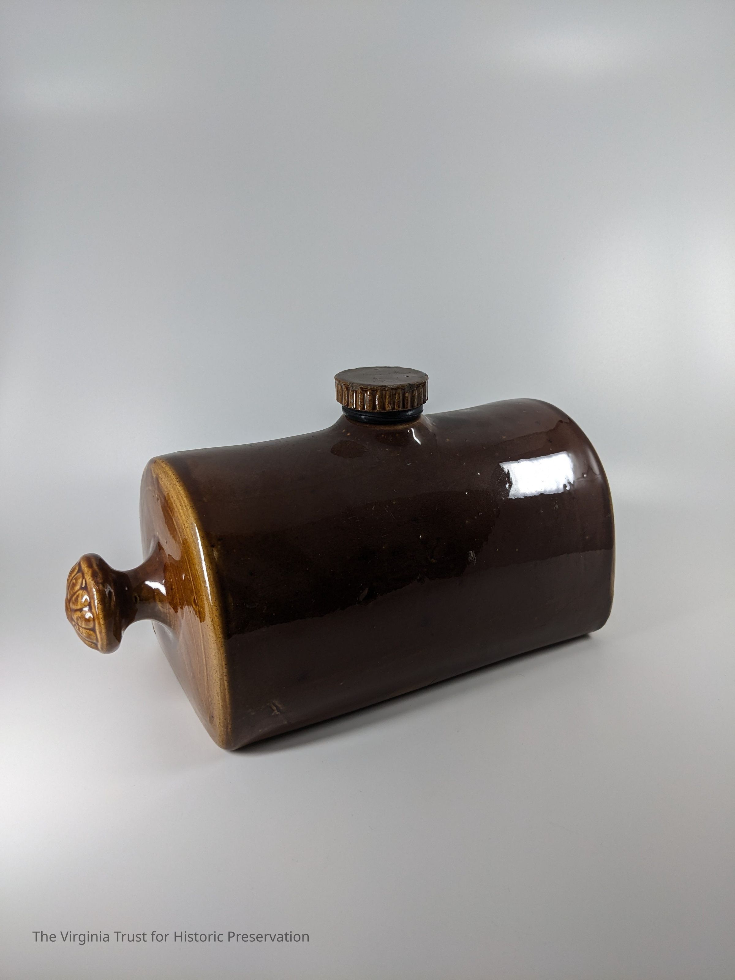 Ceramic foot warmer. Rockingham glaze pottery, mid-to-late 1800s, possibly made in Bennington, VT. Heavy dark rust glaze; molded handle on end and ceramic screw in cap.Dimensions