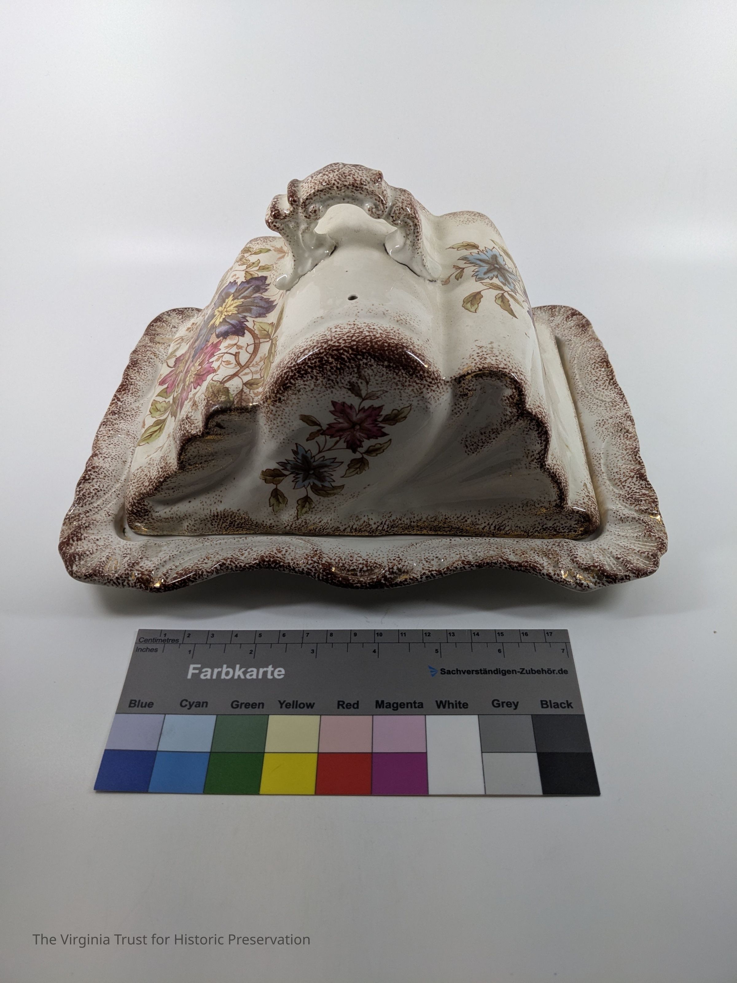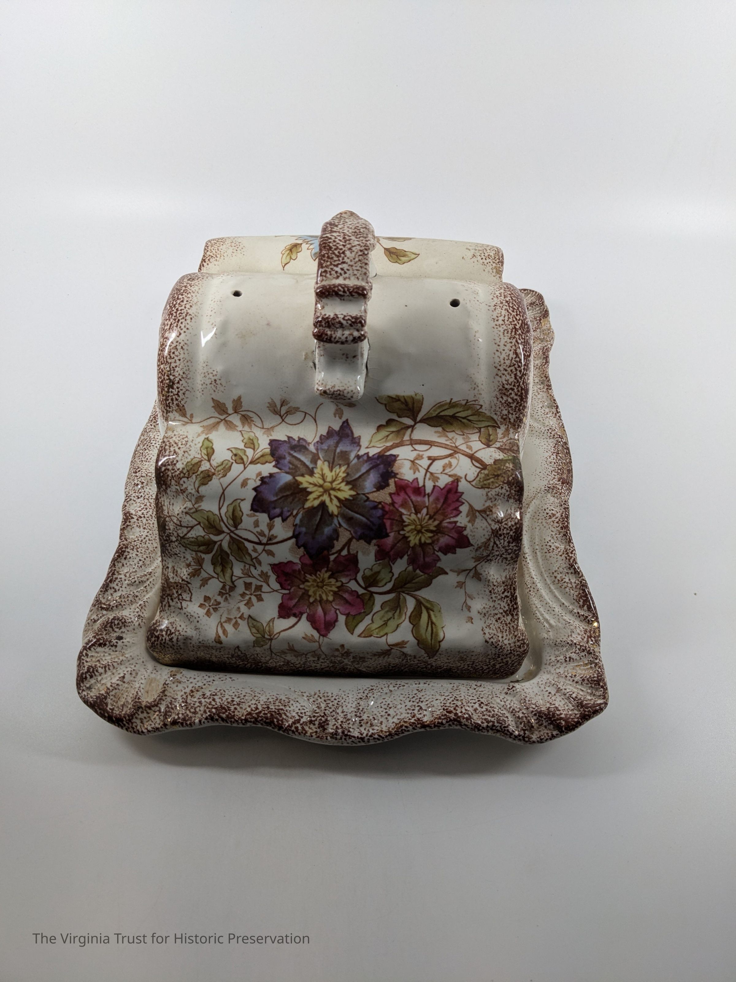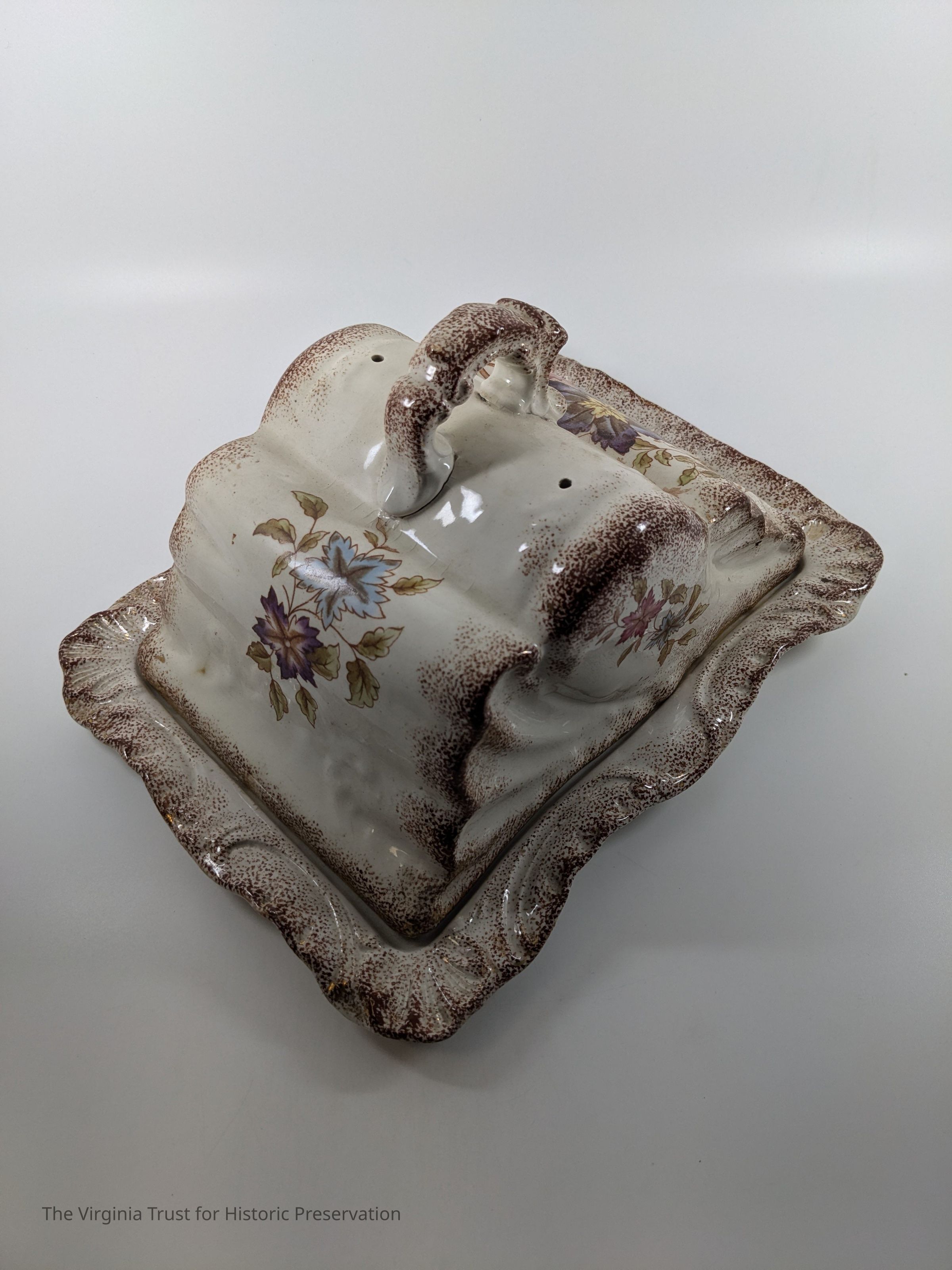 Cheese dish. Two pieces. Ceramic. White background with edges splattered red-brown design. Top painted with dark red and blue floral design. Owners mark "206" on base.Dimensions