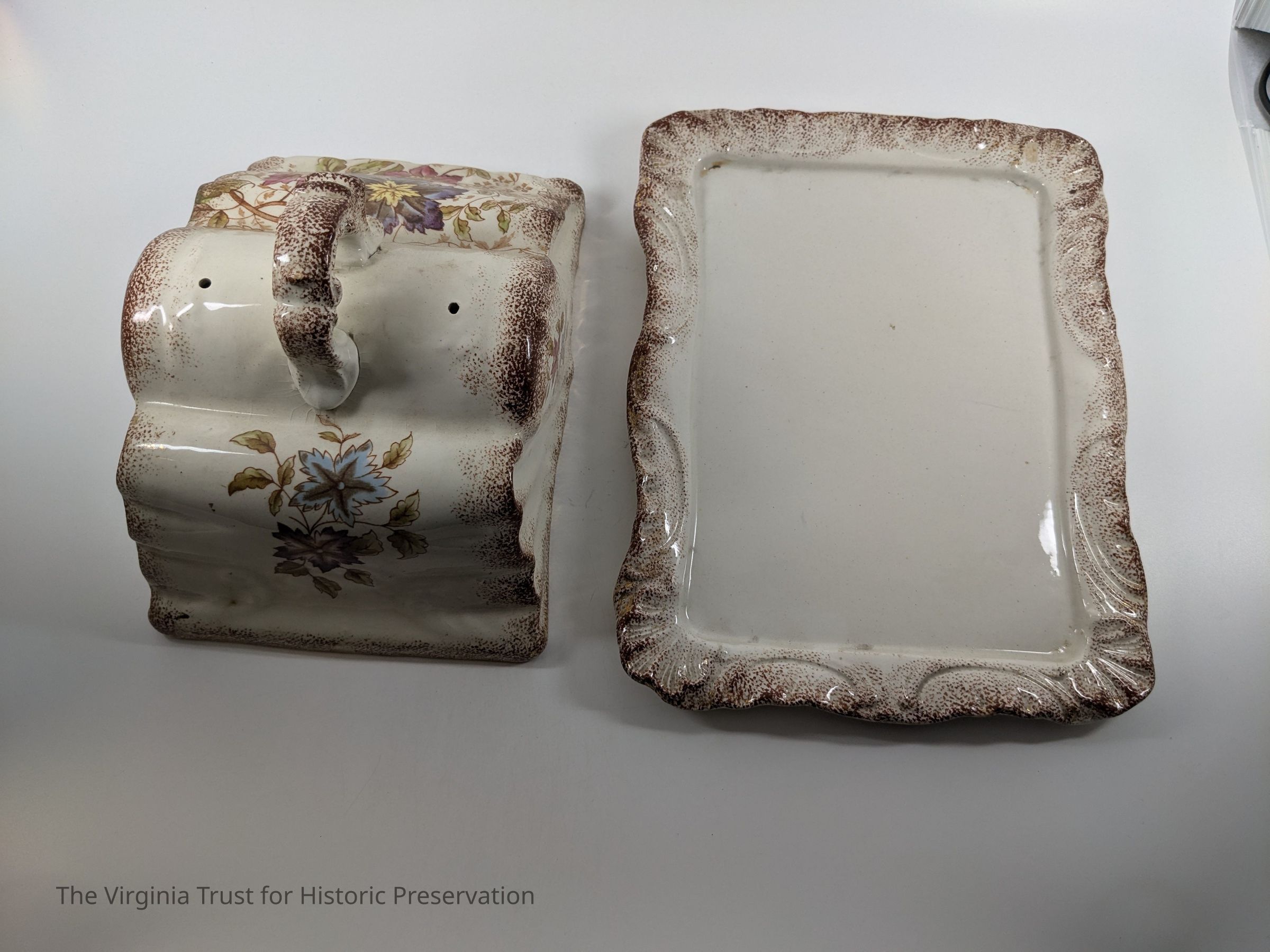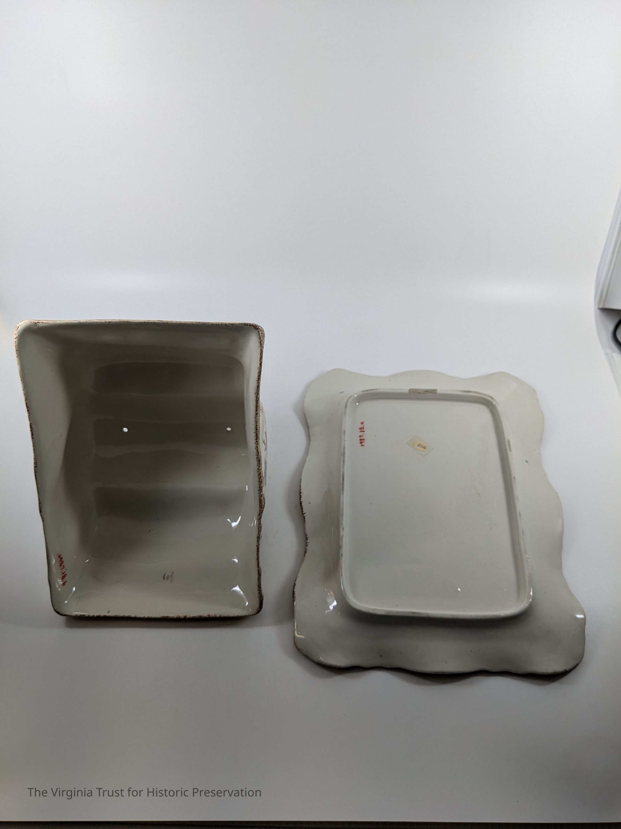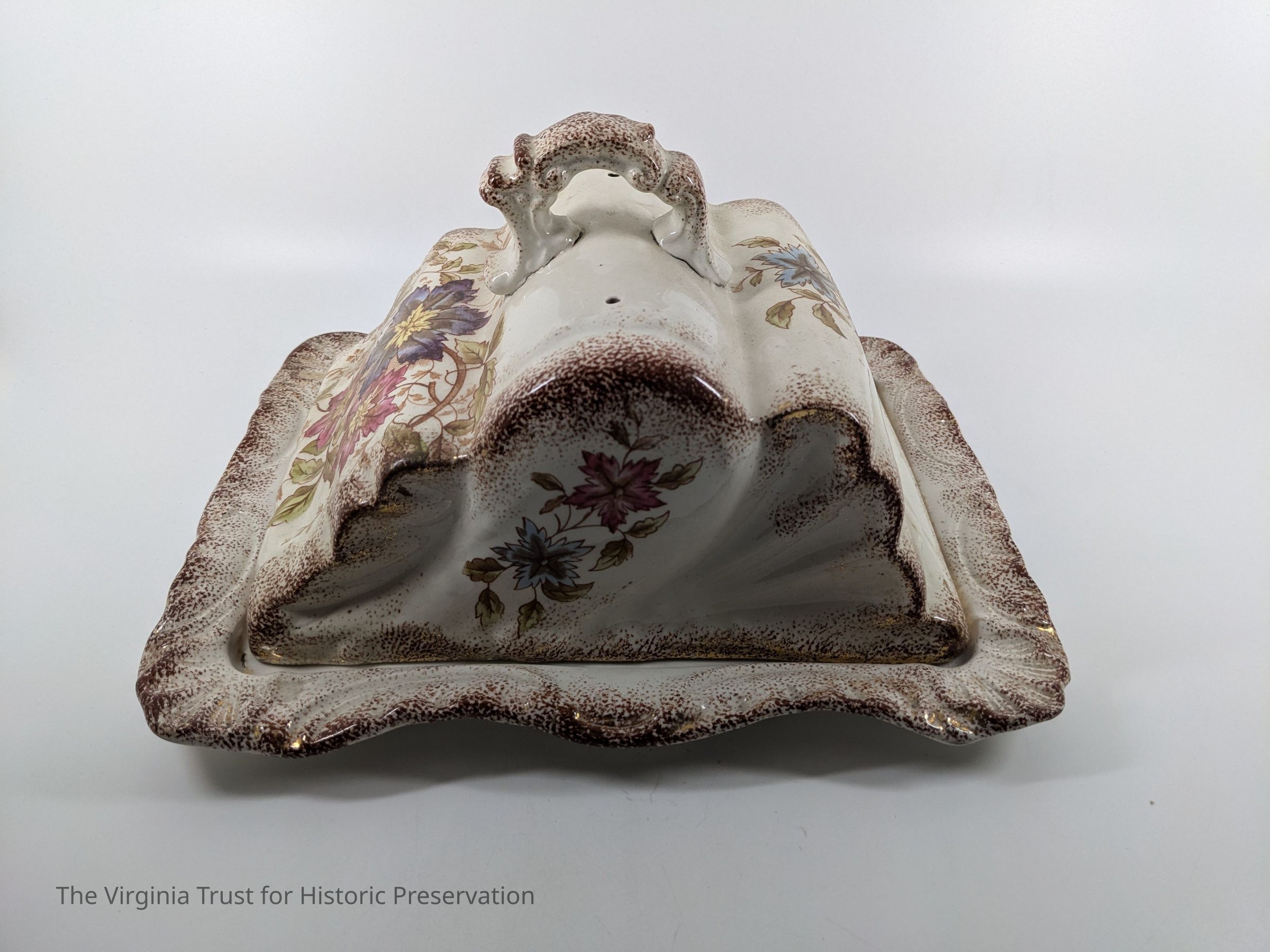 Cheese dish. Two pieces. Ceramic. White background with edges splattered red-brown design. Top painted with dark red and blue floral design. Owners mark "206" on base.Dimensions