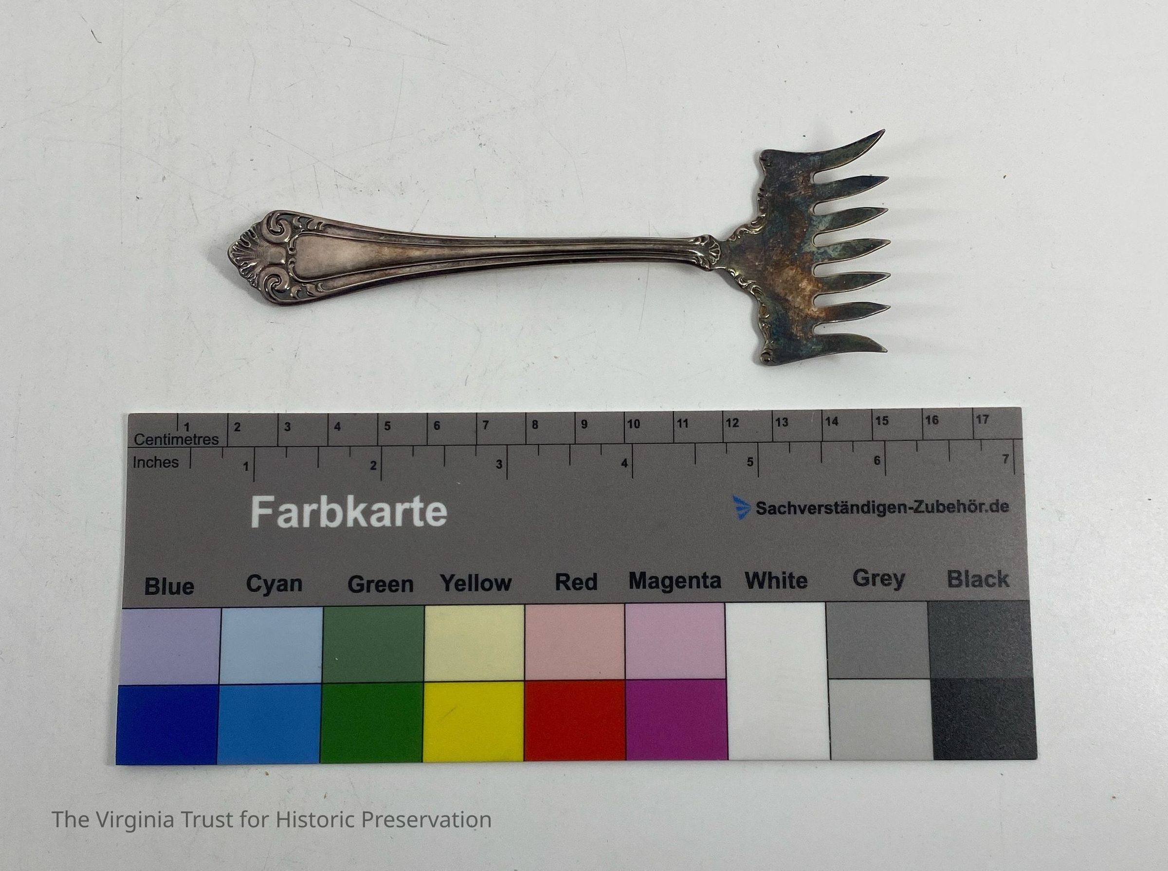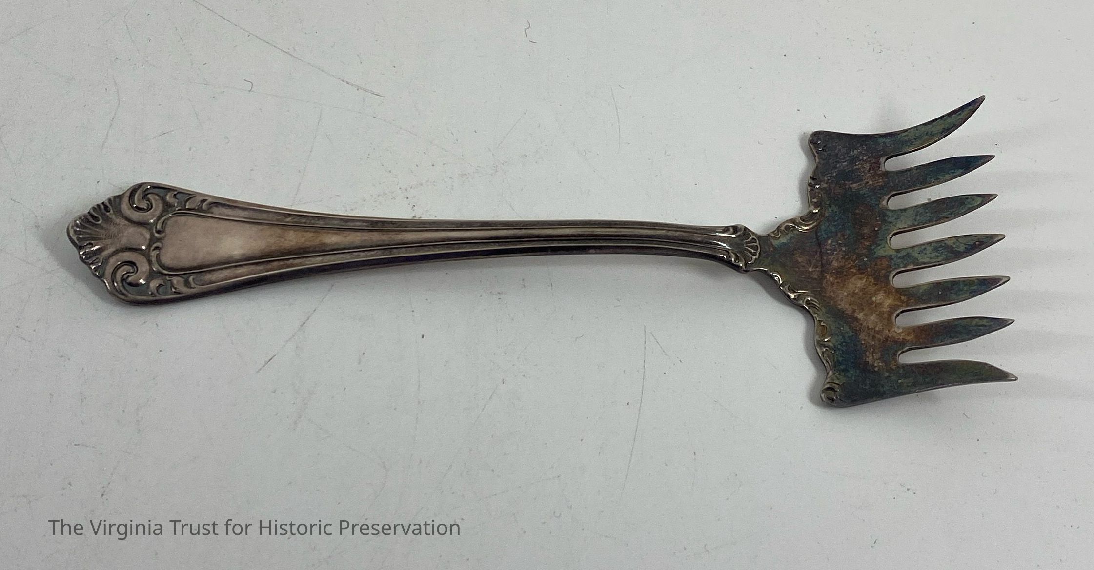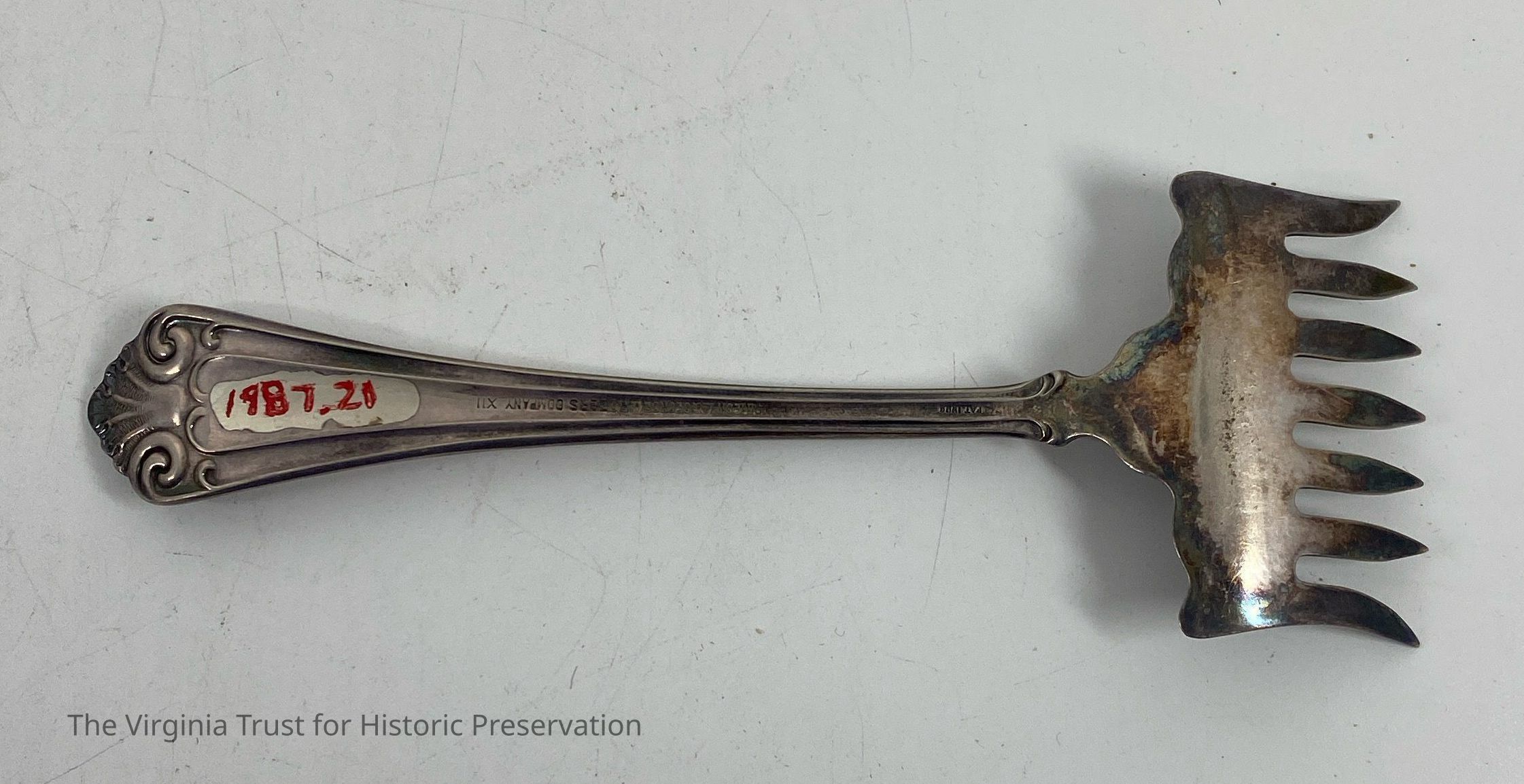 Sardine fork. Marked: "William & George H. Rogers Company XII" and "Pat. 1881 (?)." Seven pronged with scroll handle design.