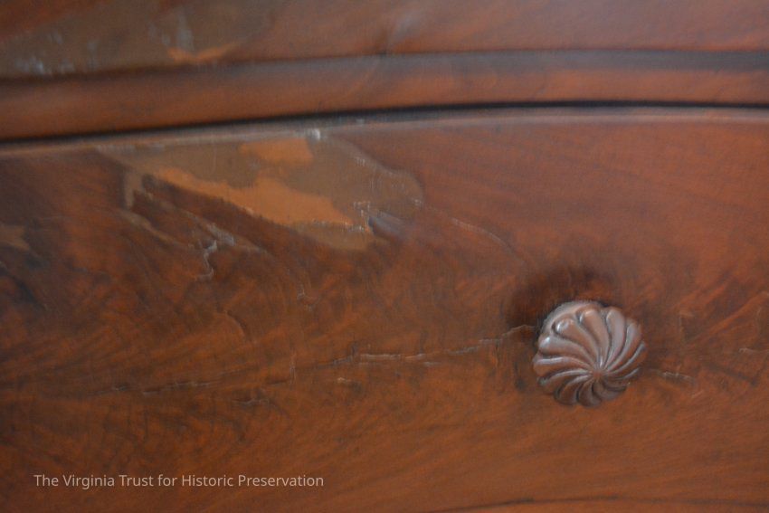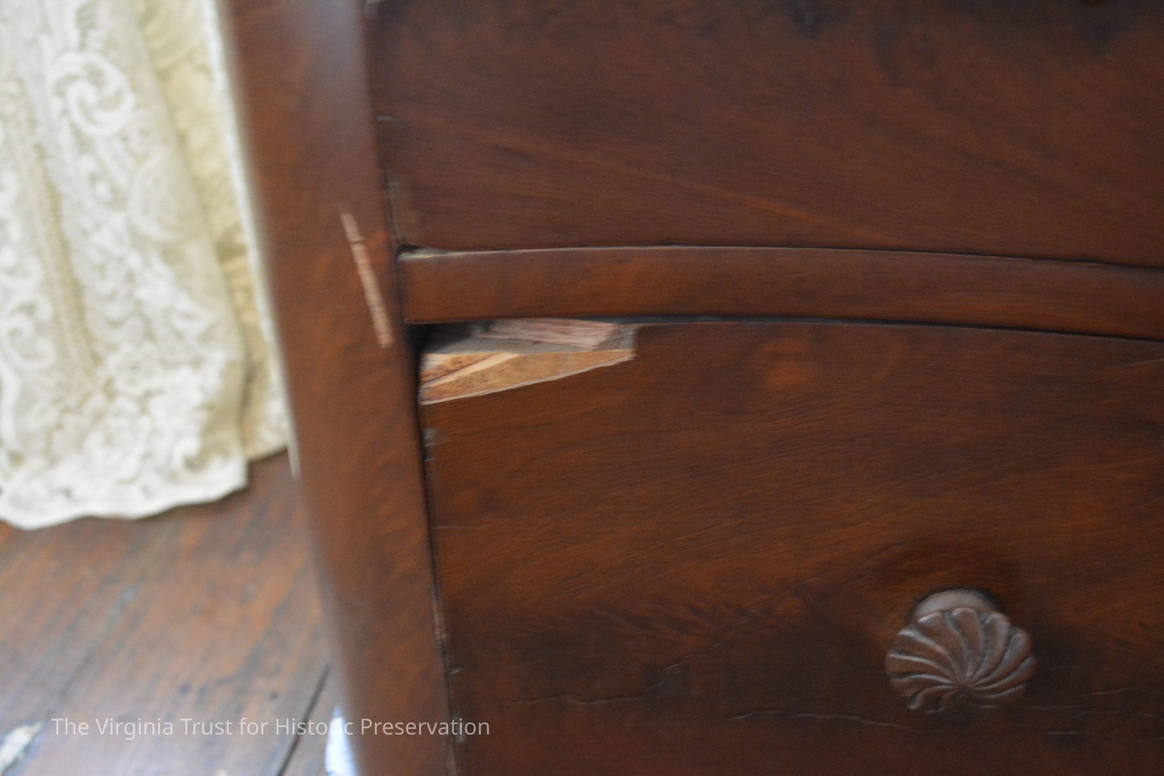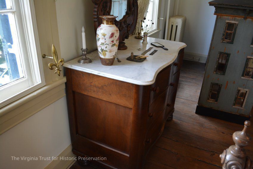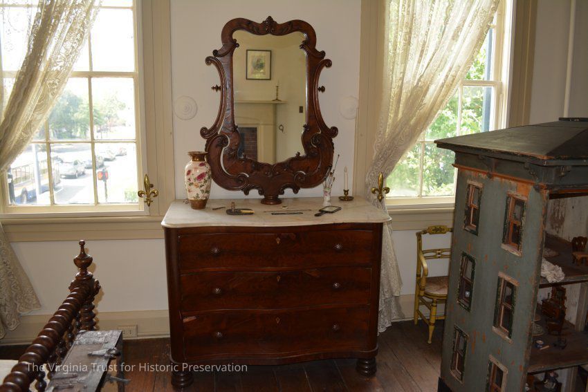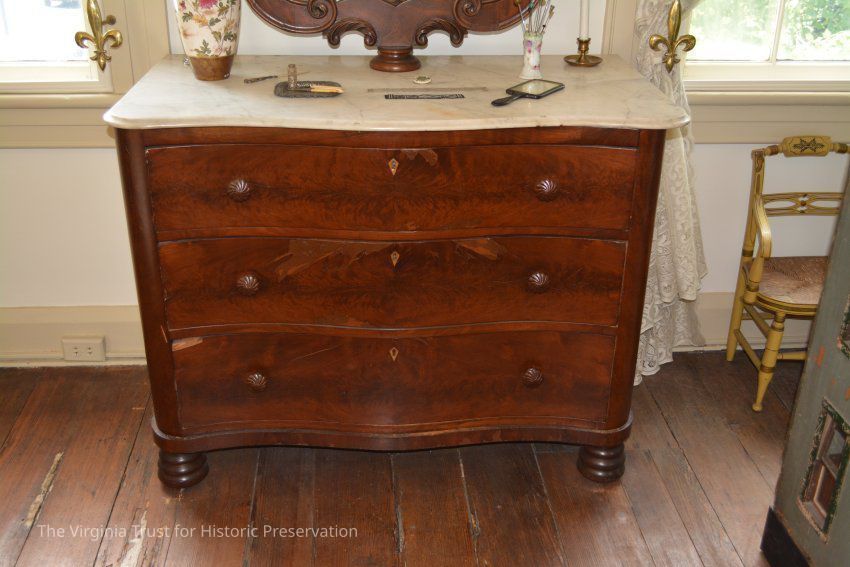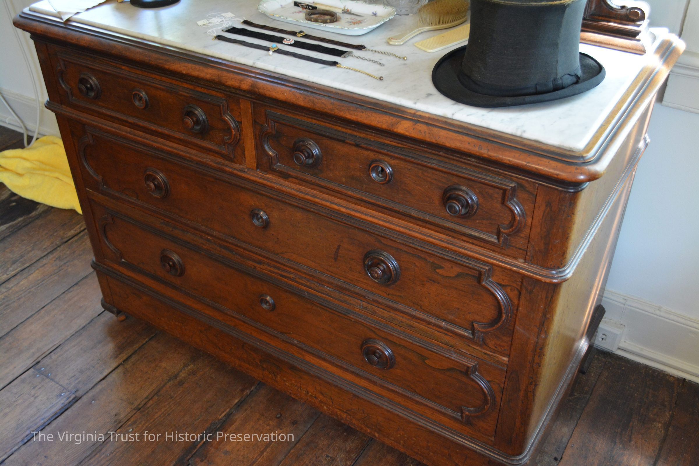 Dresser, three drawers with carved wood handles. White marble top with slight brown stain in middle. Ornately carved mirror on center insert into top of dresser. Made by the Green Steam Furniture Factory, Alexandria, VA, ca. 1856.Dimensions