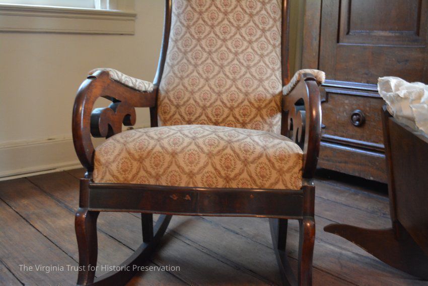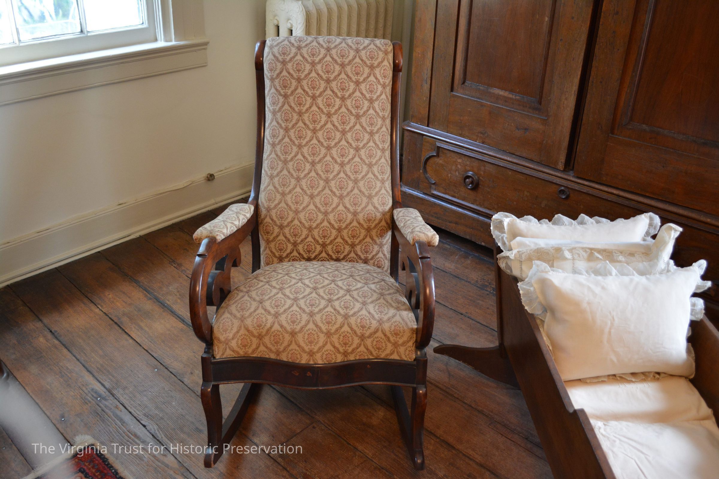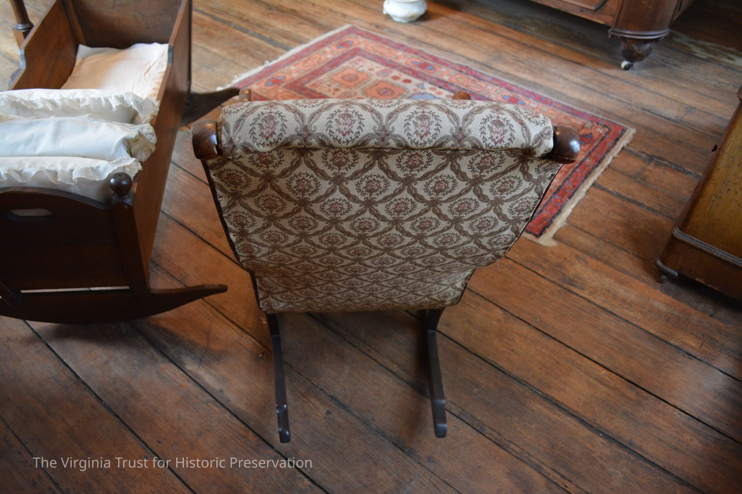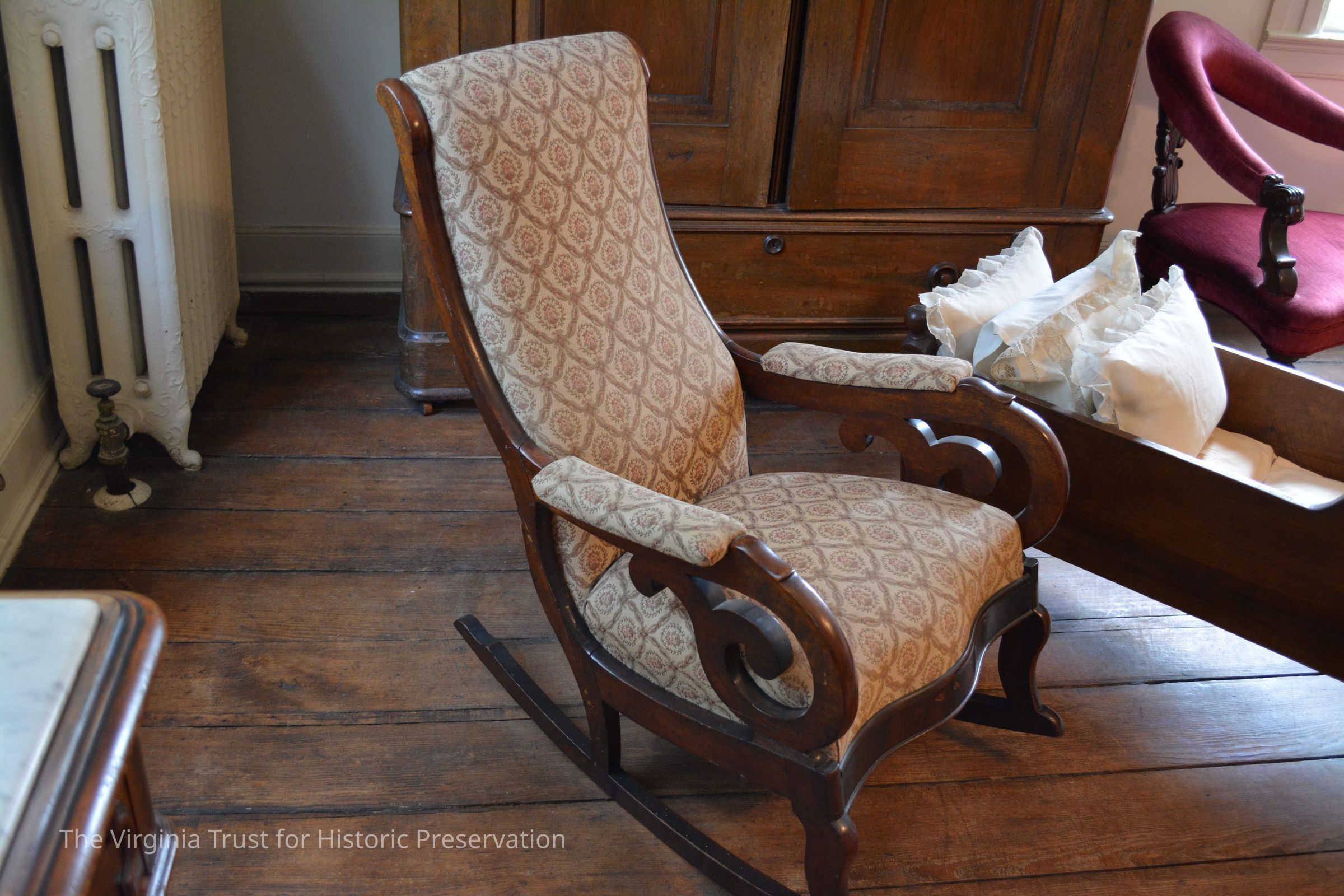 "Lincoln Style" mahogany rocking chair. Back, seat and arms upholstered in small tan, pink, and green floral print.