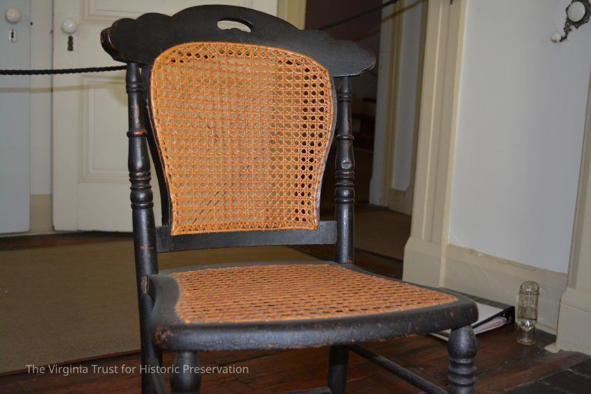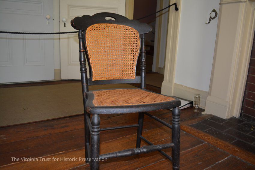 One of two small side chairs. Caned seats and backs. Finish is darker than the other (1987.027 A).