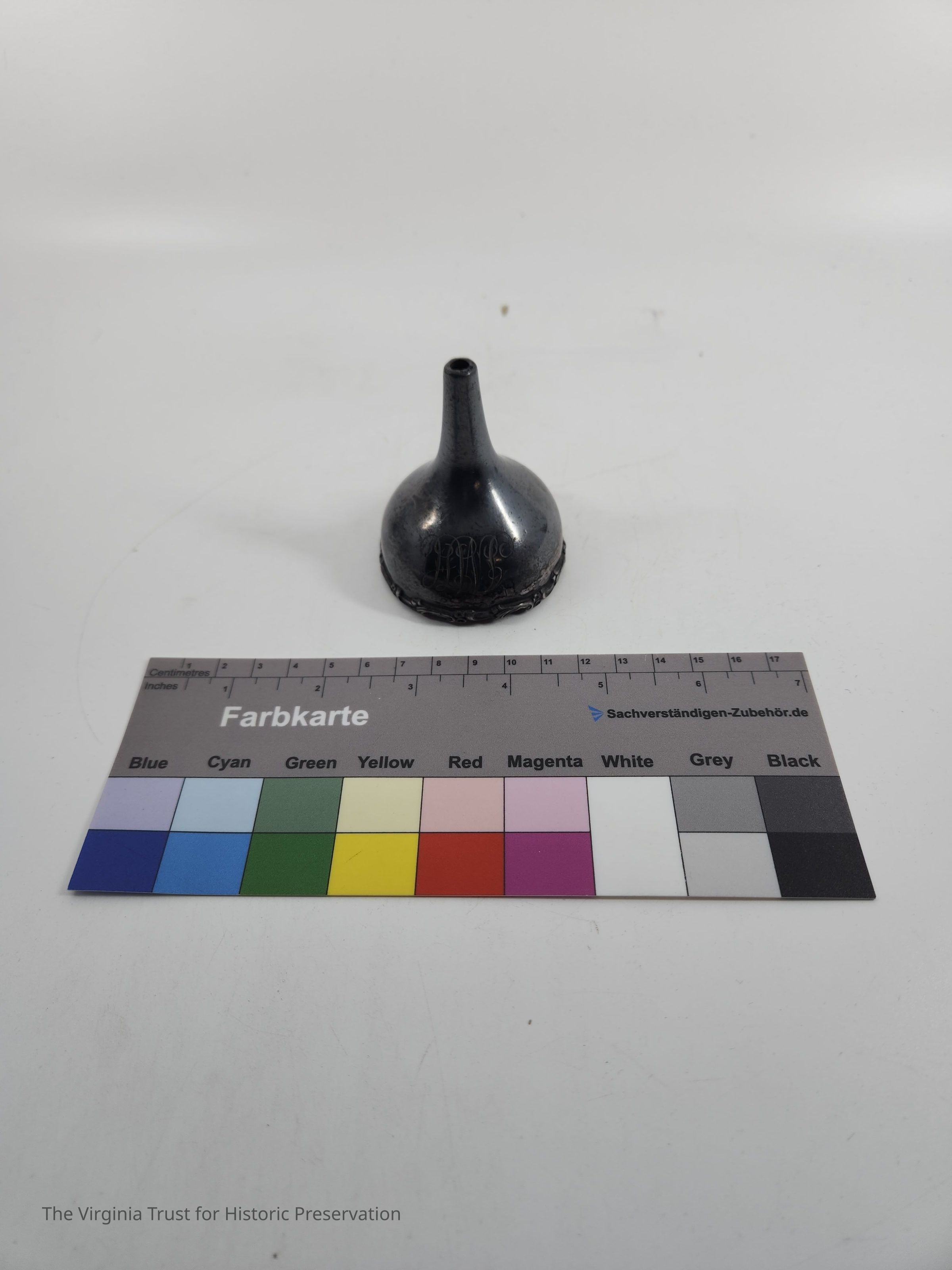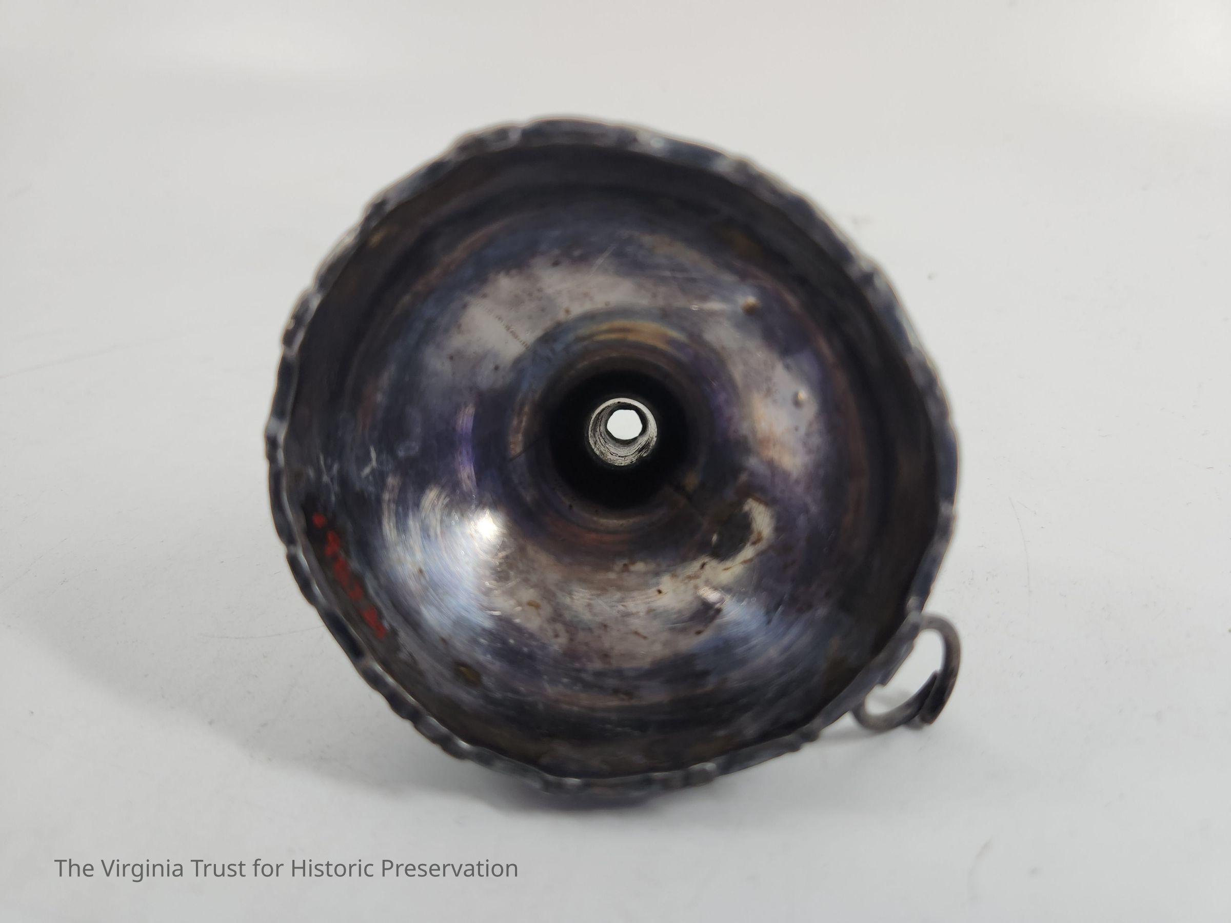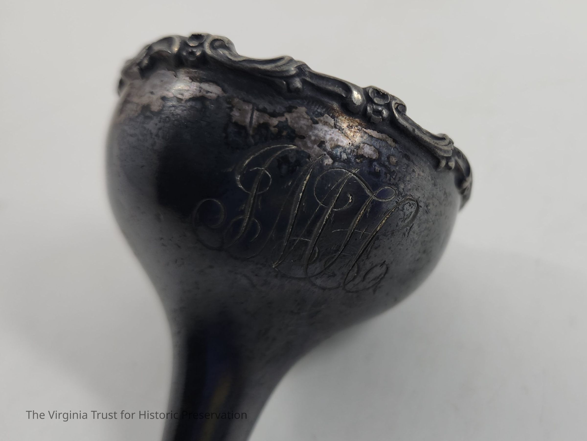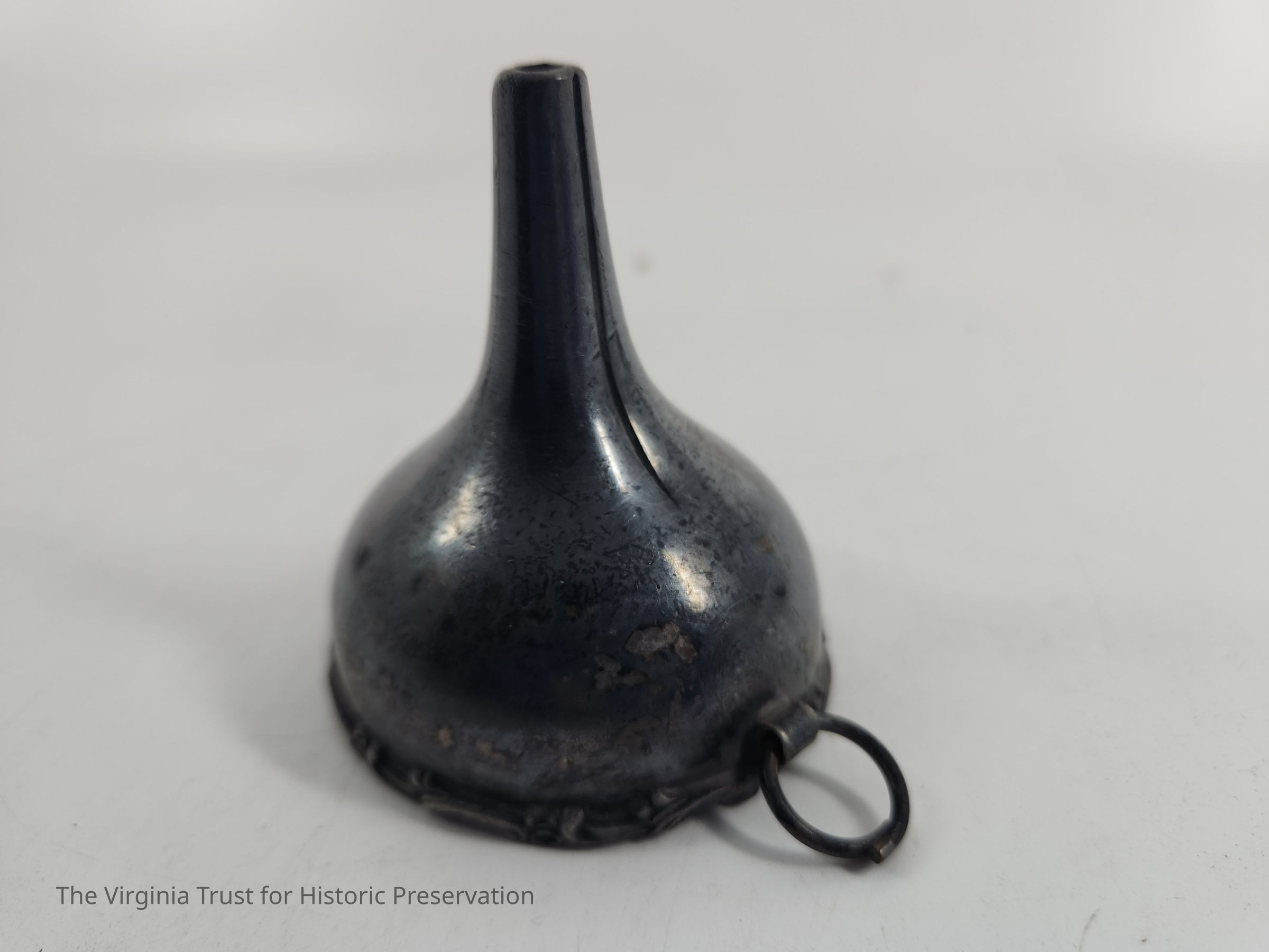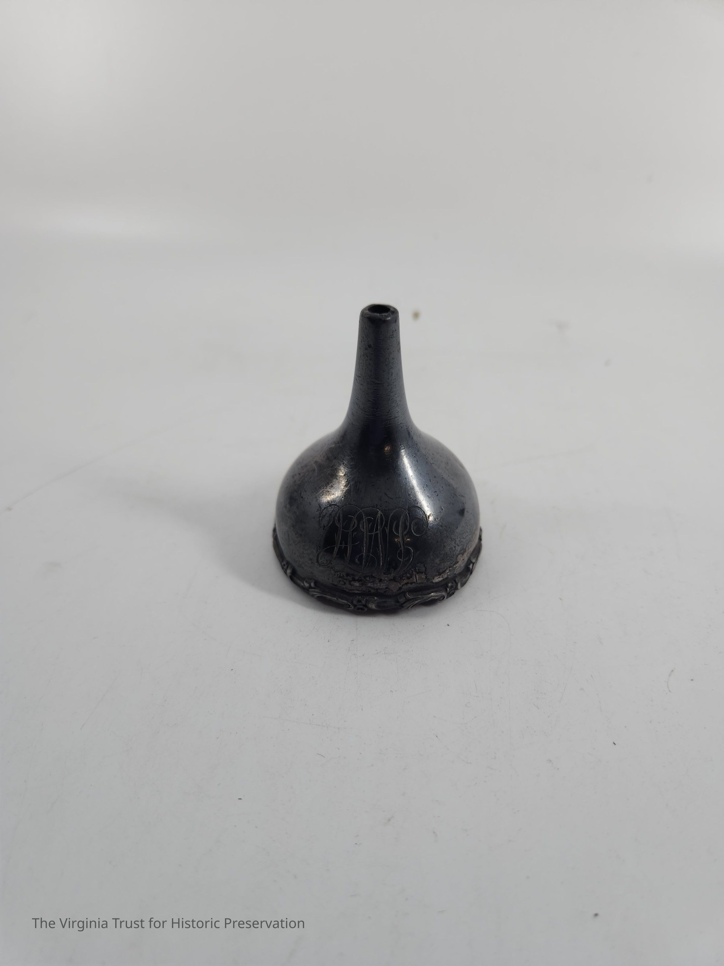 Metal funnel. Design around rim. Monogram: "MH". Probably Britanniaware.