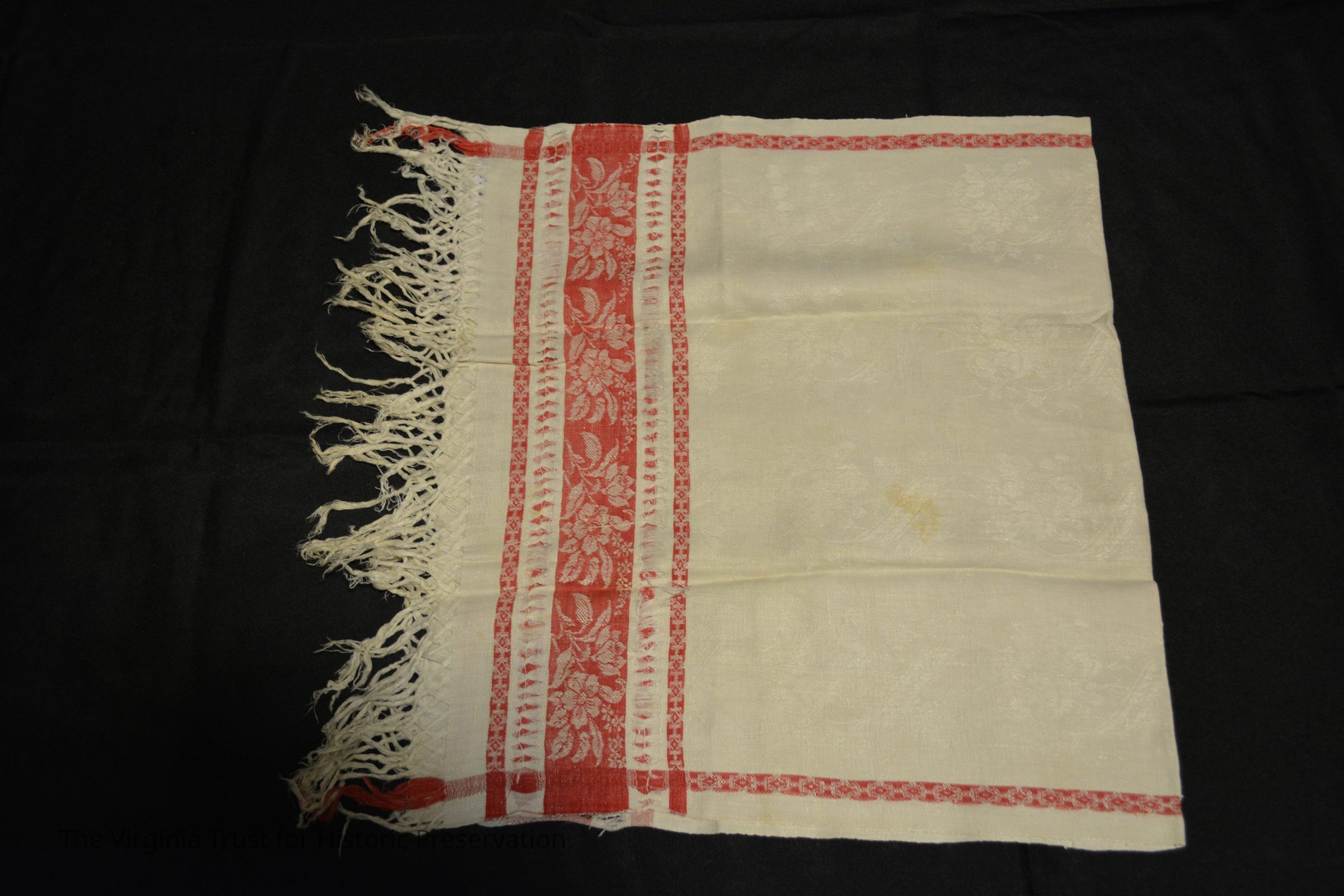 Linen hand towel with red and white design, fringed and knotted.