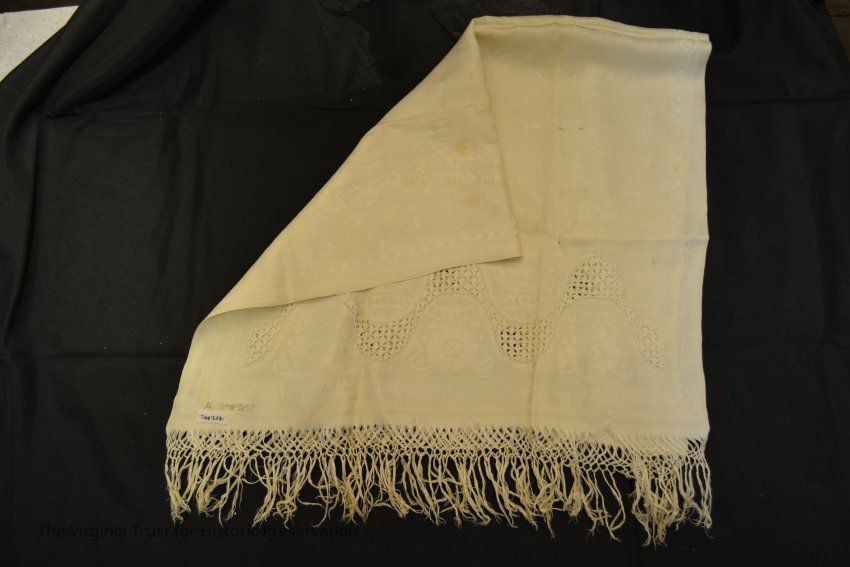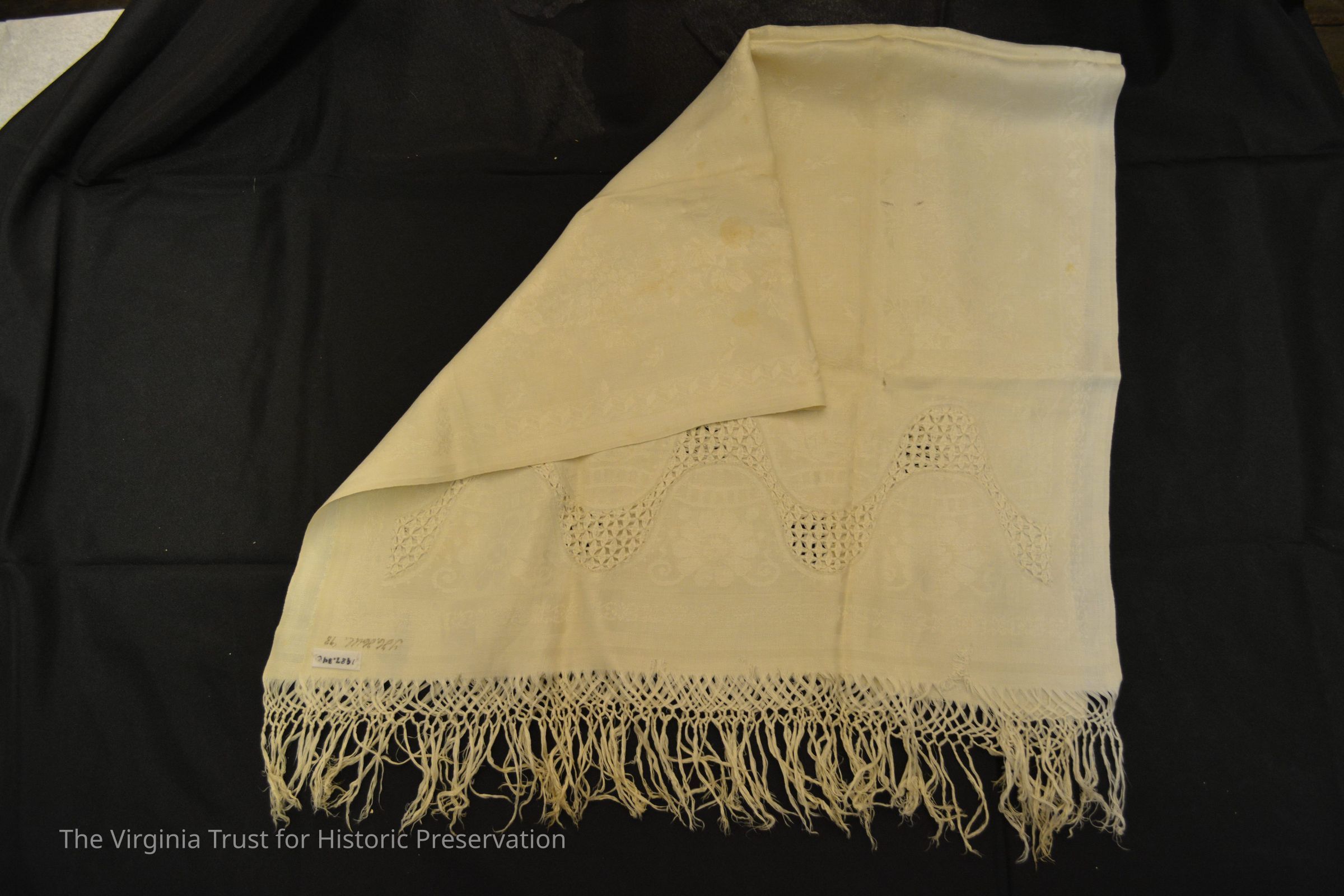 Small linen damask hand towel. Fringed and knotted edge and design. Few minor tears on edge.