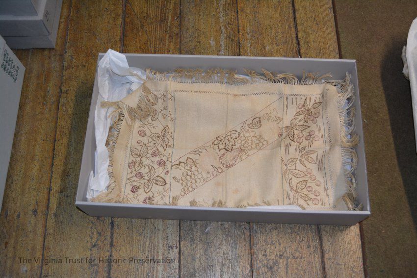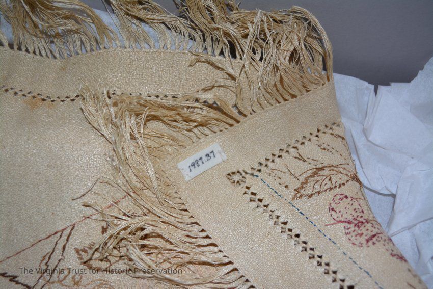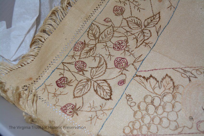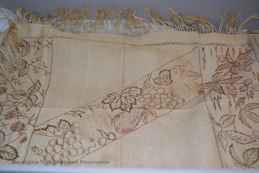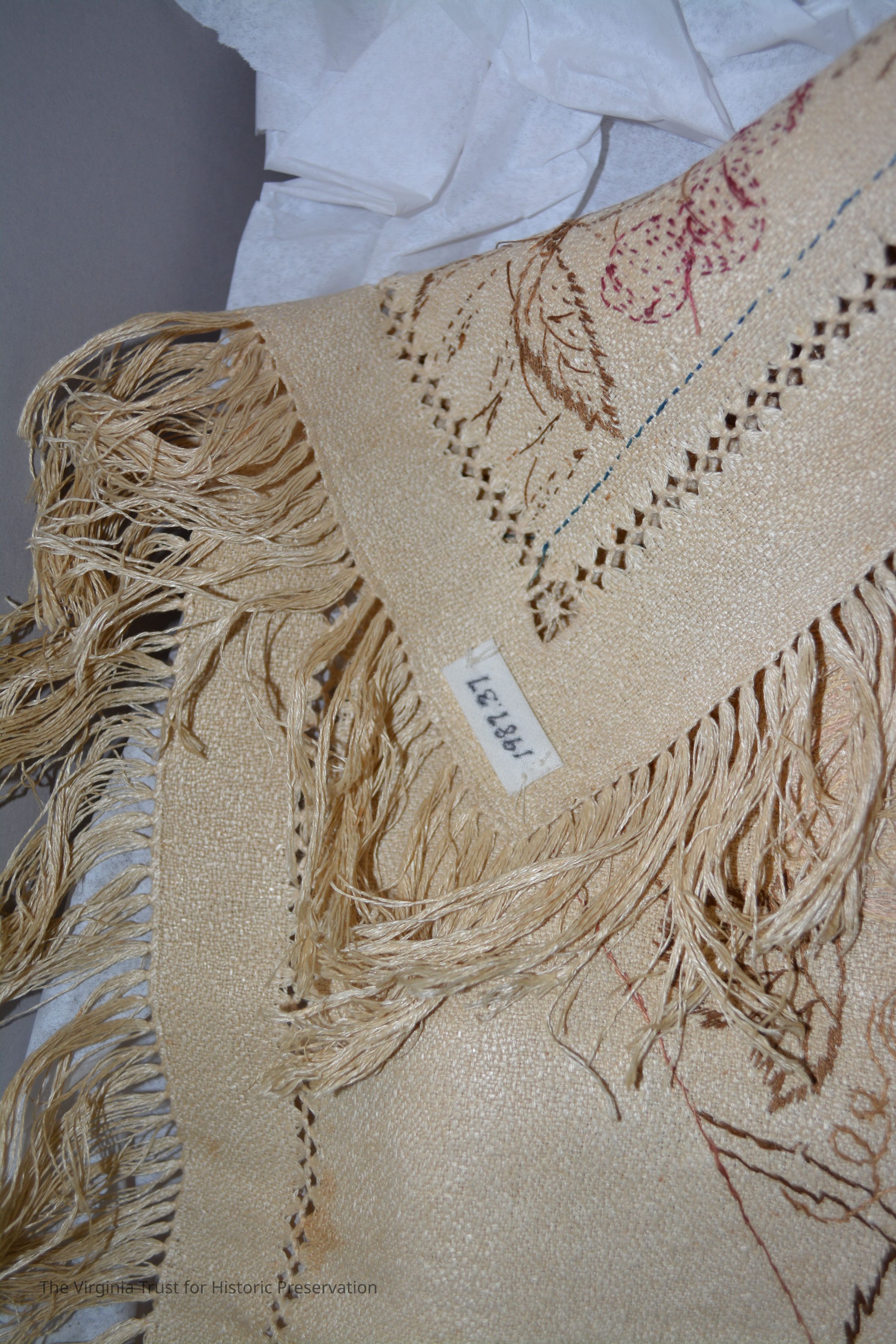 Fringed scarf used as a splash back for a washstand. Embroidered with red fruits and green leaves. "MH" monogram.