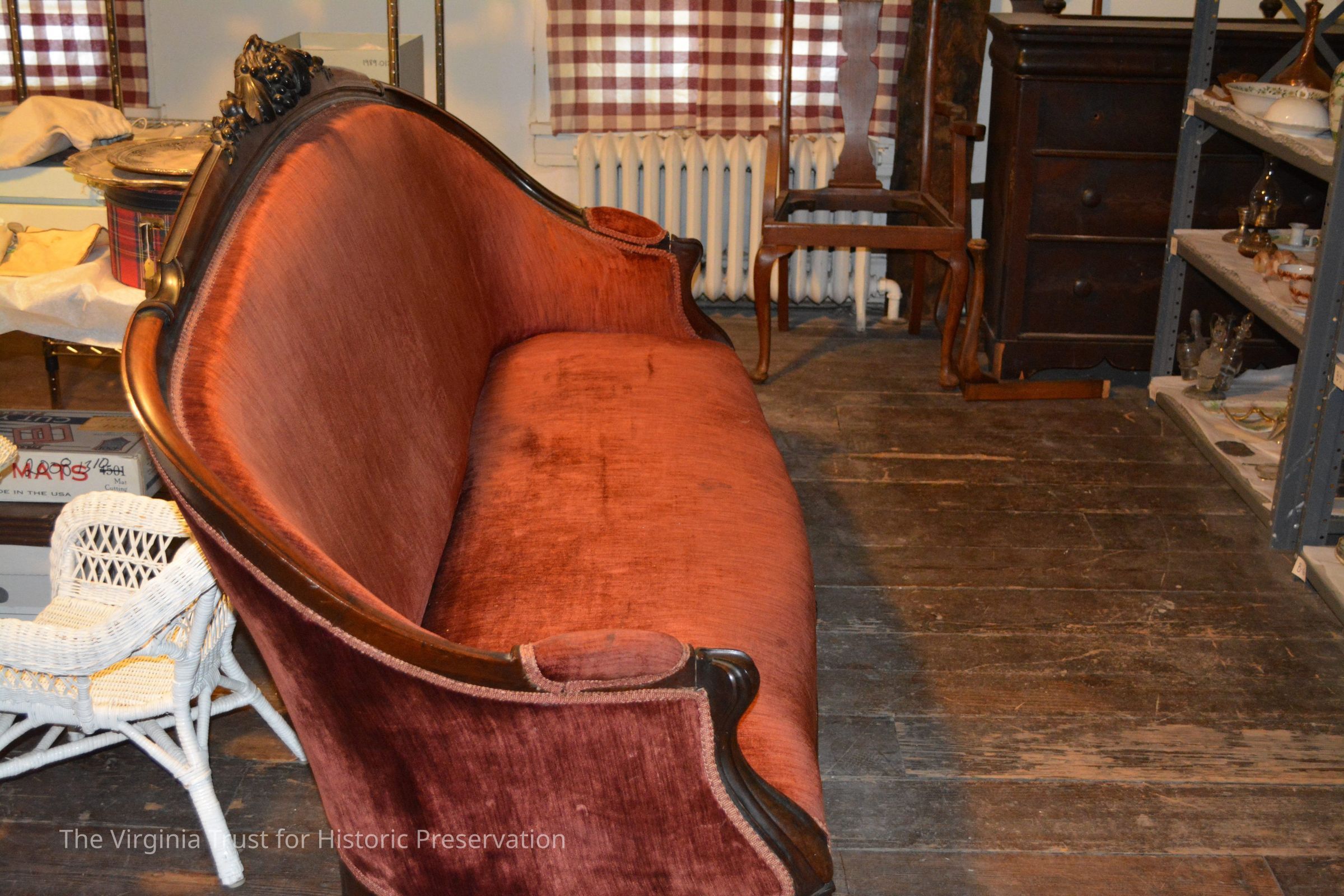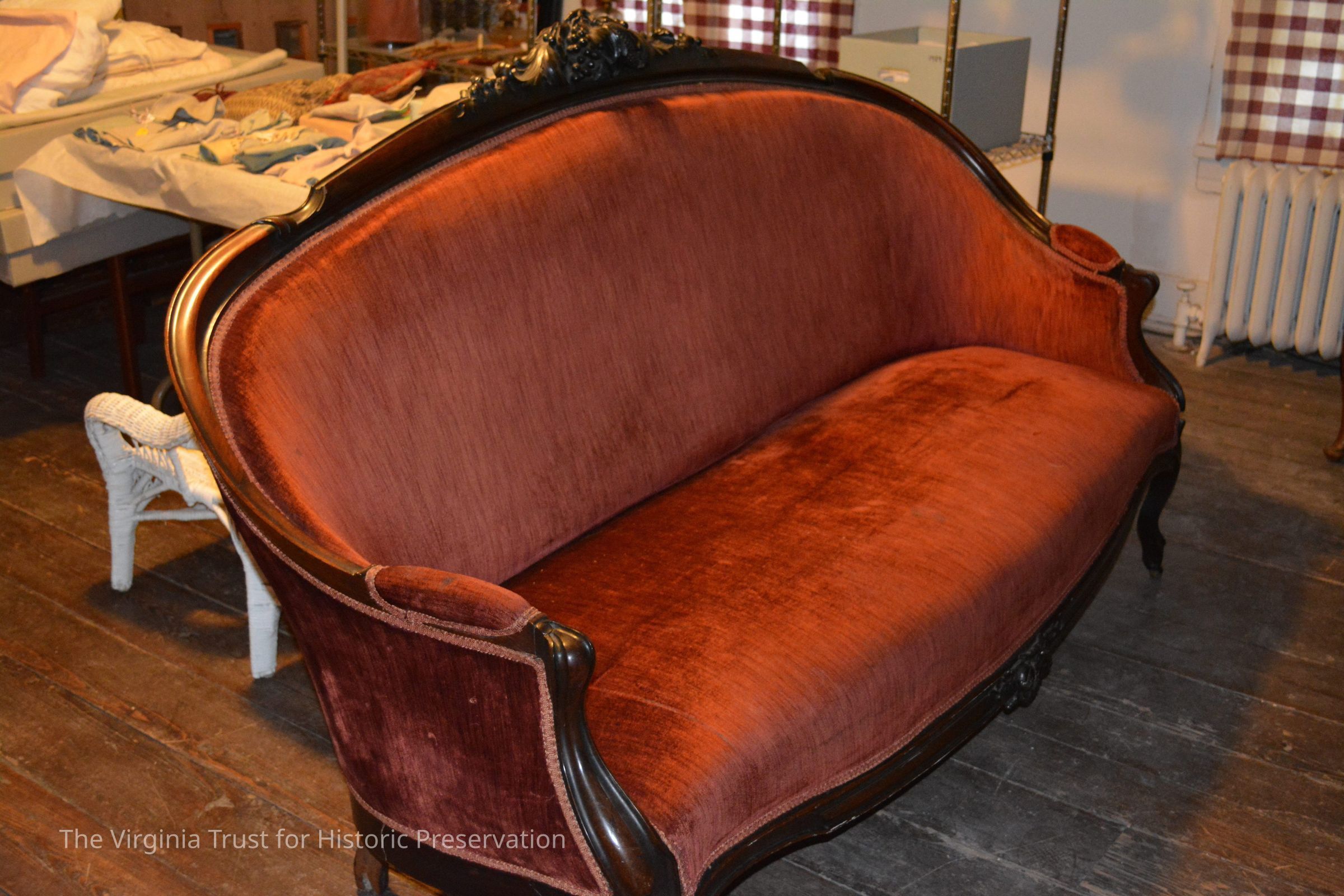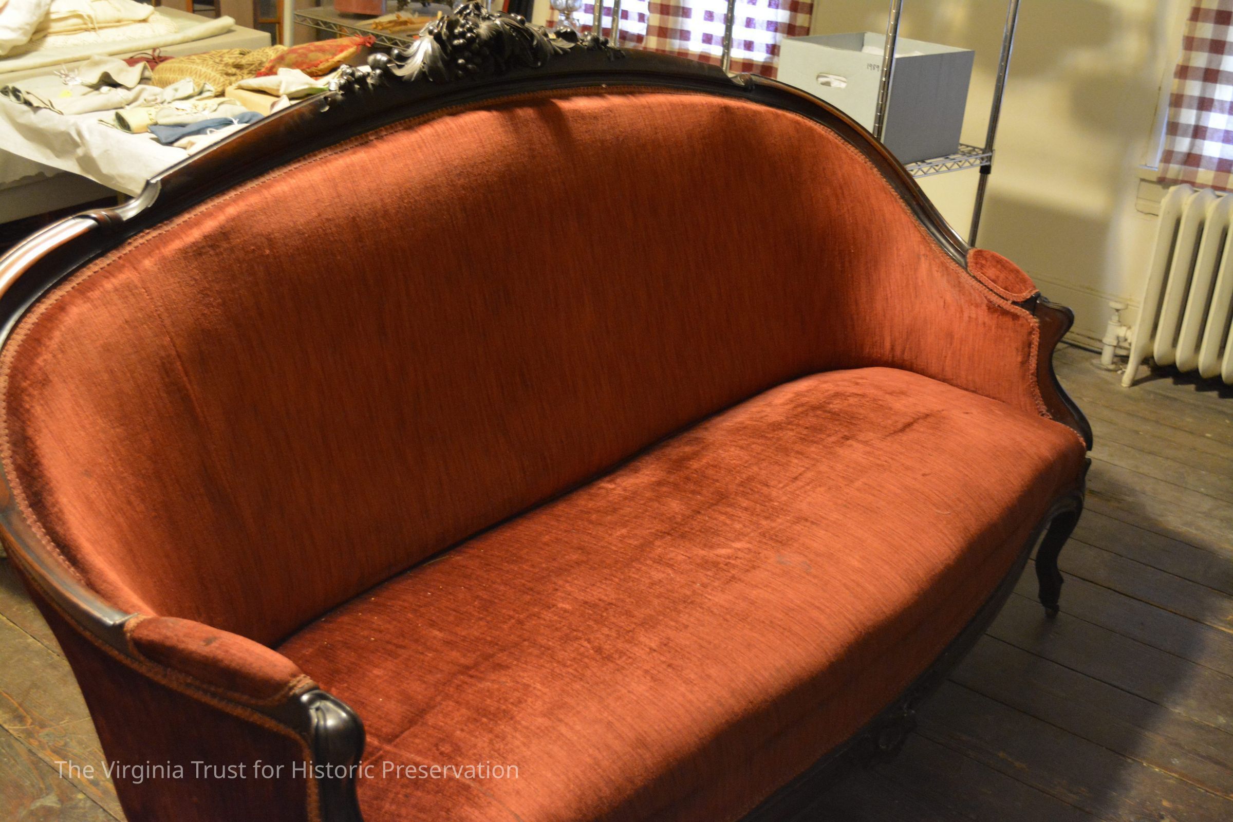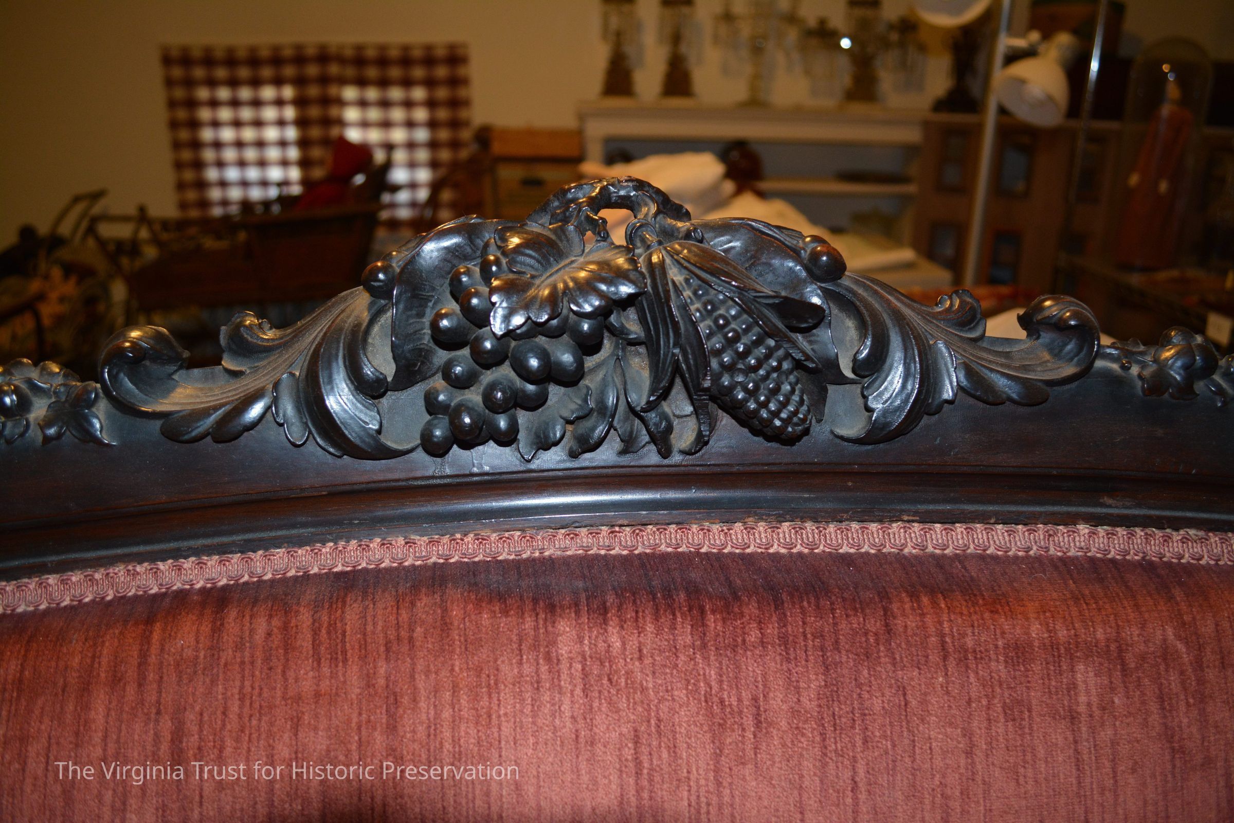 Victorian sofa with a rosewood frame and padded arm rests. Carved corn, grapes, nuts and leaves on top back and fruit carving on drop below seat. Contemporary upholstery, rust-rose velvet. (Originally had cut velvet upholstery). New bottom cover.Dimensions