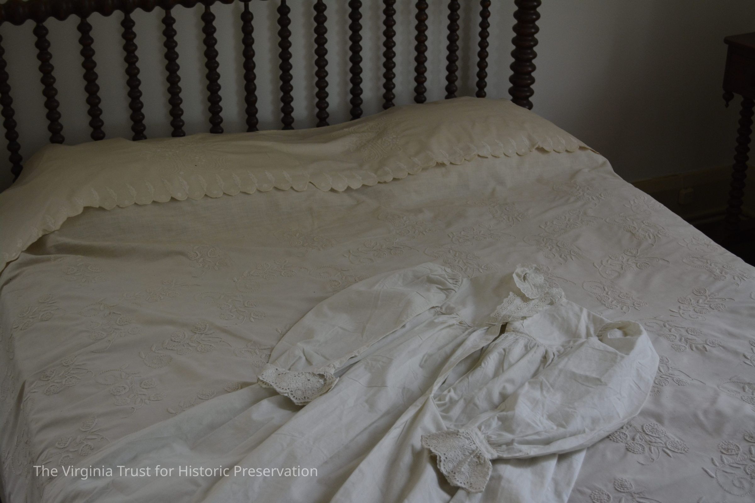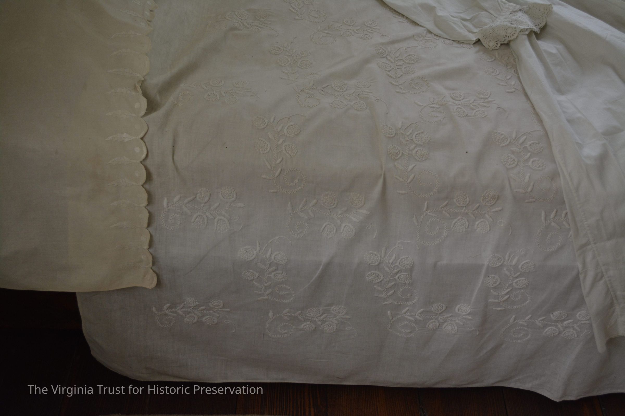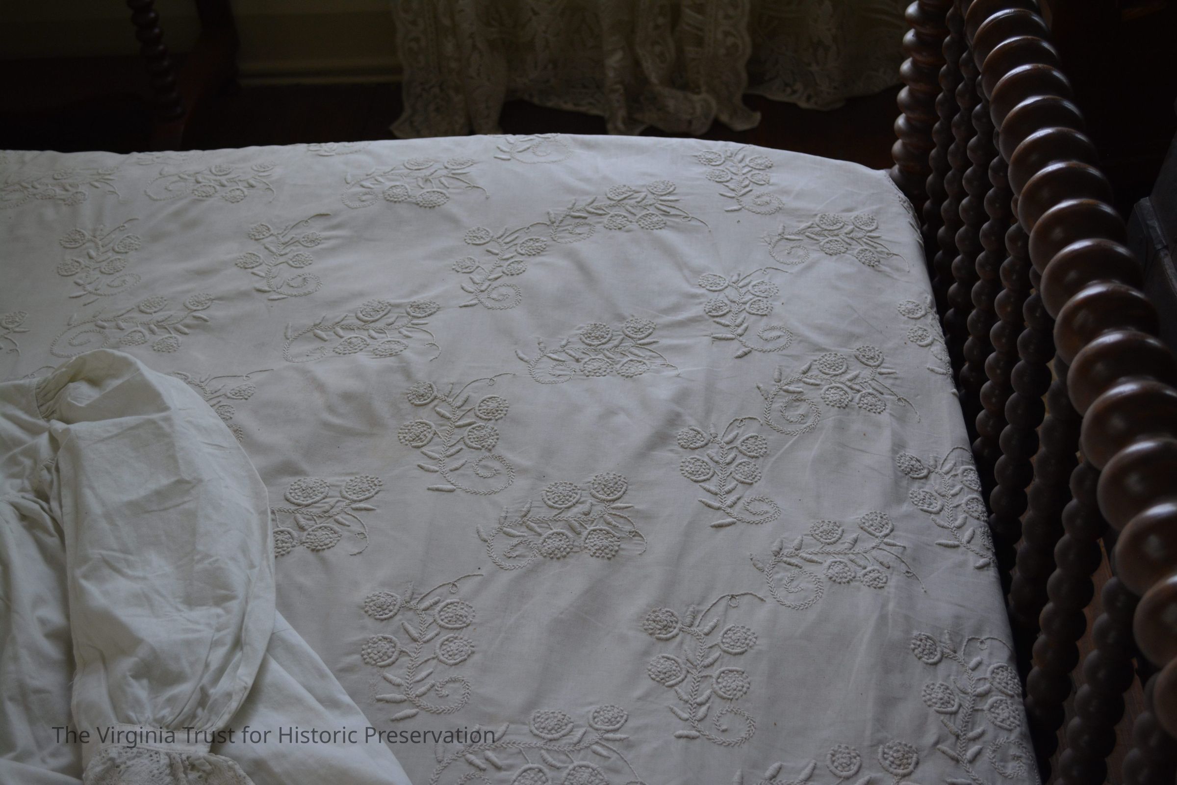 Bedspread, double bed size. White cotton with hand embroidered white floral designs.