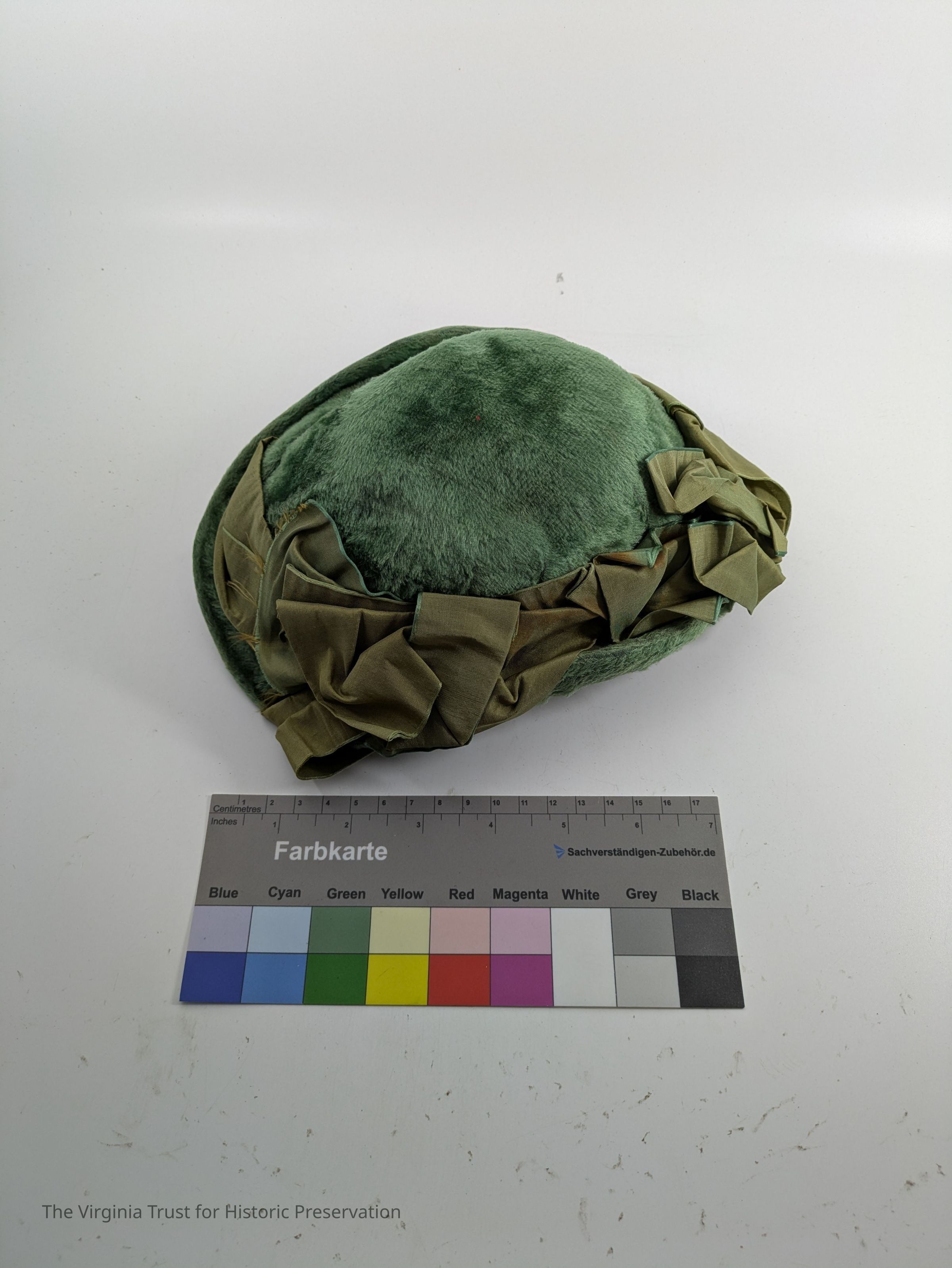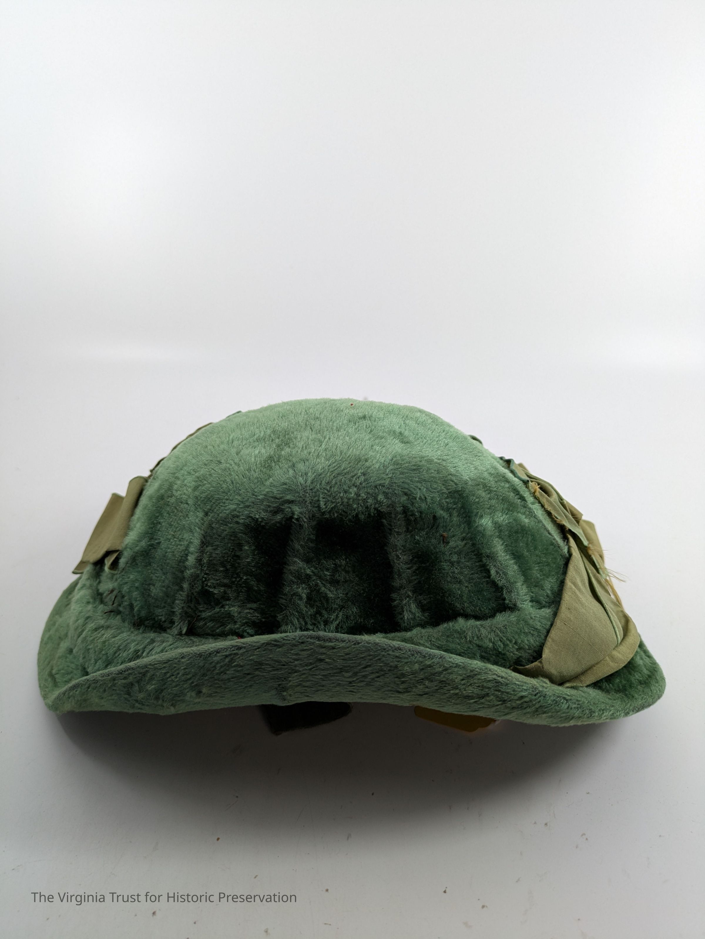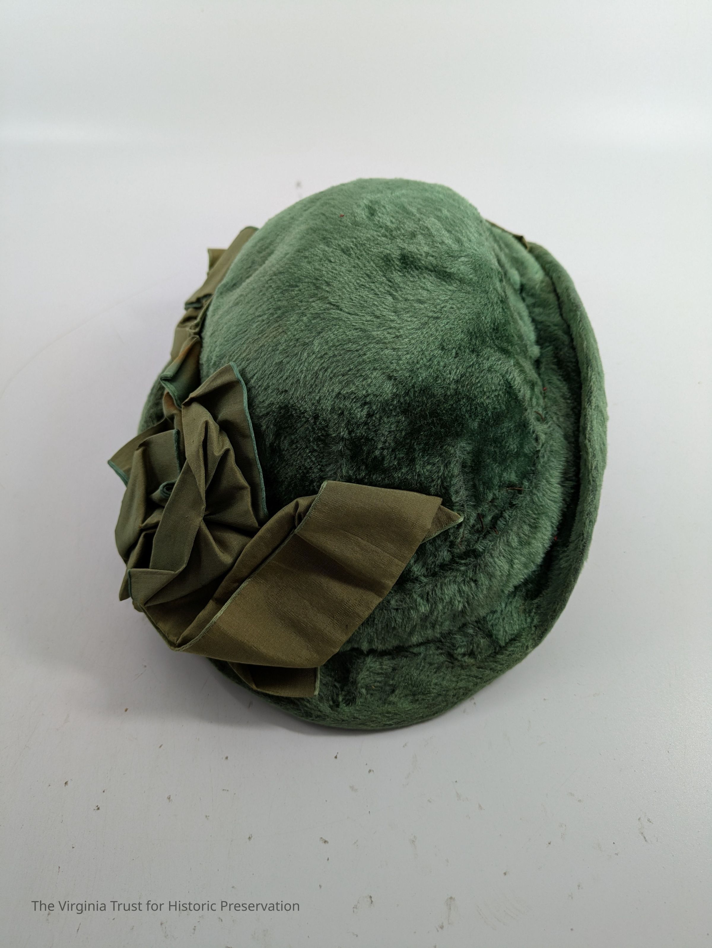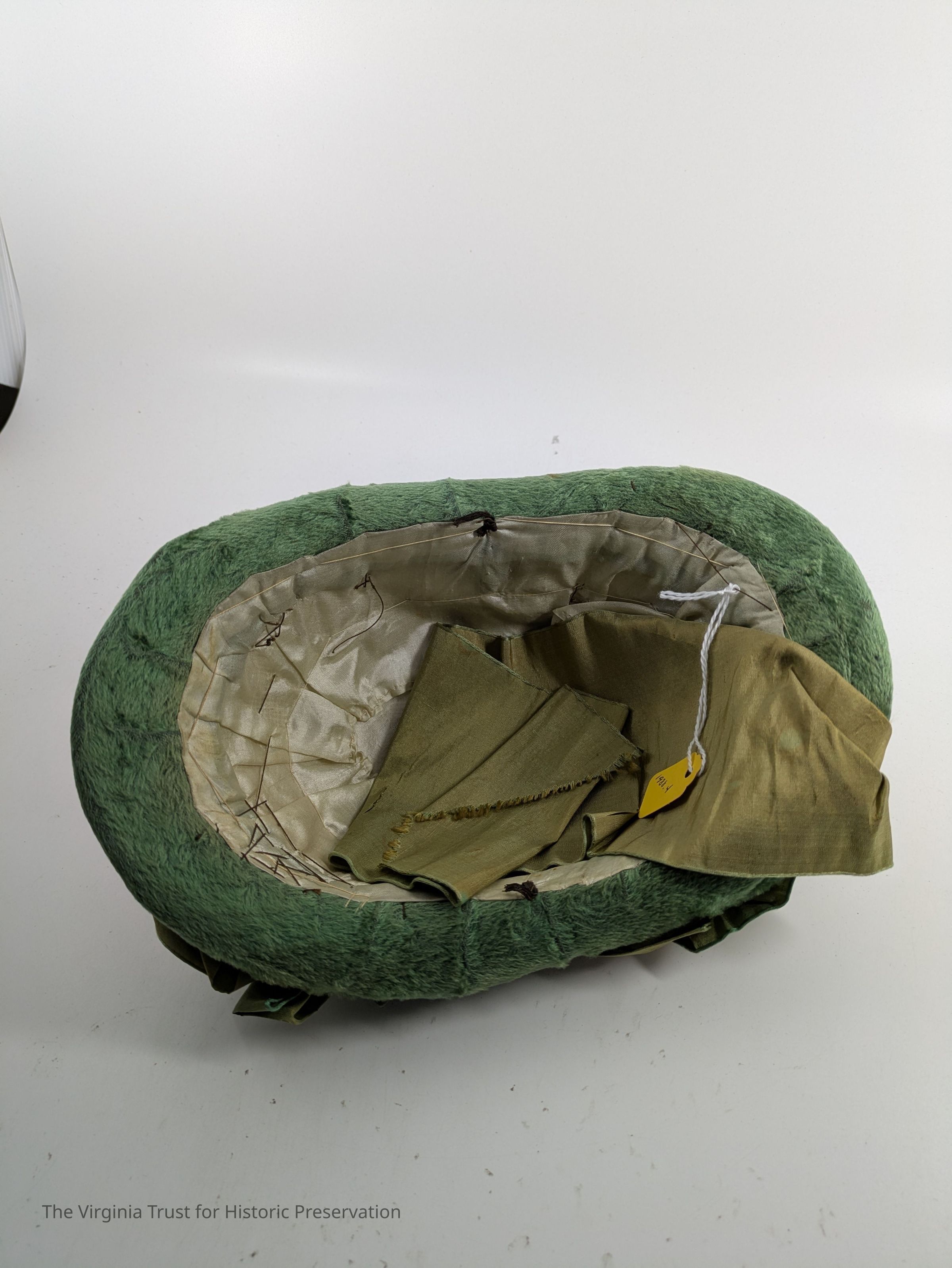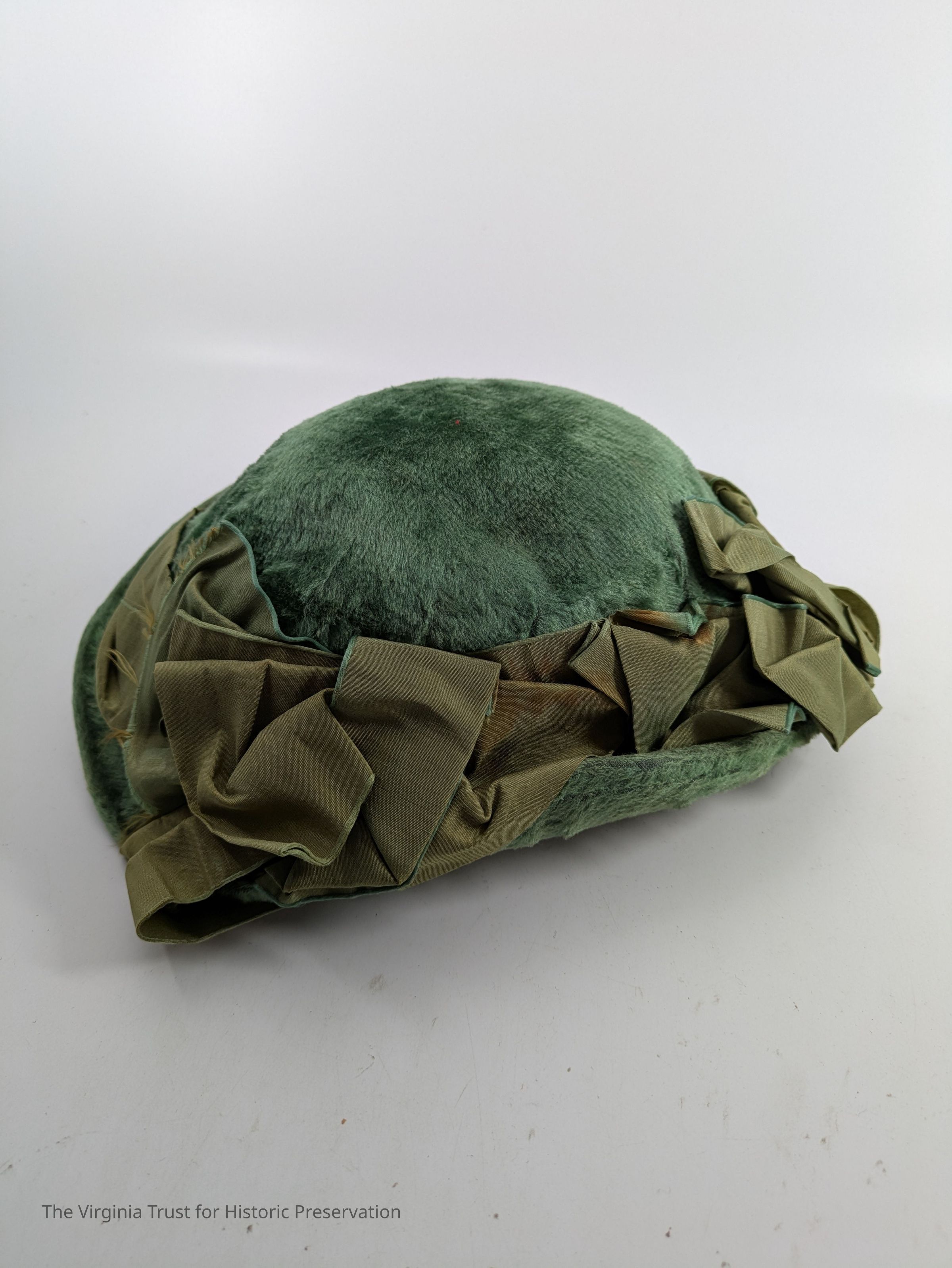 Ladies Riding Hat. Green velour and green ribbons. White silk lining. Worn by Laura Wood Smith.