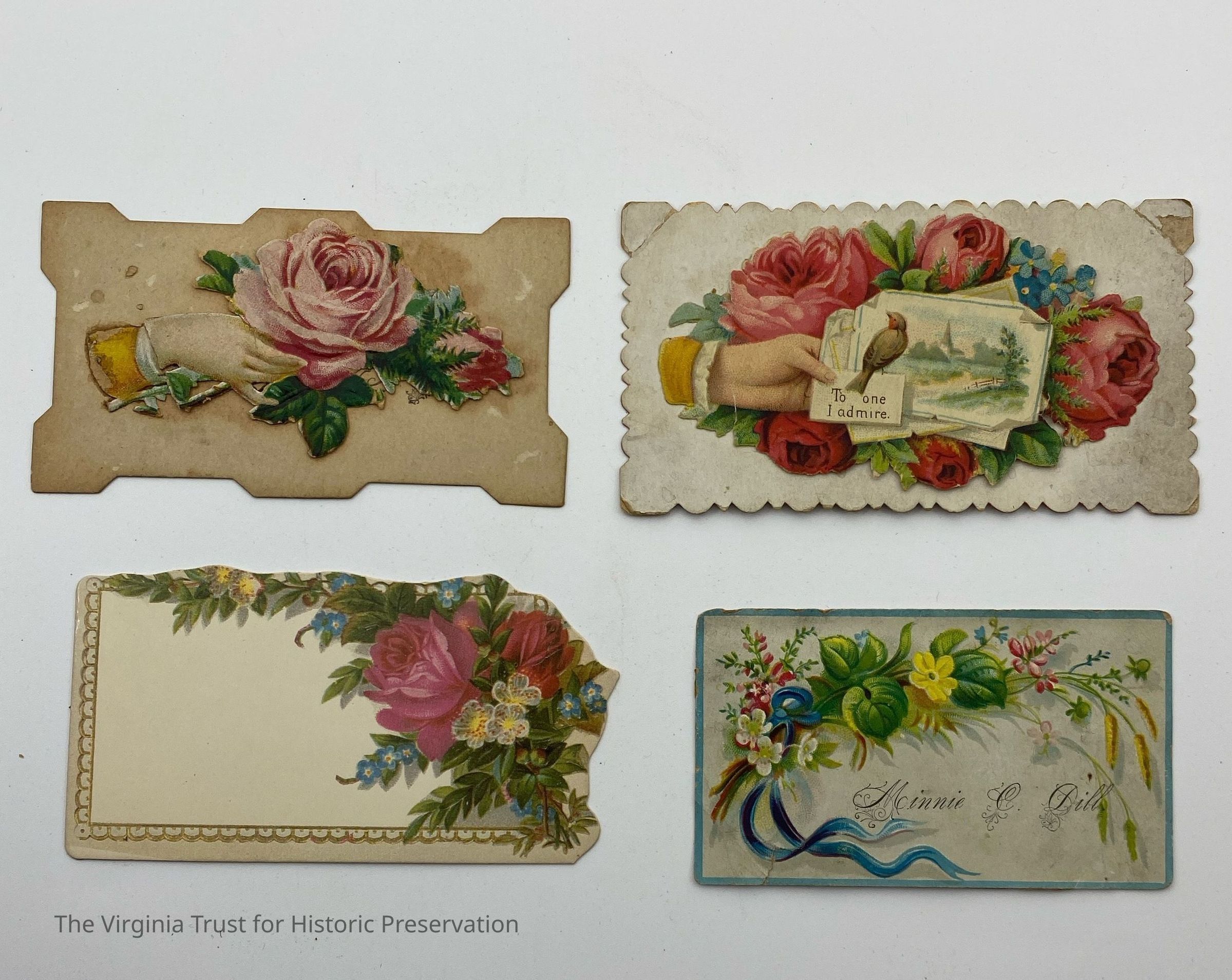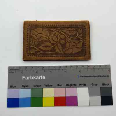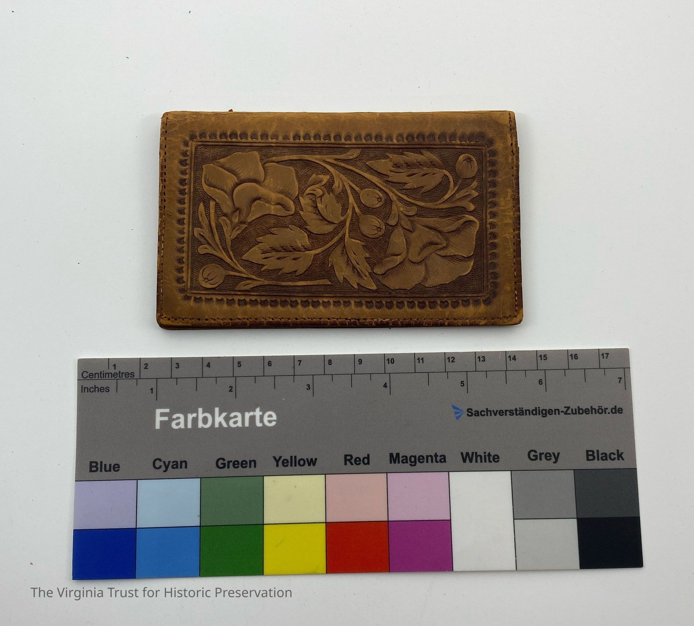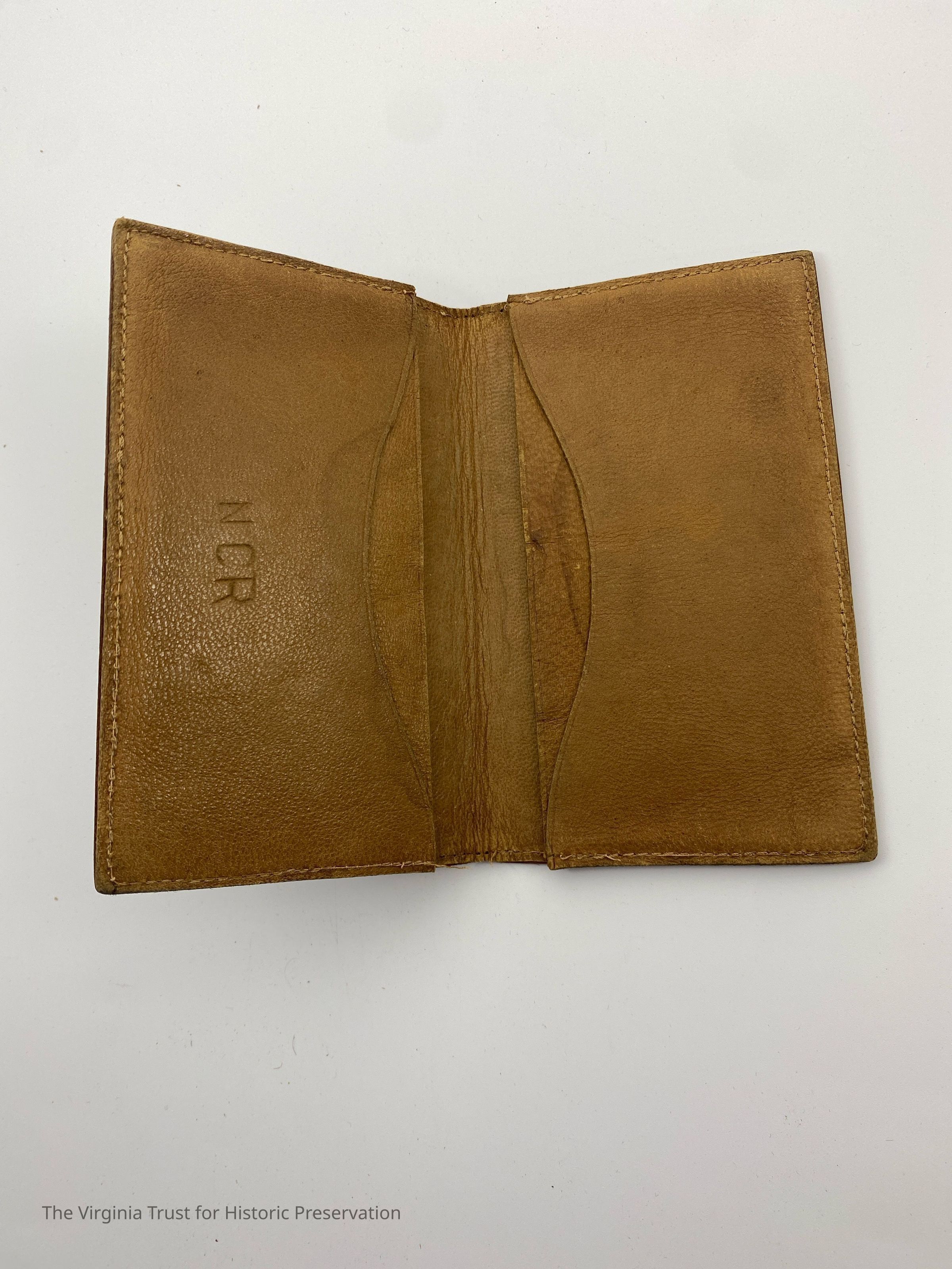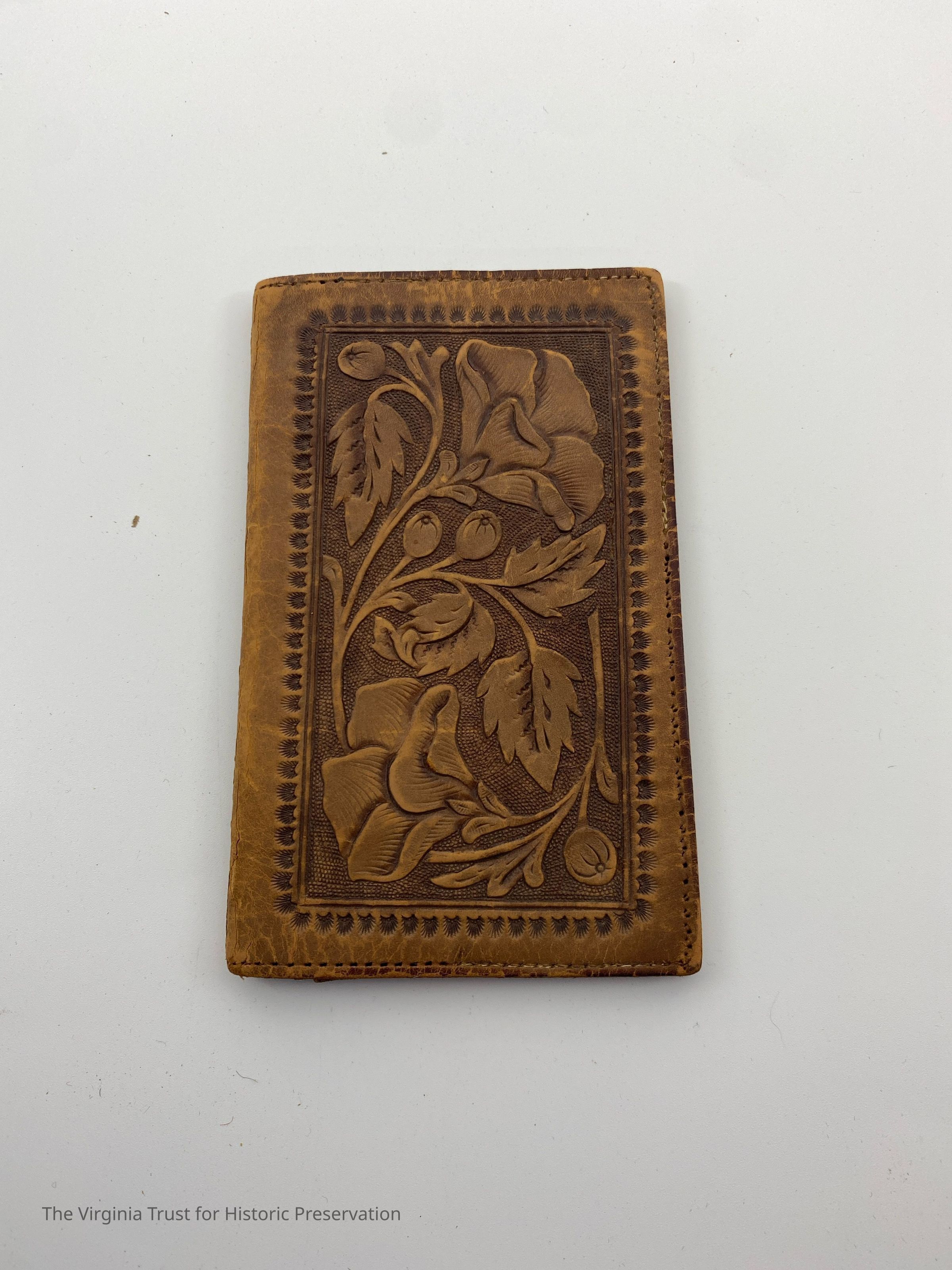 Brown hand-tooled leather calling card case. Four calling cards for Minnie C. Dill, Joseph, and Johnny A. Dill located in interior pockets.