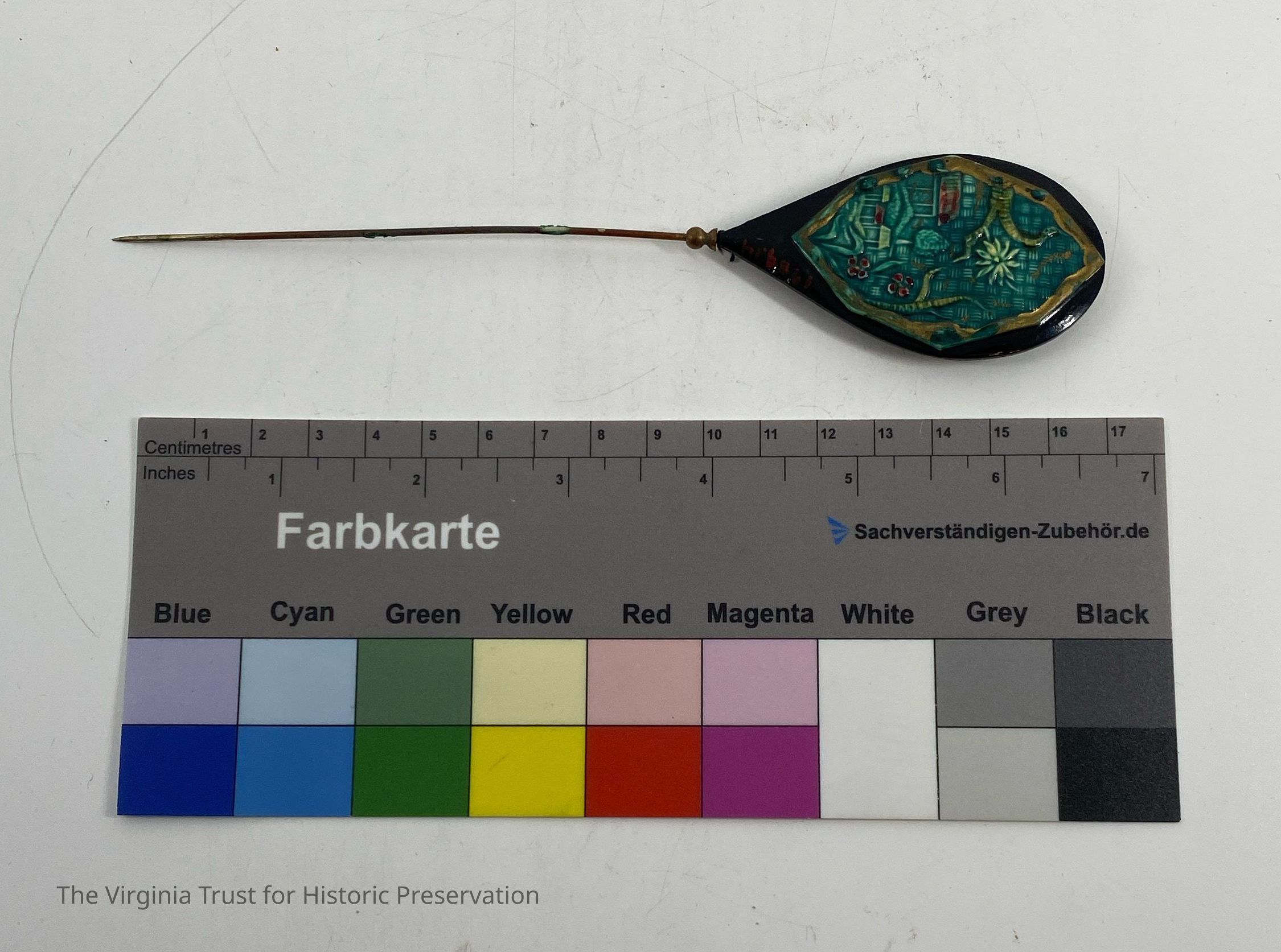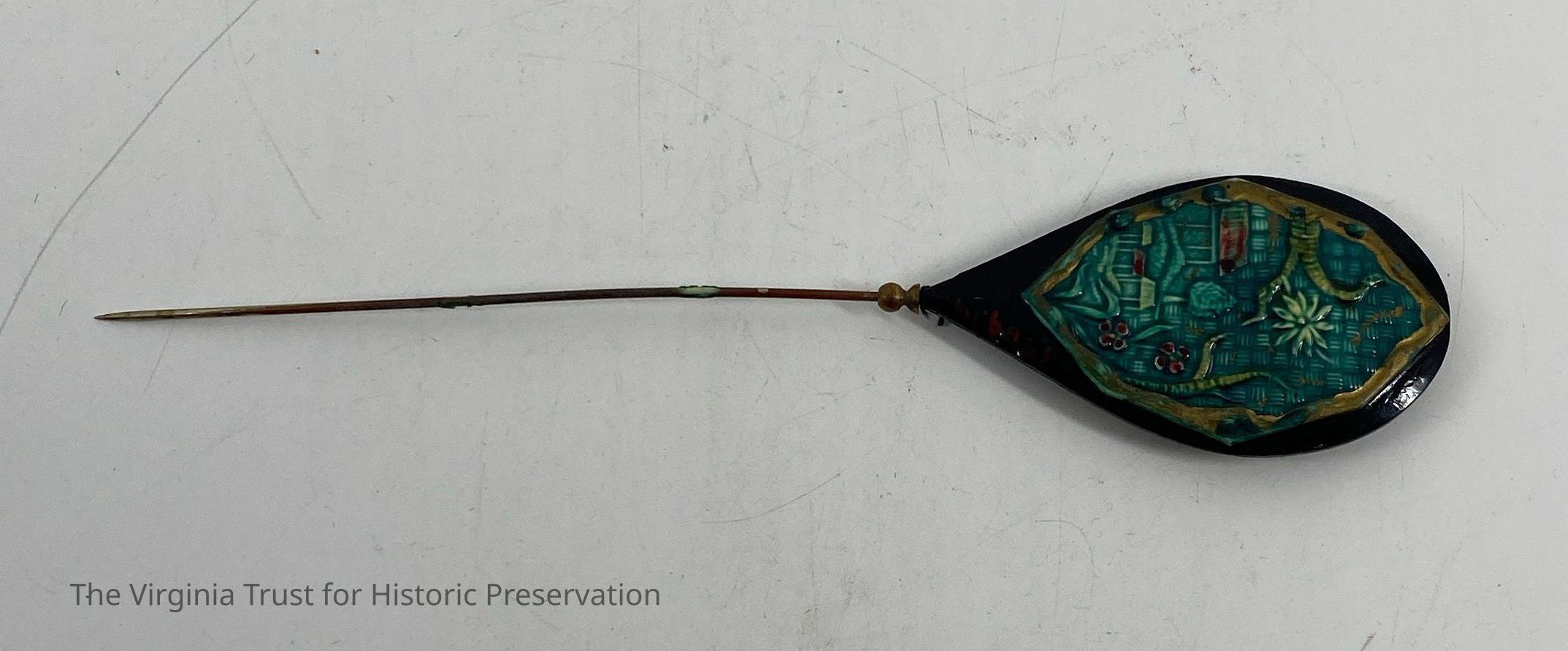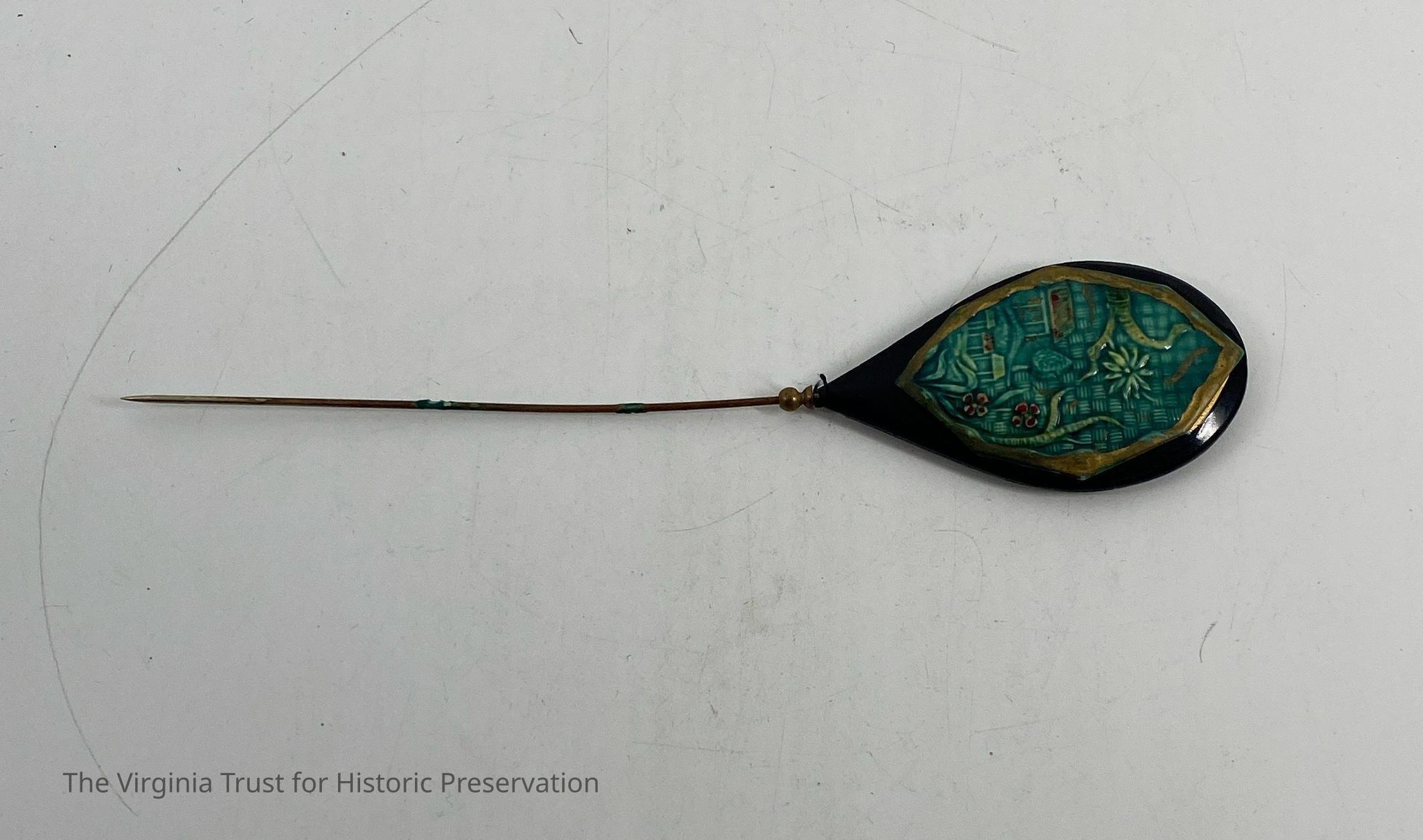 Hatpin with flat green head about 1". Head decoration depicts trees, flowers, and houses. Most of the decoration painted green, some red paint for the flowers and houses, gold banding to encompass the image. Decoration on either side of head.