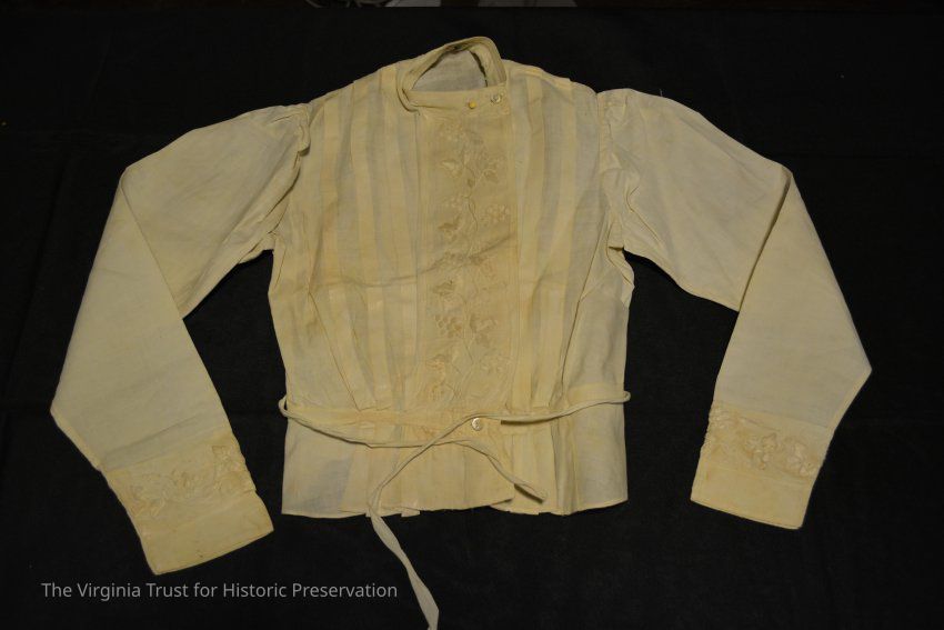 There is a band at the waist with a tie string attached in the back that ties in front above the peplum. The back has the same 4 tucks as the front of the blouse. The back of the peplum is slightly cut out on either side. Sleeves are slightly puffed with tight gathers at the shoulders and then narrow to the wrist. A 2 1/2" band of grapevine embroidery encircles the cuff and 1 1/2" from the edge of the cuff. There are no buttons or other type of closure.Exhibition