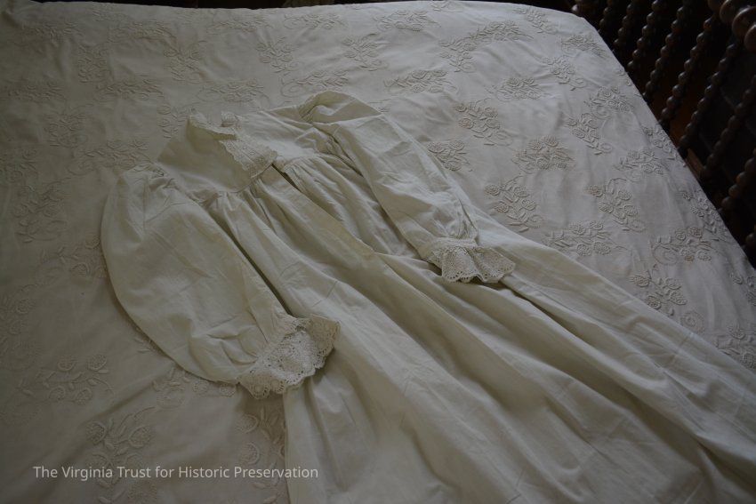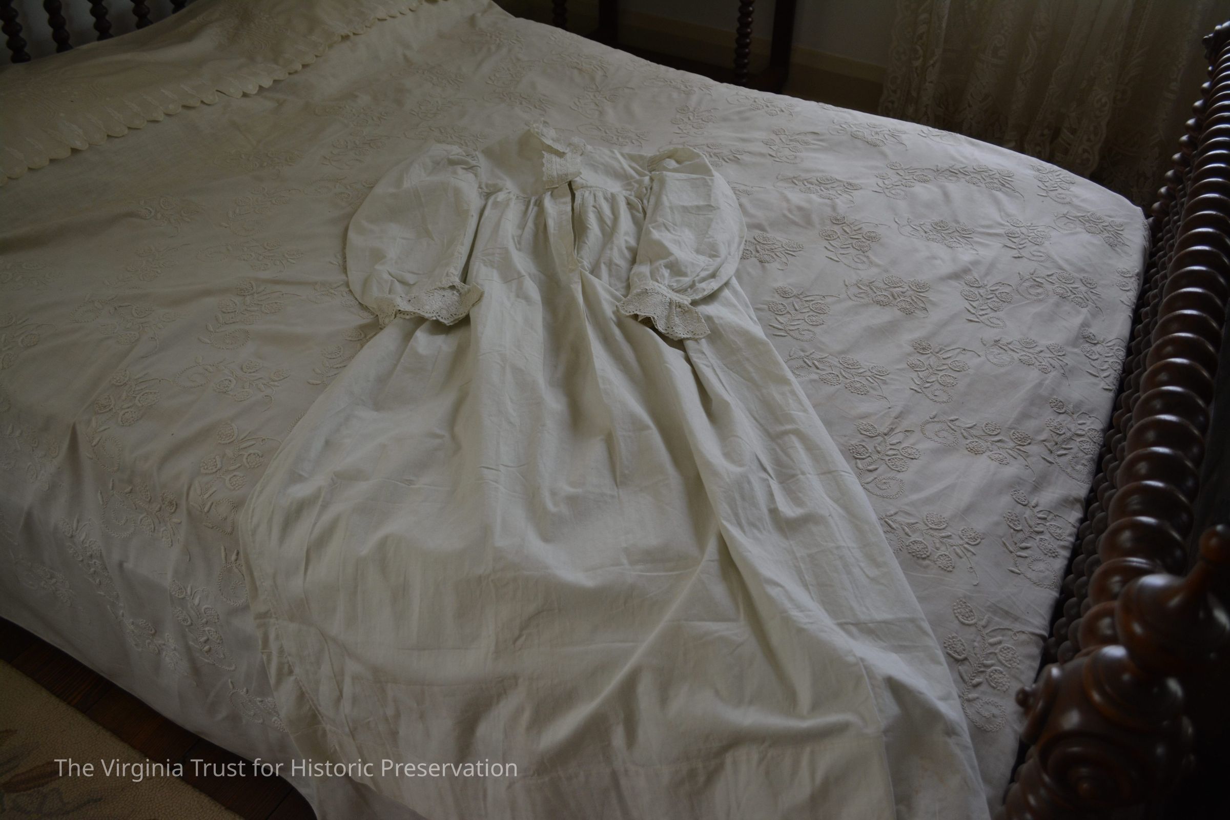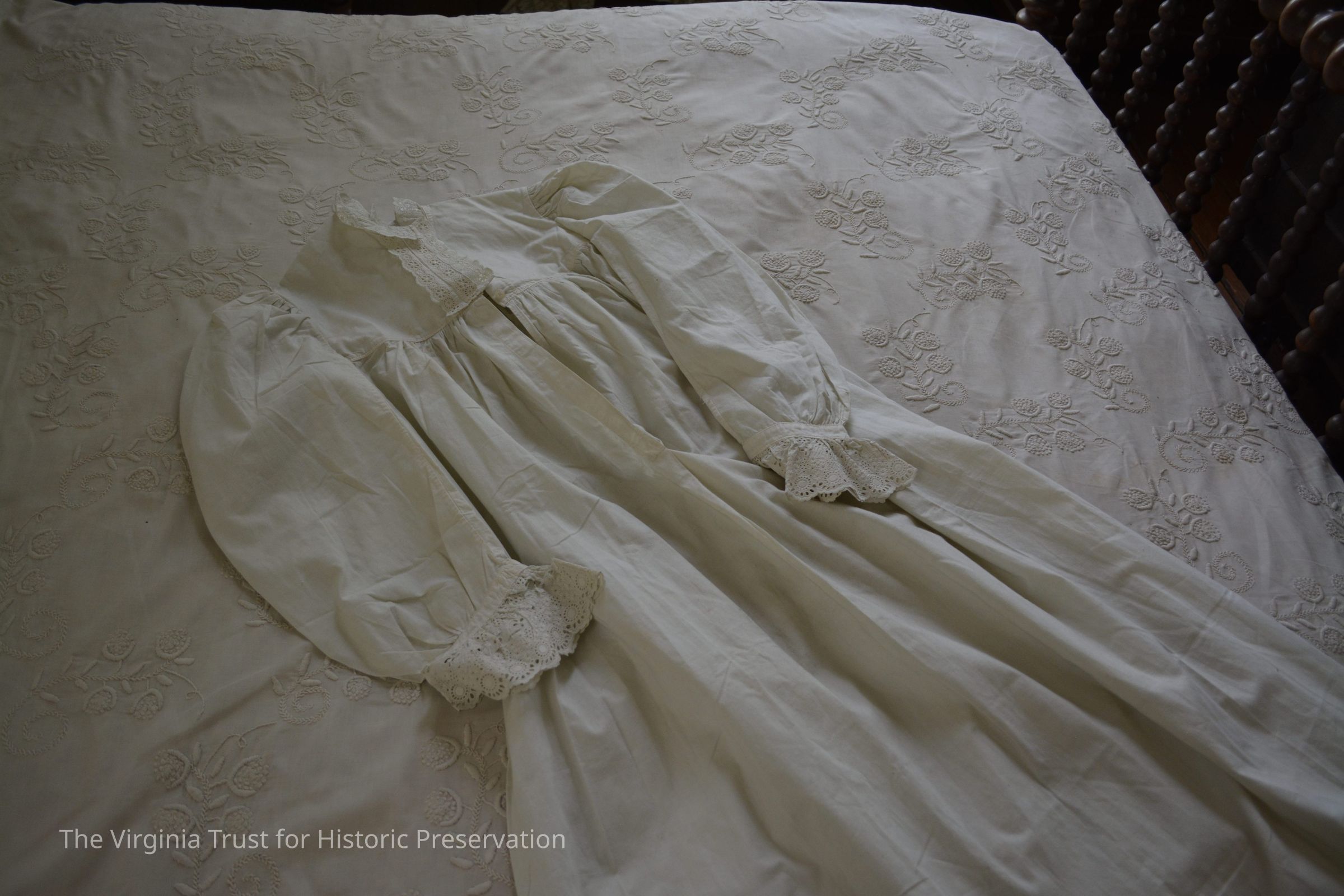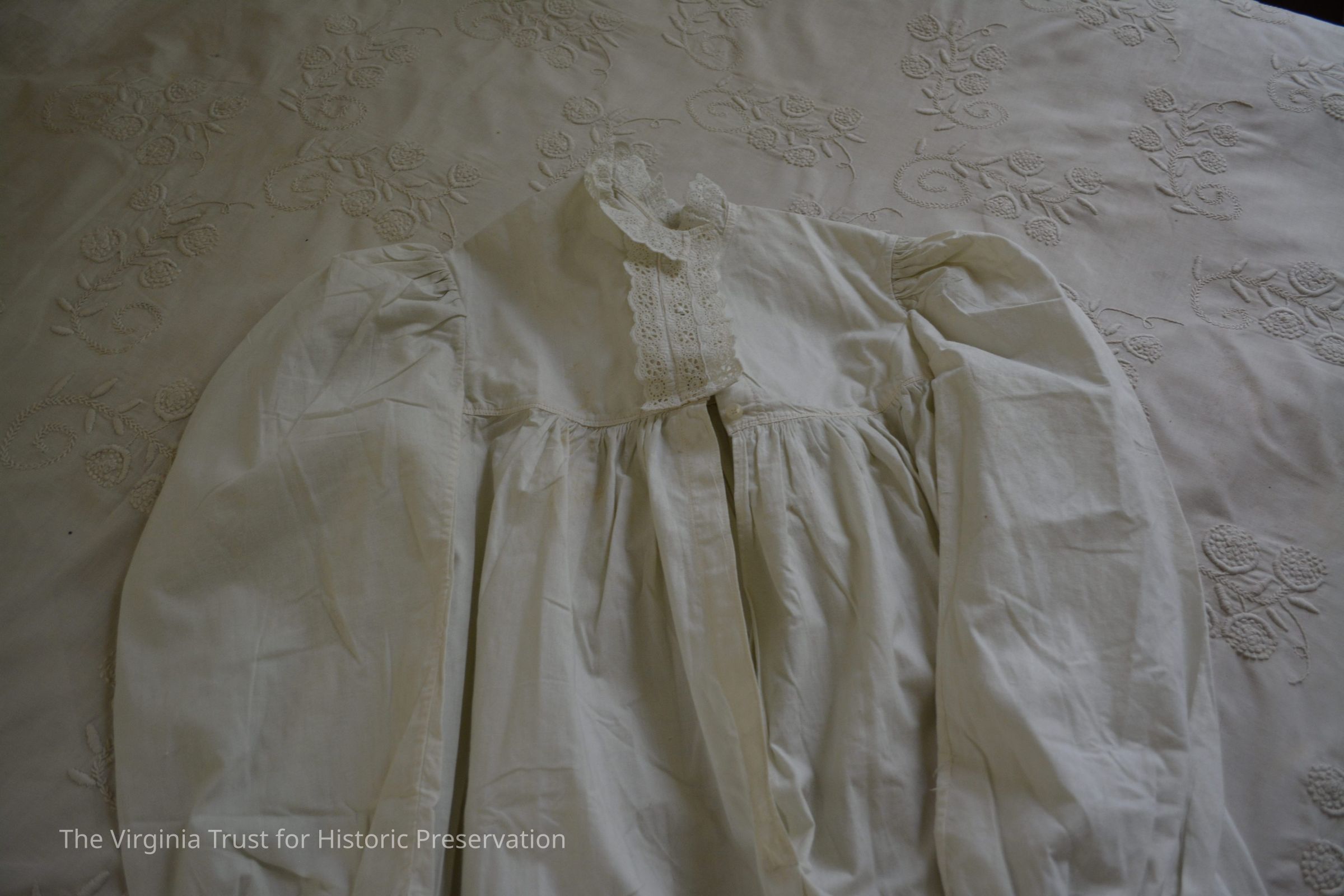 White cotton nightgown with long sleeves and eyelet embroidery. Early machine made lace trim. Puffed sleeves and round neck.