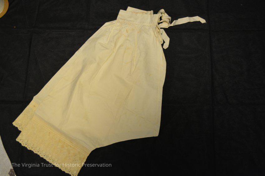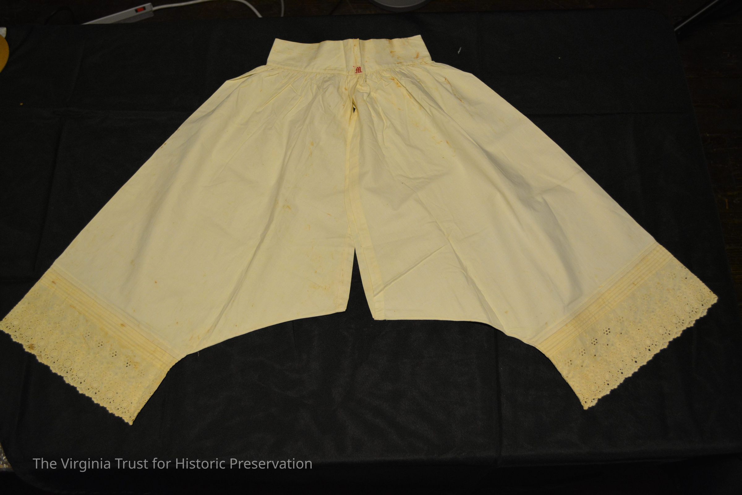 White cotton split drawers to match petticoat. Tie together at waist. They are edged with tucks and early machine-made lace. Initial "M" is on back in red.