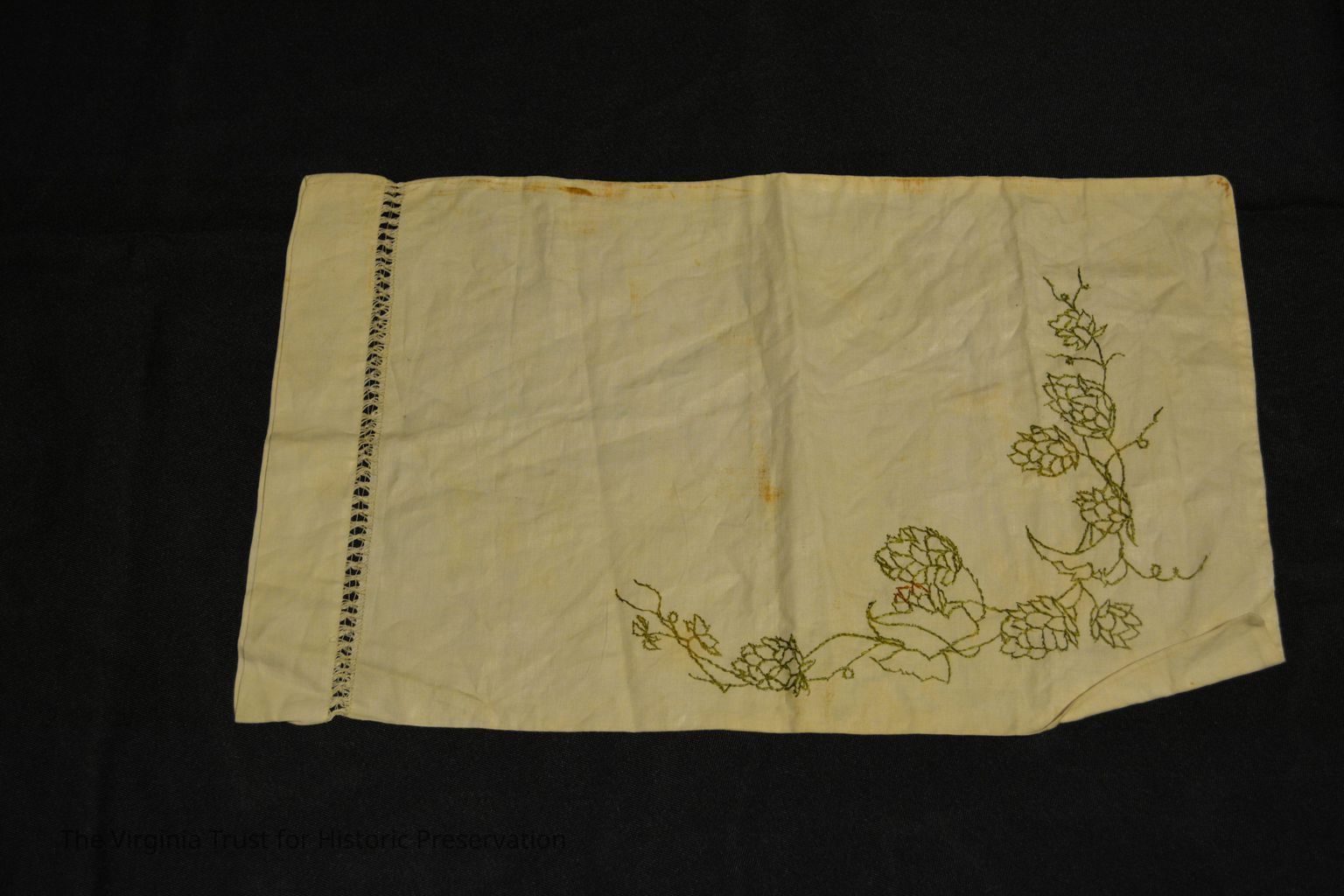 Linen pillow slip with drawnwork at hem, outline embroidery.