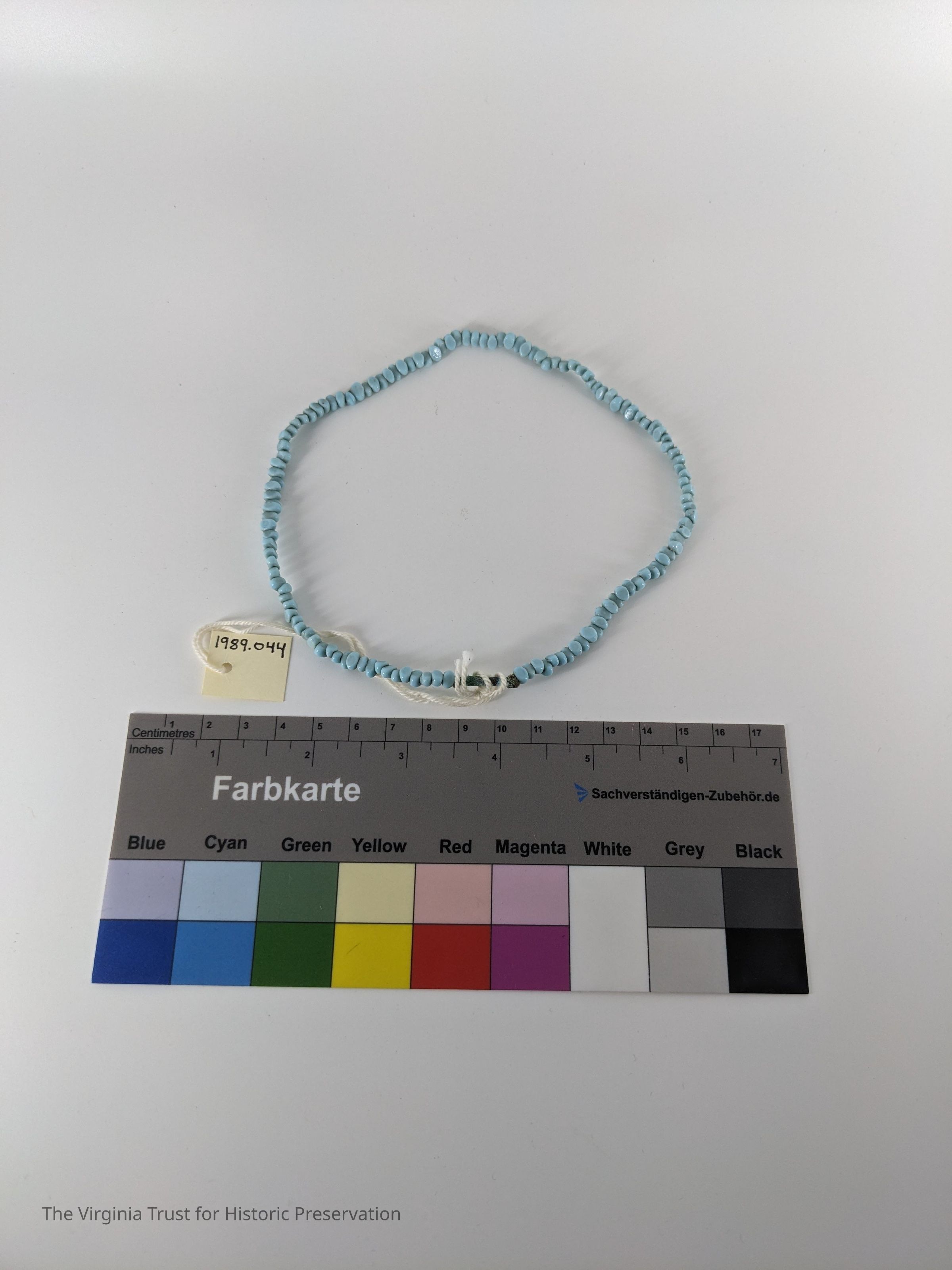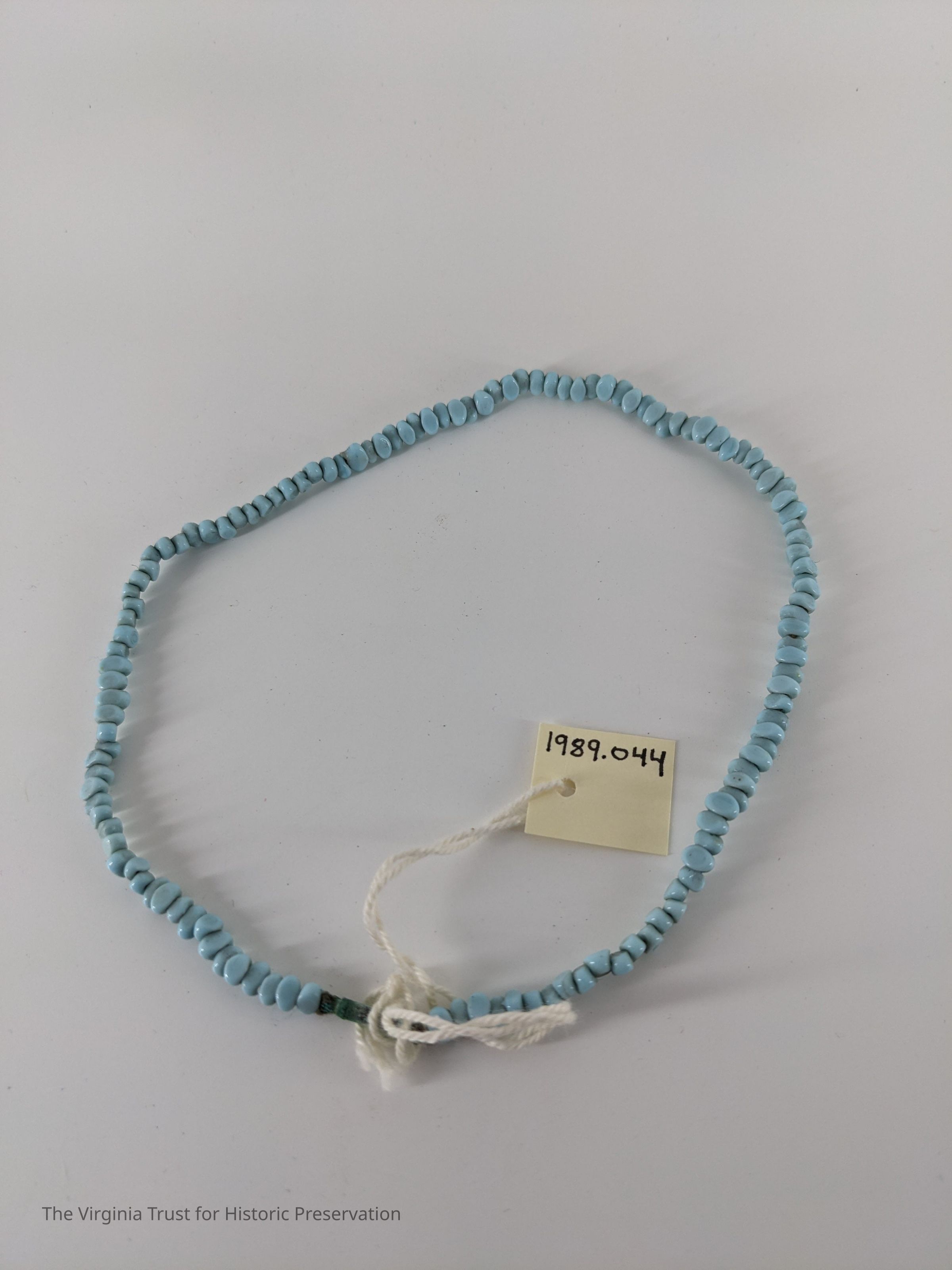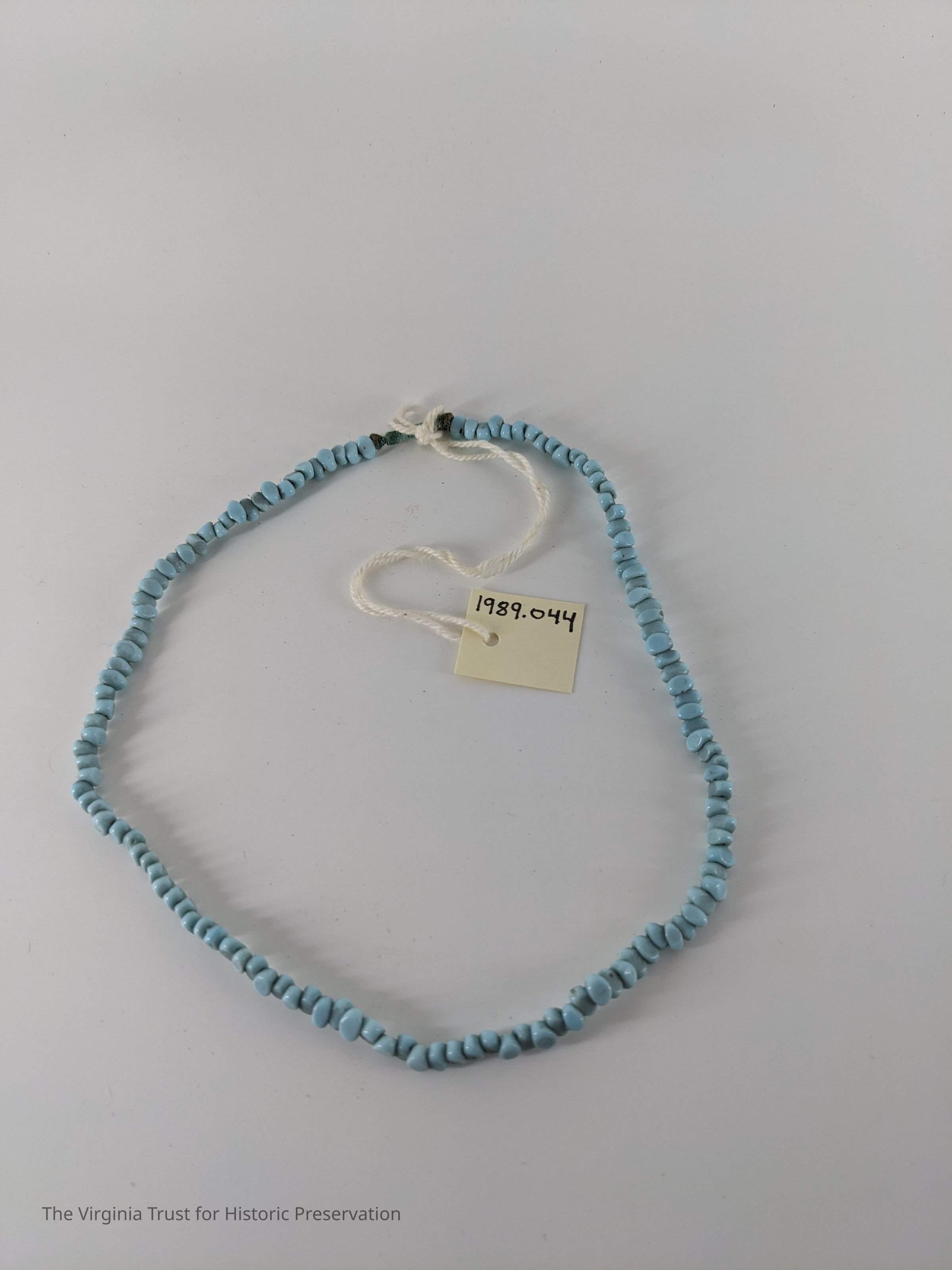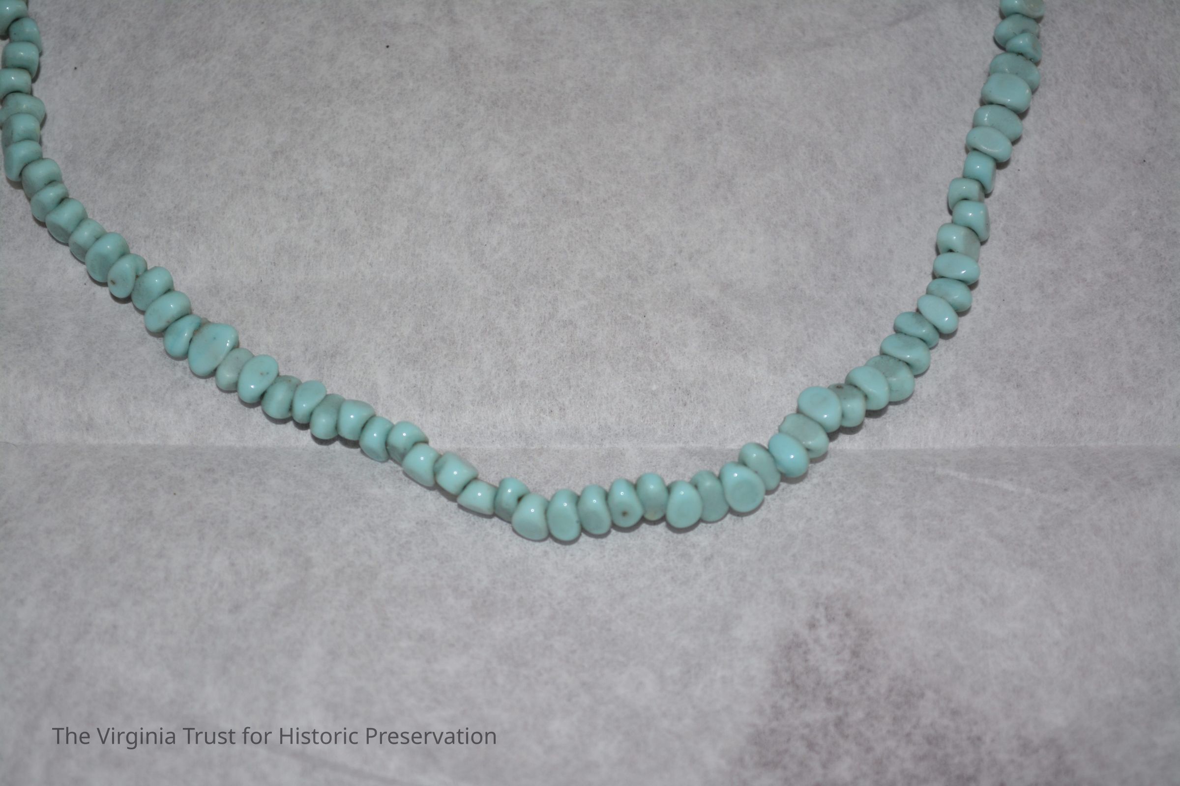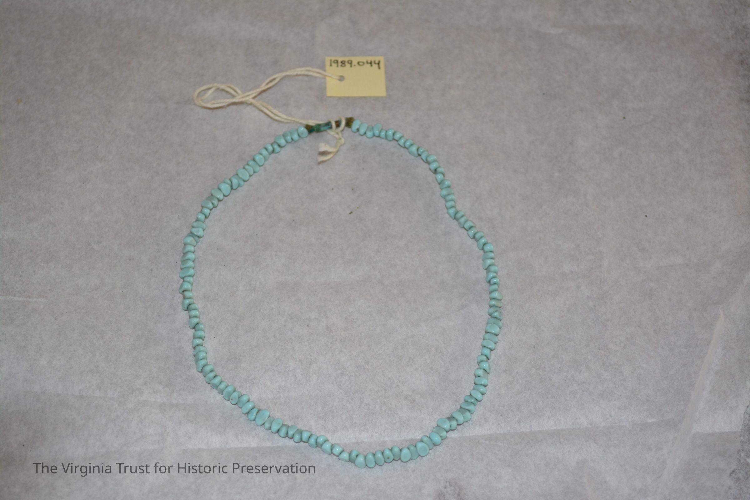 Child's necklace 14" long. Made of irregular-shaped turquoise beads. Brass clasp.