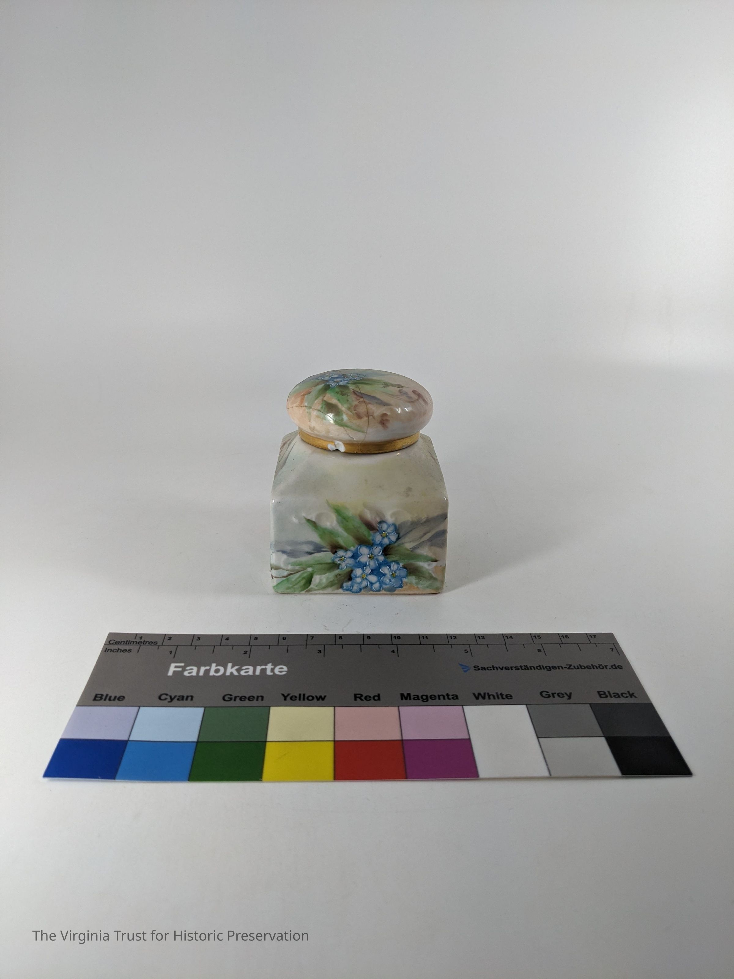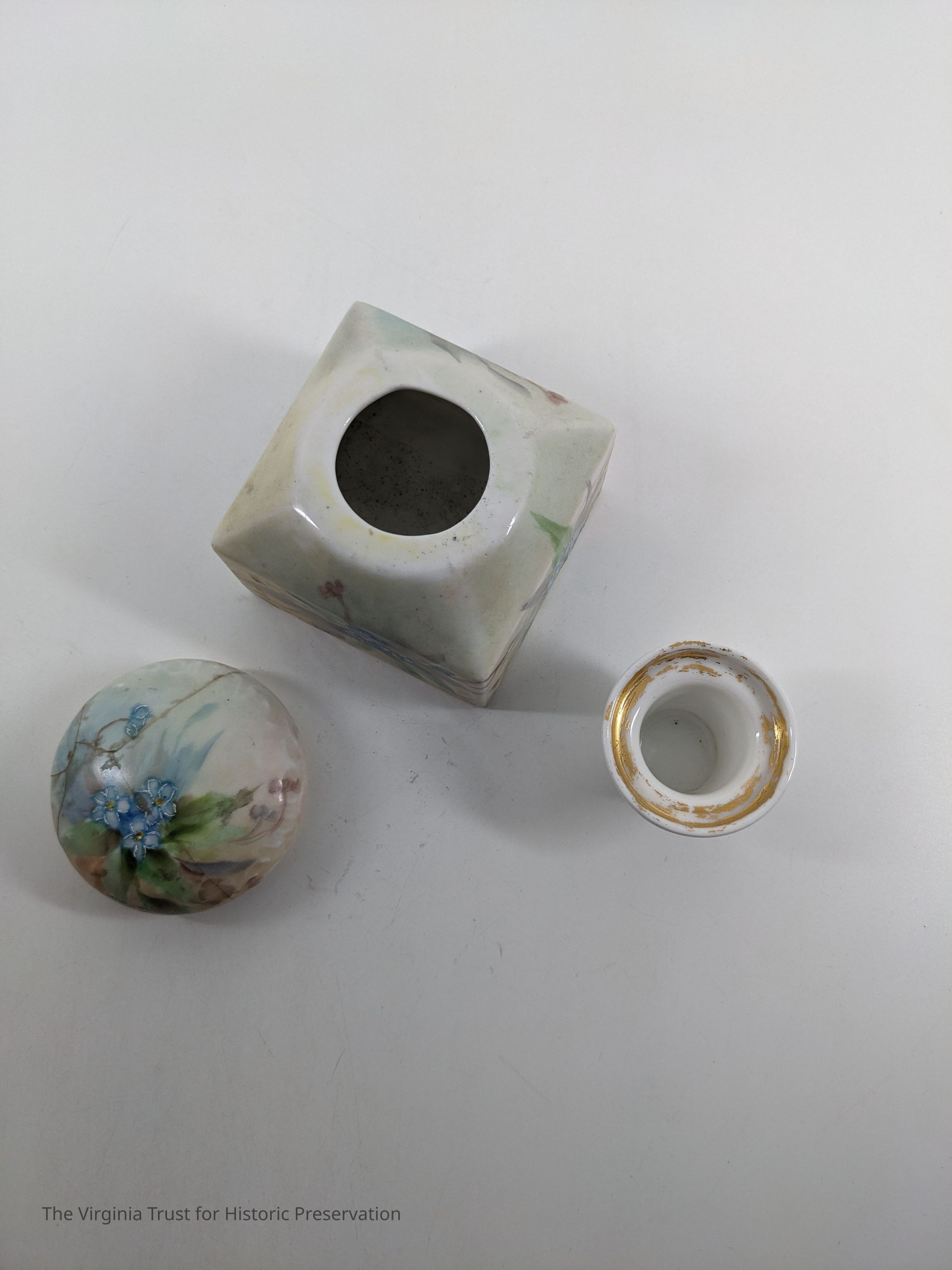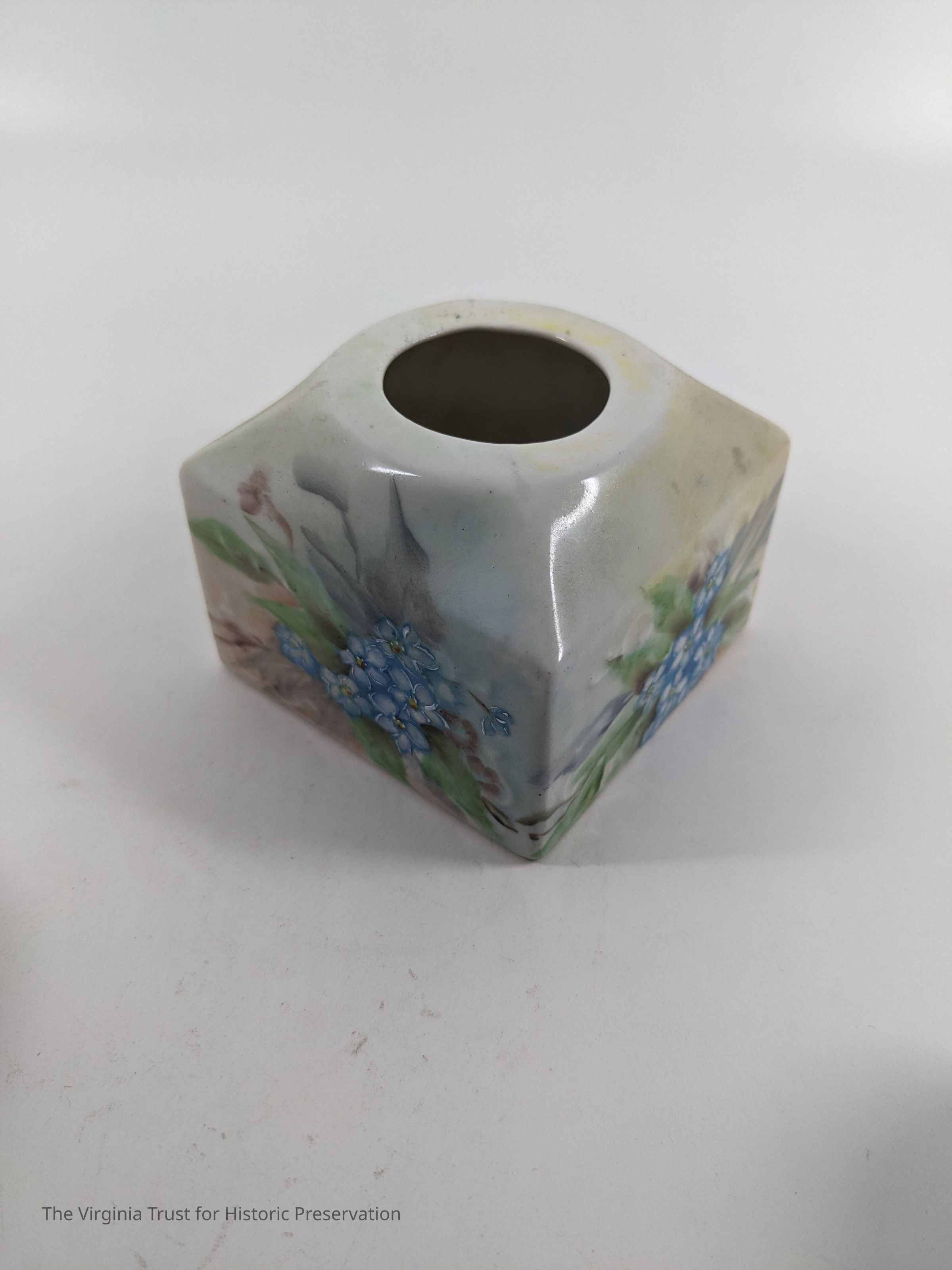 Porcelain inkwell. Painted with blue flowers and green leaves.