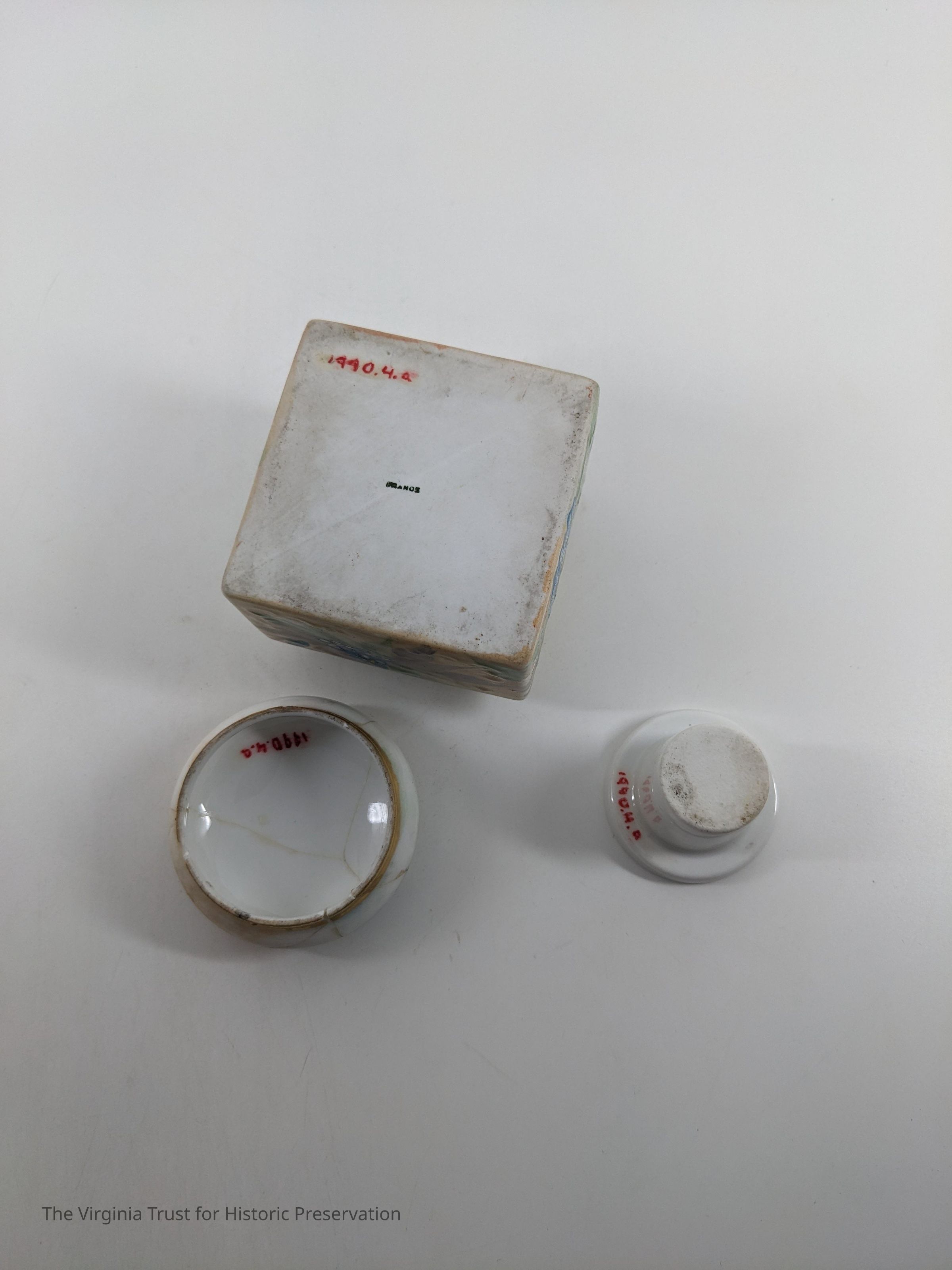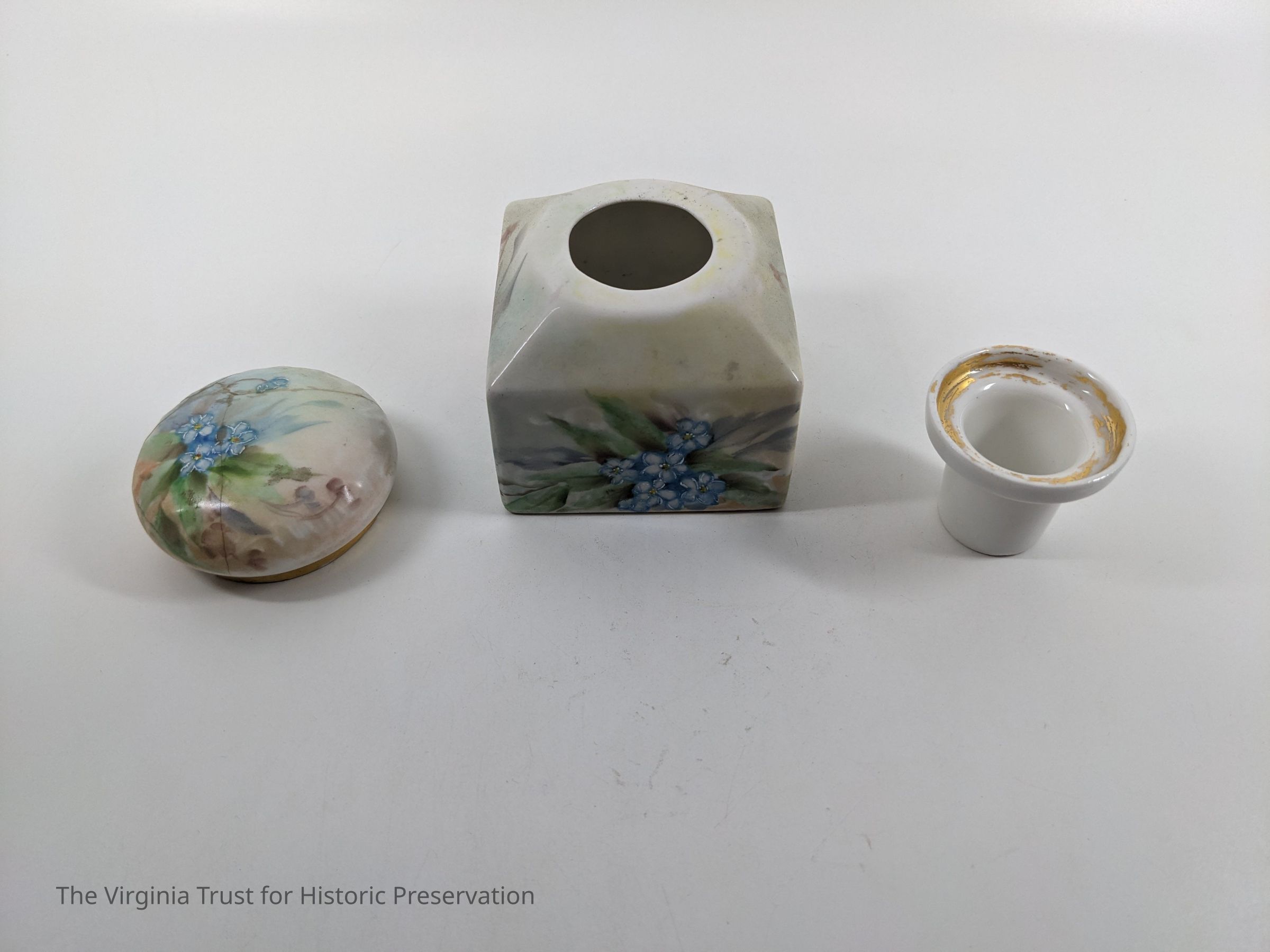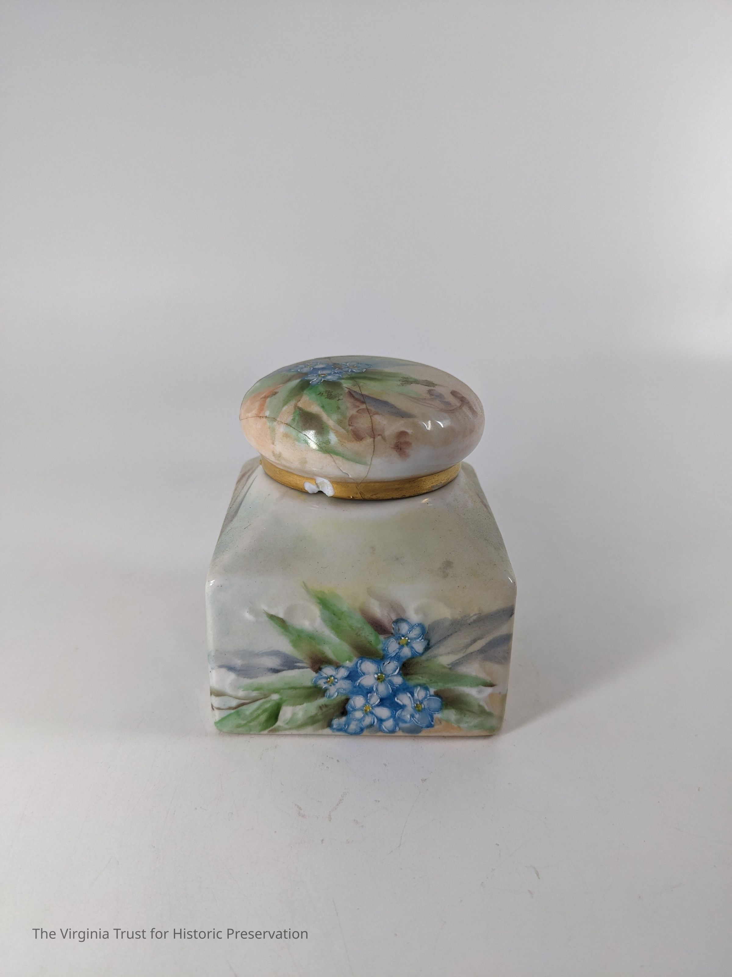 Porcelain inkwell. Painted with blue flowers and green leaves.