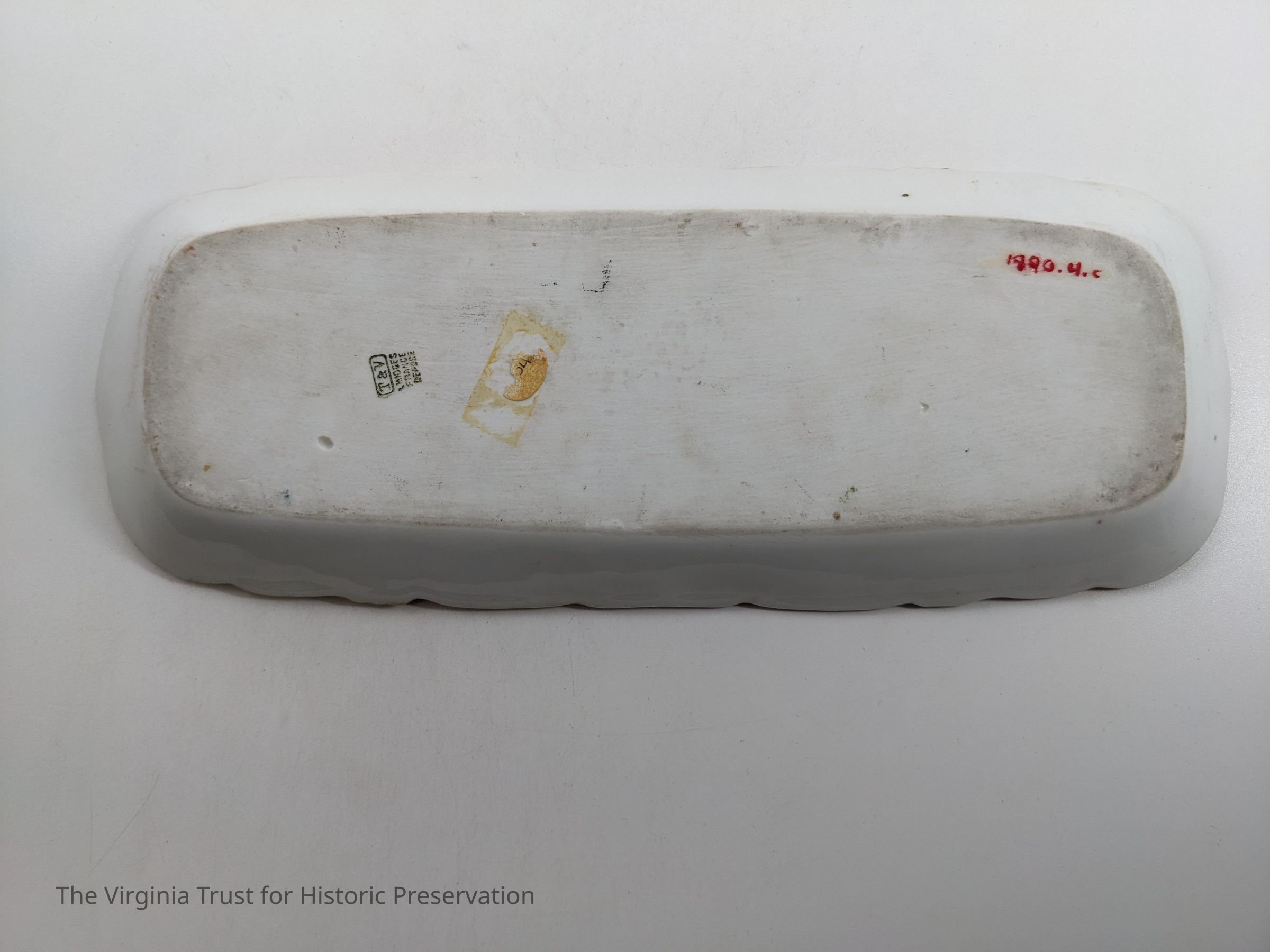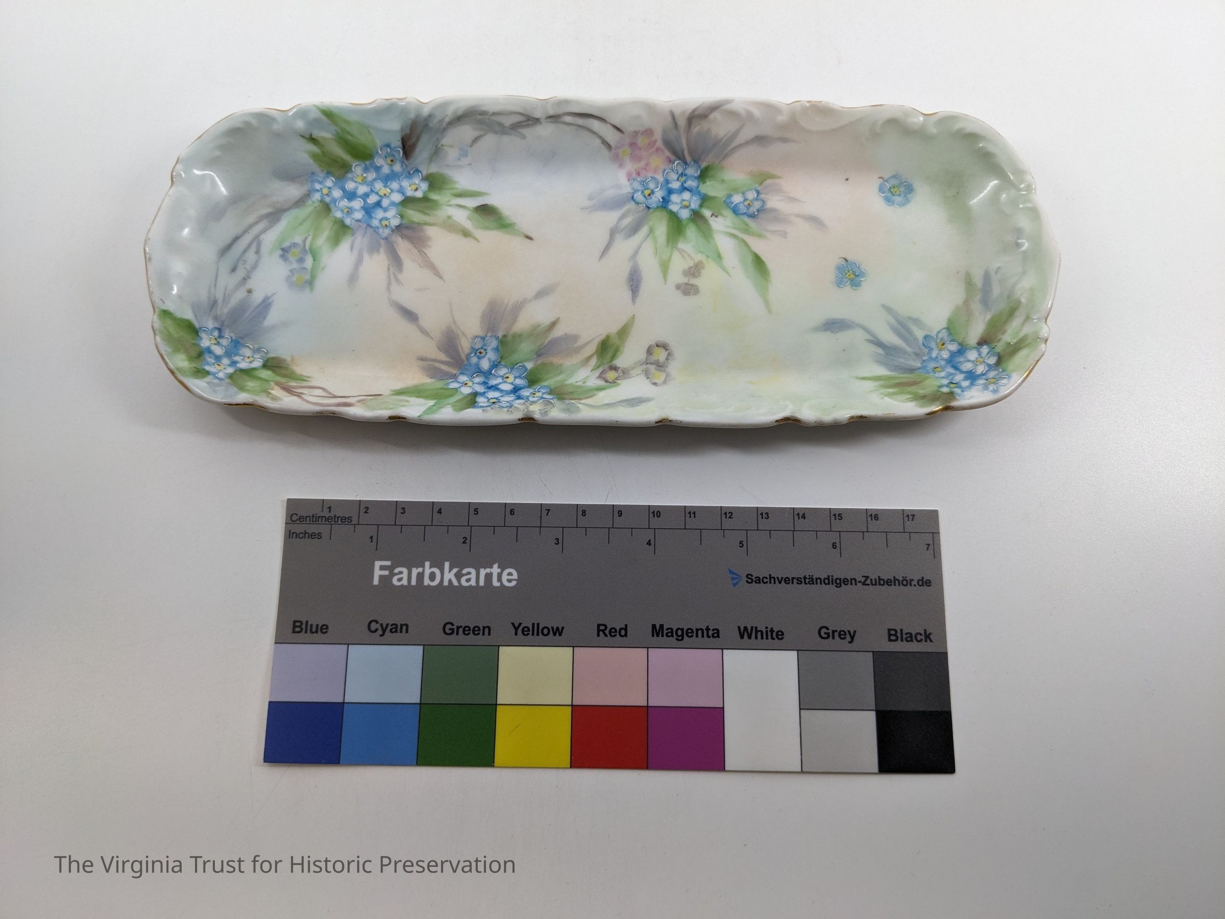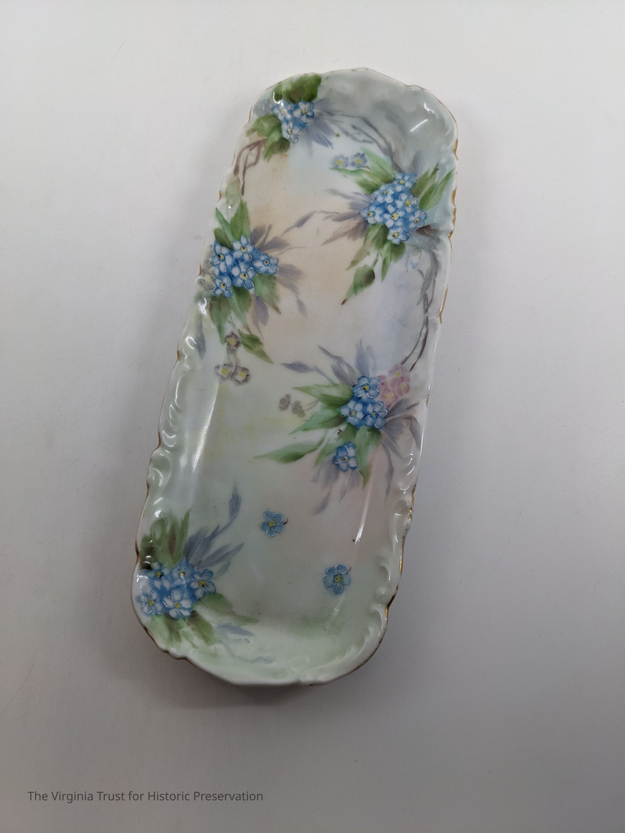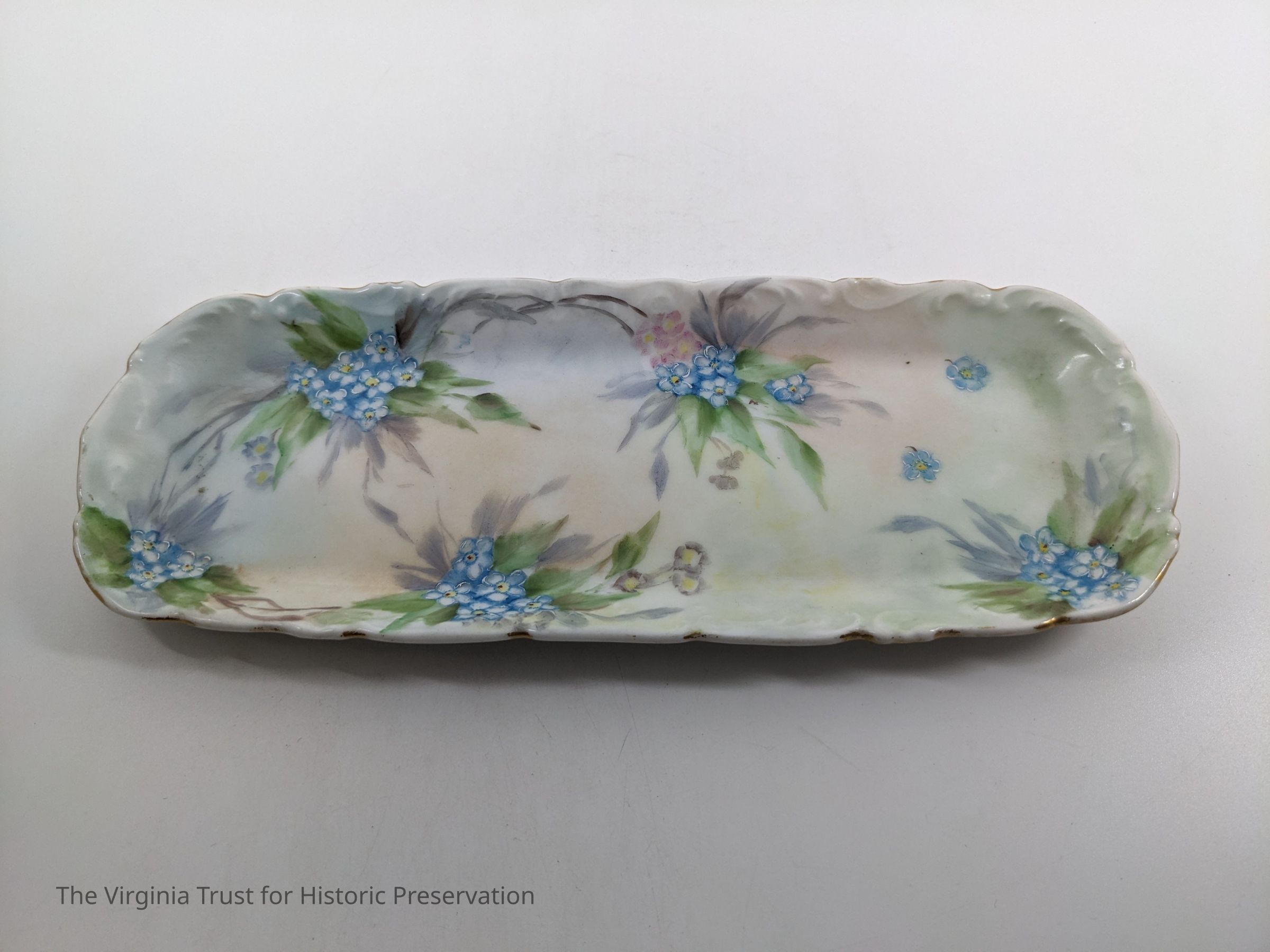 Porcelain tray. Marked "Limoges France, Depose" on bottom. Painted with blue flowers and green leaves.