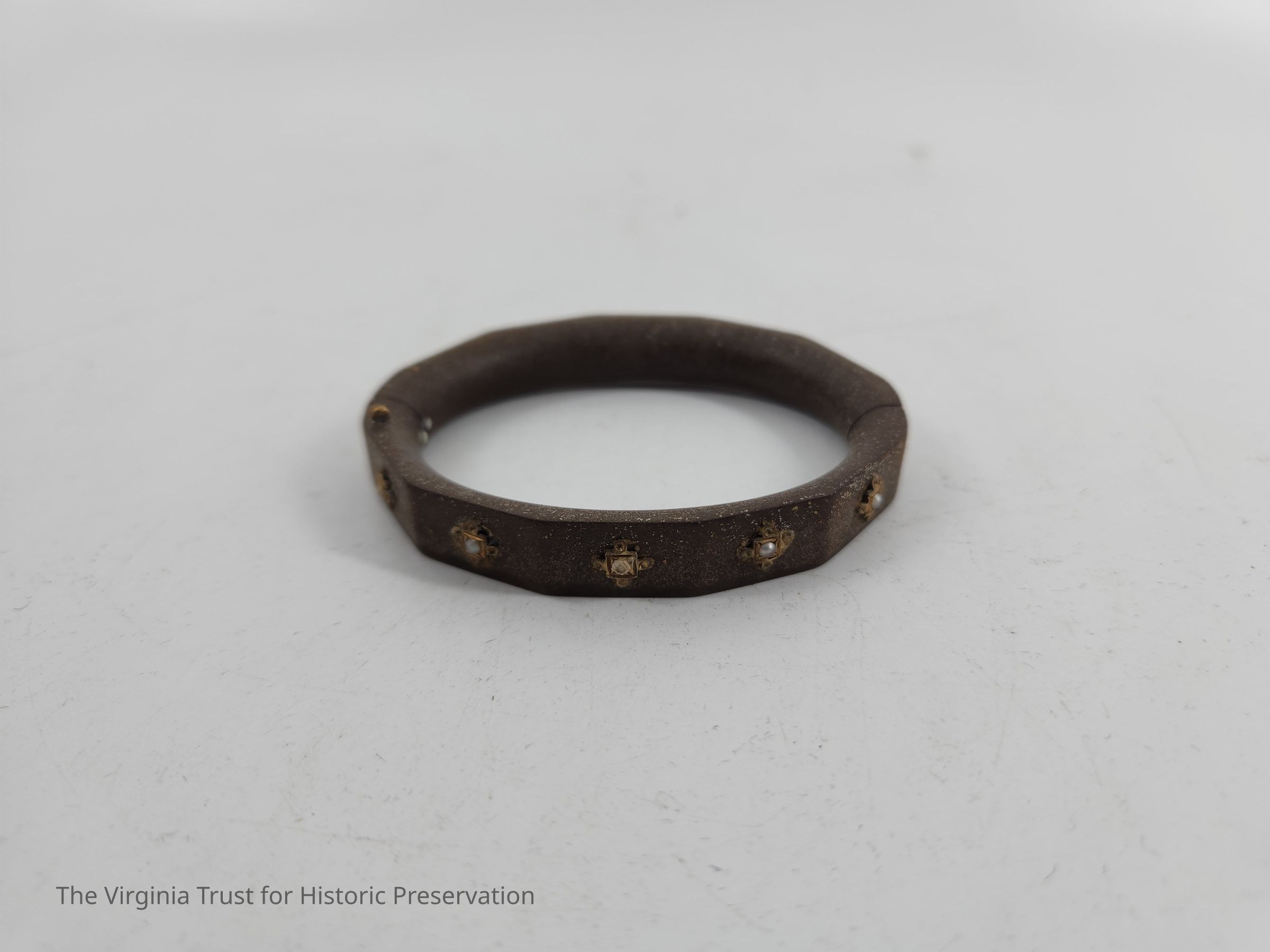 Bog oak bracelet inlaid with five "Square cross" motifs in gold and five seed pearls.