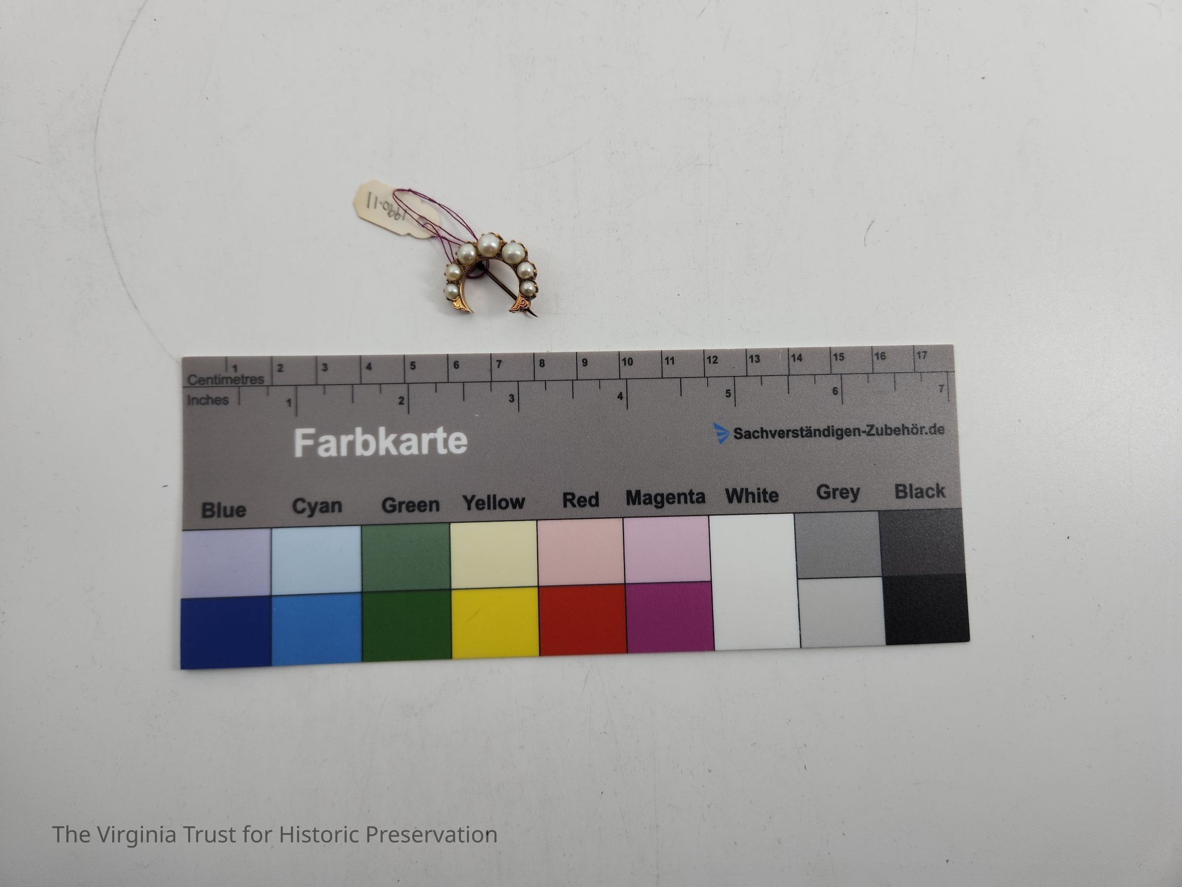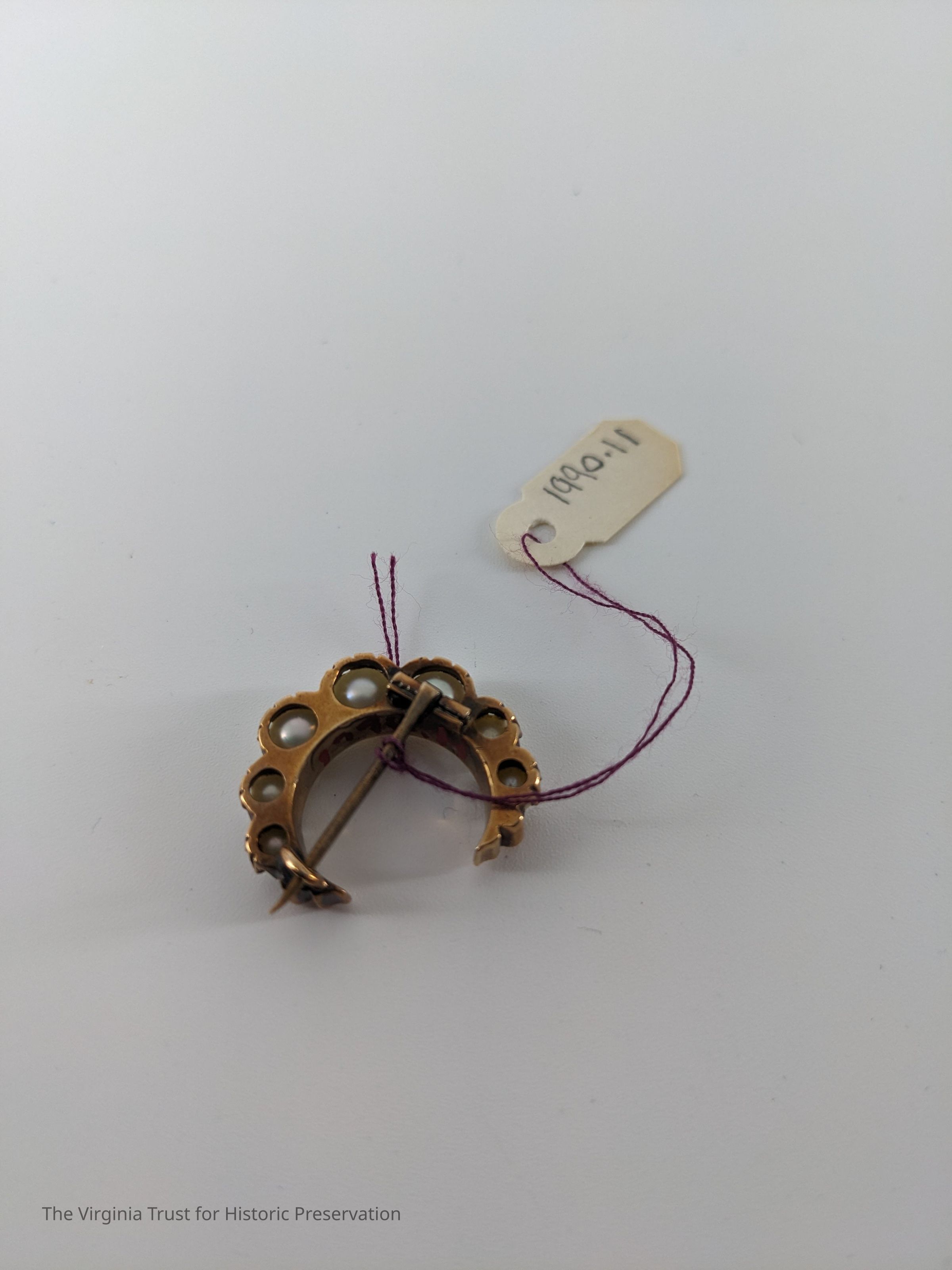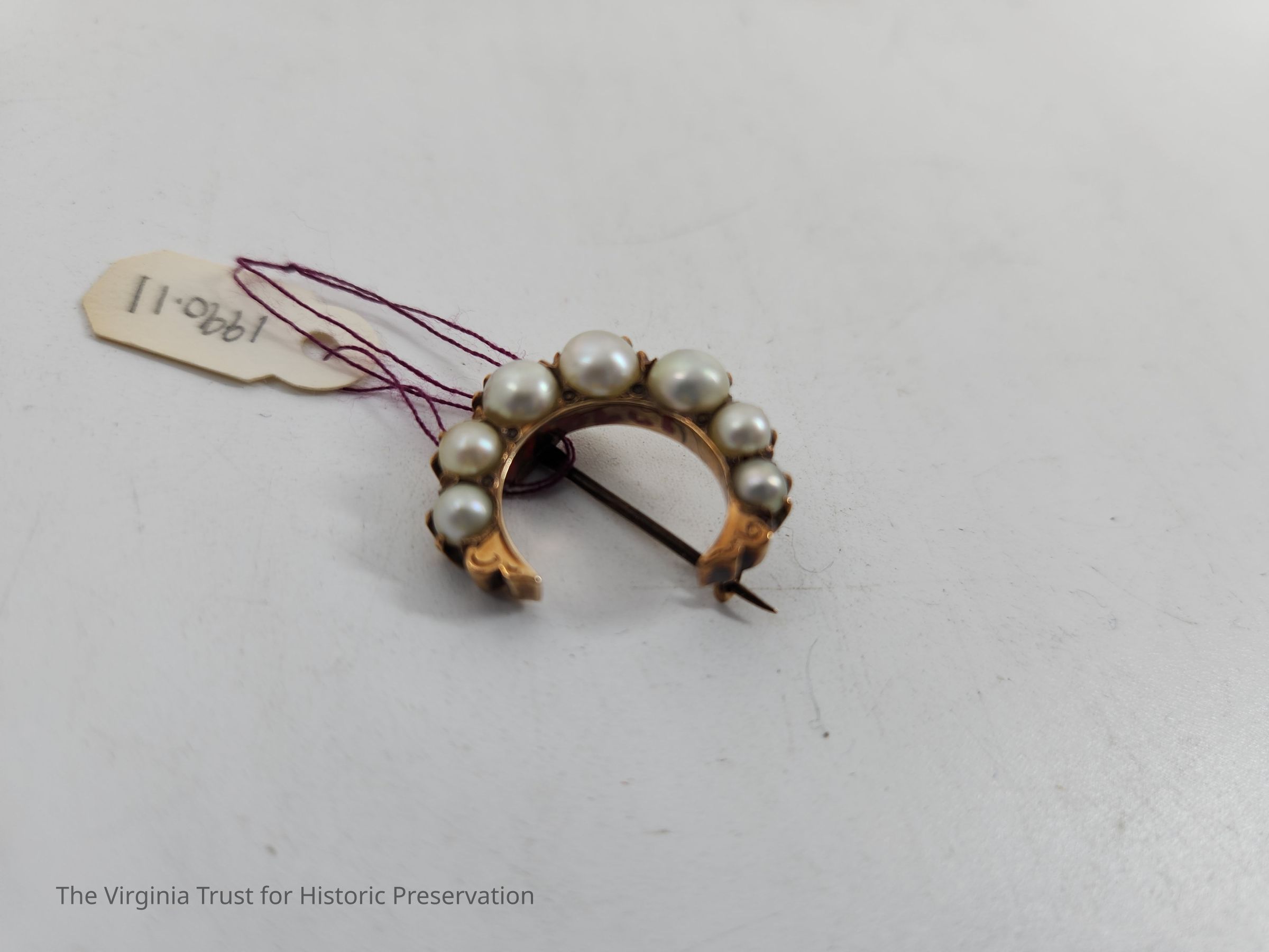 Crescent-shaped pearl and gold brooch.