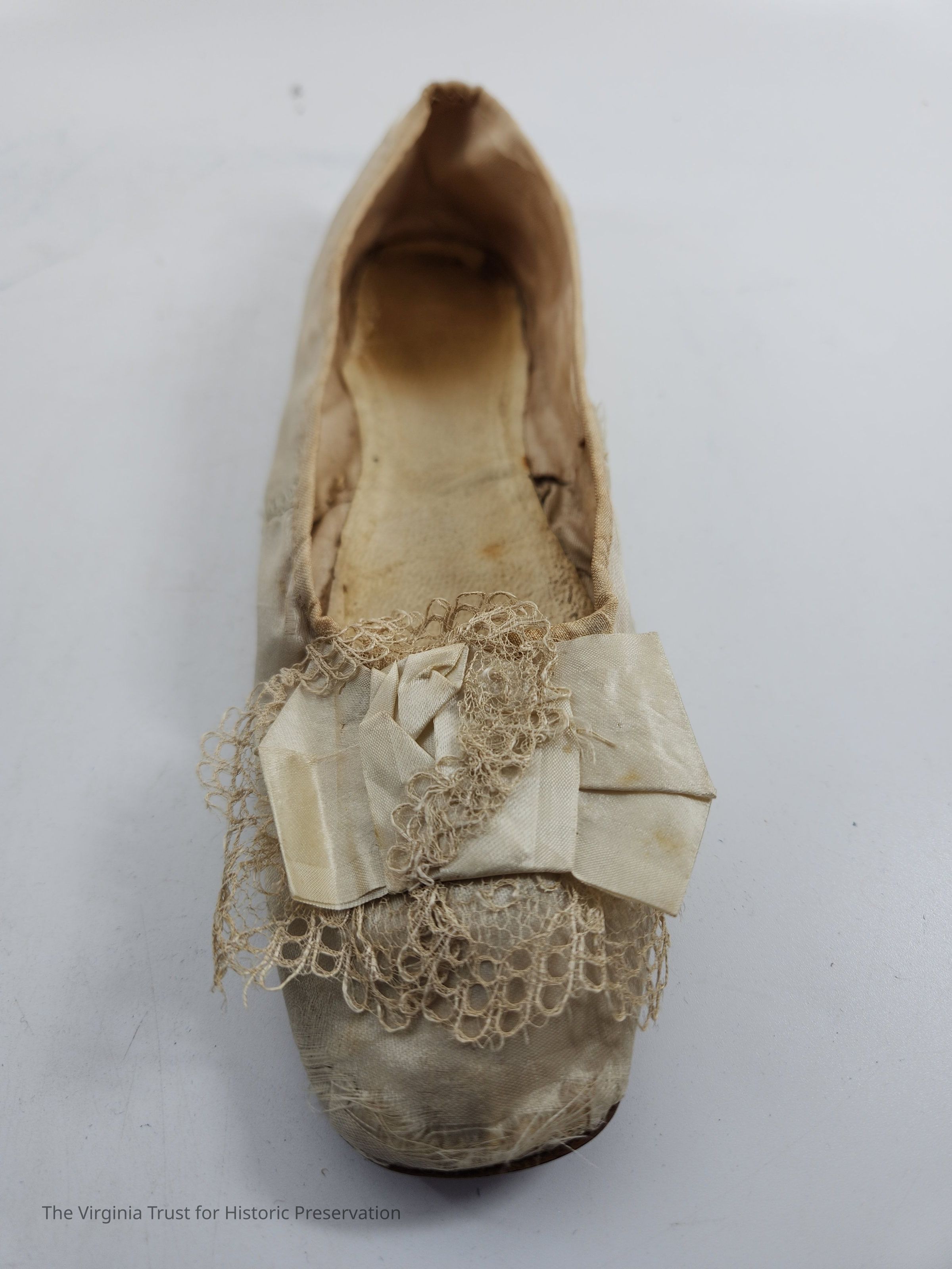 One of a pair of white satin wedding slippers, lace trim under and over a silk satin bow trimming the toe, kid lining and leather flat sole.