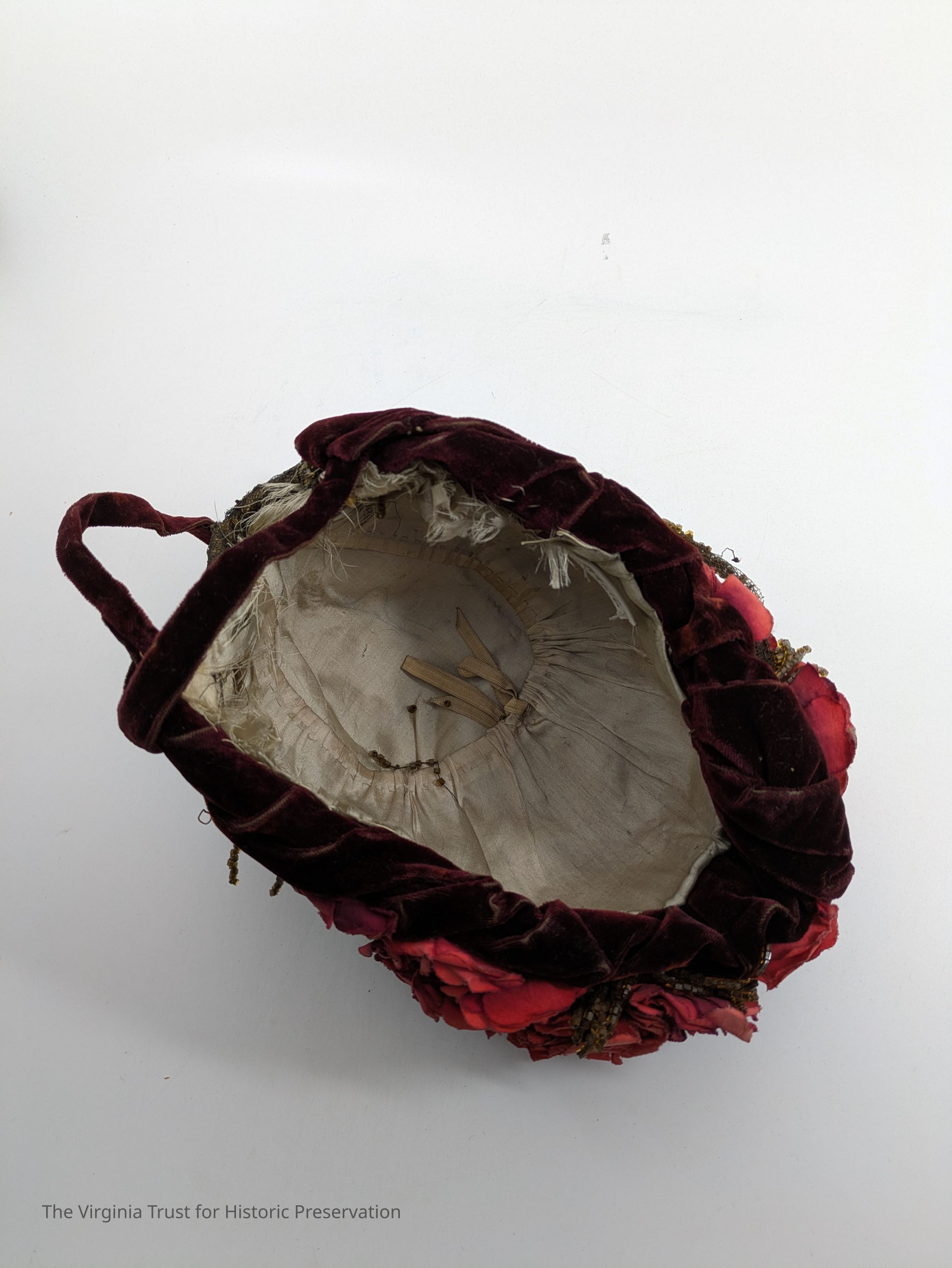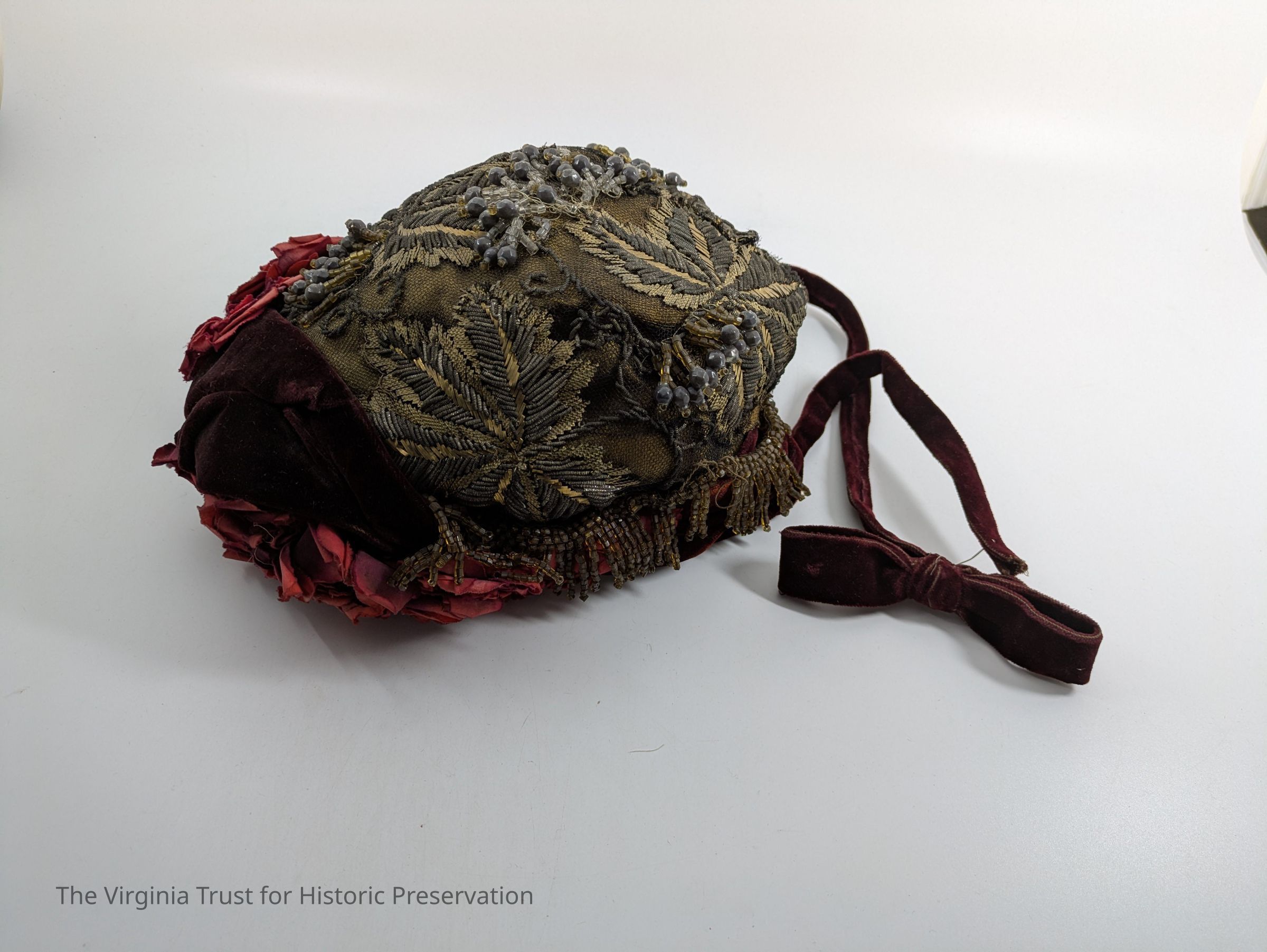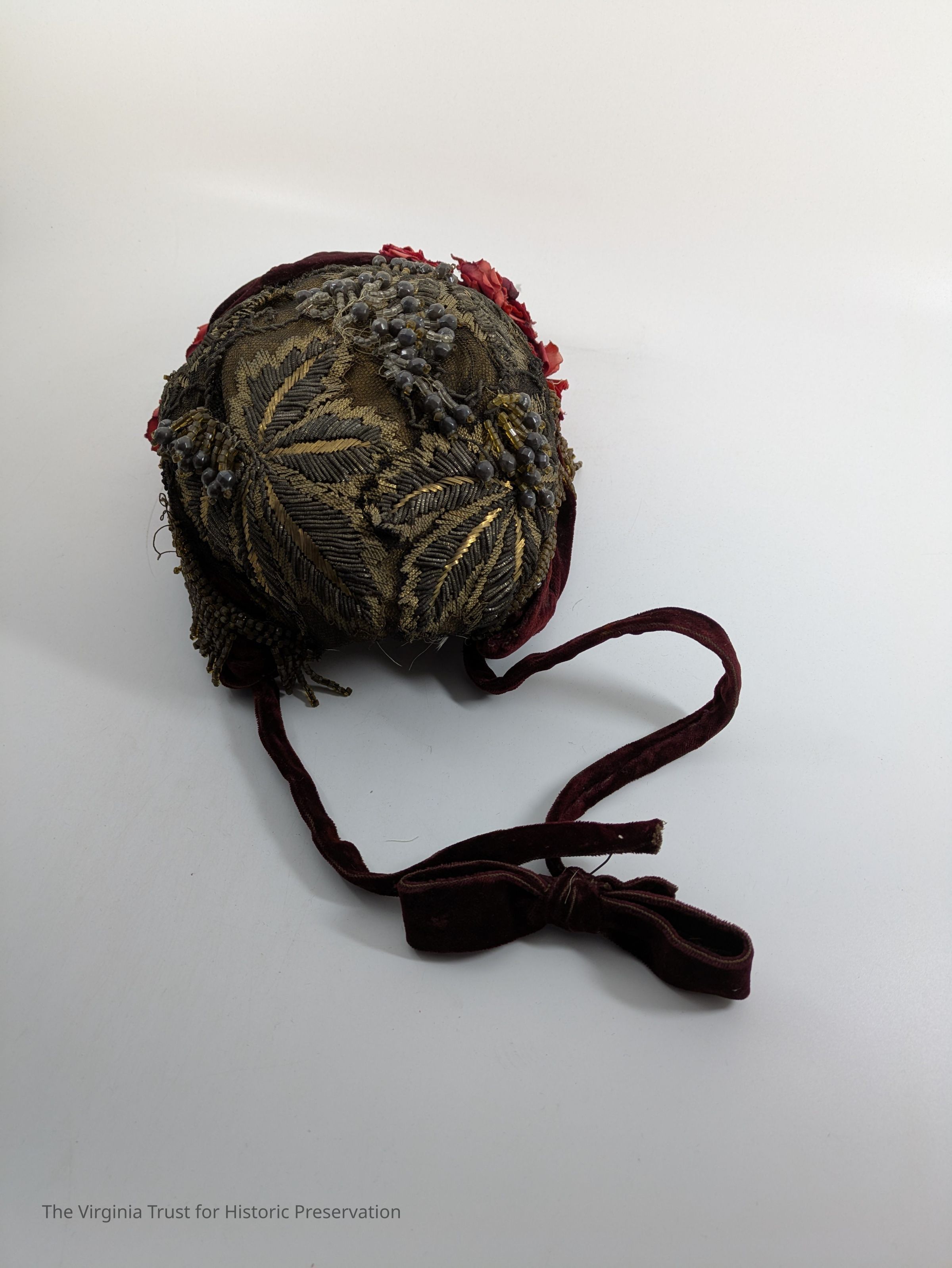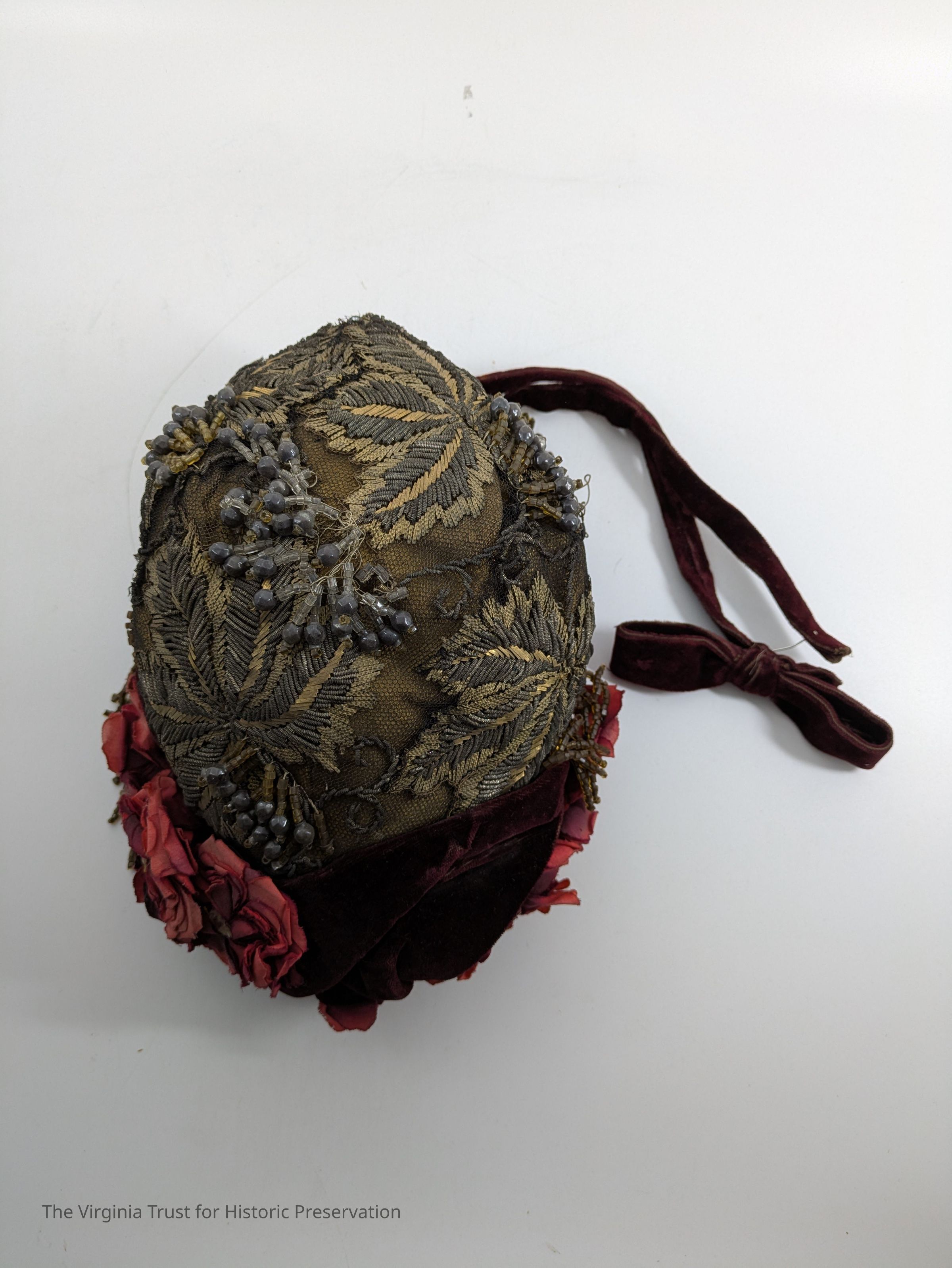 Ladies hat. Dark red velvet ribbons, red fabric flowers around gold netting trimmed with gold leaf design. Entire hat trimmed with beaded fringe.Dimensions