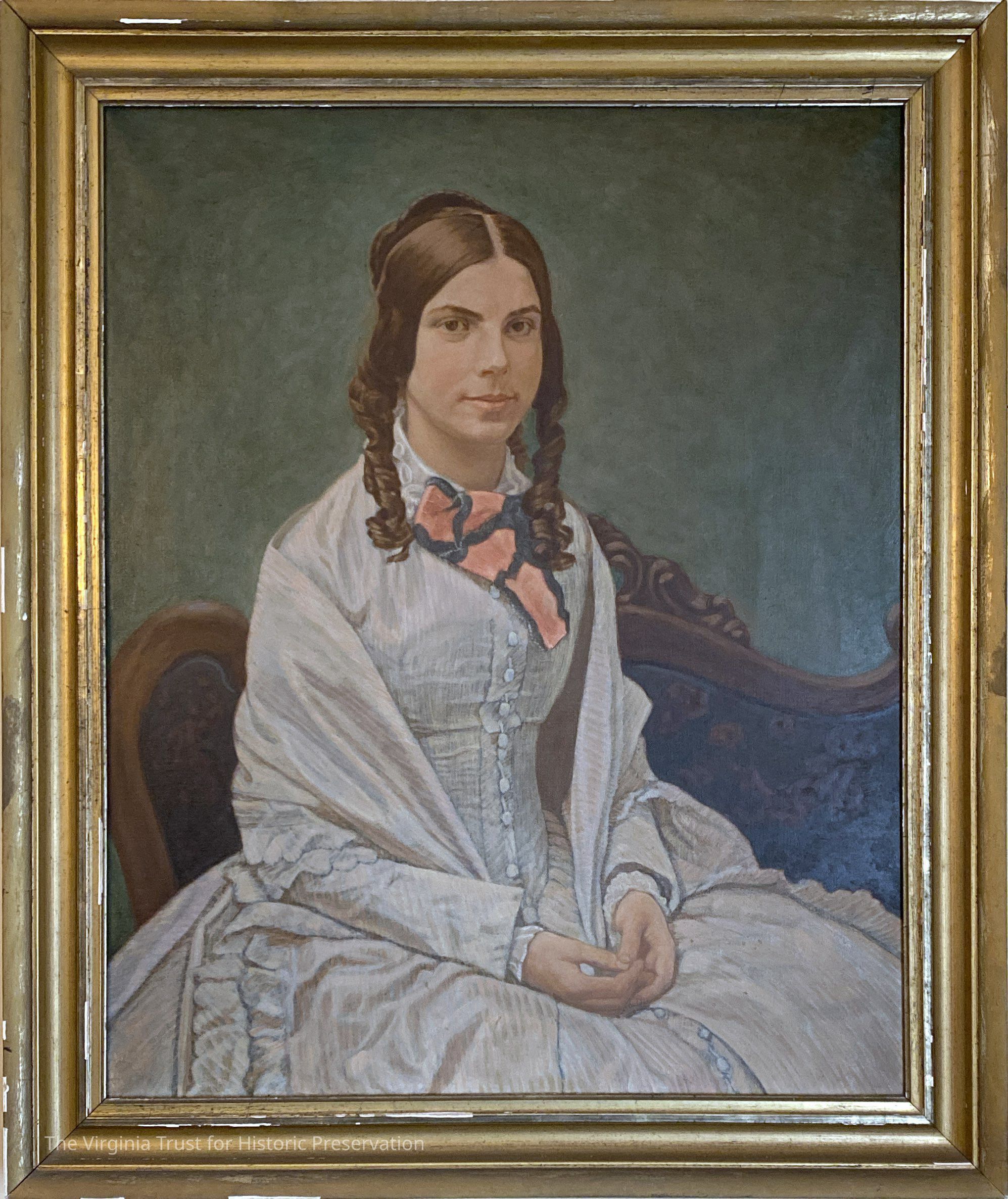 Oil on canvas portrait of Harriot Cazenove. Painted from a daguerreotype made about 1845 by the painter Dwight Loomis Williams. Painted 1937-38. Subject seated on a Victorian couch, brown hair, three-quarter length, mottled green background. Age of subject approx. 23. Gilded late 1930s frame.Dimensions