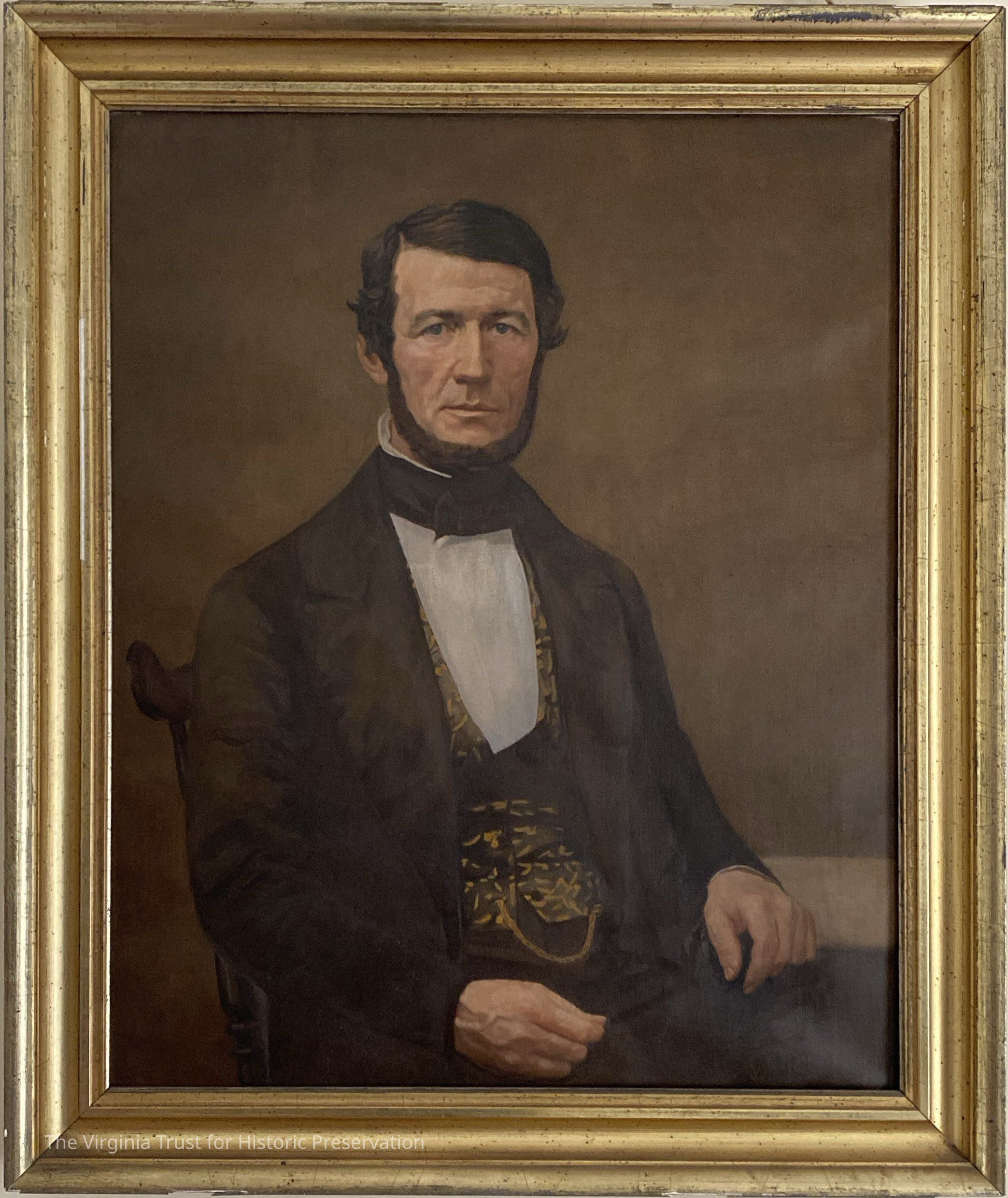 Portrait of Louis Cazenove. Oil on canvas painting a copy from a daguerreotype. Subject depicted seated in a Windsor chair, both hands showing, half length. Brown hair, wearing a gold watch chain, gold embroidered vest, brown coat. Subject appears to be about 40 years of age. Gold leafed copy of early 19th century frame.Dimensions