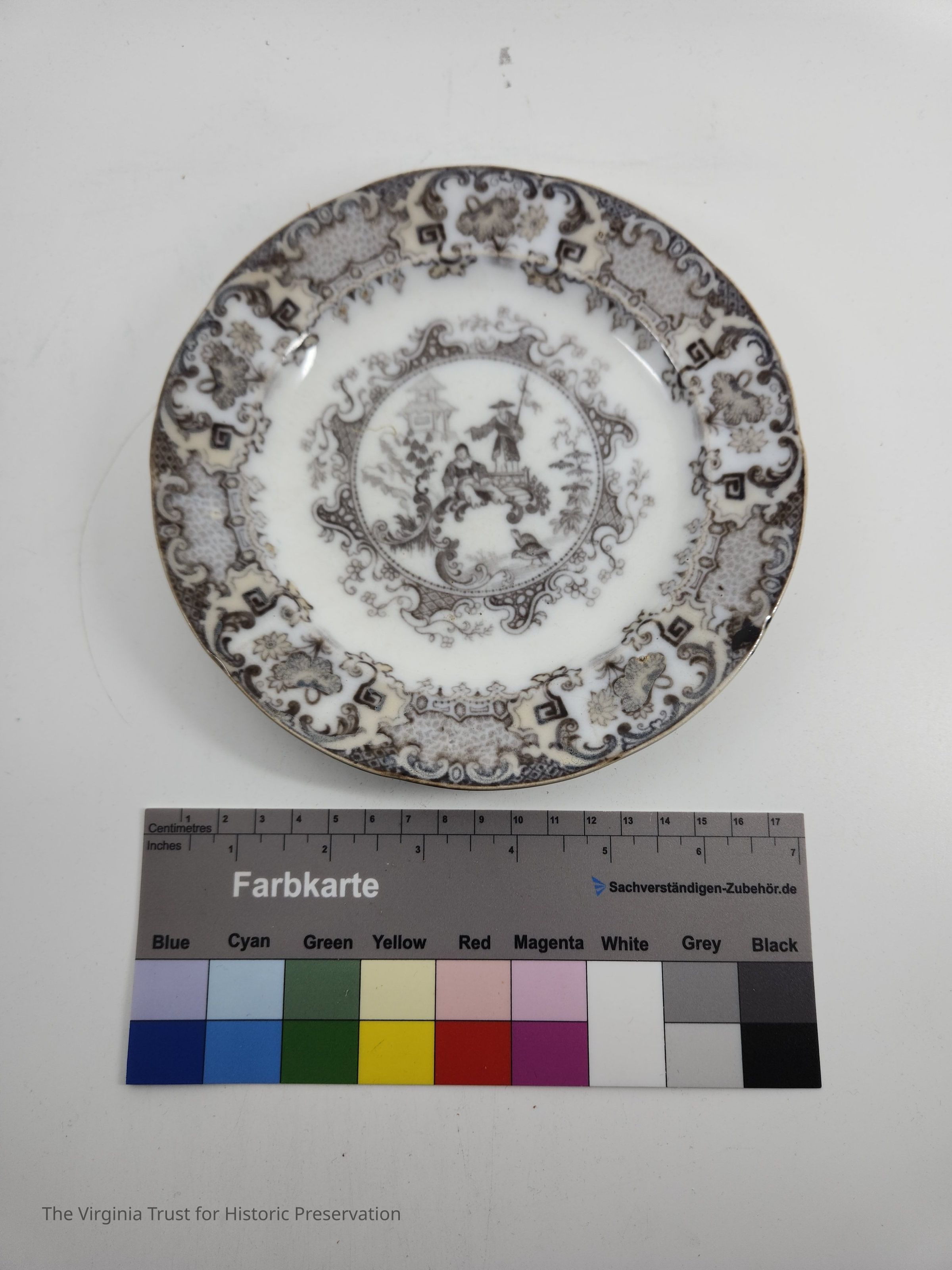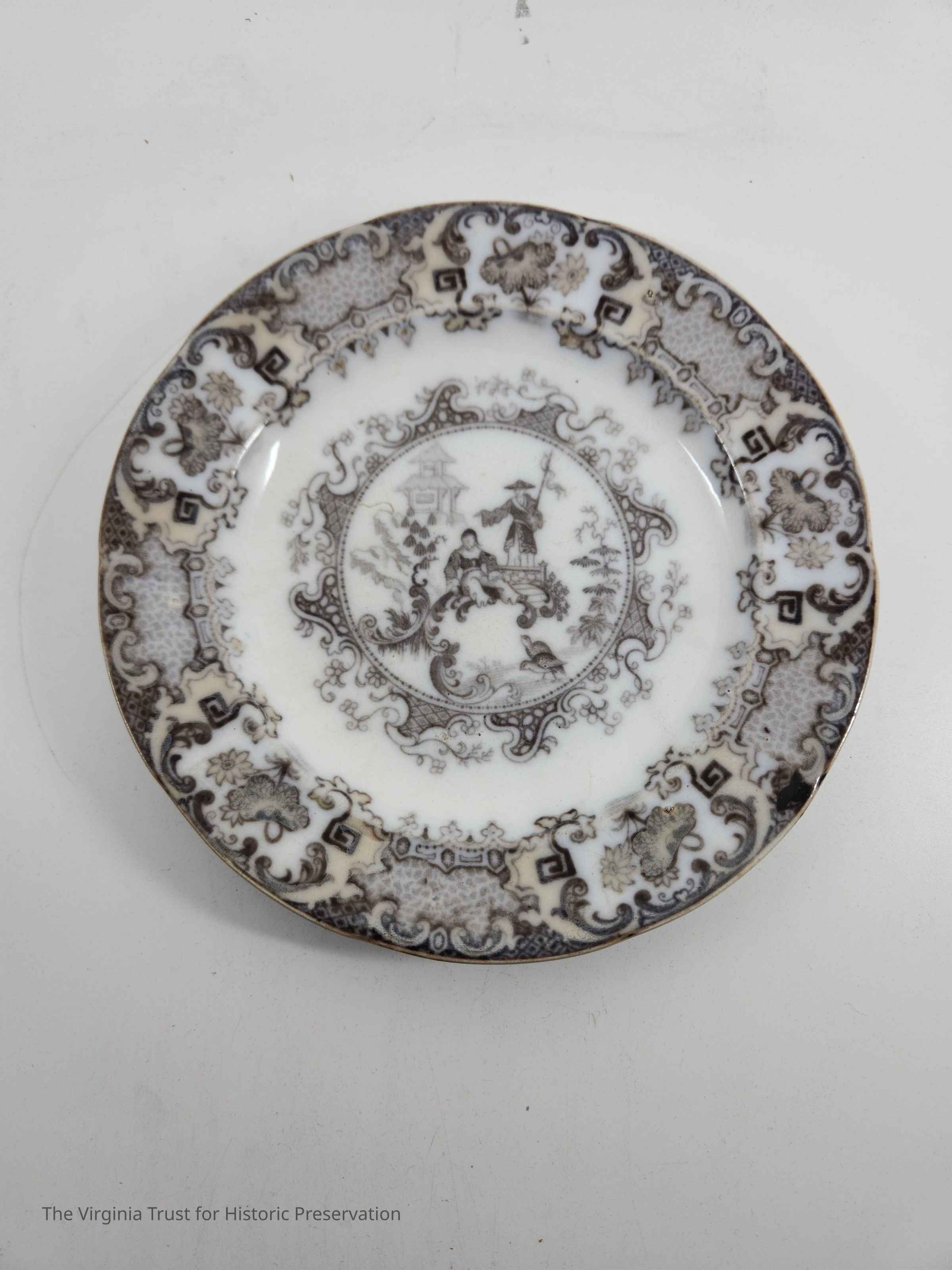 One of 8 butter plates. "Mandarin" pattern. Brown lustre and grey with a central circular reserve of a Chinese scene, the border decorated with scrolls, pseudo-Chinese motifs and flowers. English.Dimensions