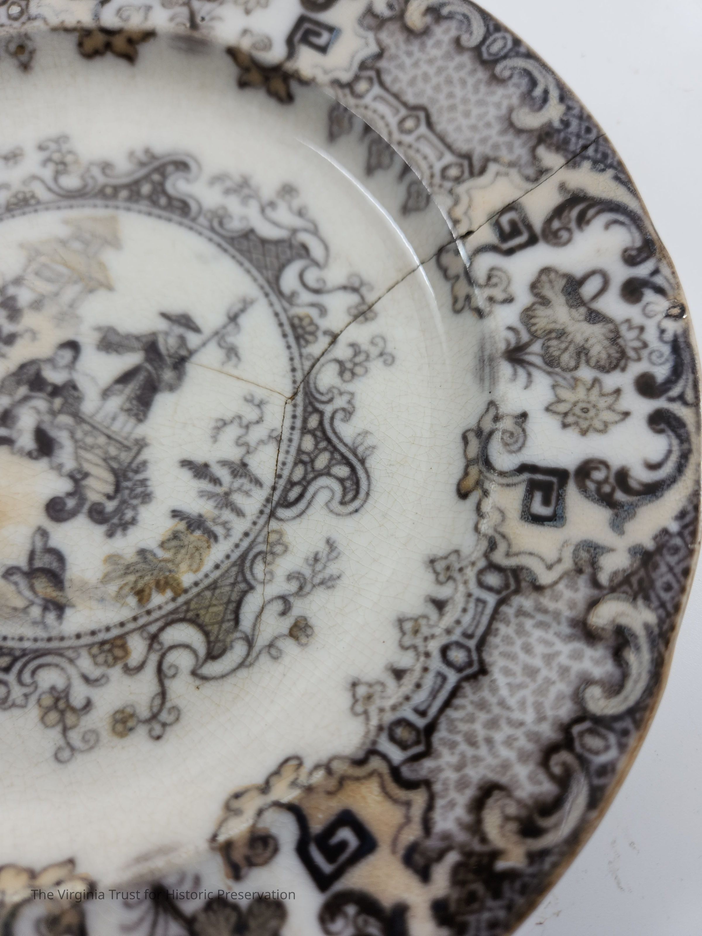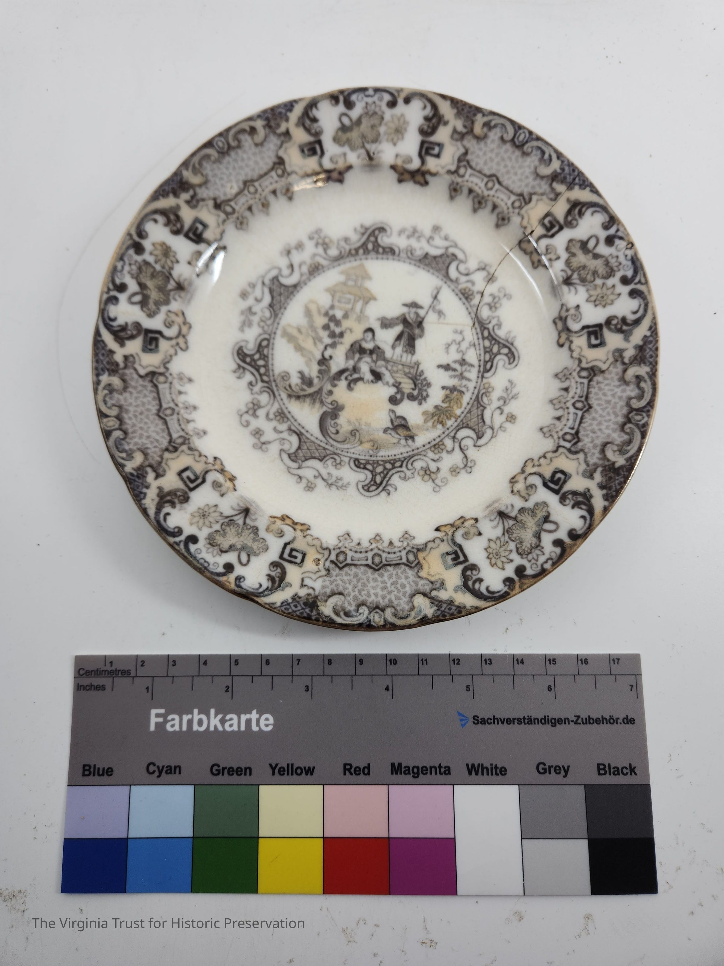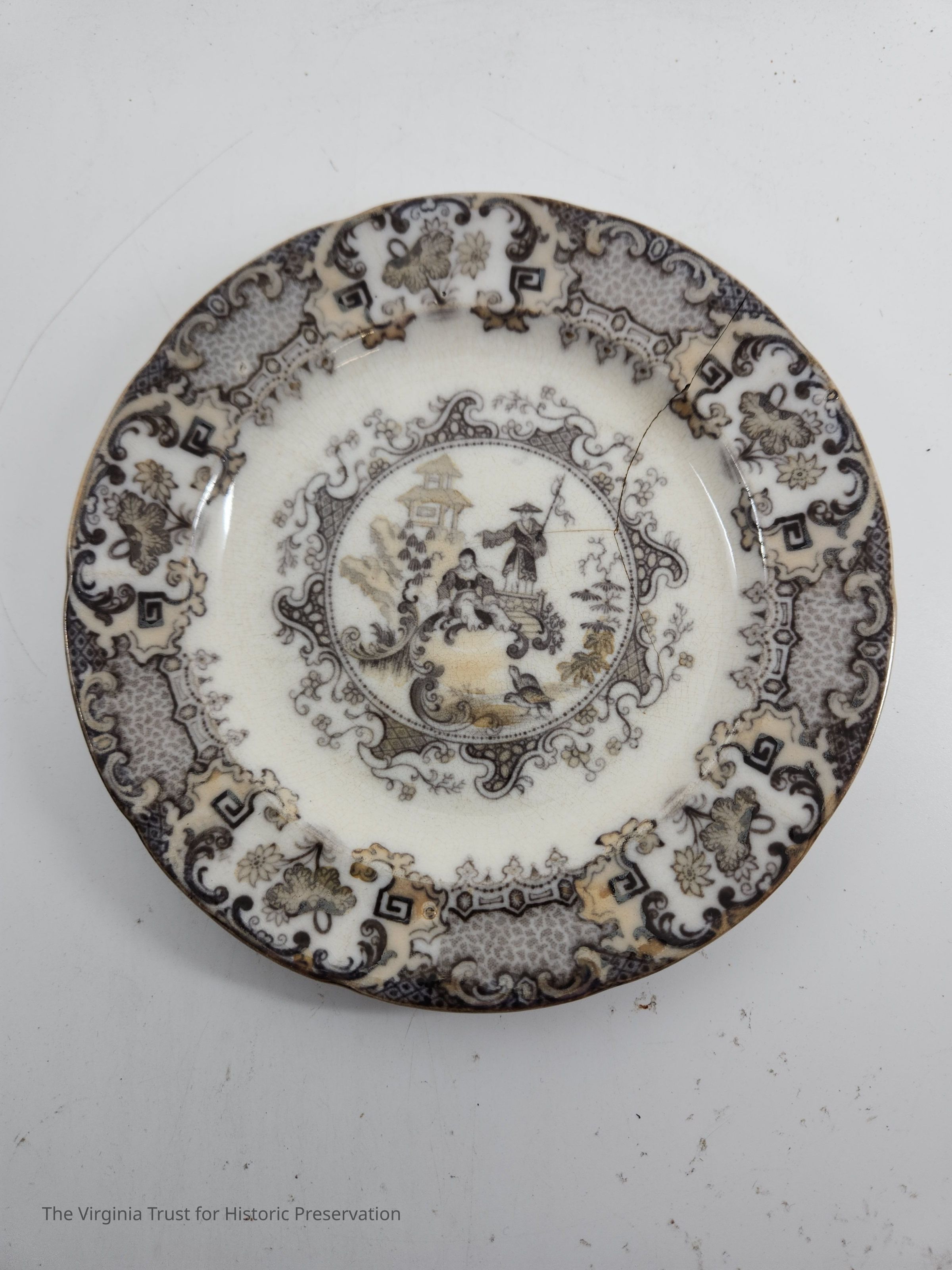 One of 8 butter plates. "Mandarin" pattern. Brown lustre and grey with a central circular reserve of a Chinese scene, the border decorated with scrolls, pseudo-Chinese motifs and flowers. English.Dimensions