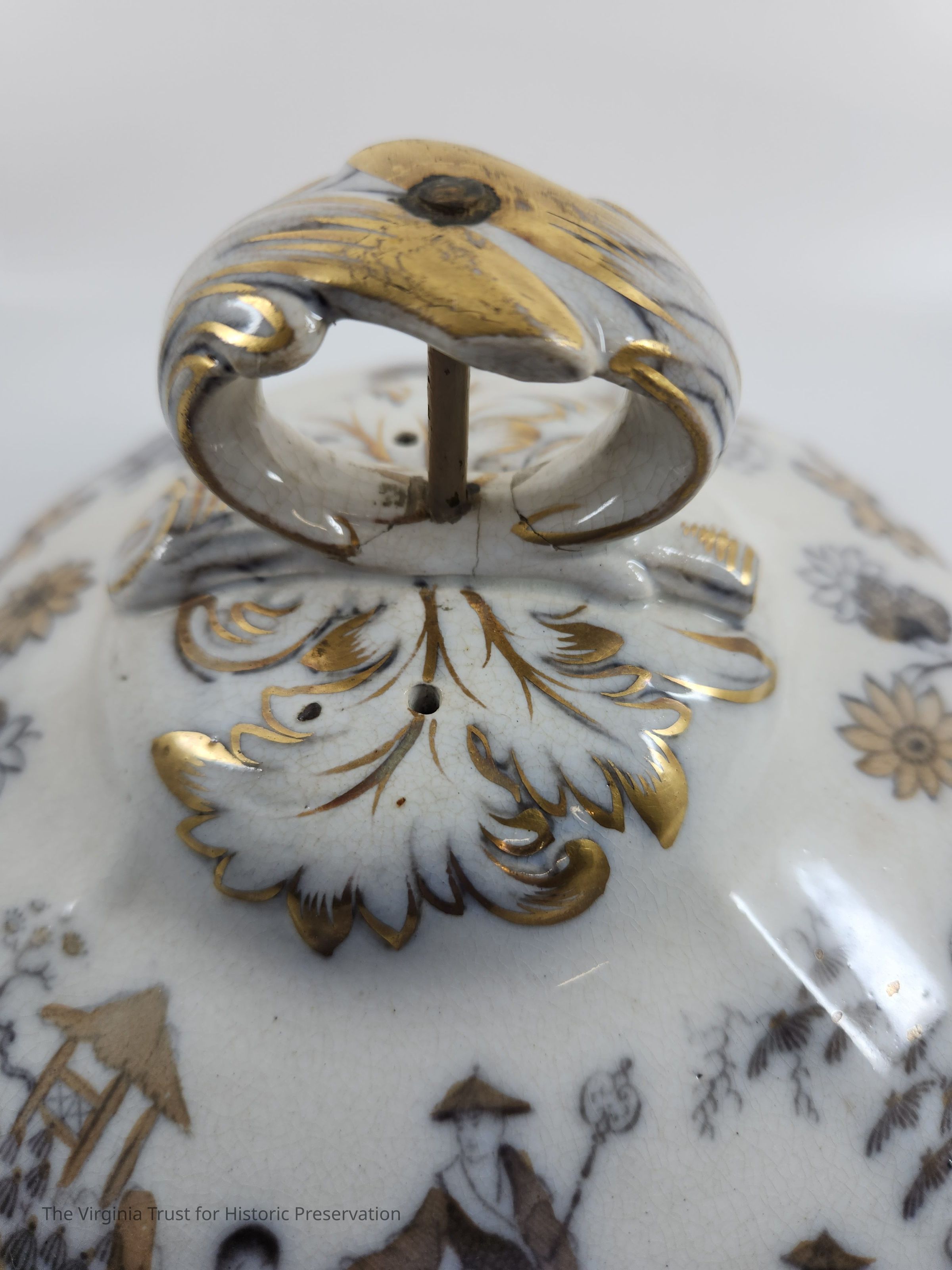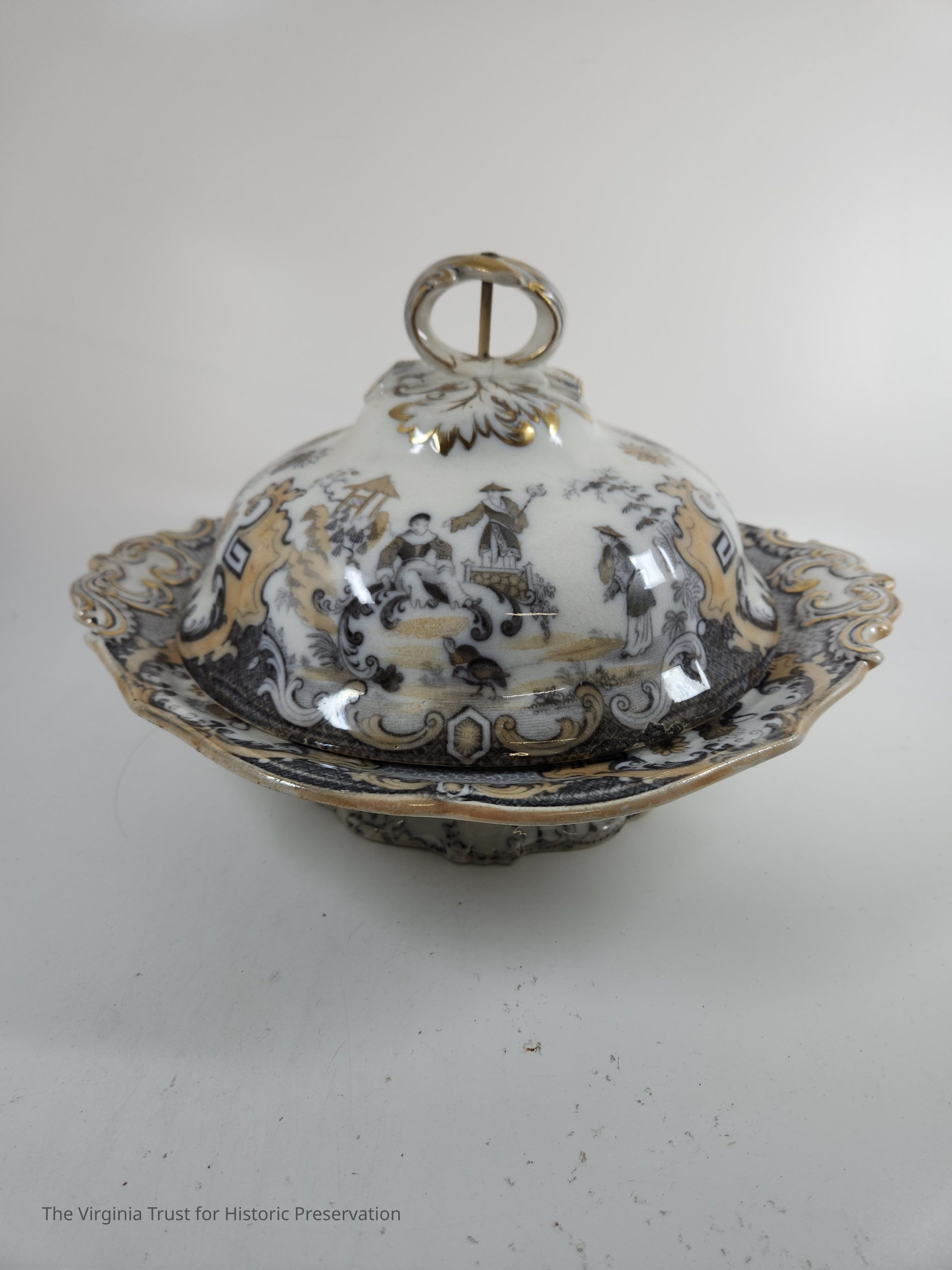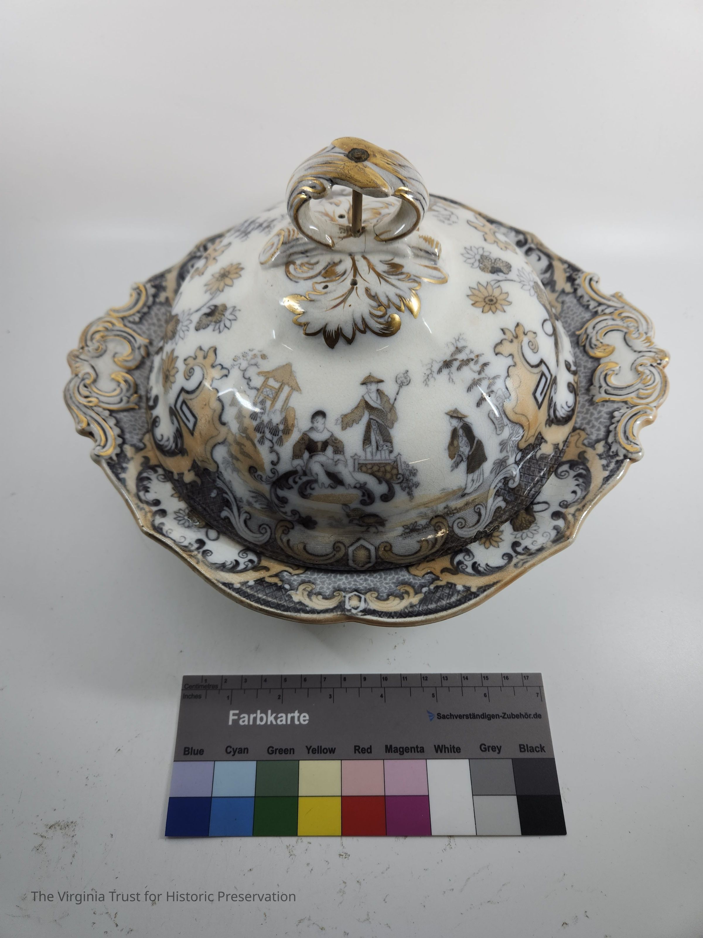 One of a pair of shaped oval vegetable dishes with circular lids decorated with gilding. Part of a dinner service in "Mandarin" pattern. Brown lustre and grey with a central circular reserve of a Chinese scene, the border decorated with scrolls, pseudo-Chinese motifs and flowers. English.Dimensions