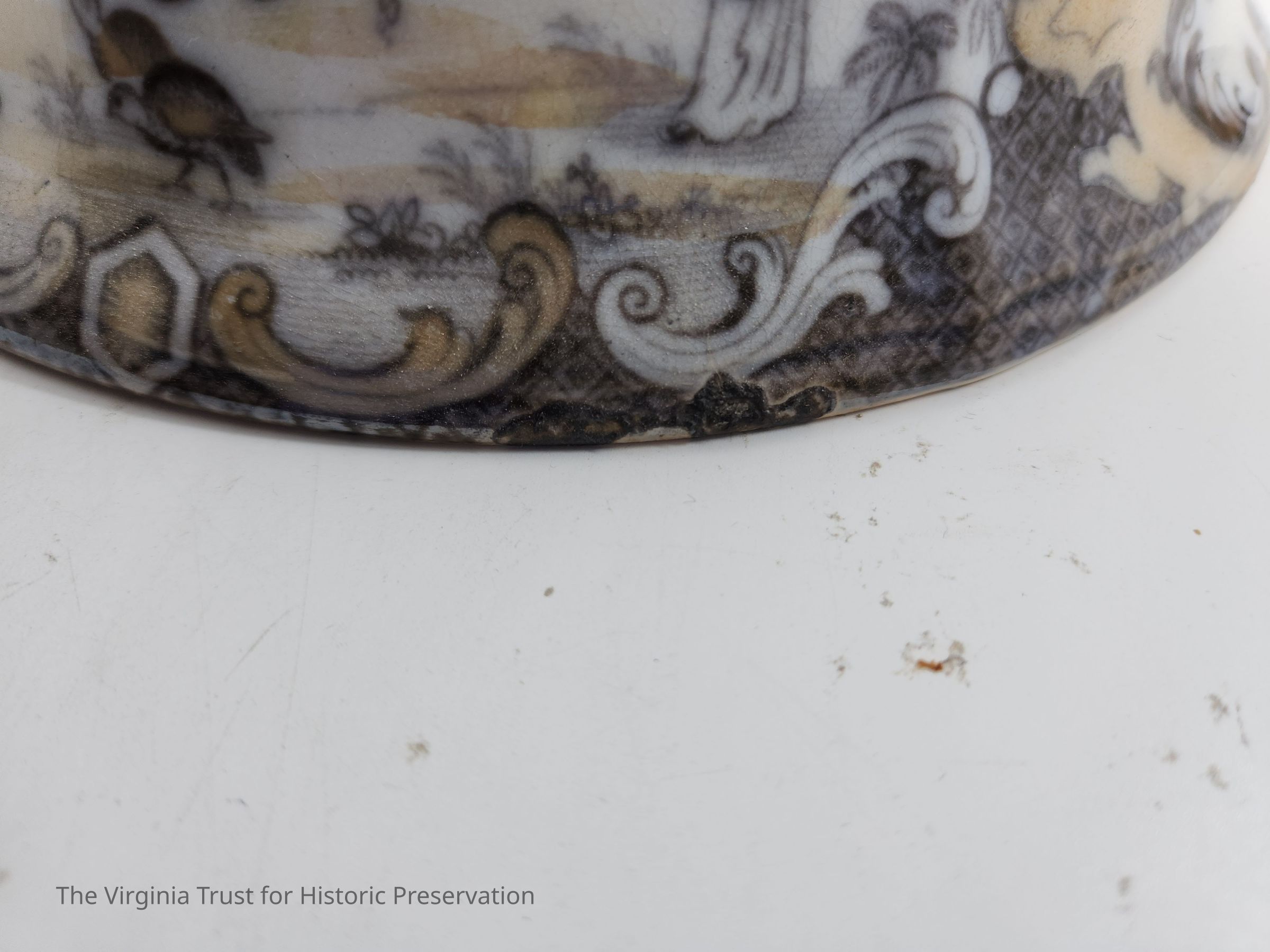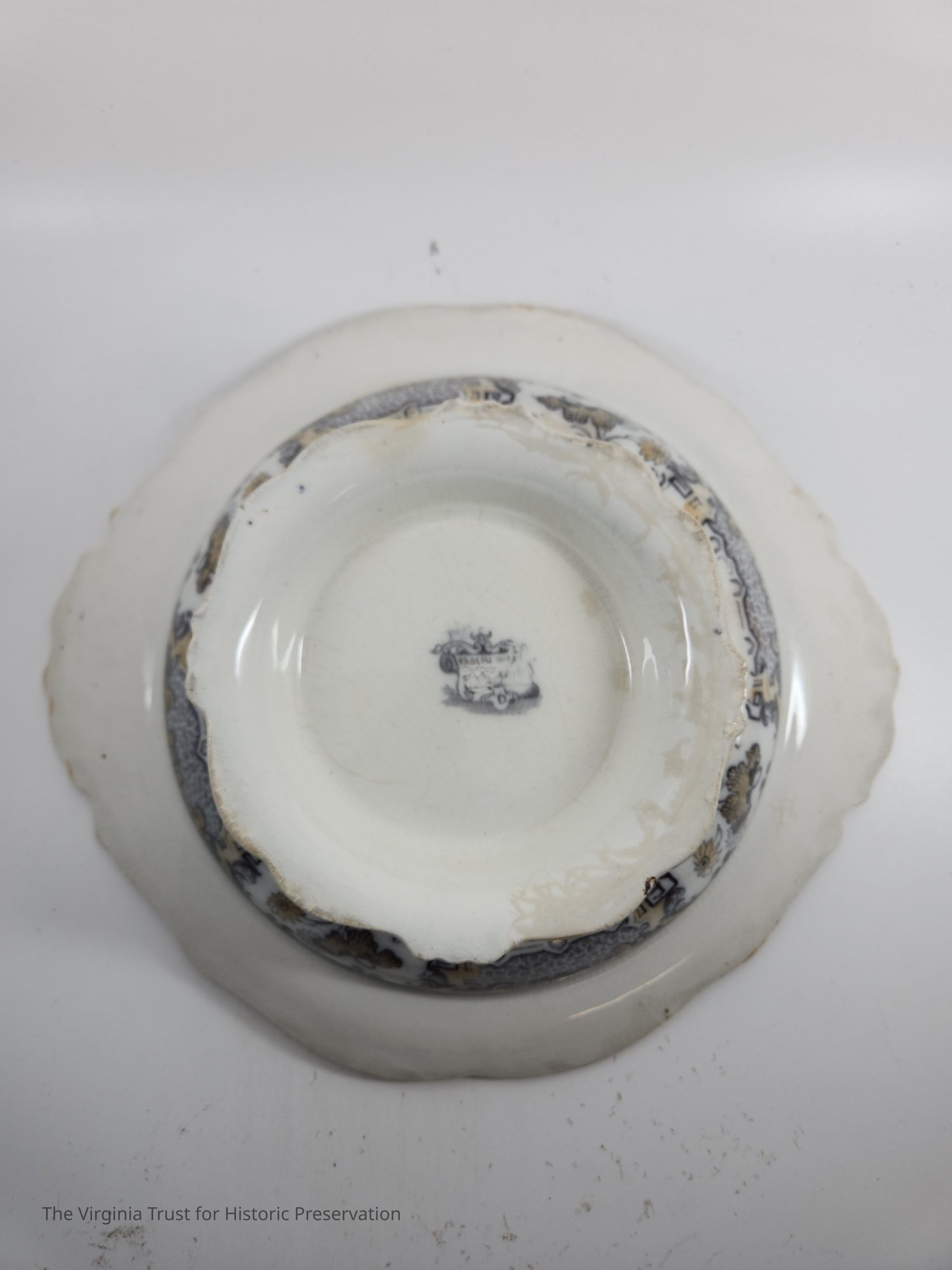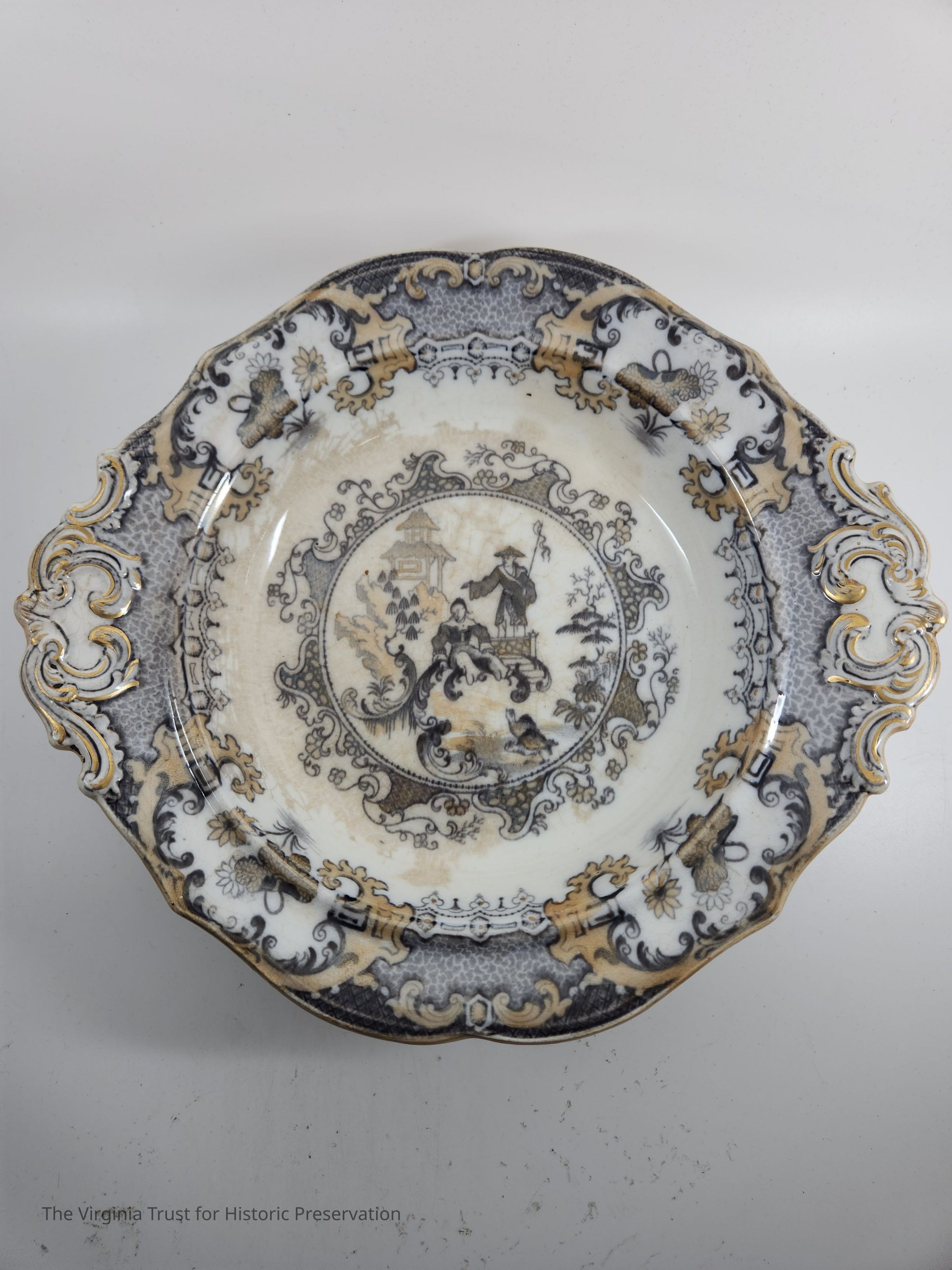 One of a pair of shaped oval vegetable dishes with circular lids decorated with gilding. Part of a dinner service in "Mandarin" pattern. Brown lustre and grey with a central circular reserve of a Chinese scene, the border decorated with scrolls, pseudo-Chinese motifs and flowers. English.Dimensions