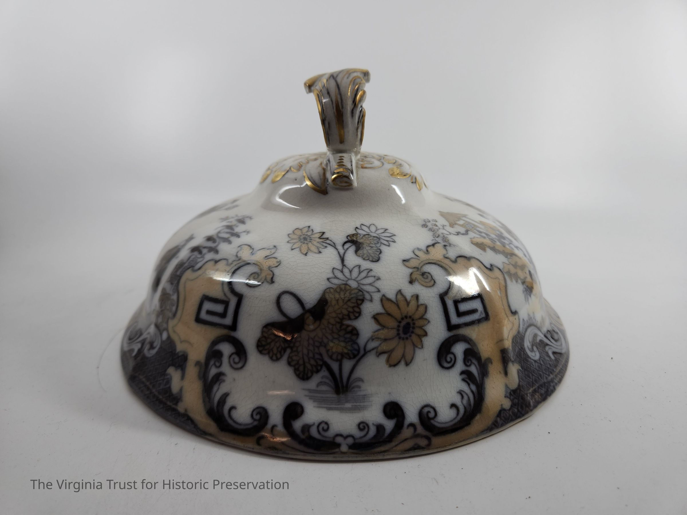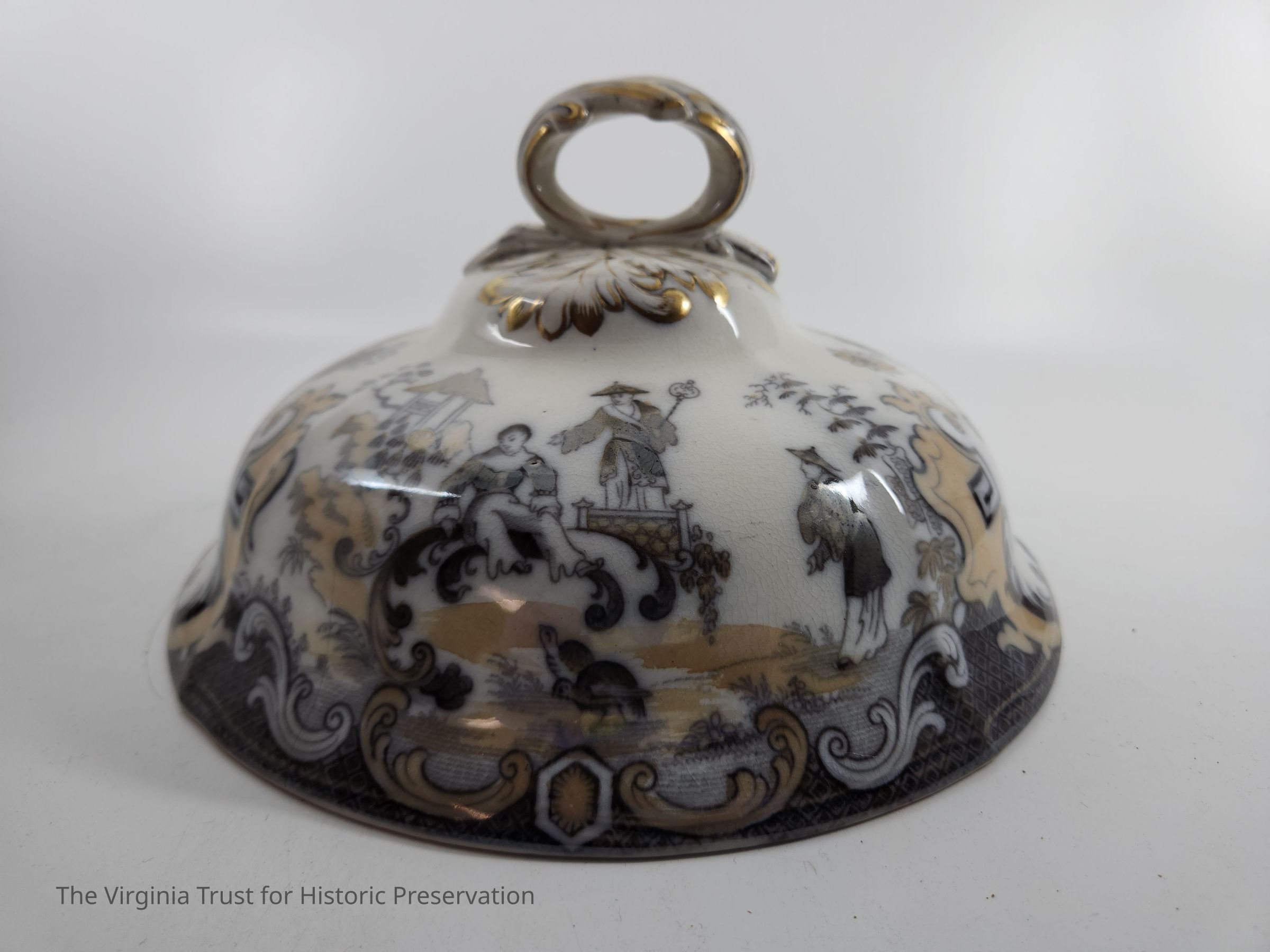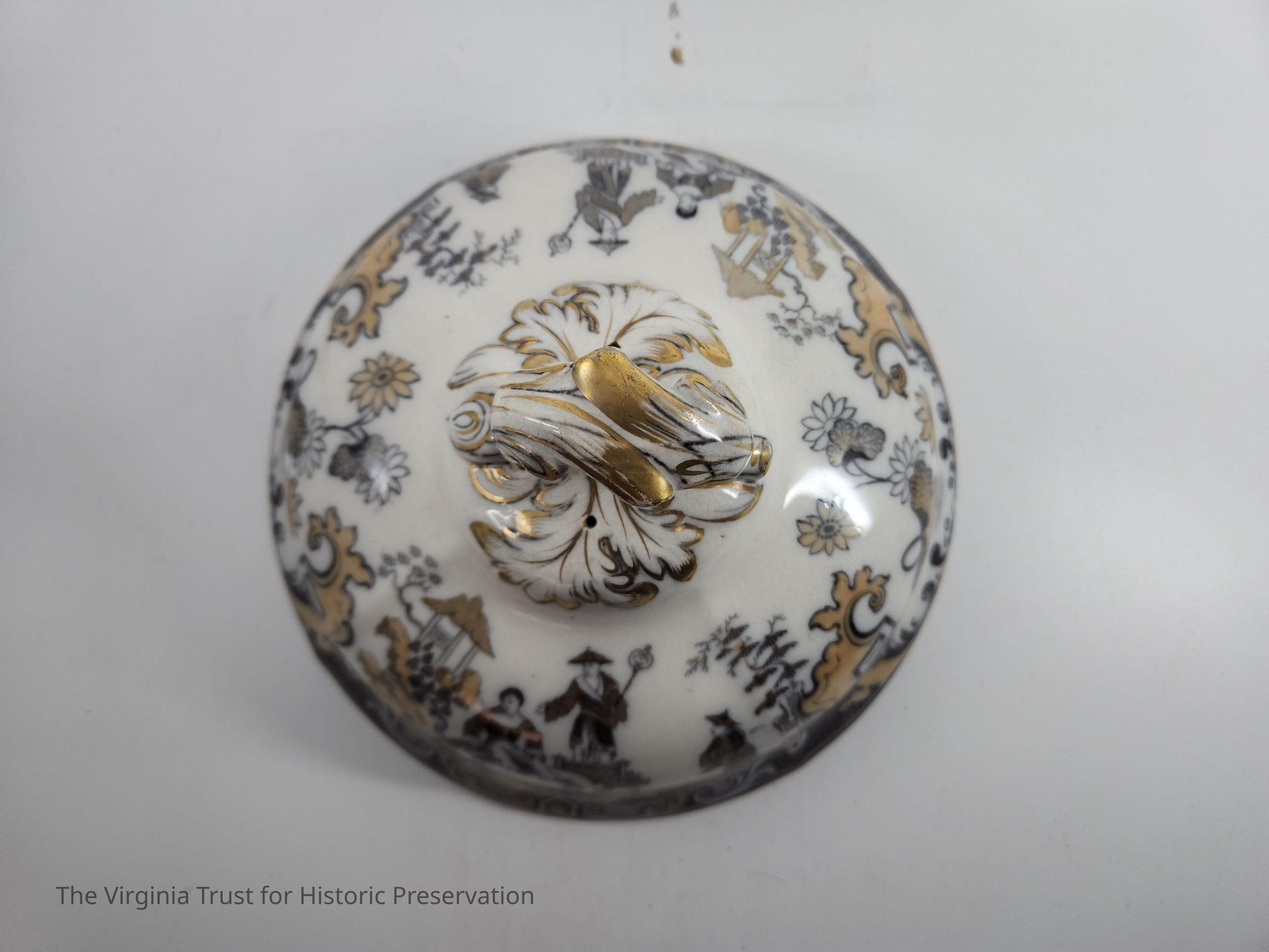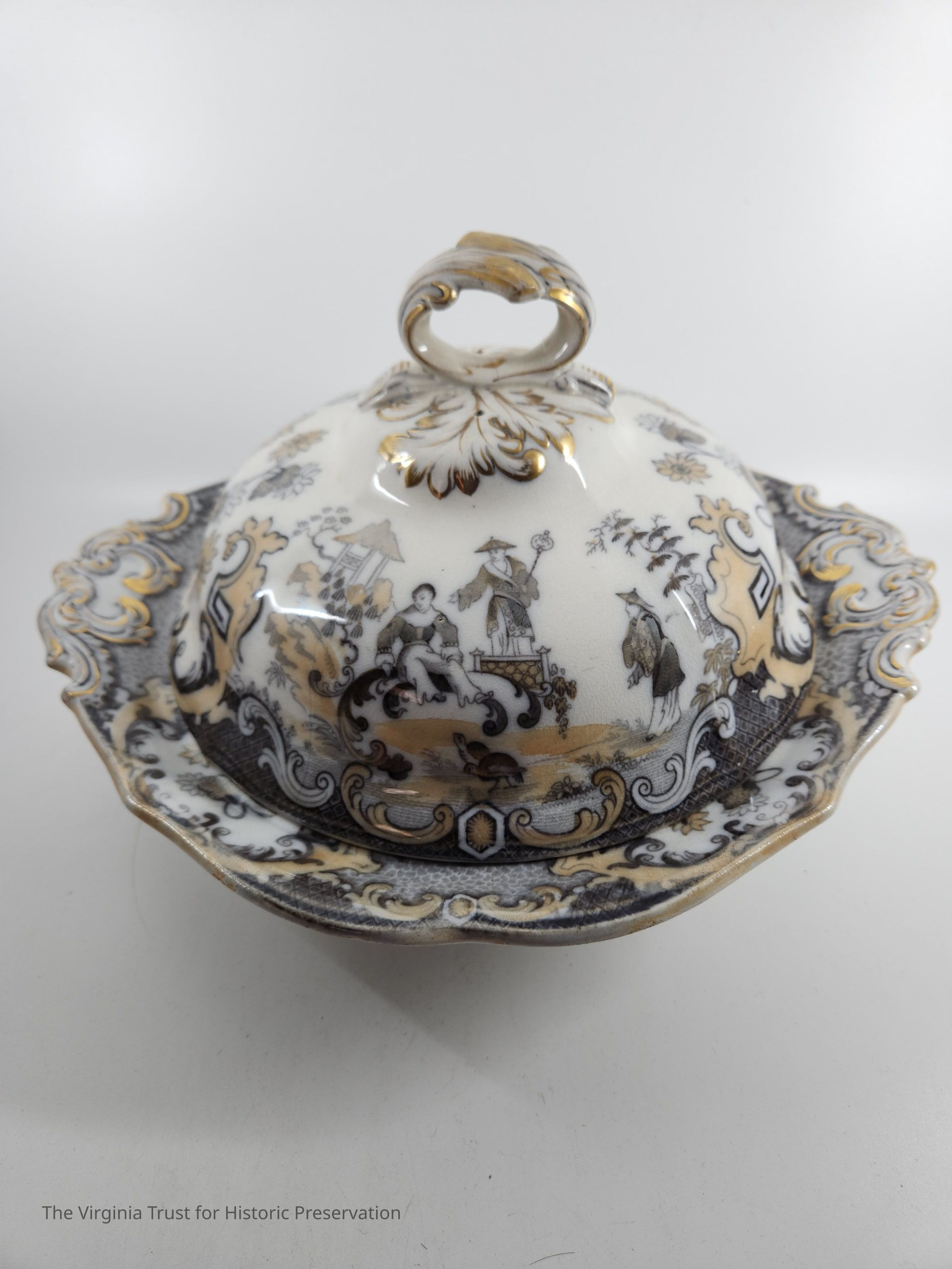 One of a pair of shaped oval vegetable dishes with circular lids decorated with gilding. Part of a dinner service in "Mandarin" pattern. Brown lustre and grey with a central circular reserve of a Chinese scene, the border decorated with scrolls, pseudo-Chinese motifs and flowers. English.Dimensions