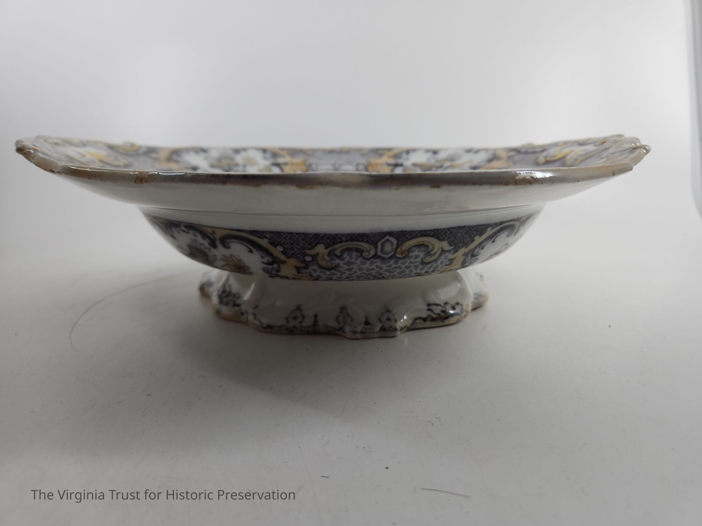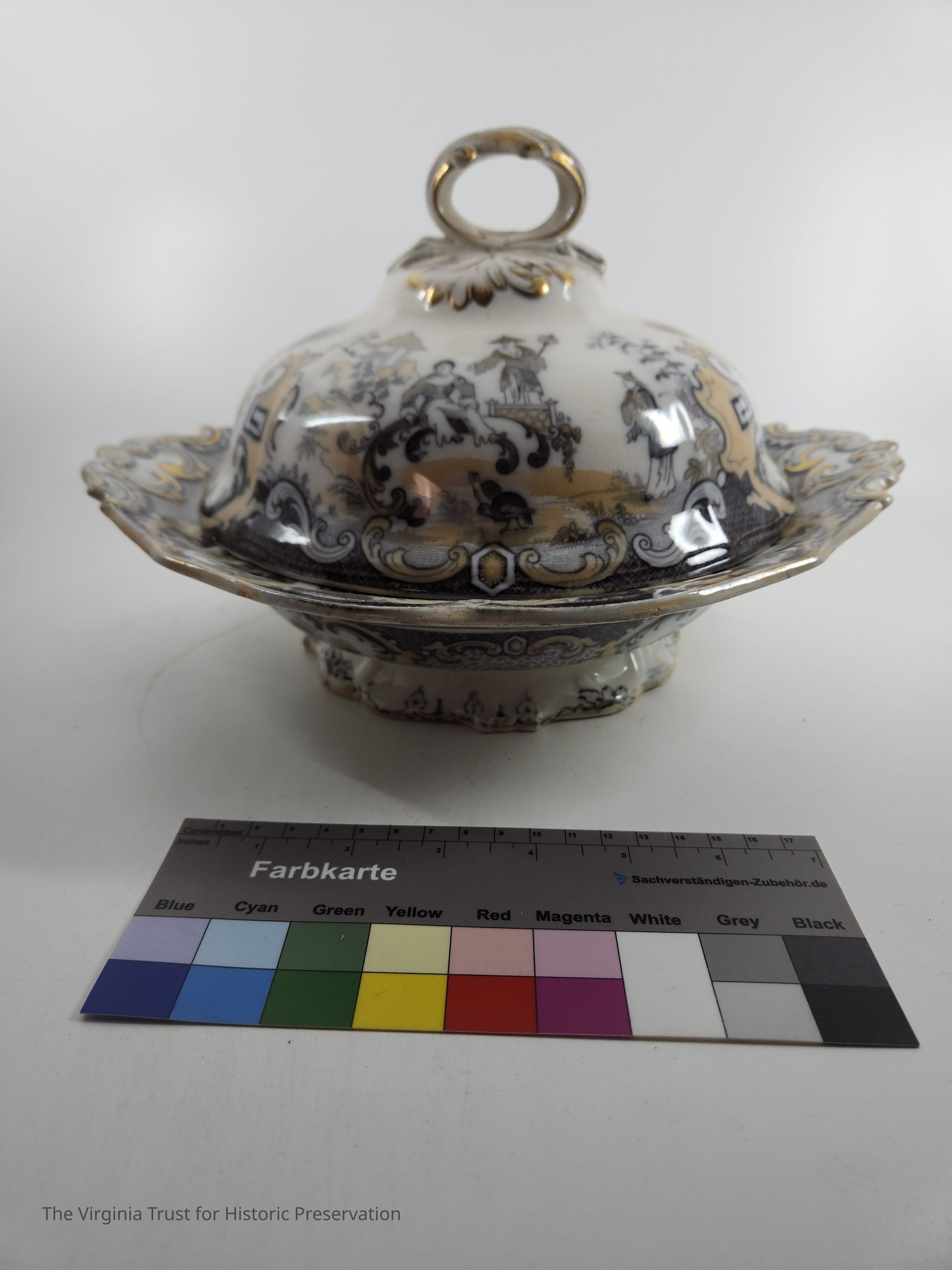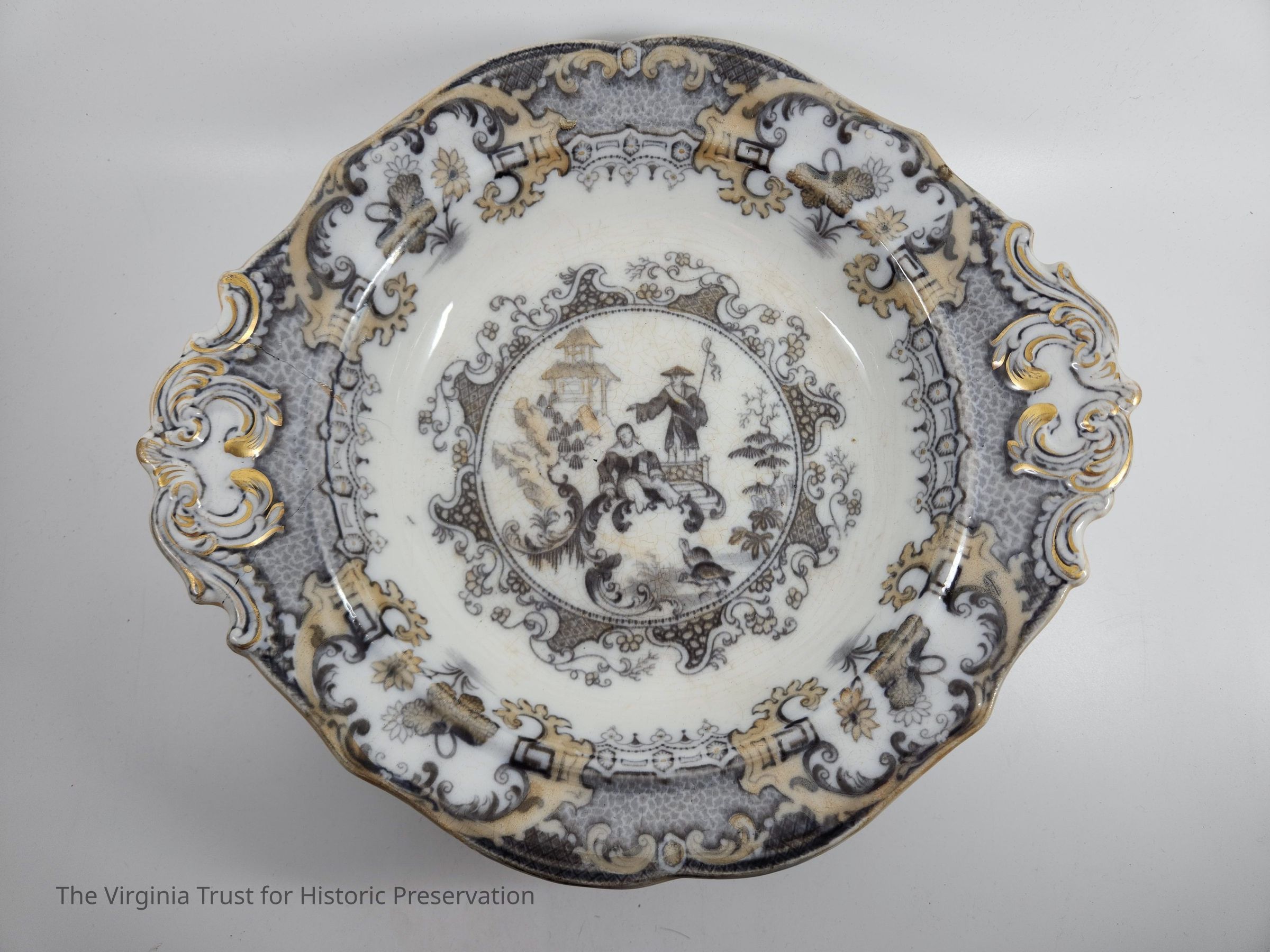 One of a pair of shaped oval vegetable dishes with circular lids decorated with gilding. Part of a dinner service in "Mandarin" pattern. Brown lustre and grey with a central circular reserve of a Chinese scene, the border decorated with scrolls, pseudo-Chinese motifs and flowers. English.Dimensions