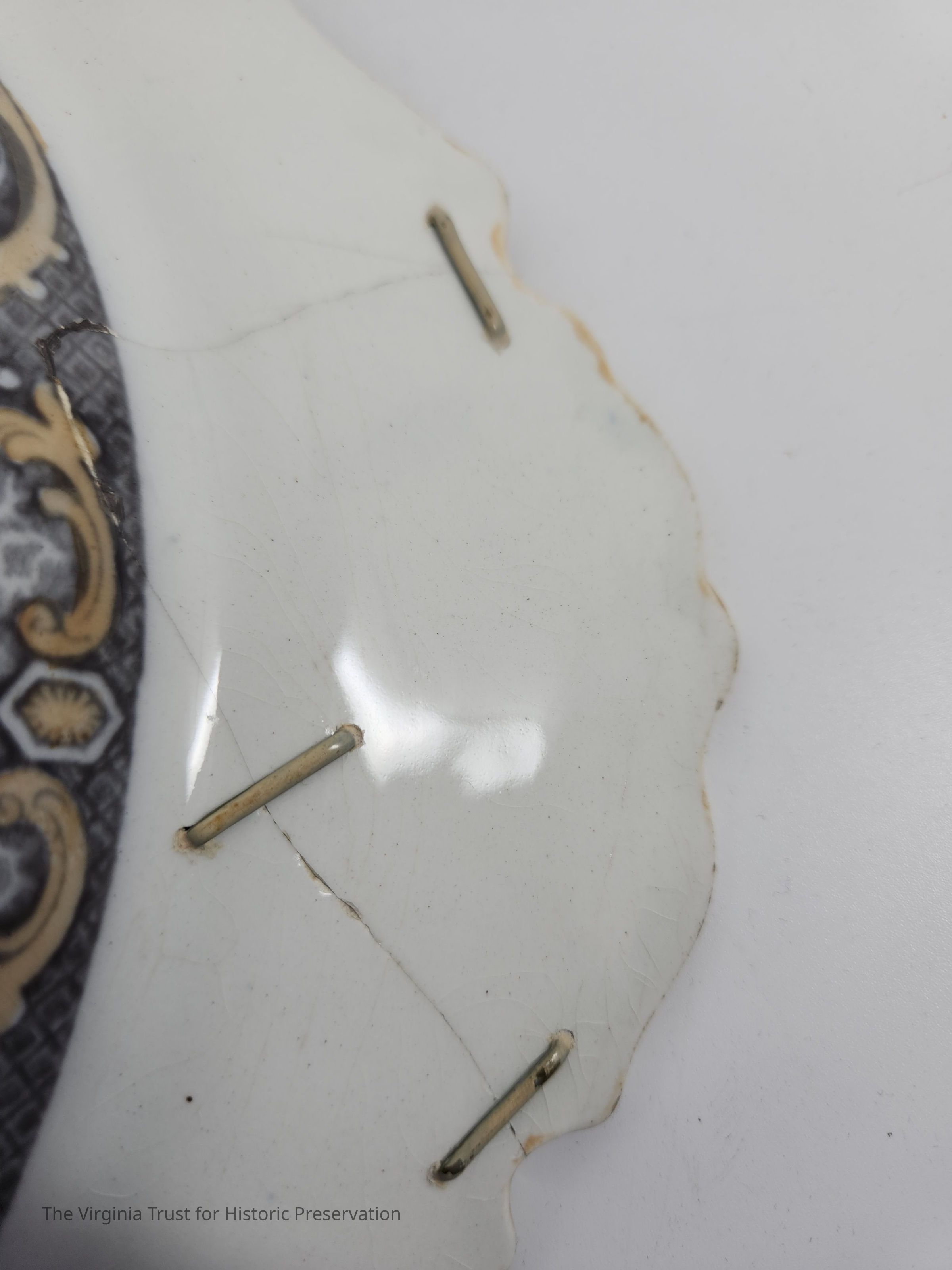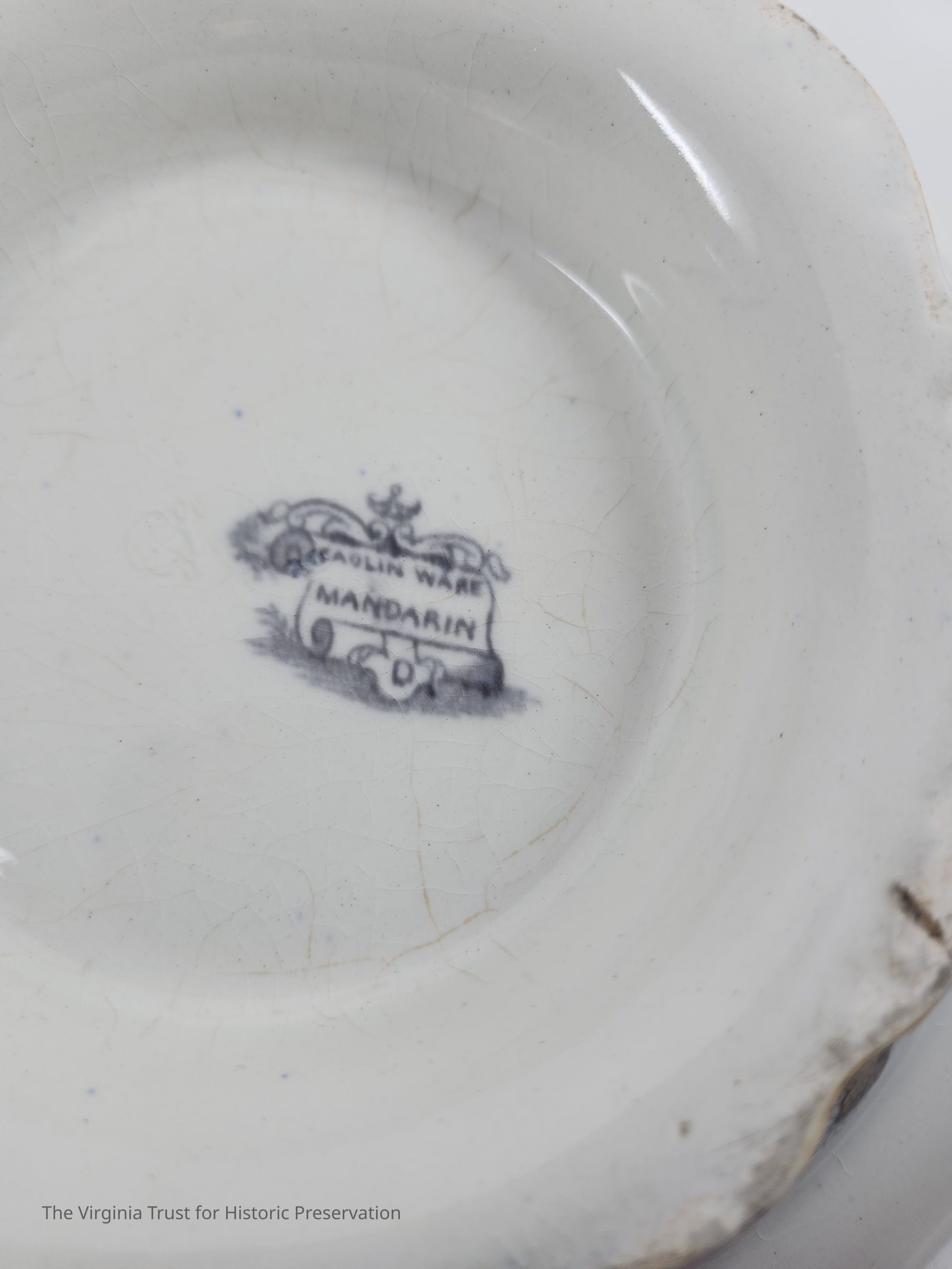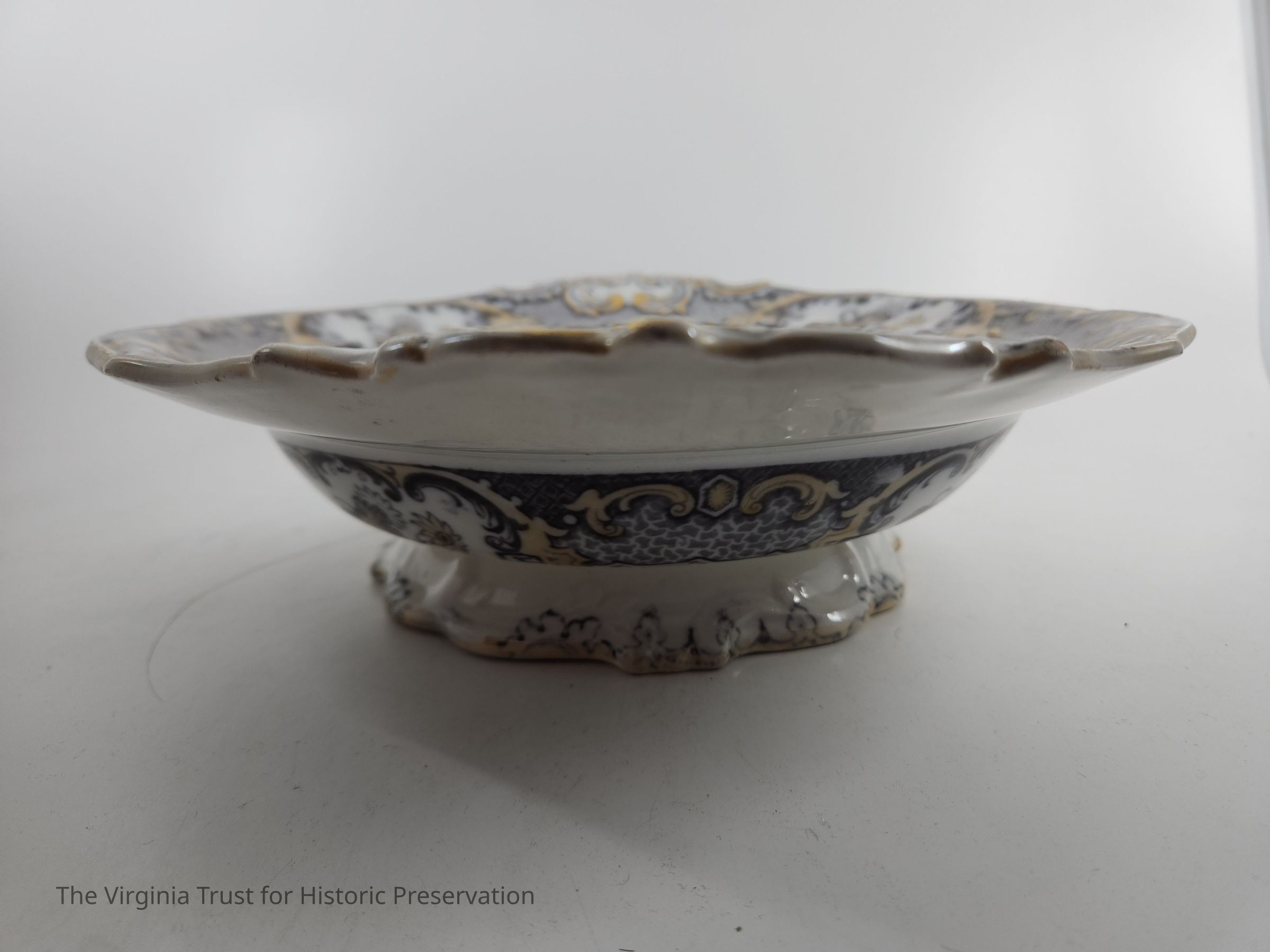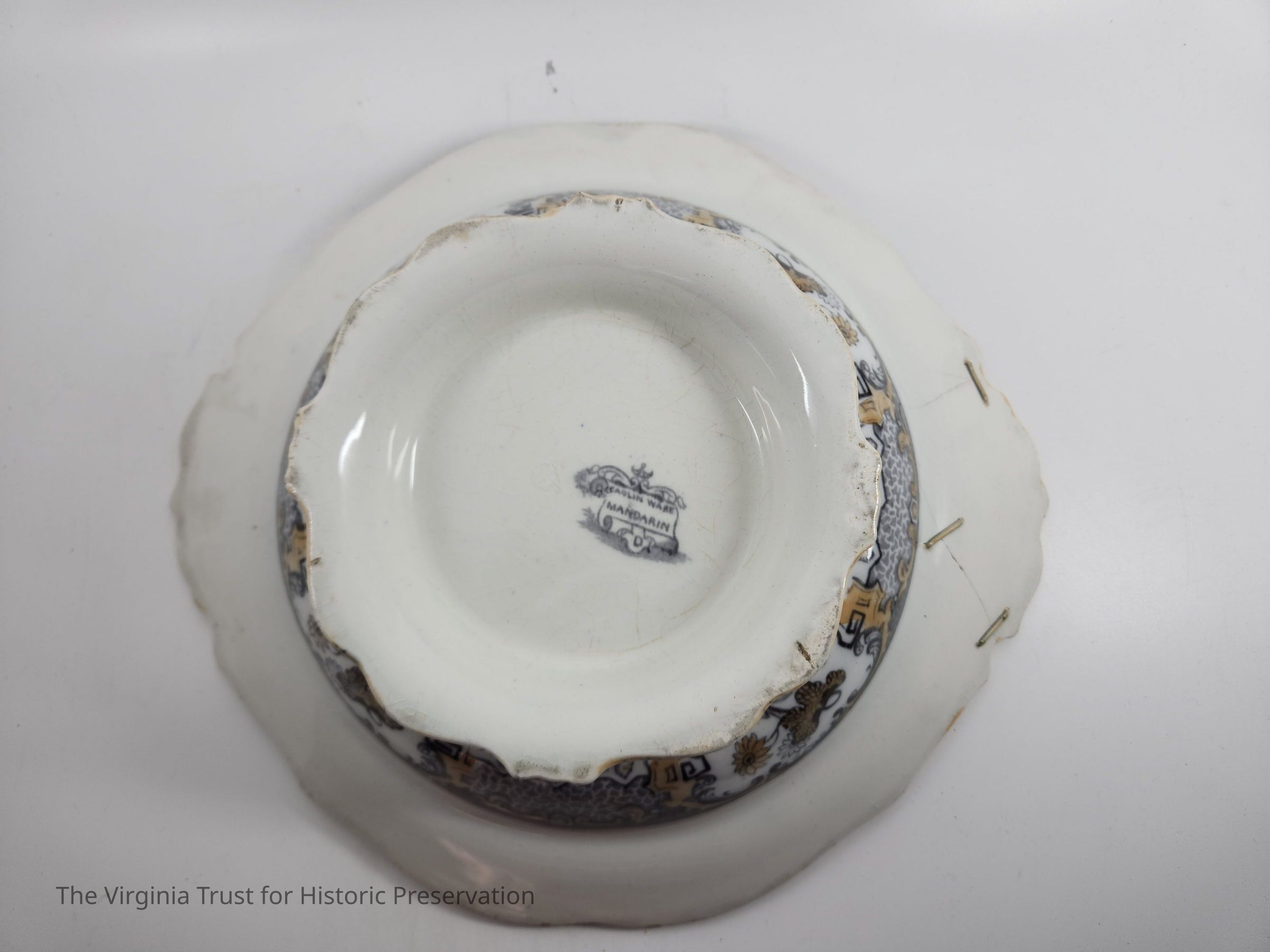 One of a pair of shaped oval vegetable dishes with circular lids decorated with gilding. Part of a dinner service in "Mandarin" pattern. Brown lustre and grey with a central circular reserve of a Chinese scene, the border decorated with scrolls, pseudo-Chinese motifs and flowers. English.Dimensions