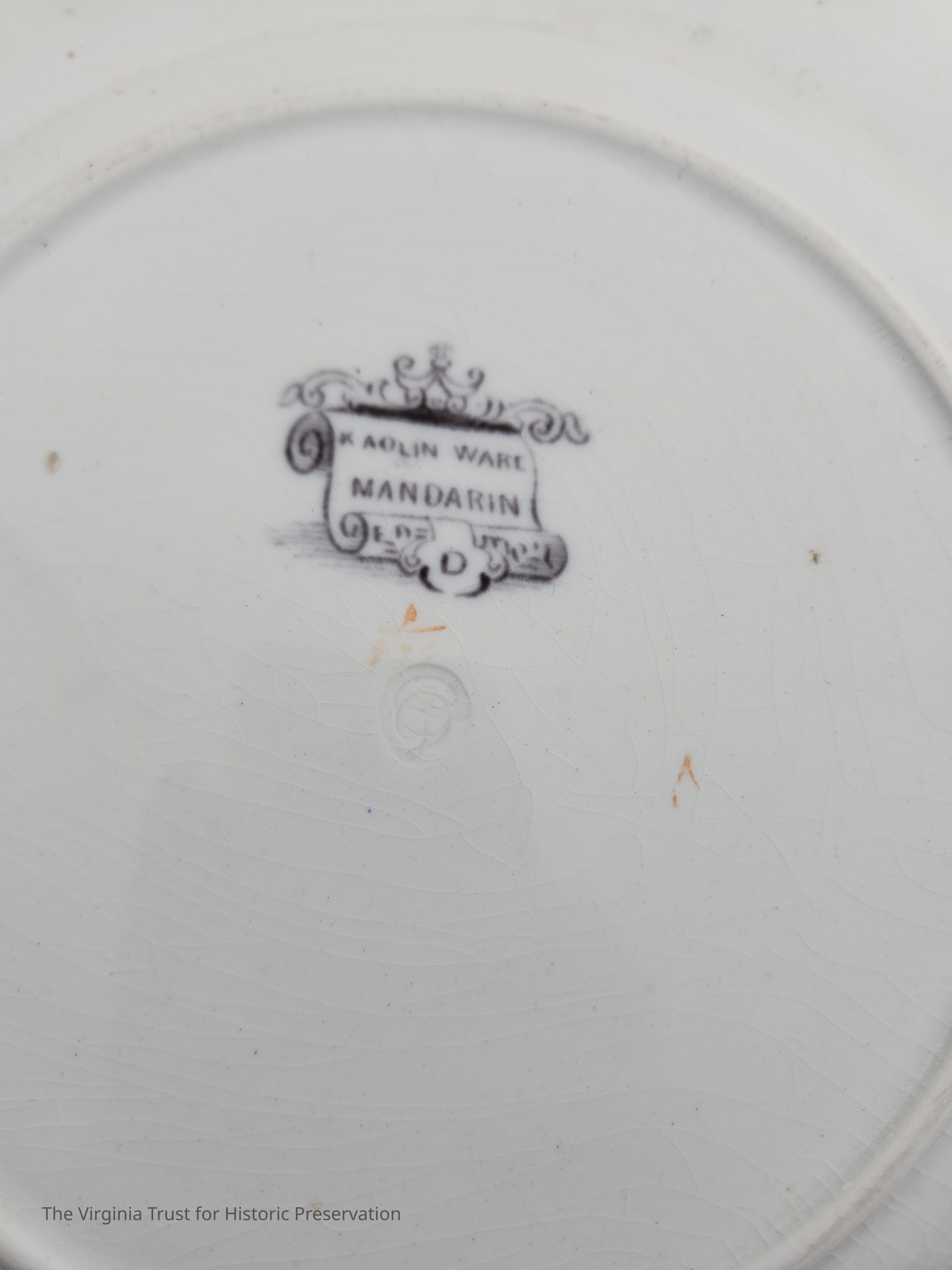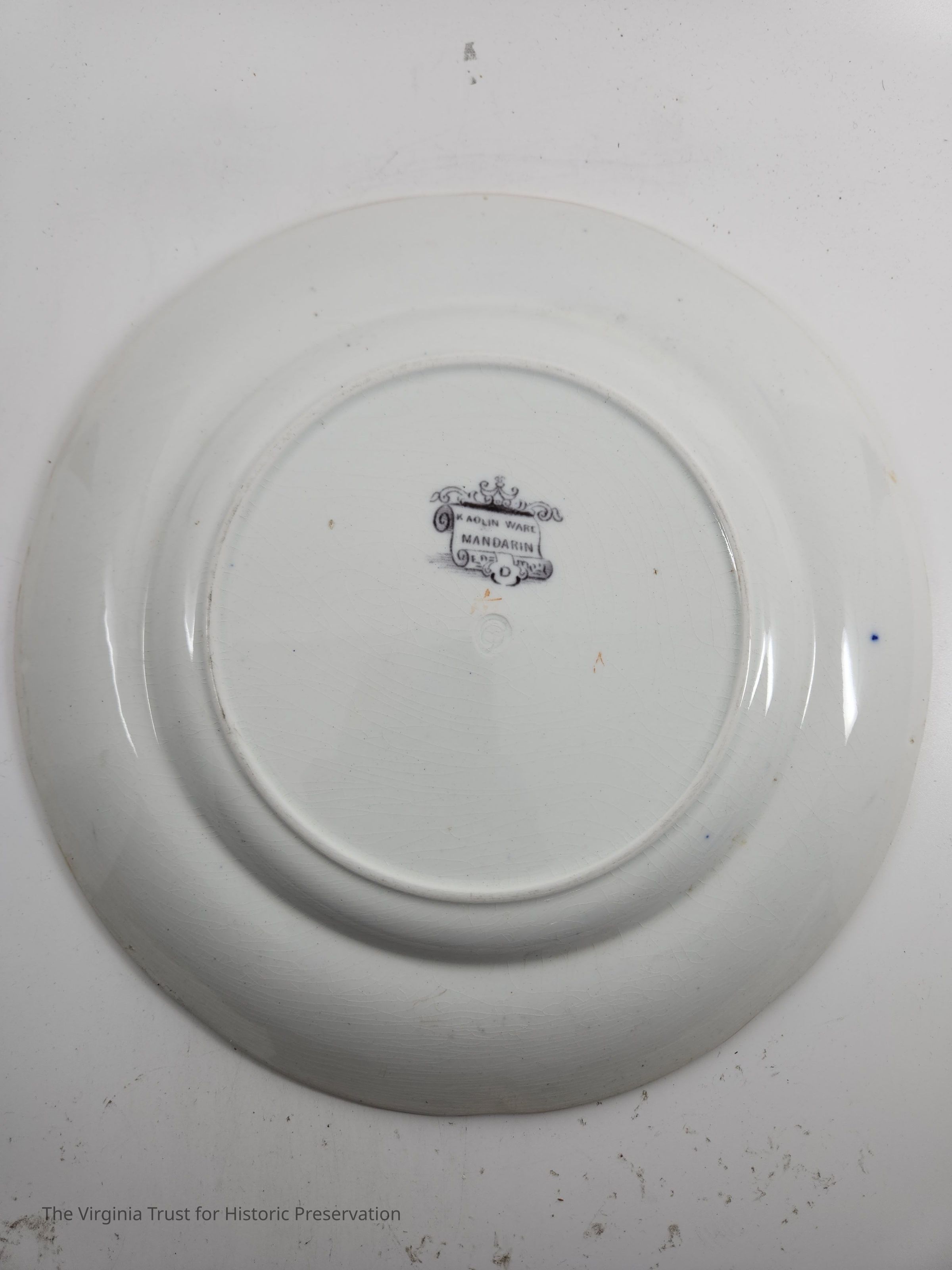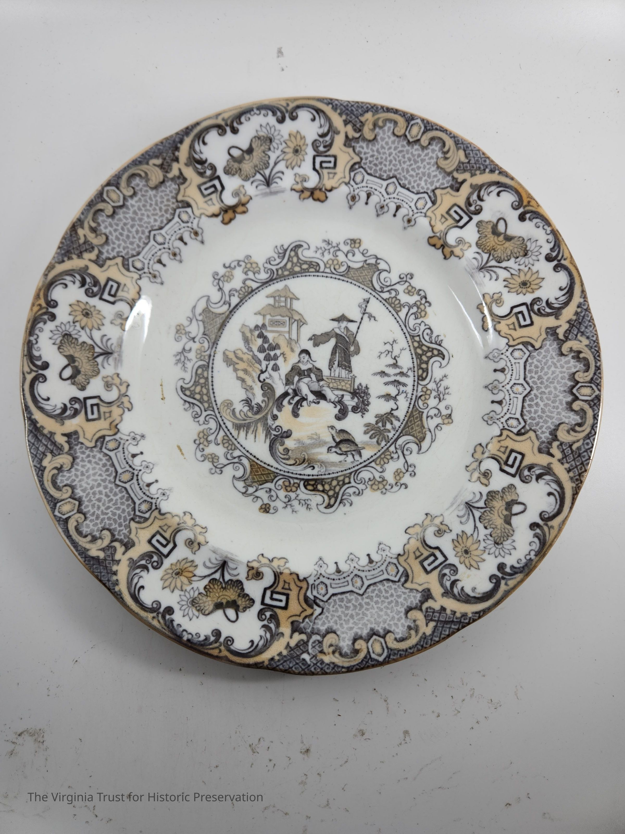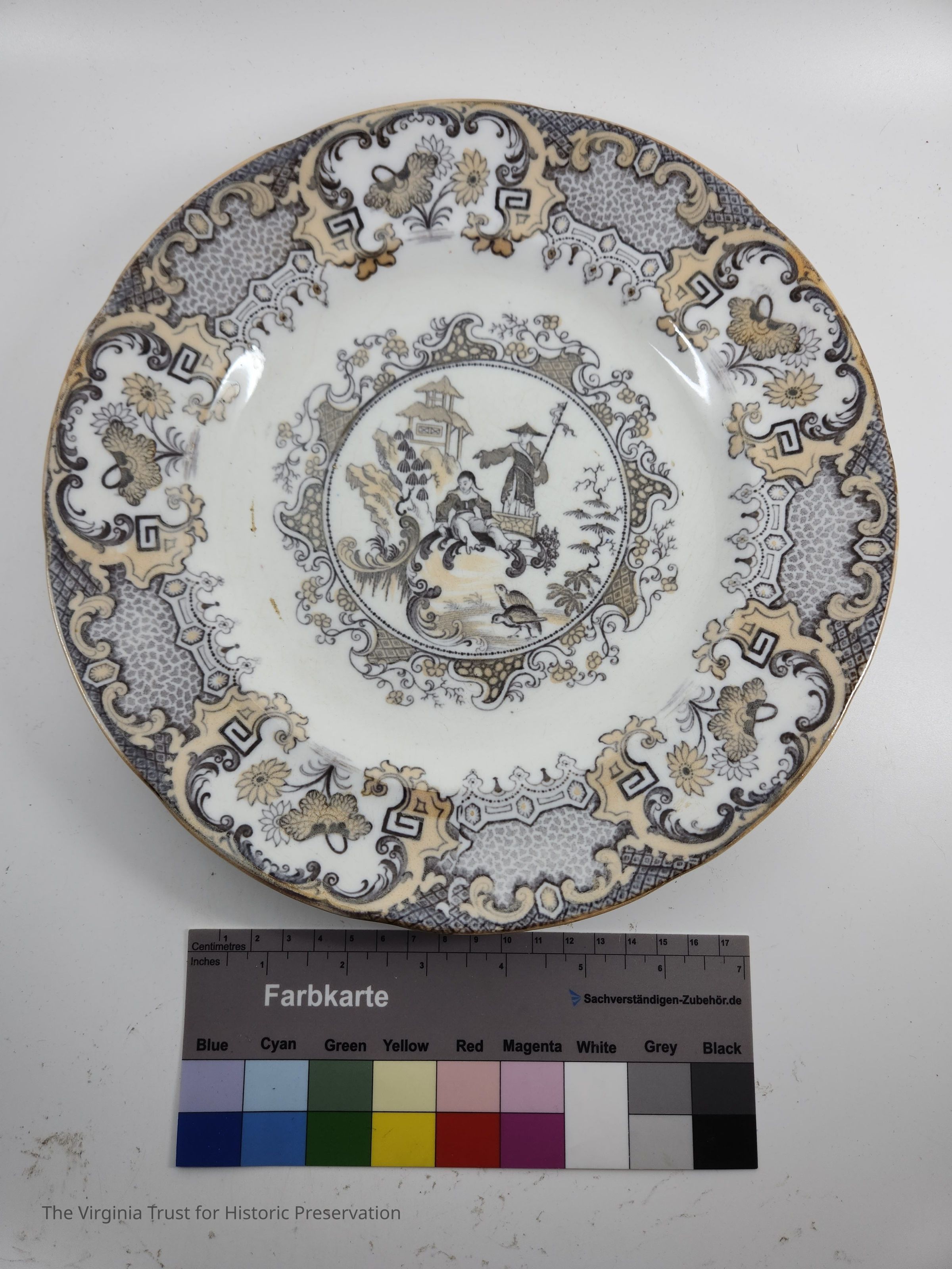 One of 12 dinner plates. Part of a dinner service in "Mandarin" pattern. Brown lustre and grey with a central circular reserve of a Chinese scene, the border decorated with scrolls, pseudo-Chinese motifs and flowers. English.Dimensions