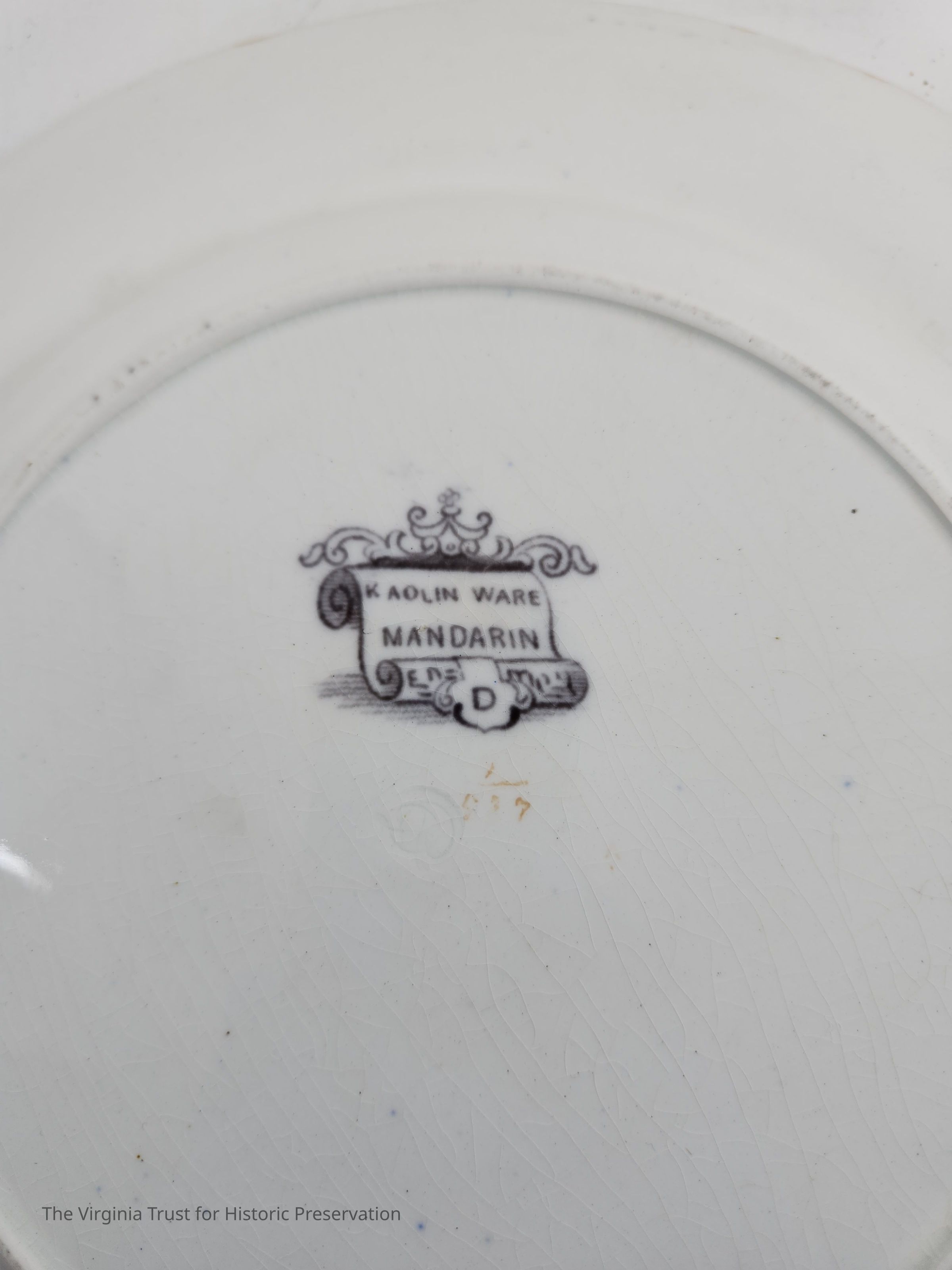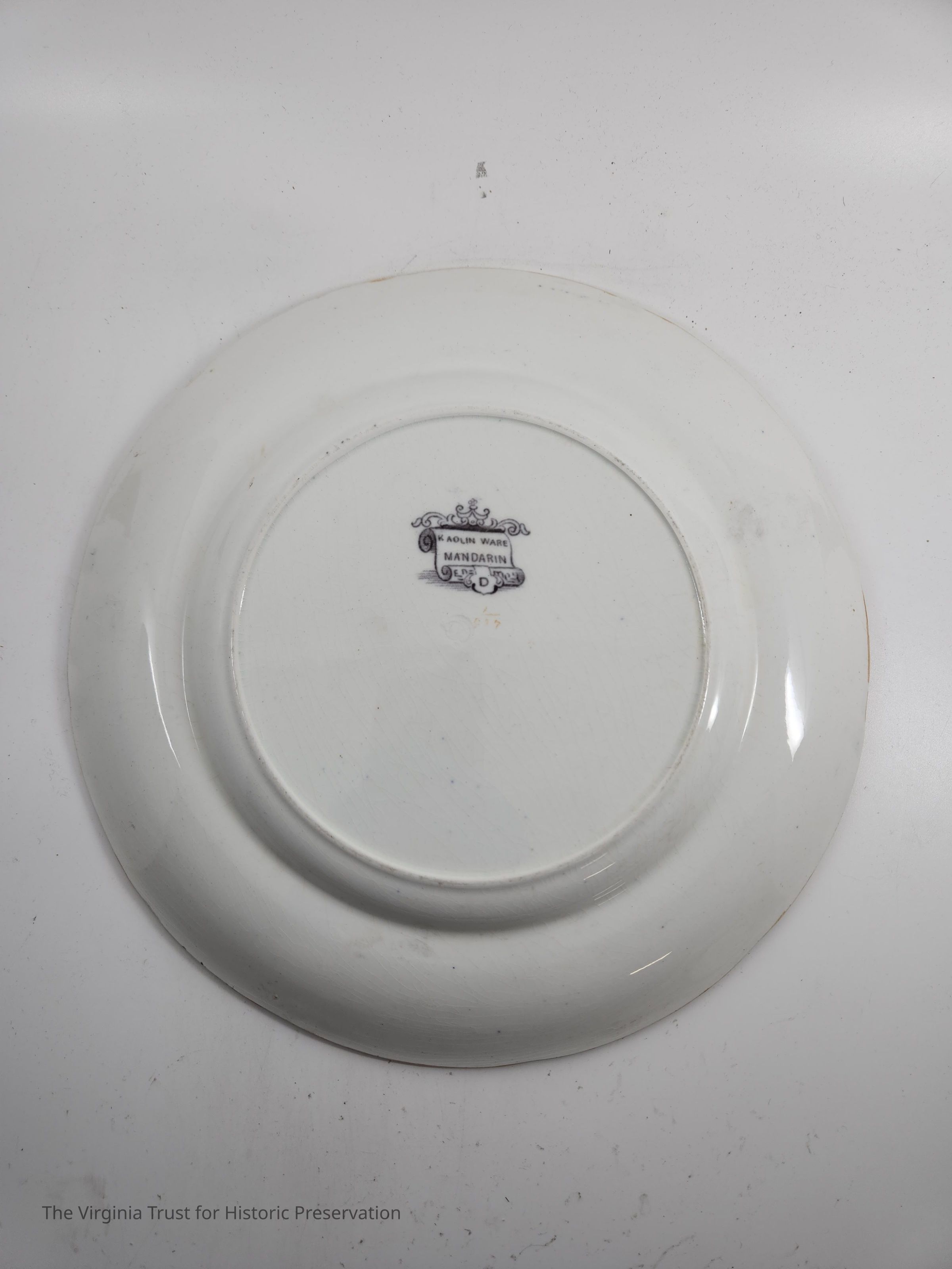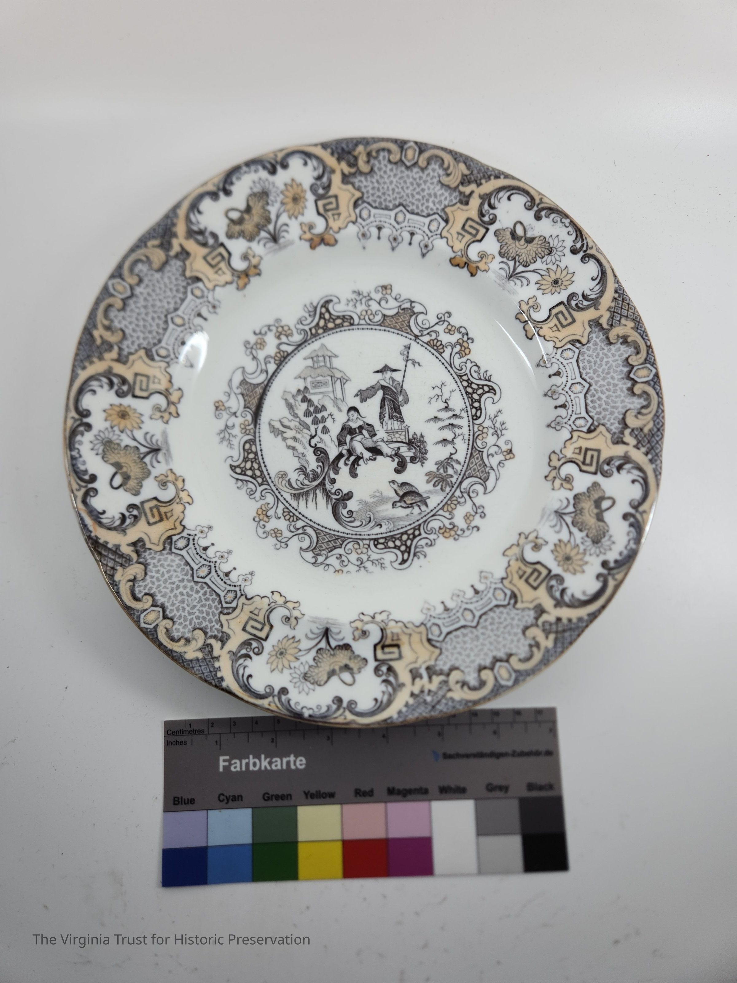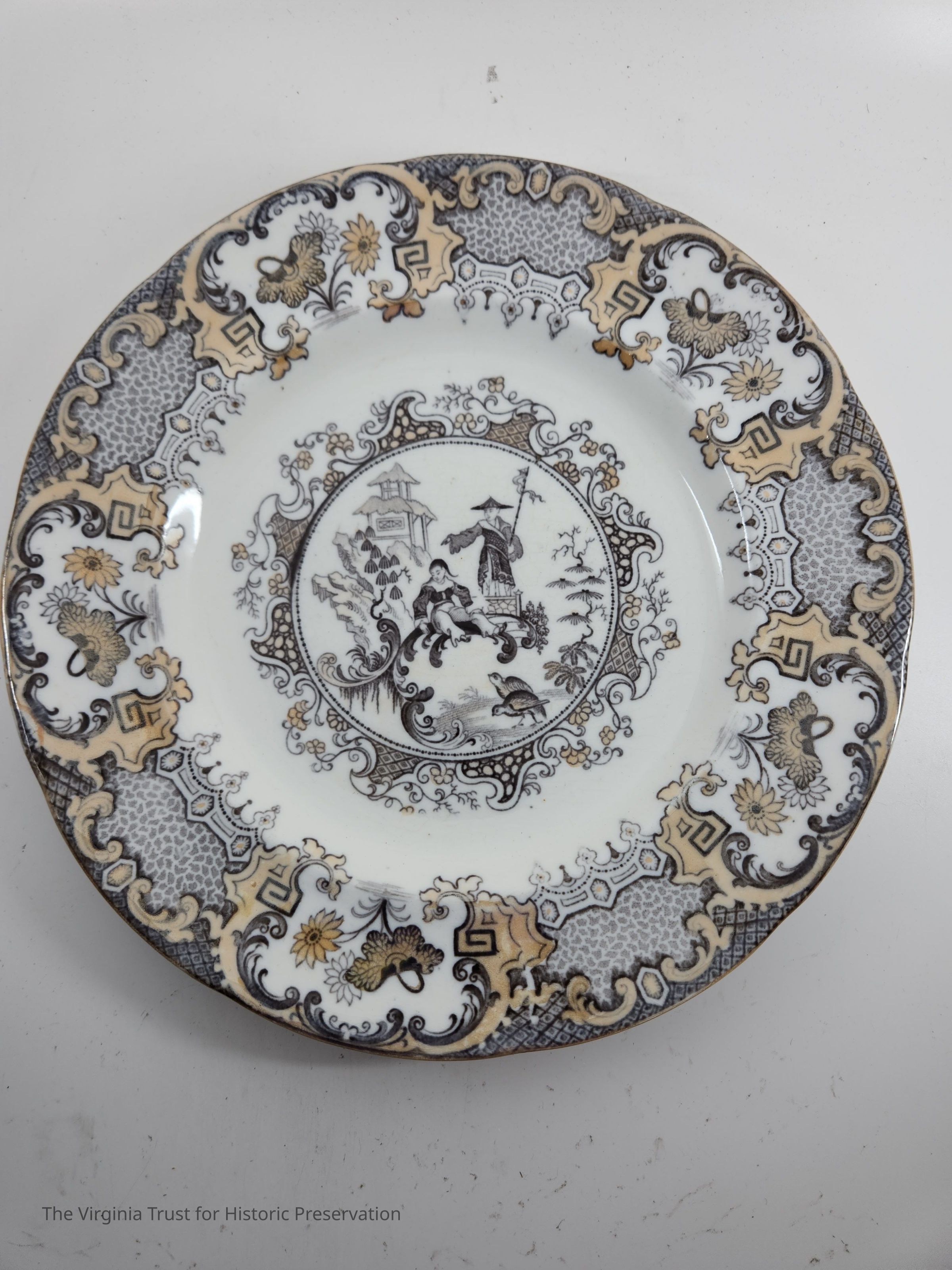 One of 12 dinner plates. Part of a dinner service in "Mandarin" pattern. Brown lustre and grey with a central circular reserve of a Chinese scene, the border decorated with scrolls, pseudo-Chinese motifs and flowers. English.Dimensions