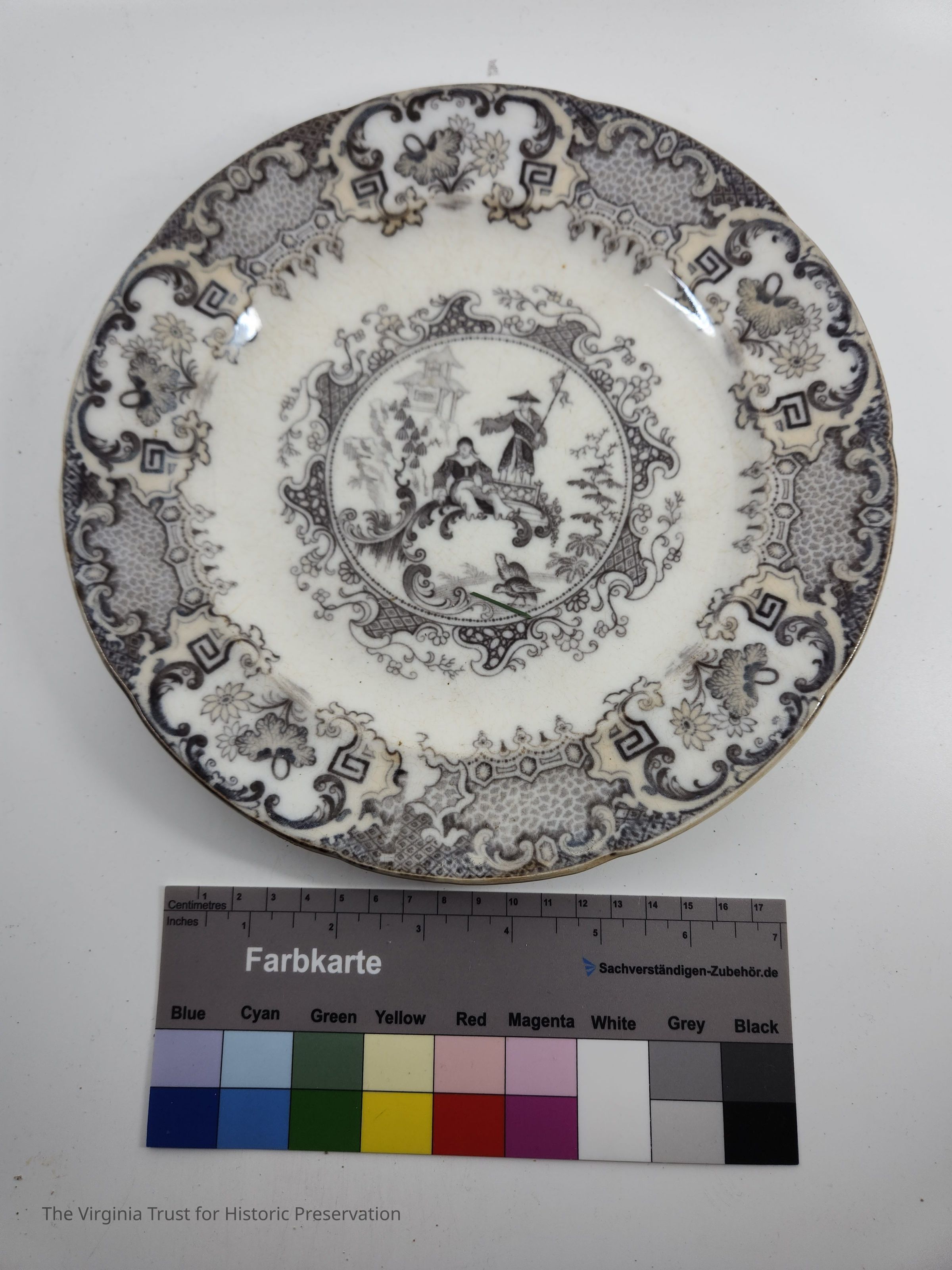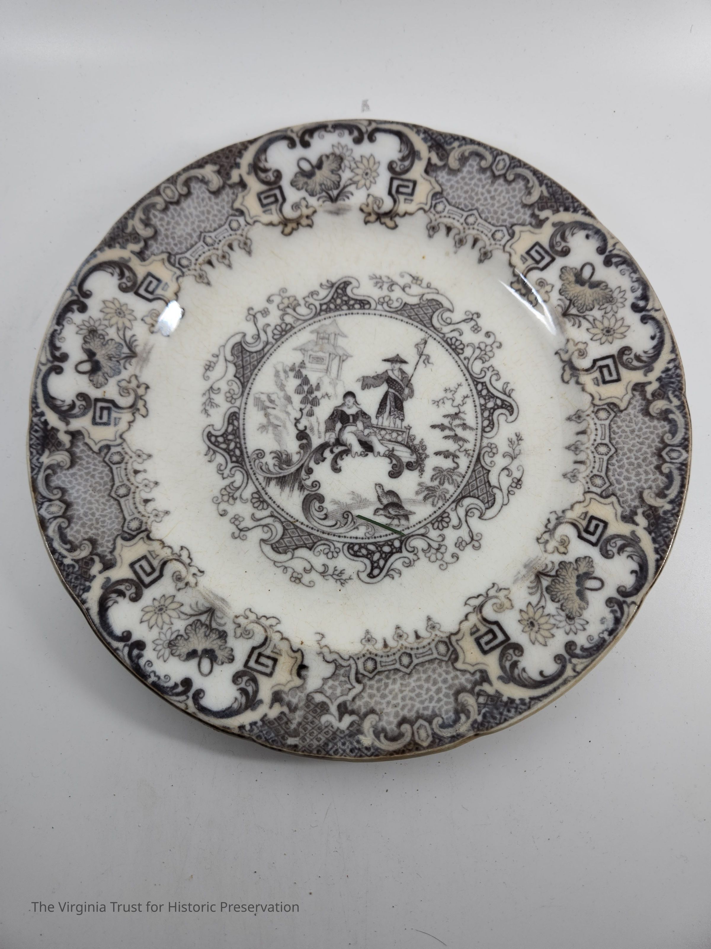 One of 14 luncheon plates. Part of a dinner service in "Mandarin" pattern. Brown lustre and grey with a central circular reserve of a Chinese scene, the border decorated with scrolls, pseudo-Chinese motifs and flowers. English.Dimensions