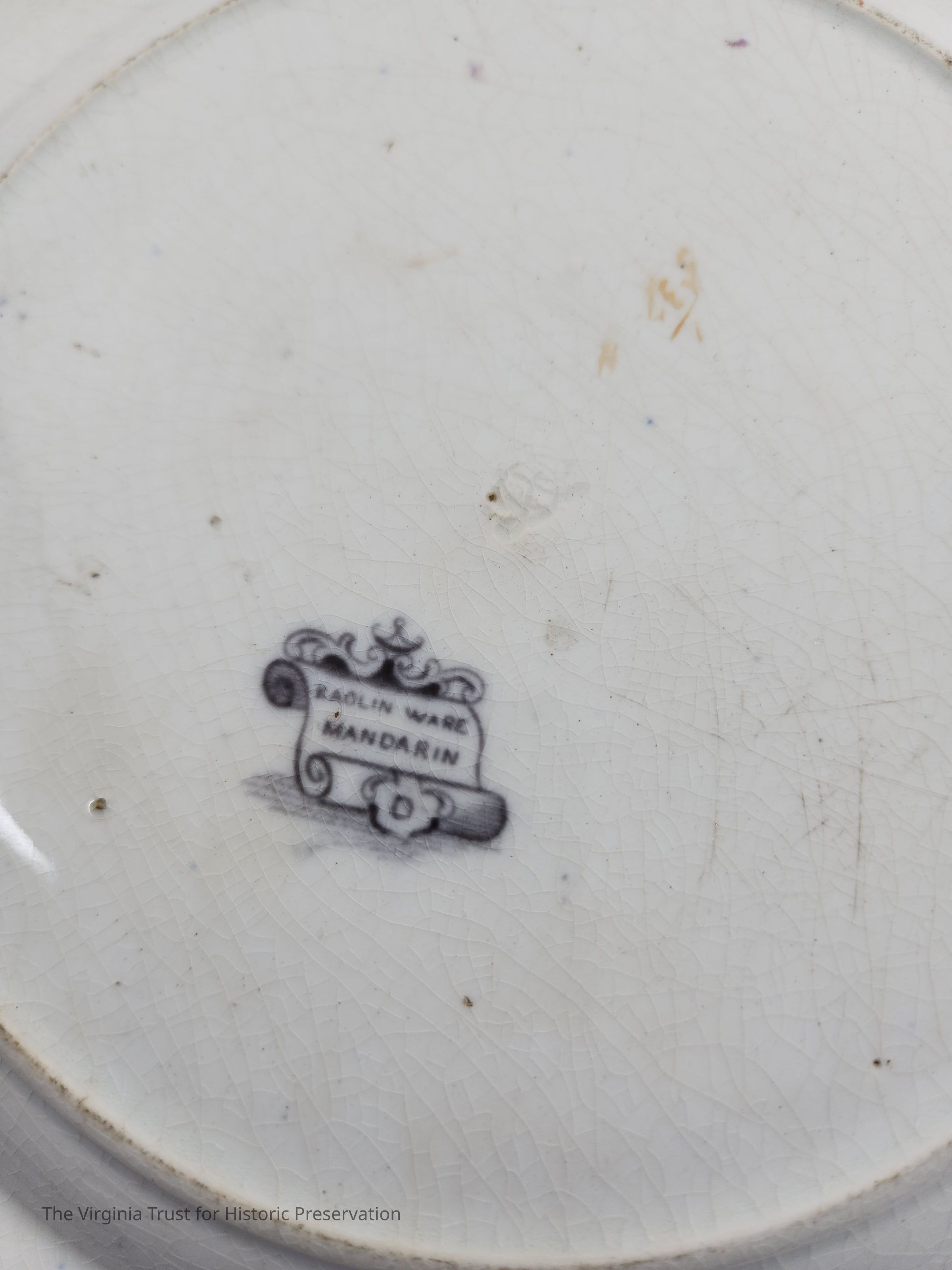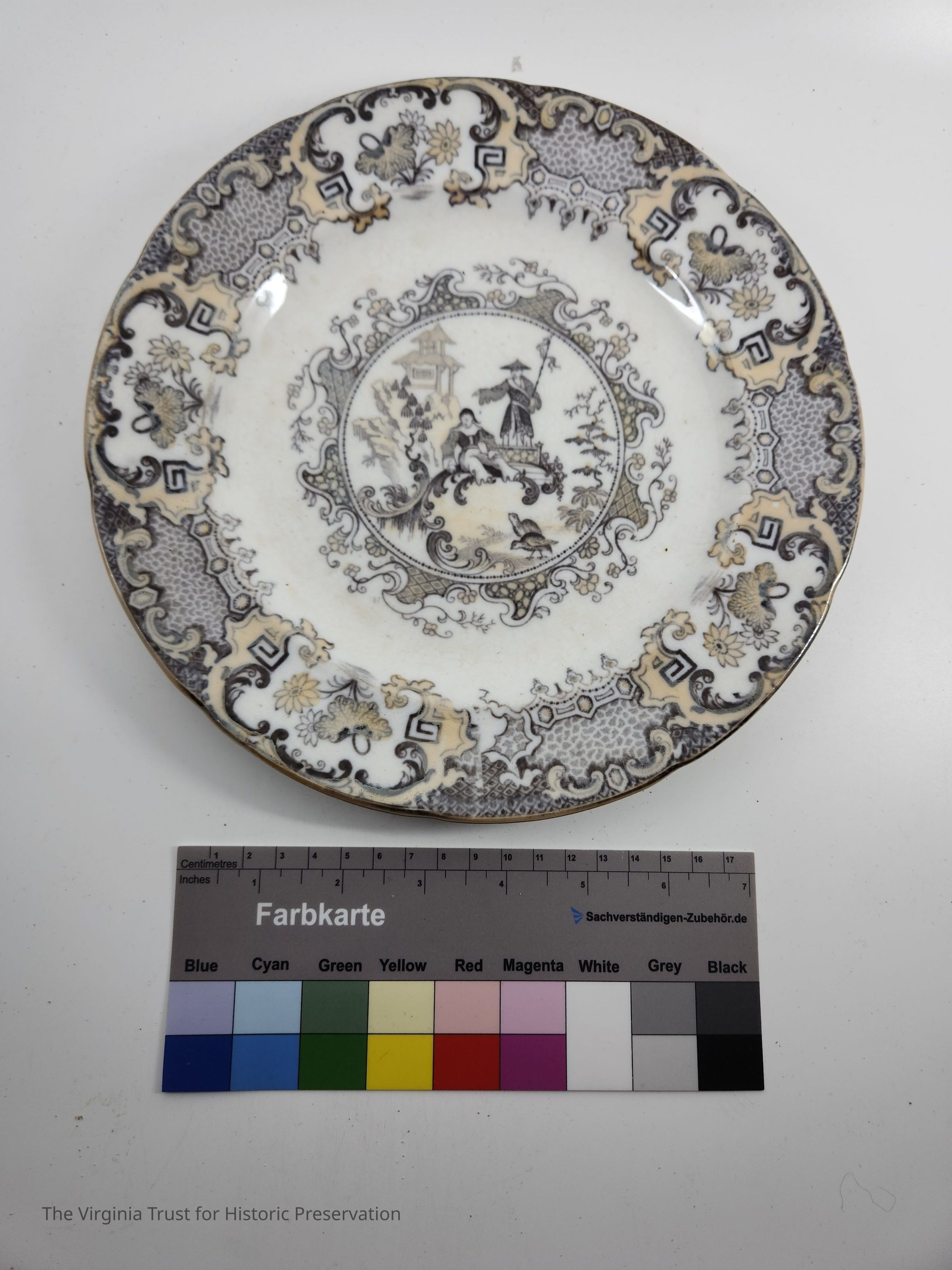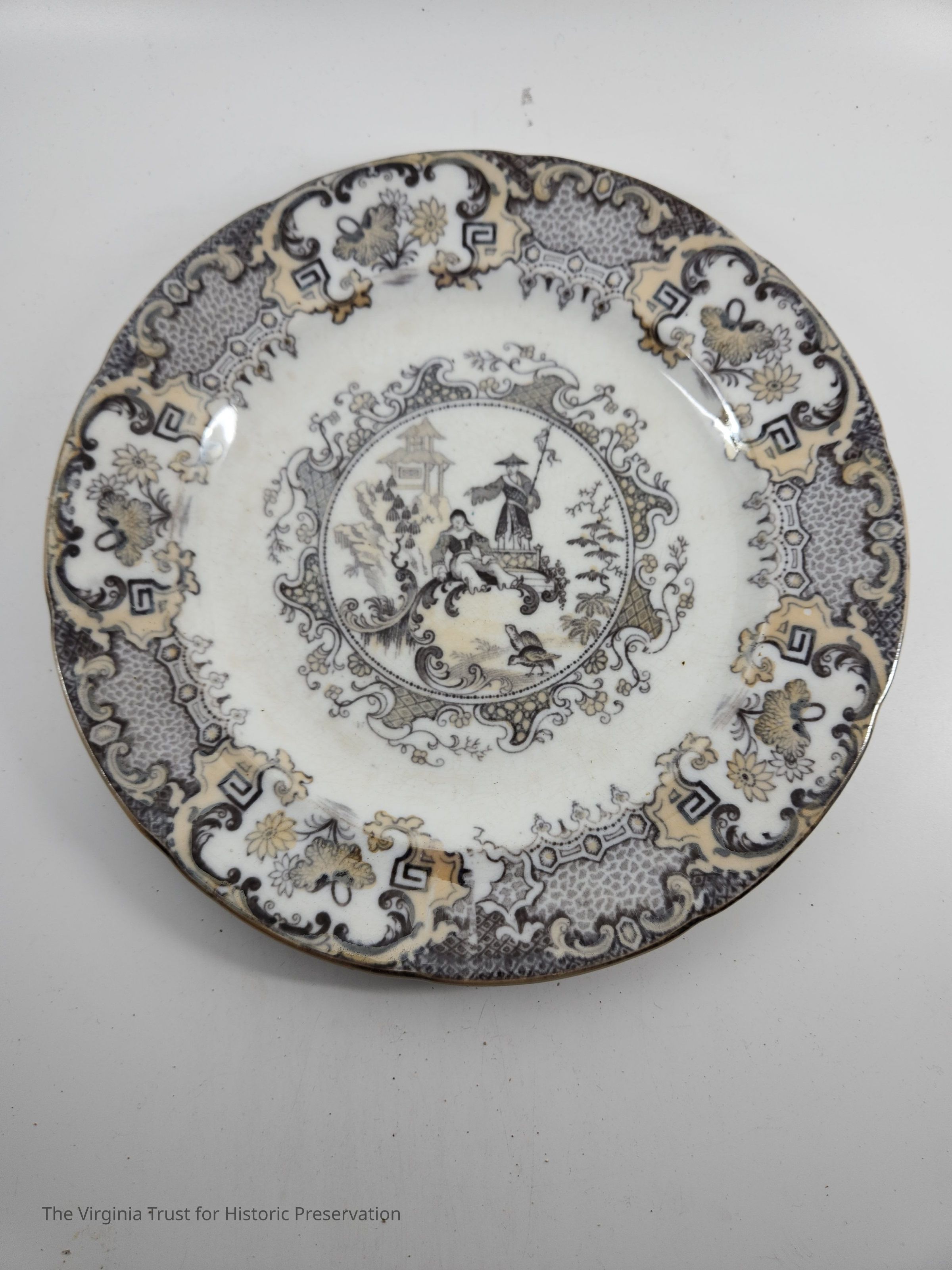 One of 14 luncheon plates. Part of a dinner service in "Mandarin" pattern. Brown lustre and grey with a central circular reserve of a Chinese scene, the border decorated with scrolls, pseudo-Chinese motifs and flowers. English.Dimensions