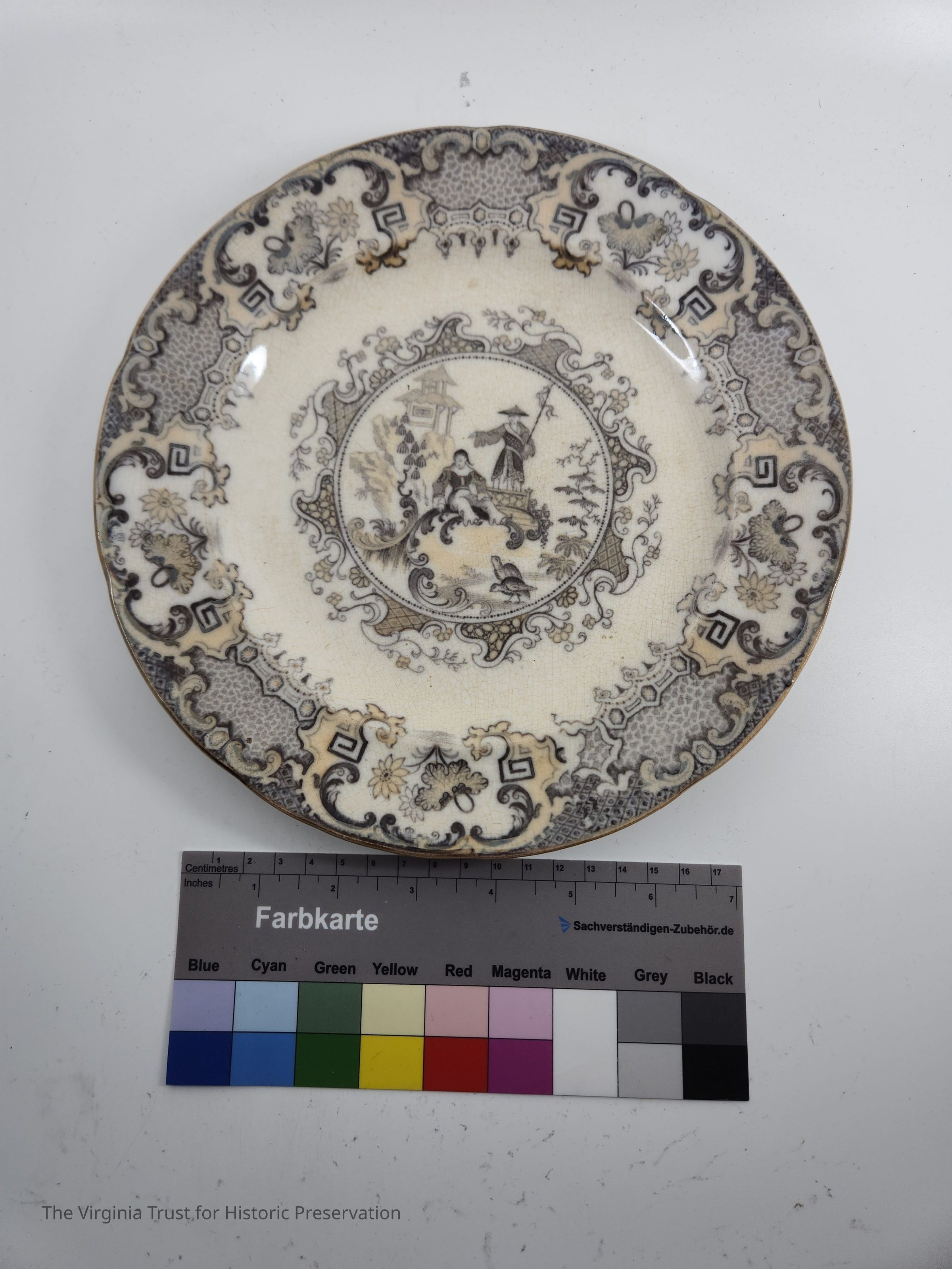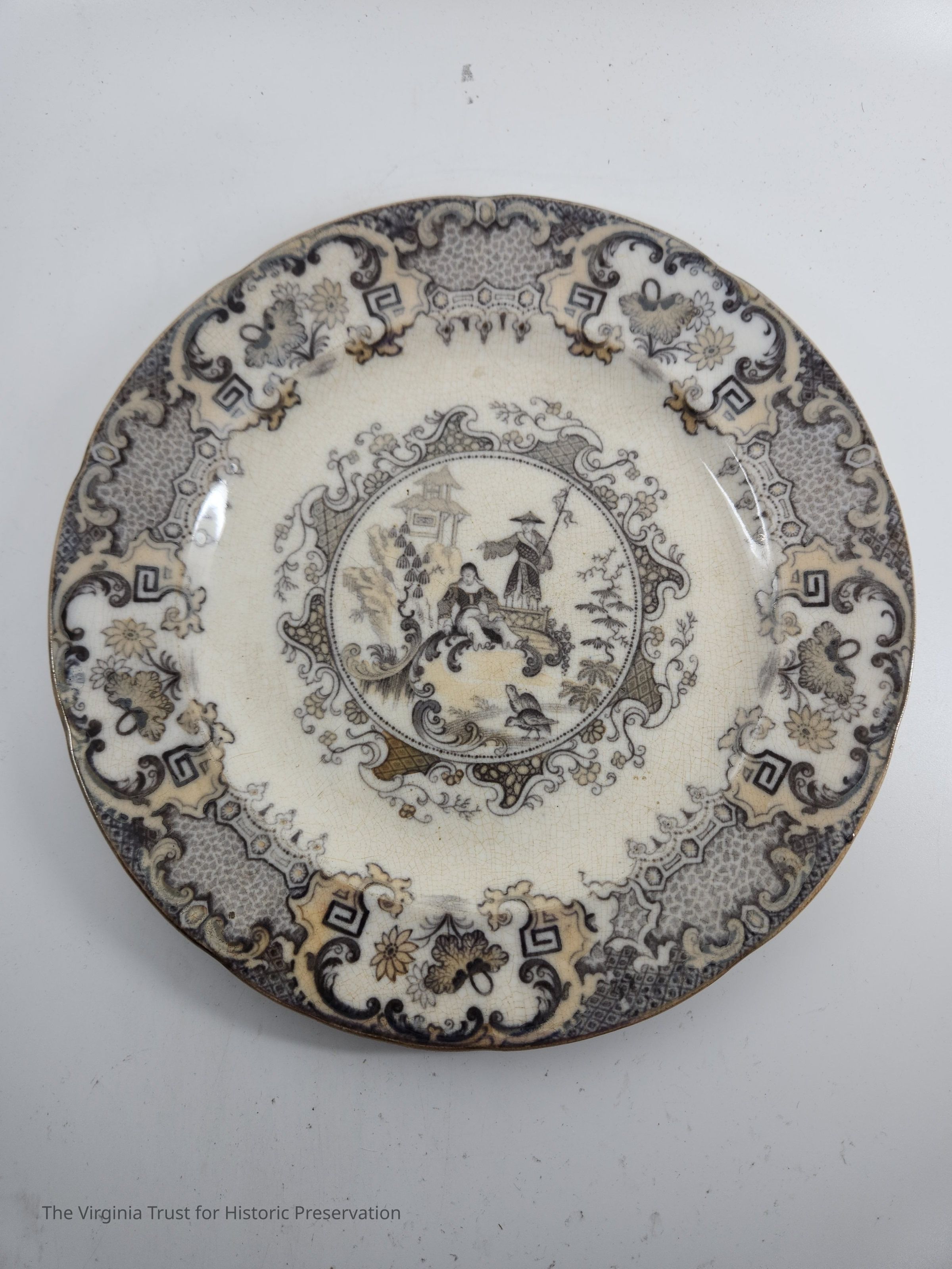 One of 14 luncheon plates. Part of a dinner service in "Mandarin" pattern. Brown lustre and grey with a central circular reserve of a Chinese scene, the border decorated with scrolls, pseudo-Chinese motifs and flowers. English.Dimensions