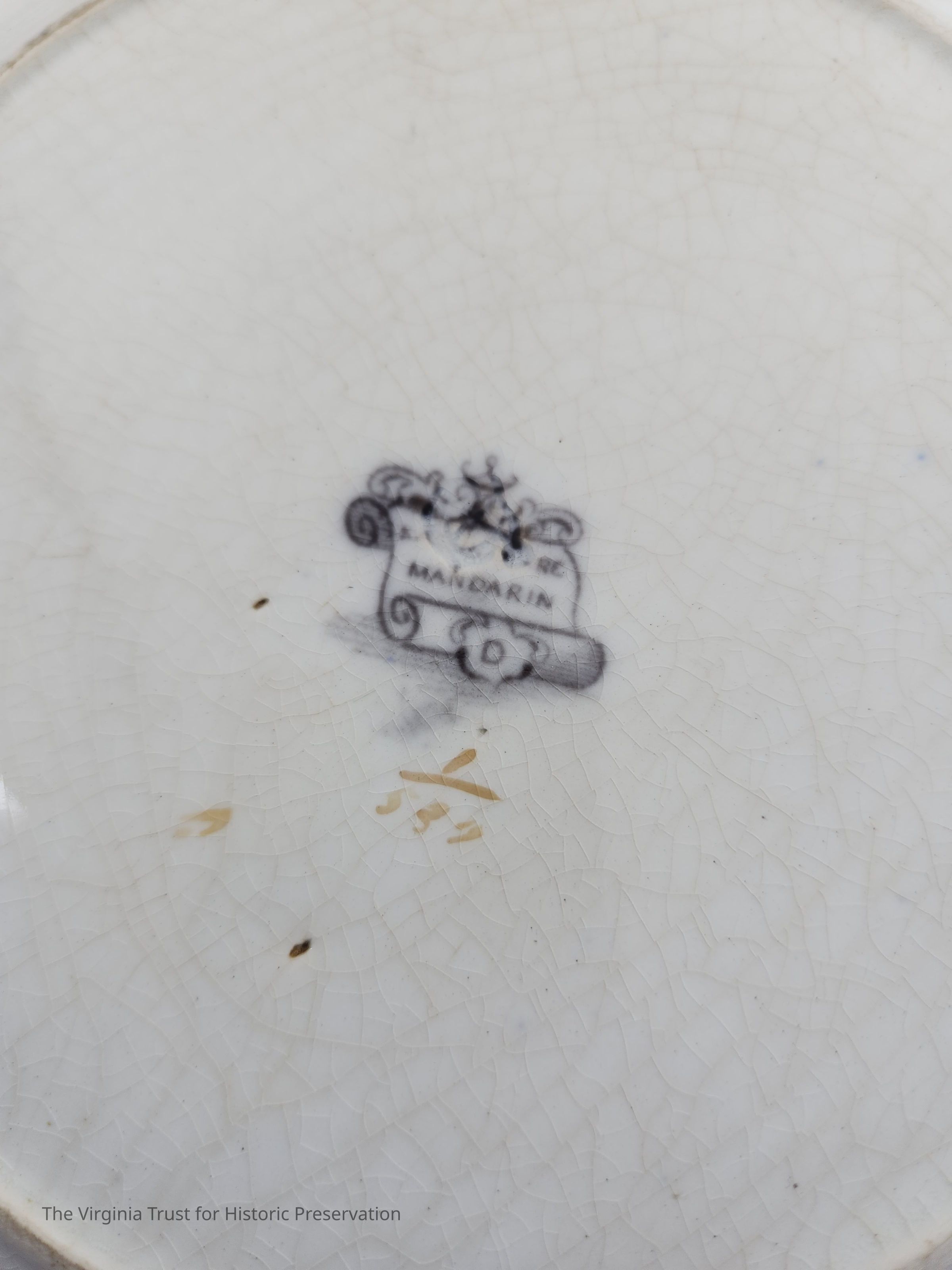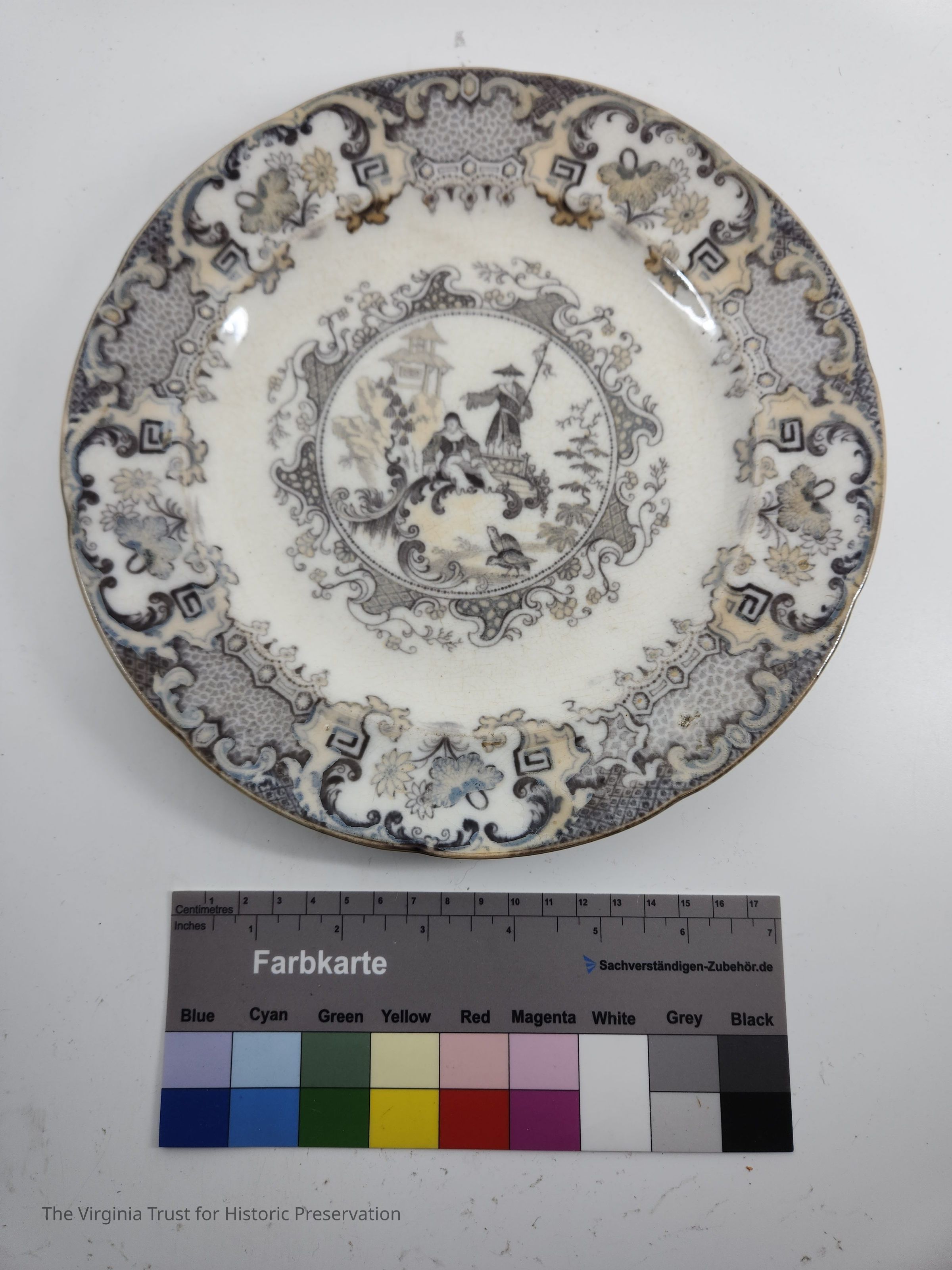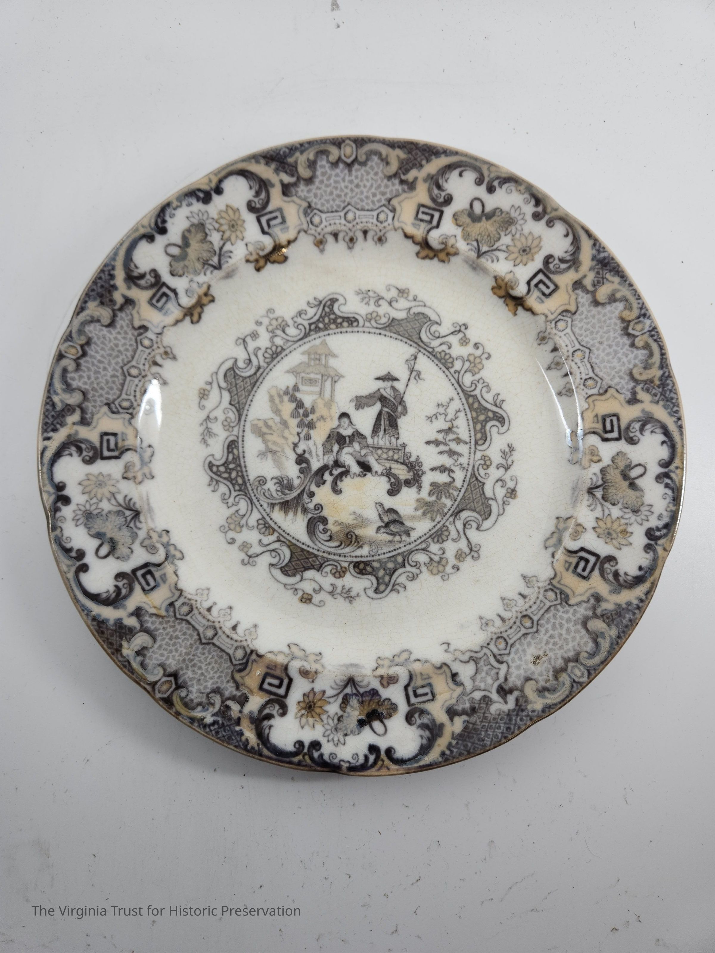 One of 14 luncheon plates. Part of a dinner service in "Mandarin" pattern. Brown lustre and grey with a central circular reserve of a Chinese scene, the border decorated with scrolls, pseudo-Chinese motifs and flowers. English.Dimensions